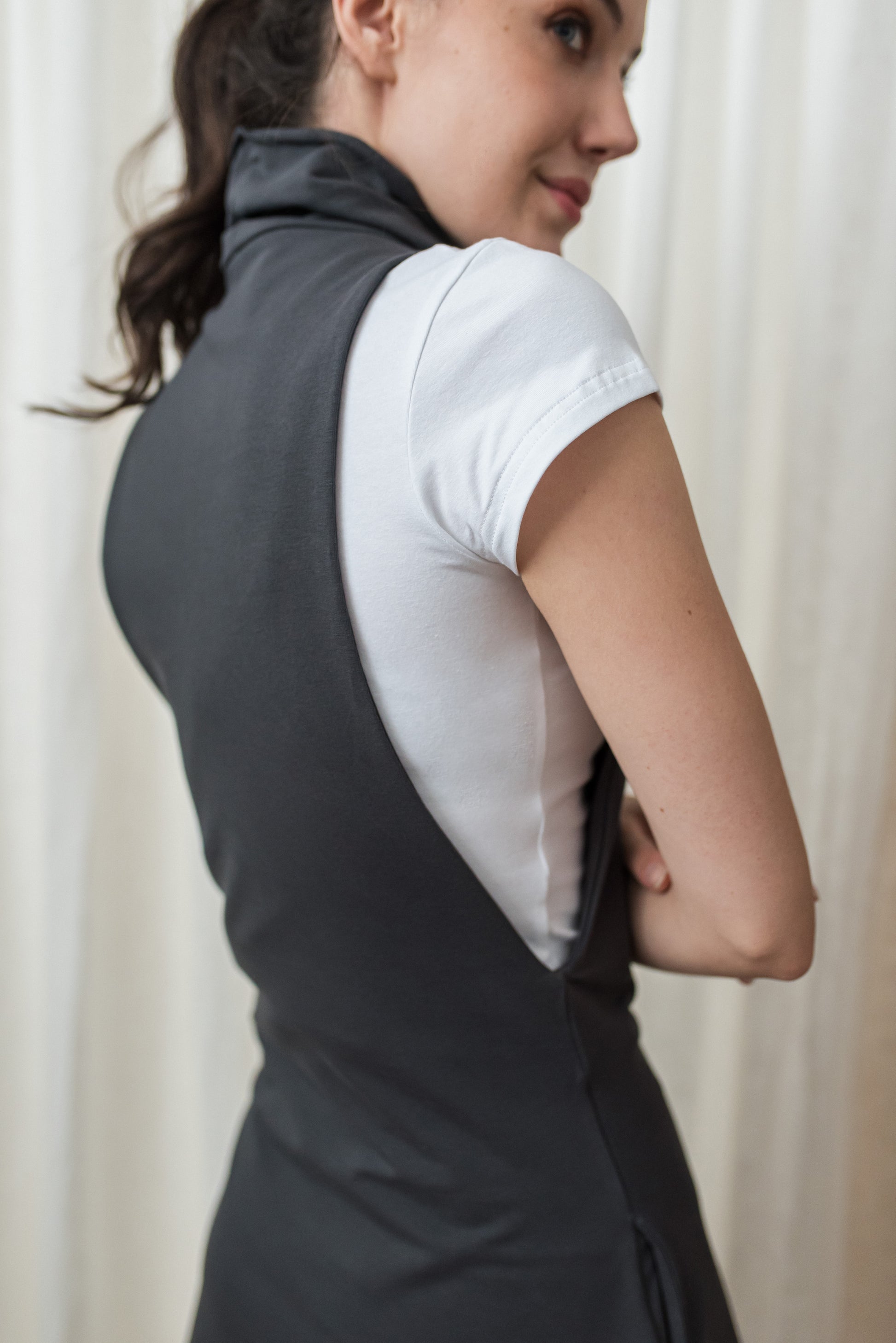 > A HOKO ruha a letisztultság és a modern nőiesség tökéletes példája. Egyedi szabásvonalaival és aszimmetrikus kialakításával egyszerre hordoz sportos könnyedséget és elegáns megjelenést. A magasított garbónyak és a nyitott oldalmegoldás különleges karaktert ad ennek a darabnak, miközben rétegezhetősége miatt sokféle stílusban viselhető – rövid ujjú pólóval, hosszú ujjú felsővel vagy akár egy bodyval is. Puha, rugalmas pamut futter anyaga kényelmes viseletet biztosít egész nap, míg a garbónyak vége és a szoknya alja mikrolock eldolgozással készült, amely a ruha minimalista, finoman puritán megjelenését hangsúlyozza. A HOKO ruha egyszerre lehet a mindennapok praktikus alapdarabja és a különleges alkalmak letisztult választása. A NONPLUS szellemiségéhez hűen ez a darab is az időtálló, fenntartható és variálható gardrób része, amelyben a sportos elegancia és a minimalista stílus találkozik.