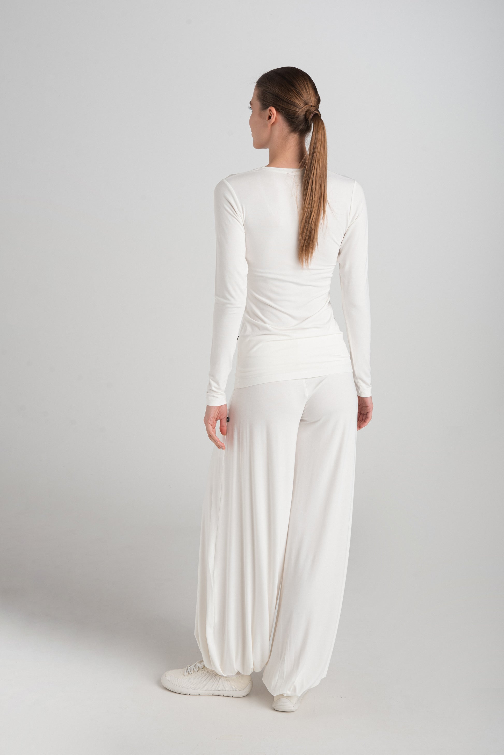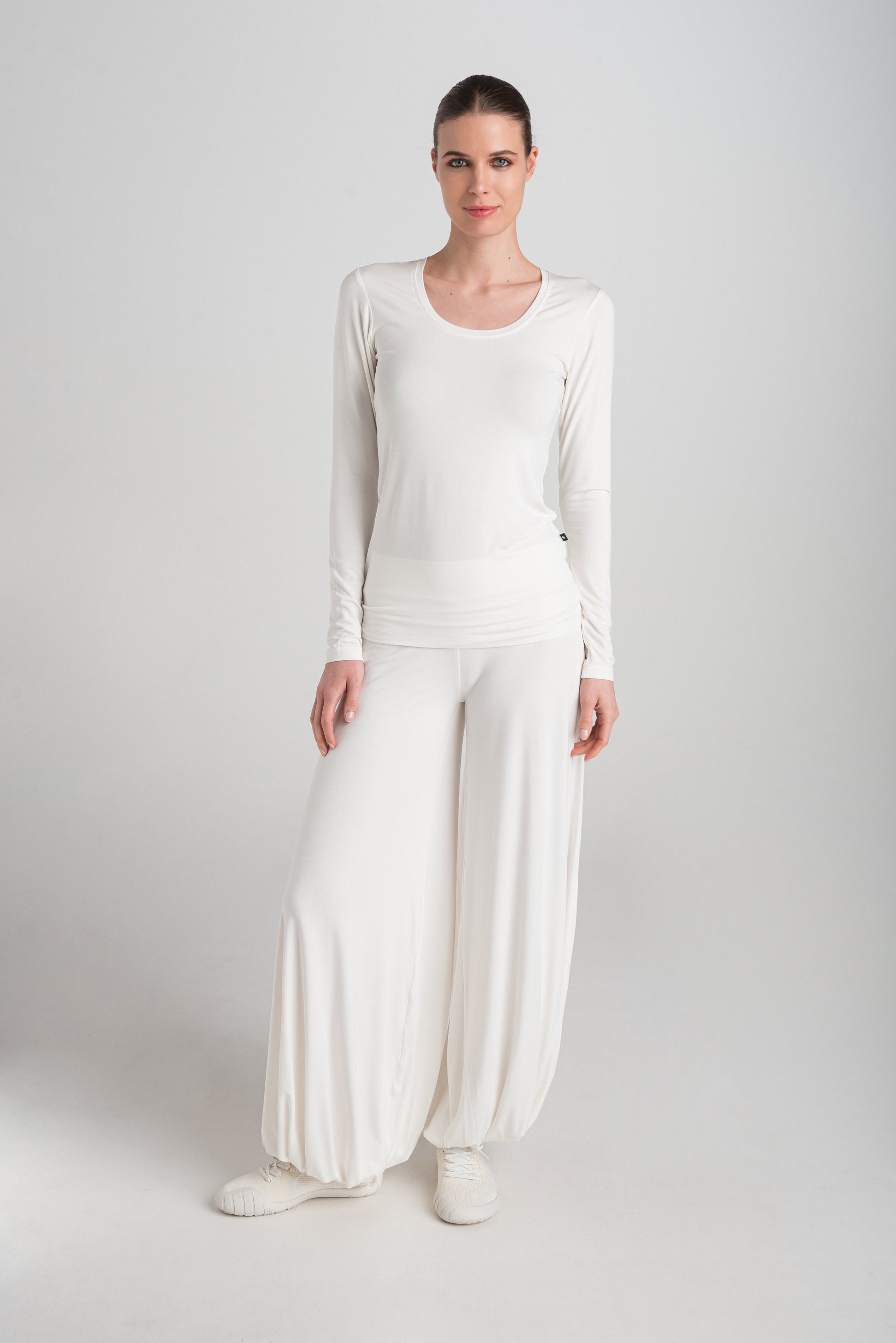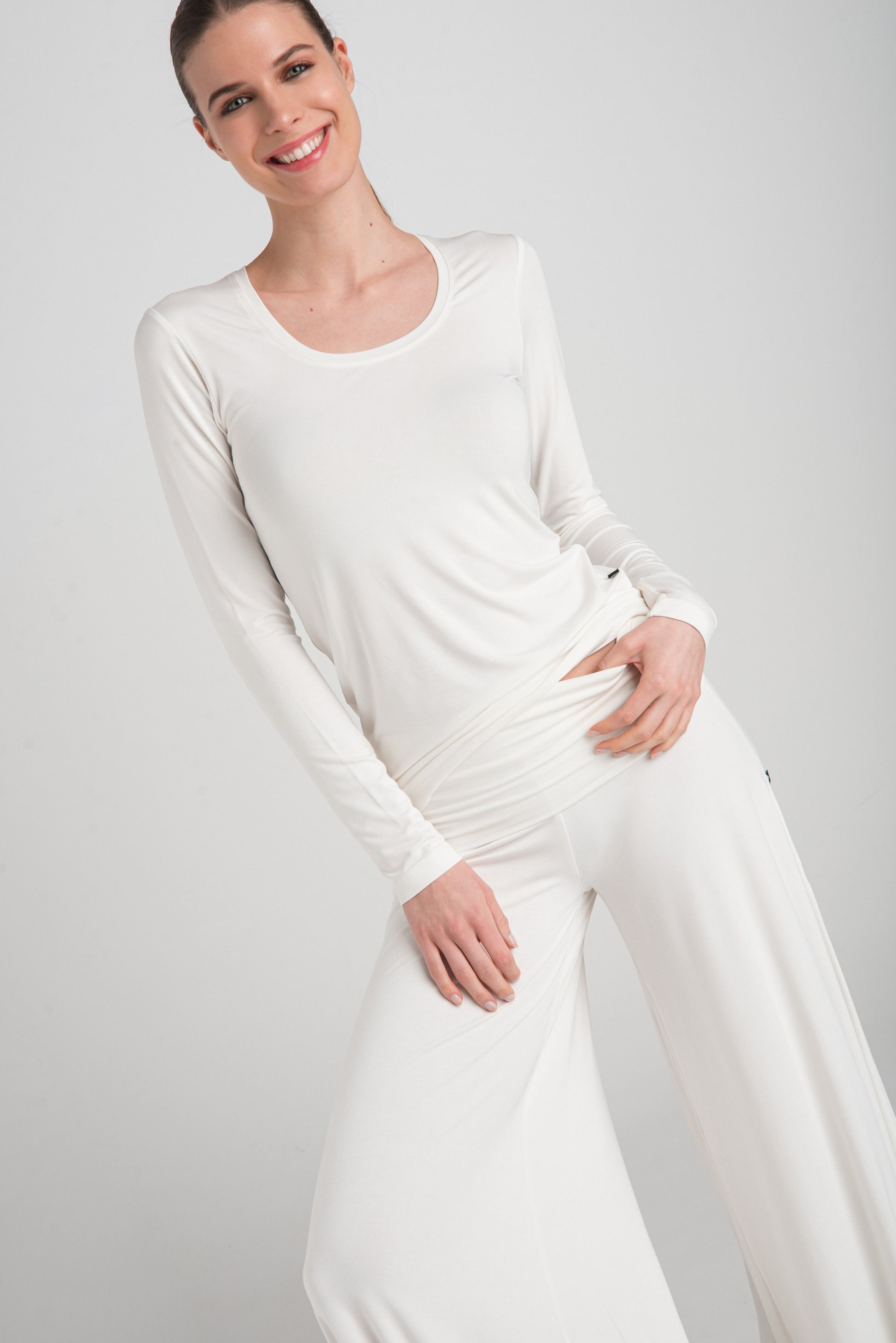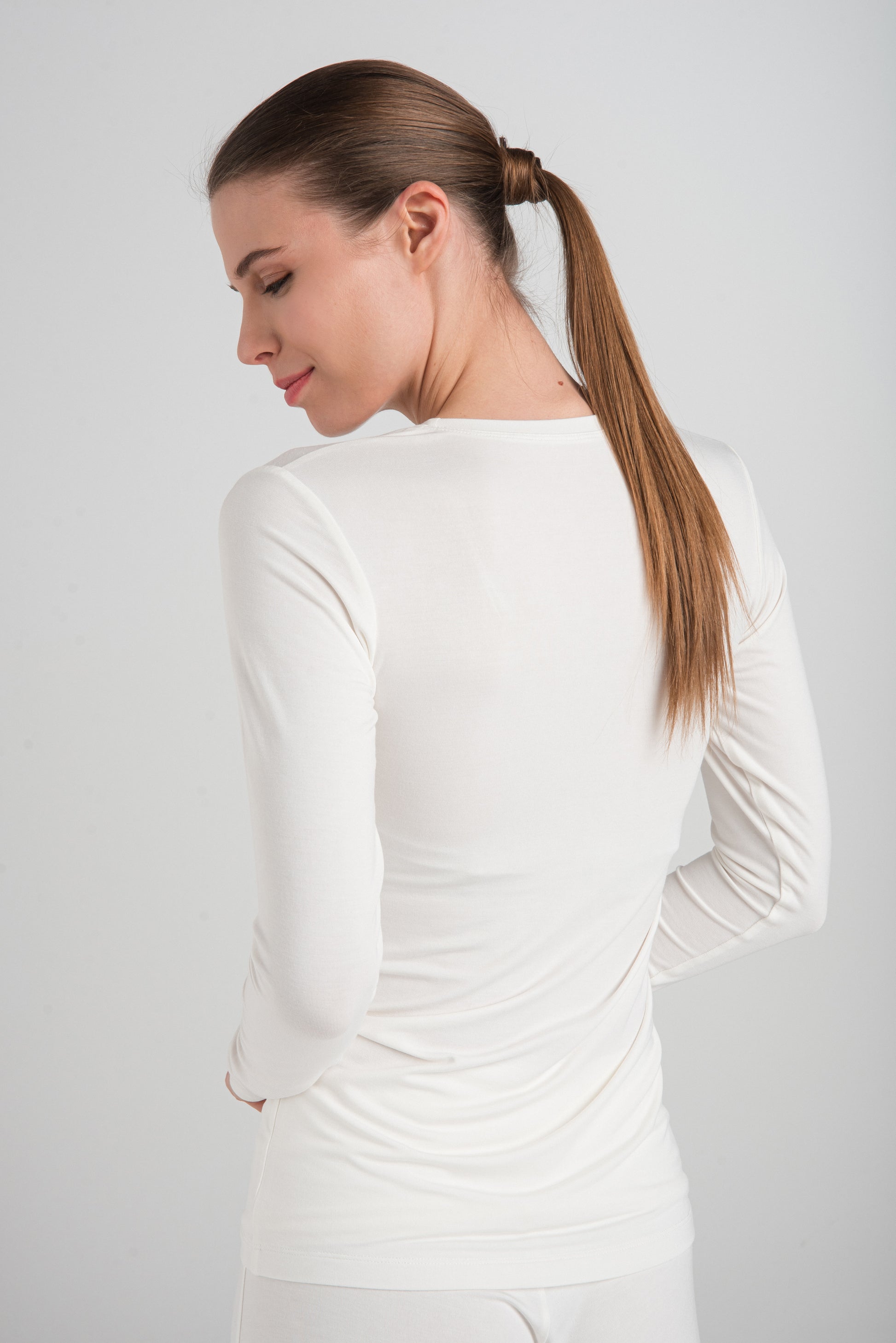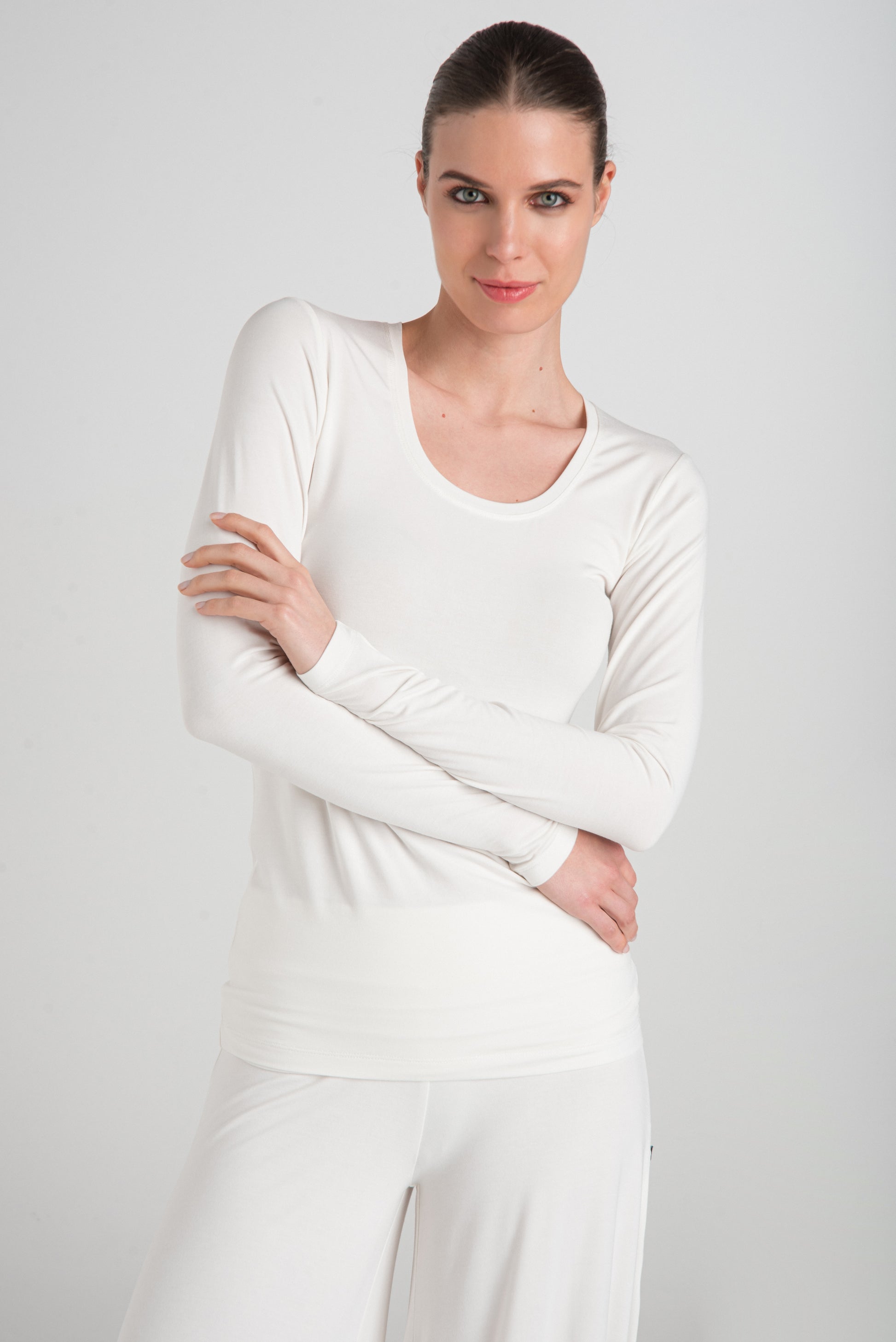 > The ADA T-shirt has a slim fit that follows the body's contours beautifully. In addition to its deep U-neck and long sleeves, it has an elongated waist. There is no question that this is a basic wardrobe staple - an ideal choice for layering and everyday use. It is excellent as an undershirt or can be worn on its own, for yoga, or sleeping - it provides maximum comfort and convenience.