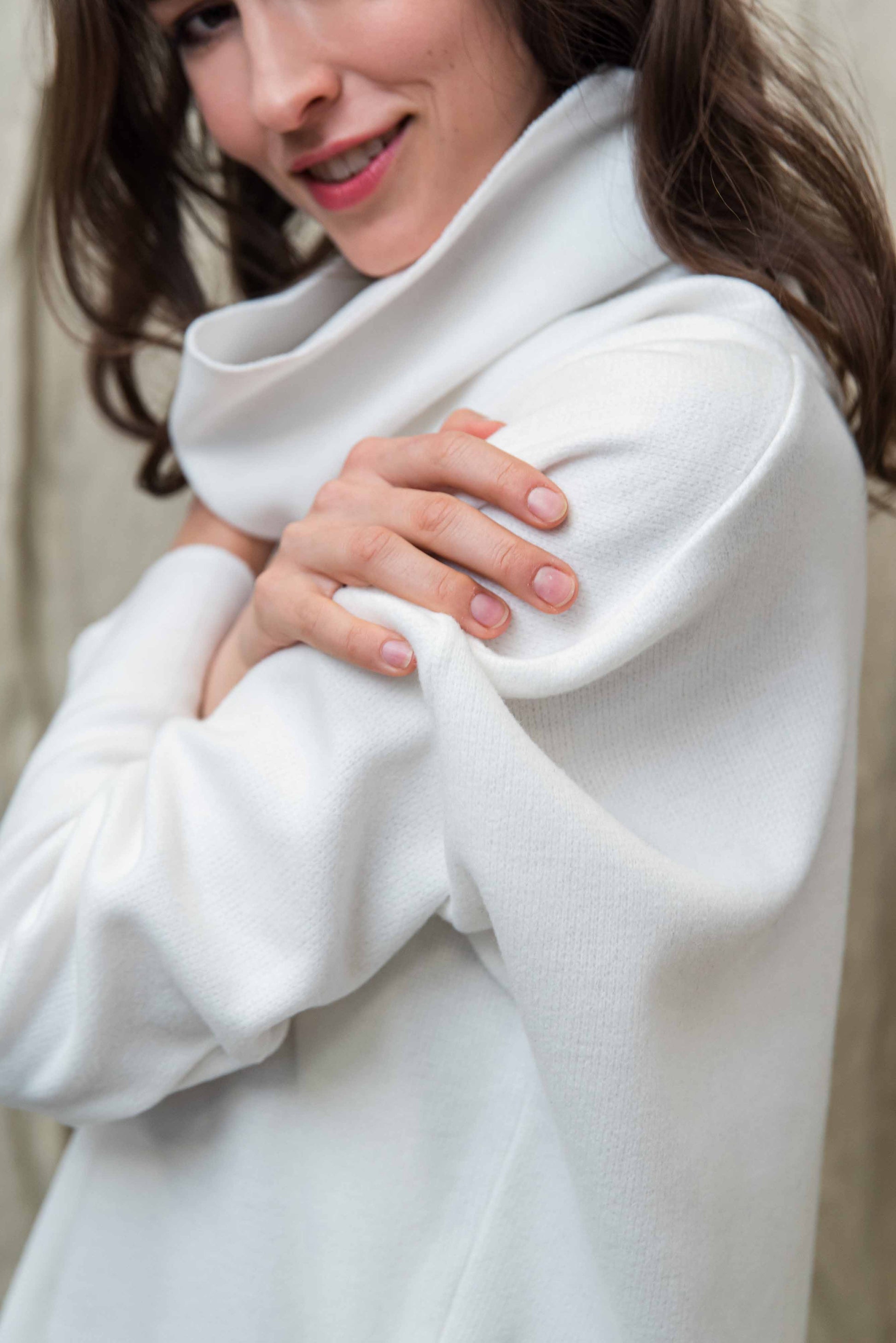 The medium-thick, soft knit texture has a natural elasticity that gently follows your movements while providing pleasant warmth. Its surface is extremely soft, silky to the touch, has a soft drape, and gently glides against the skin — this gives it that immediately noticeable comfort that is especially good on colder days. The structured interweaving of the fibers ensures stability, yet retains the intimate, homely softness that is characteristic of quality knit fabrics. Due to the natural softness, the surface may slightly pill with wear - this is a completely normal process typical of knitted fabrics that develops during everyday use. If you experience this, the smaller lumps can be carefully removed by hand or with a gentle pilling remover, so the material retains its harmonious, soft appearance and beauty for a long time. The warmth, elasticity and softness of the texture combine to create a material that is both reliable, comfortable and gently embracing — a truly pleasant companion for everyday life in the cooler seasons.