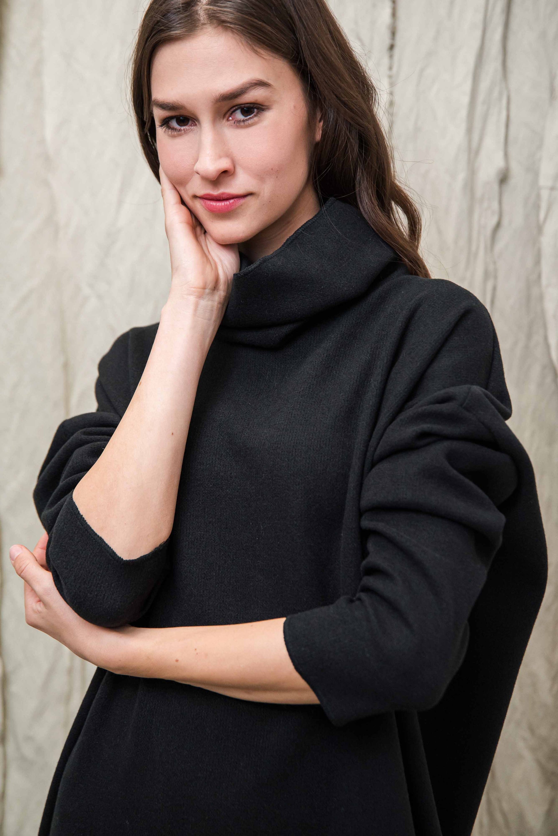 The medium-thick, soft knit texture has a natural elasticity that gently follows your movements while providing pleasant warmth. Its surface is extremely soft, silky to the touch, has a soft drape, and gently glides against the skin — this gives it that immediately noticeable comfort that is especially good on colder days. The structured interweaving of the fibers ensures stability, yet retains the intimate, homely softness that is characteristic of quality knit fabrics. Due to the natural softness, the surface may slightly pill with wear - this is a completely normal process typical of knitted fabrics that develops during everyday use. If you experience this, the smaller lumps can be carefully removed by hand or with a gentle pilling remover, so the material retains its harmonious, soft appearance and beauty for a long time. The warmth, elasticity and softness of the texture combine to create a material that is both reliable, comfortable and gently embracing — a truly pleasant companion for everyday life in the cooler seasons.