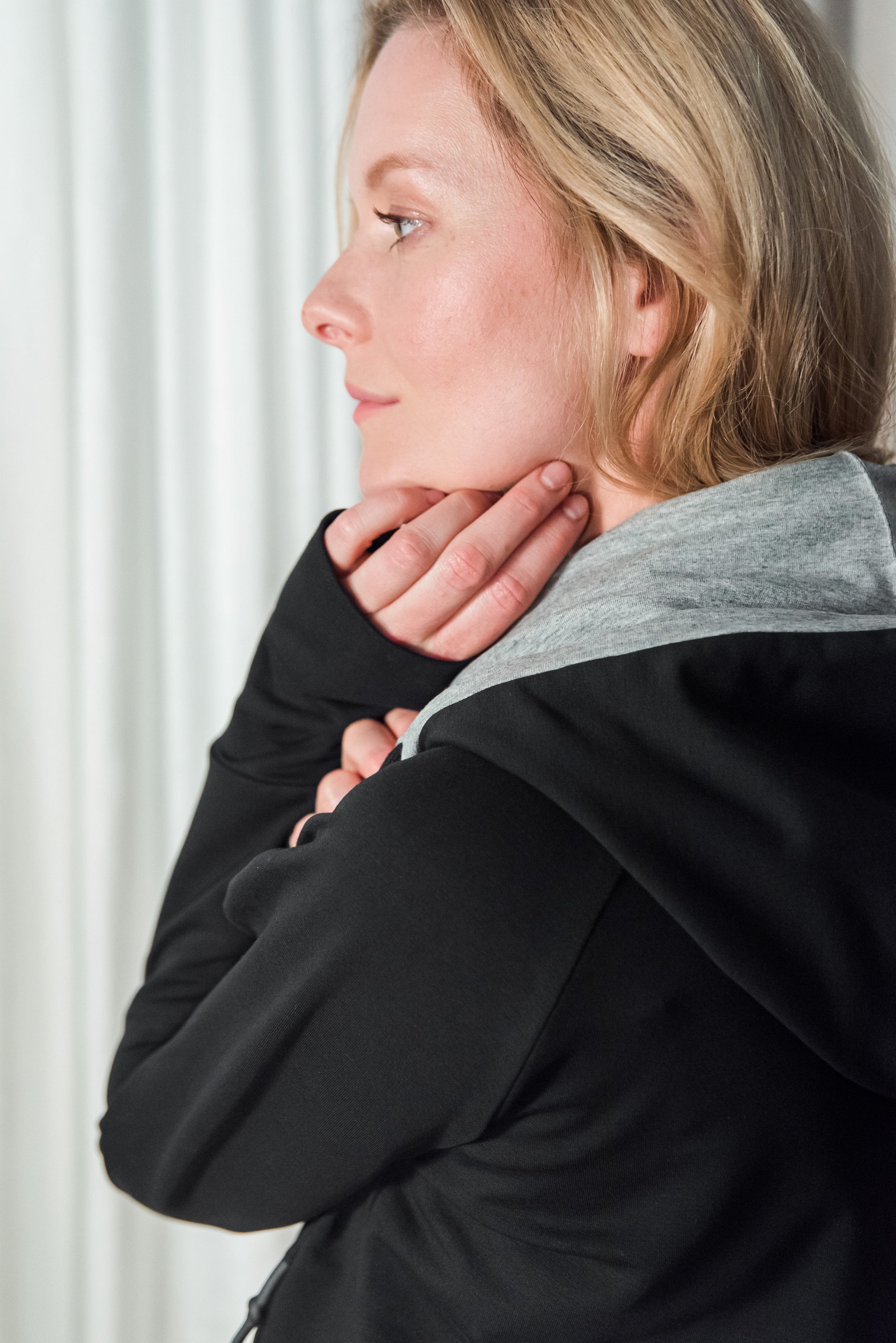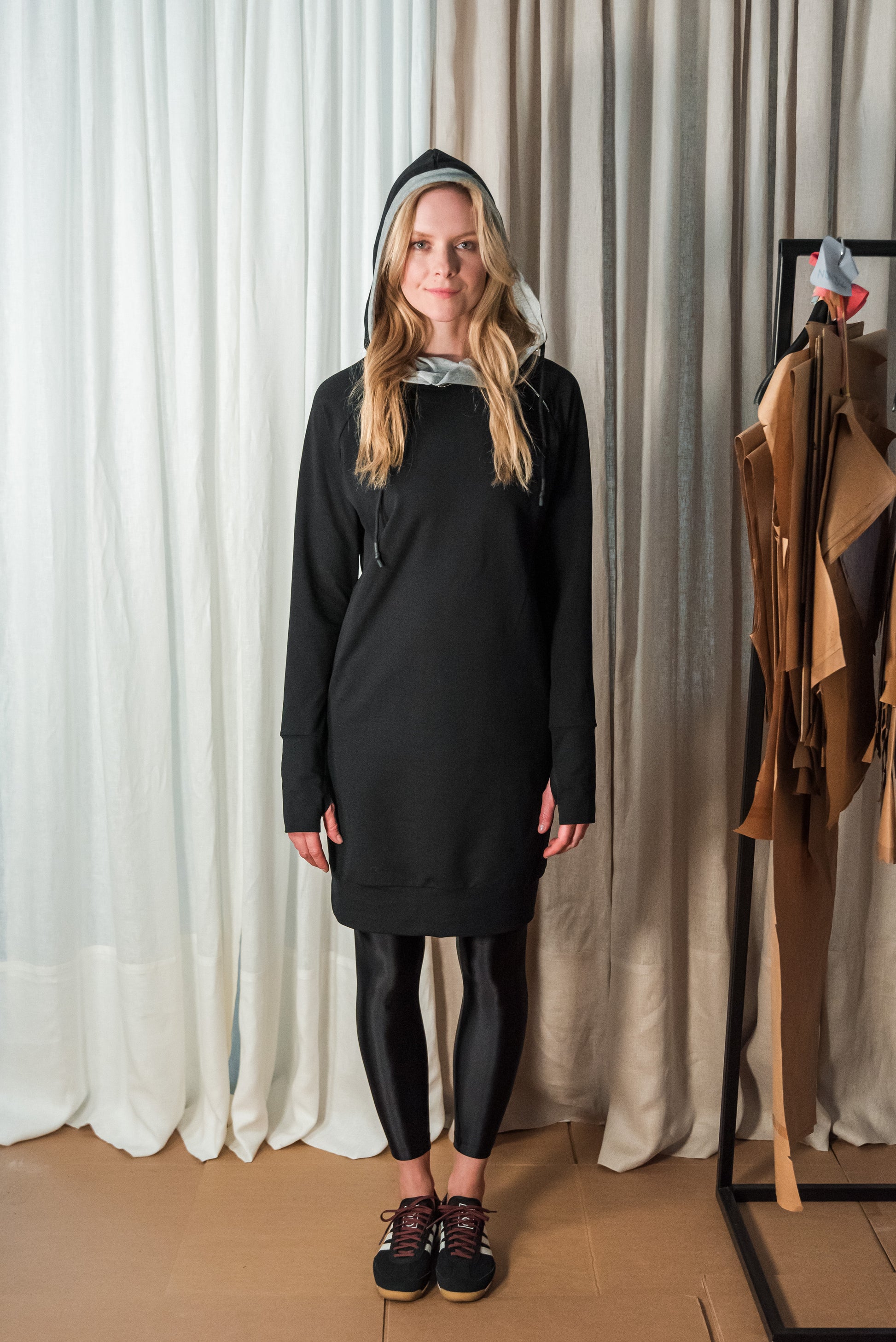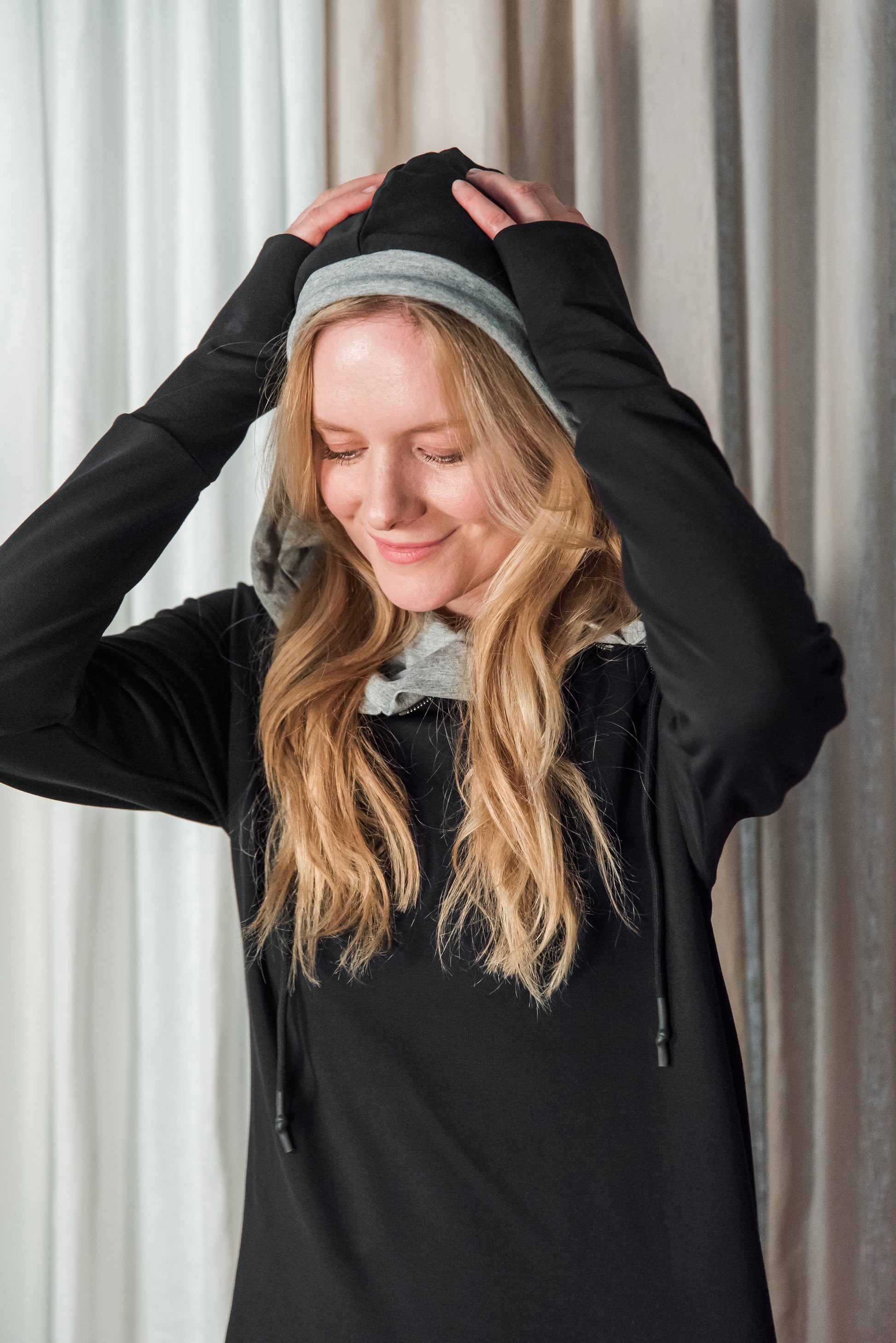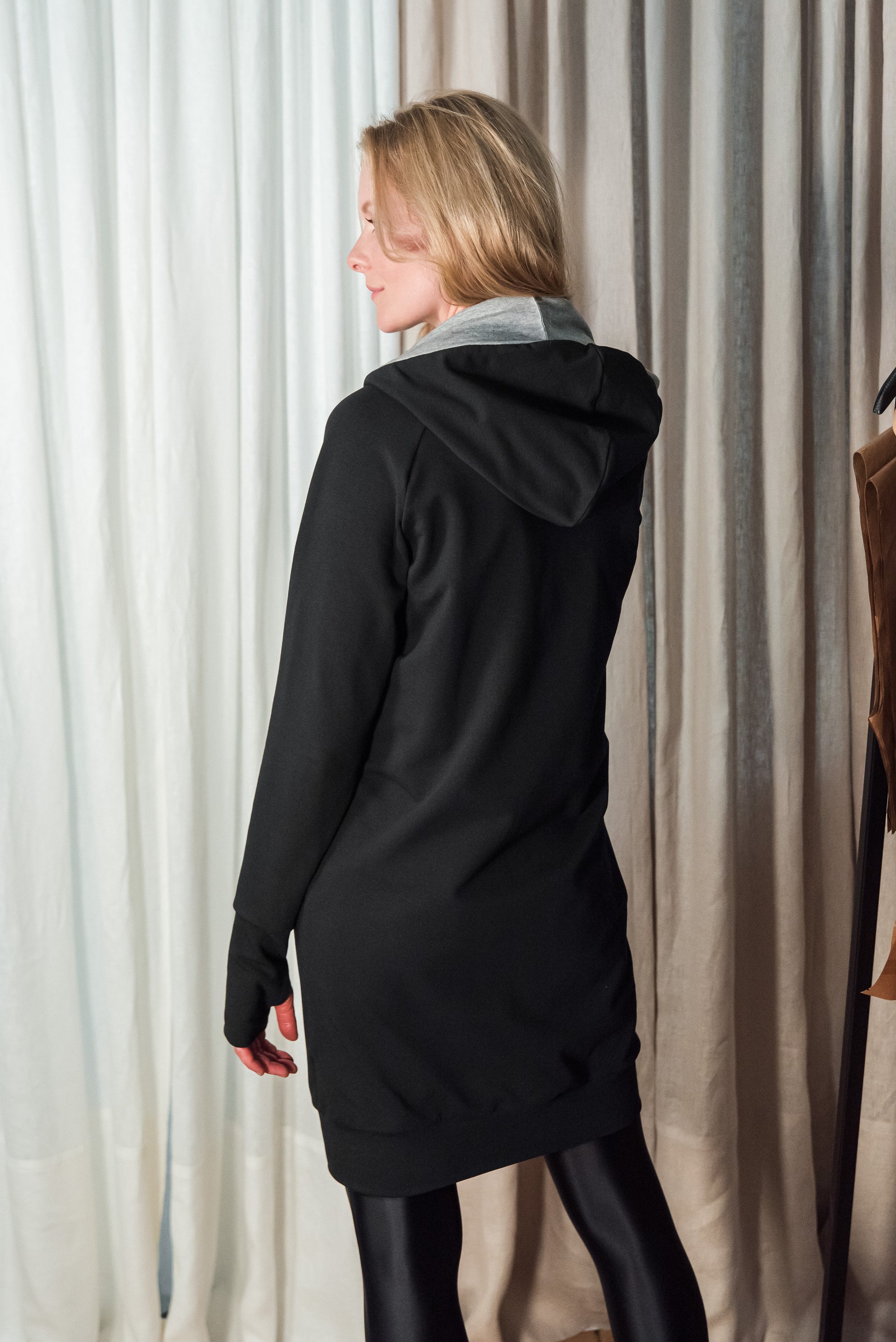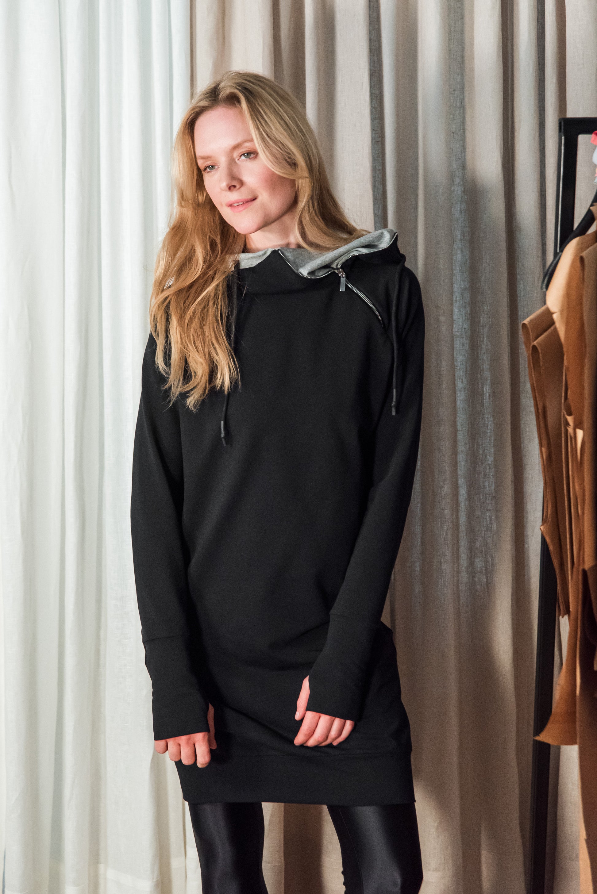 Our large, loose hoodie dress has a spectacular silver metal zip at the front, at the neck. It has long sleeves, a casual cut, sporty and comfortable to wear, and reaches above the knee.
