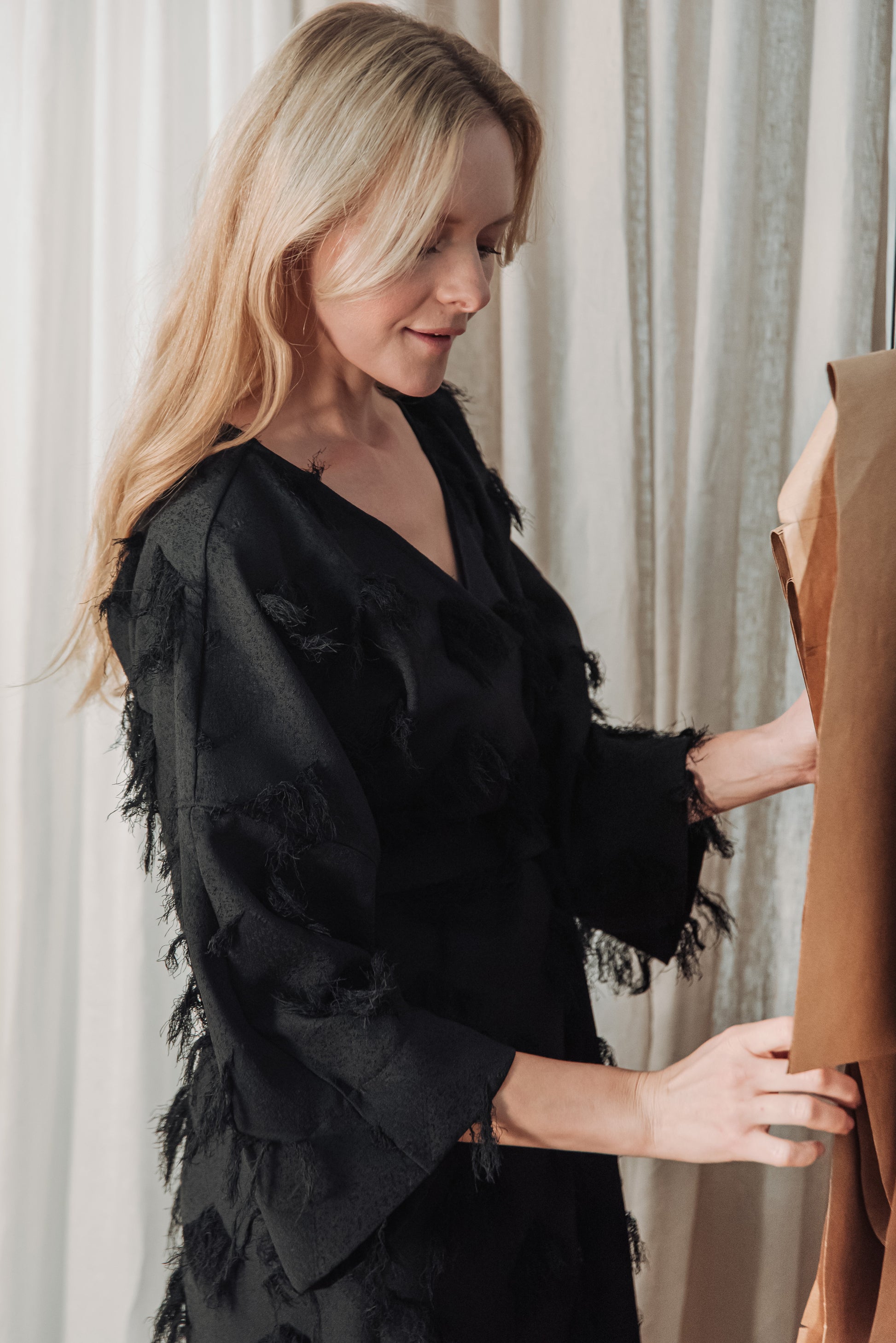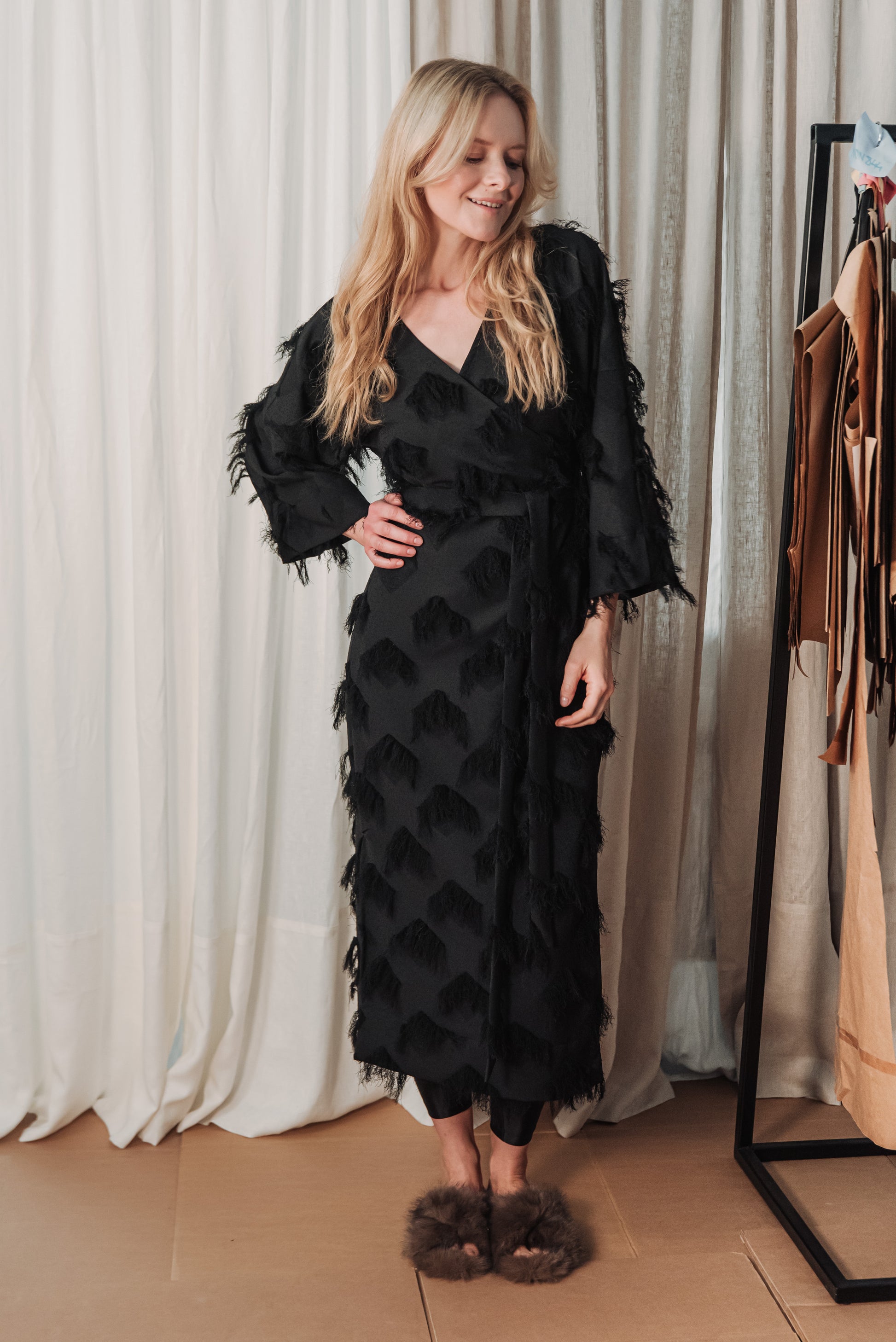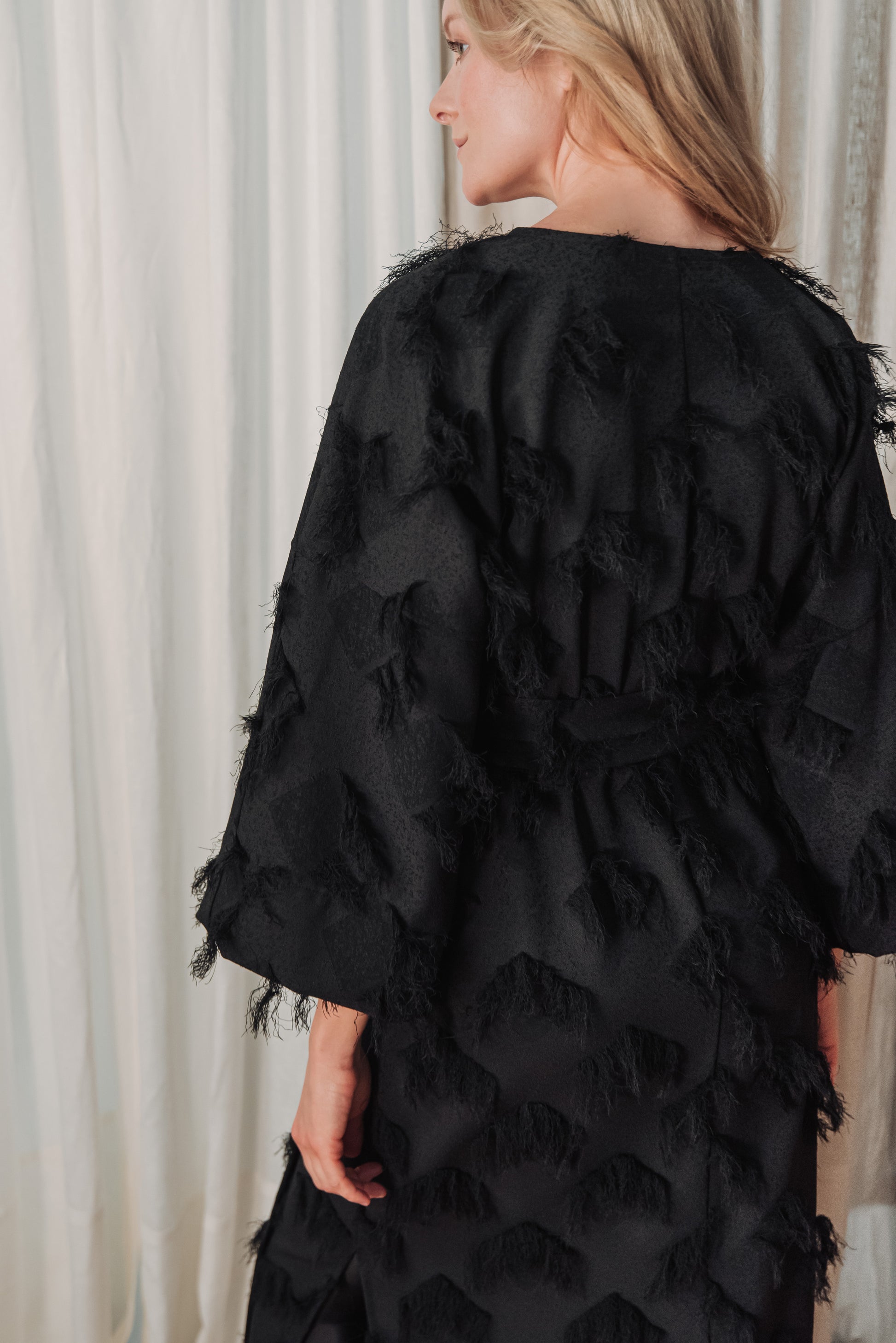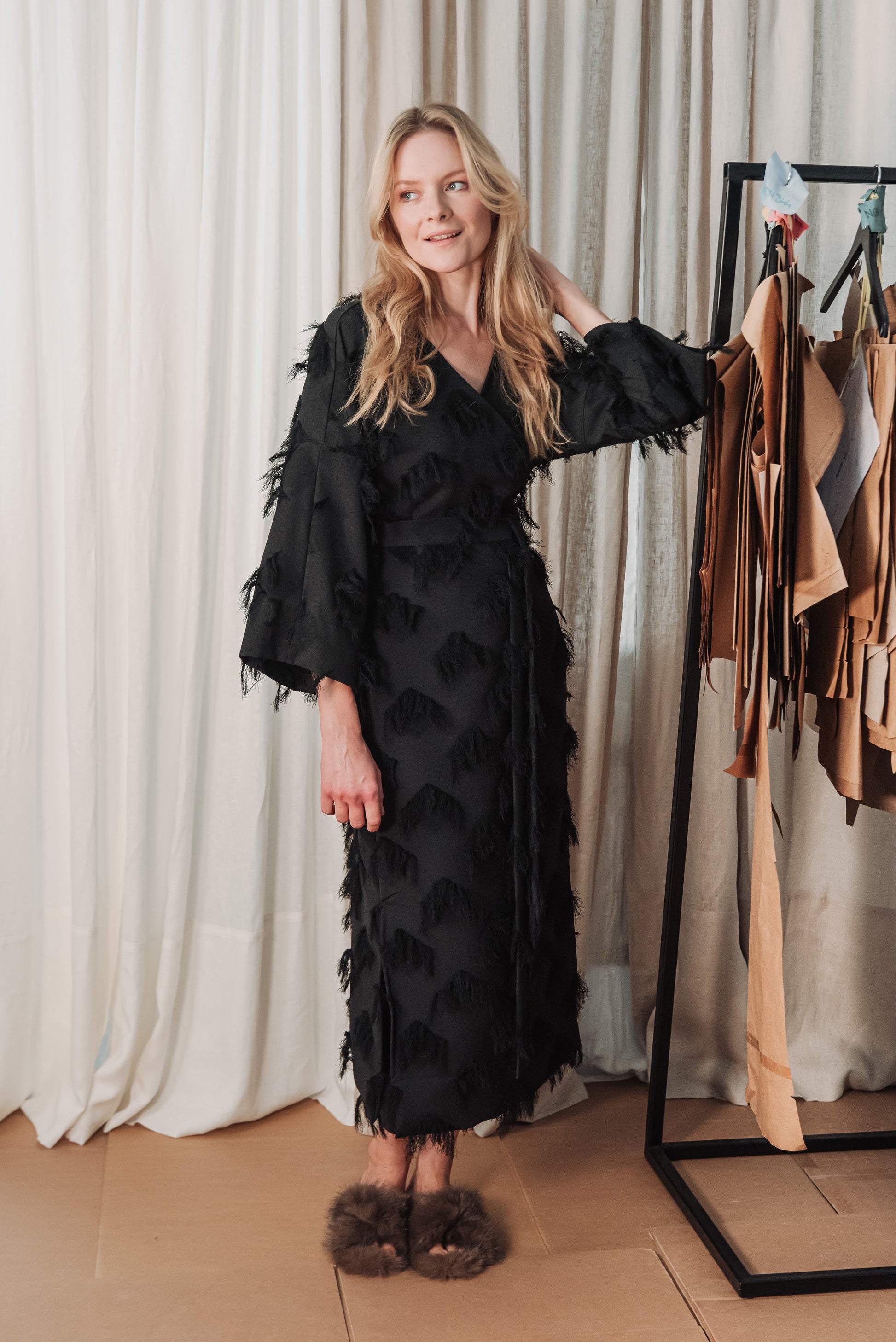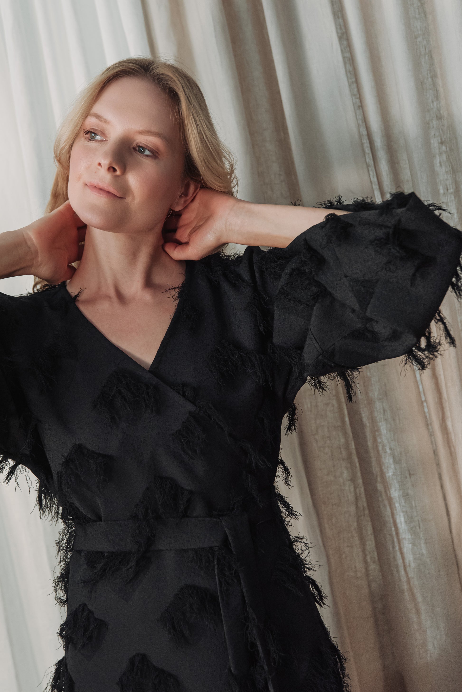 > Our ANAU wrap dress is the epitome of clean elegance — its unique, fringed textured fabric comes to life with every movement - the black color is a timeless classic, making it a particularly elegant choice during the upcoming holiday season: be it Christmas dinner, an intimate family gathering, or a festive event.