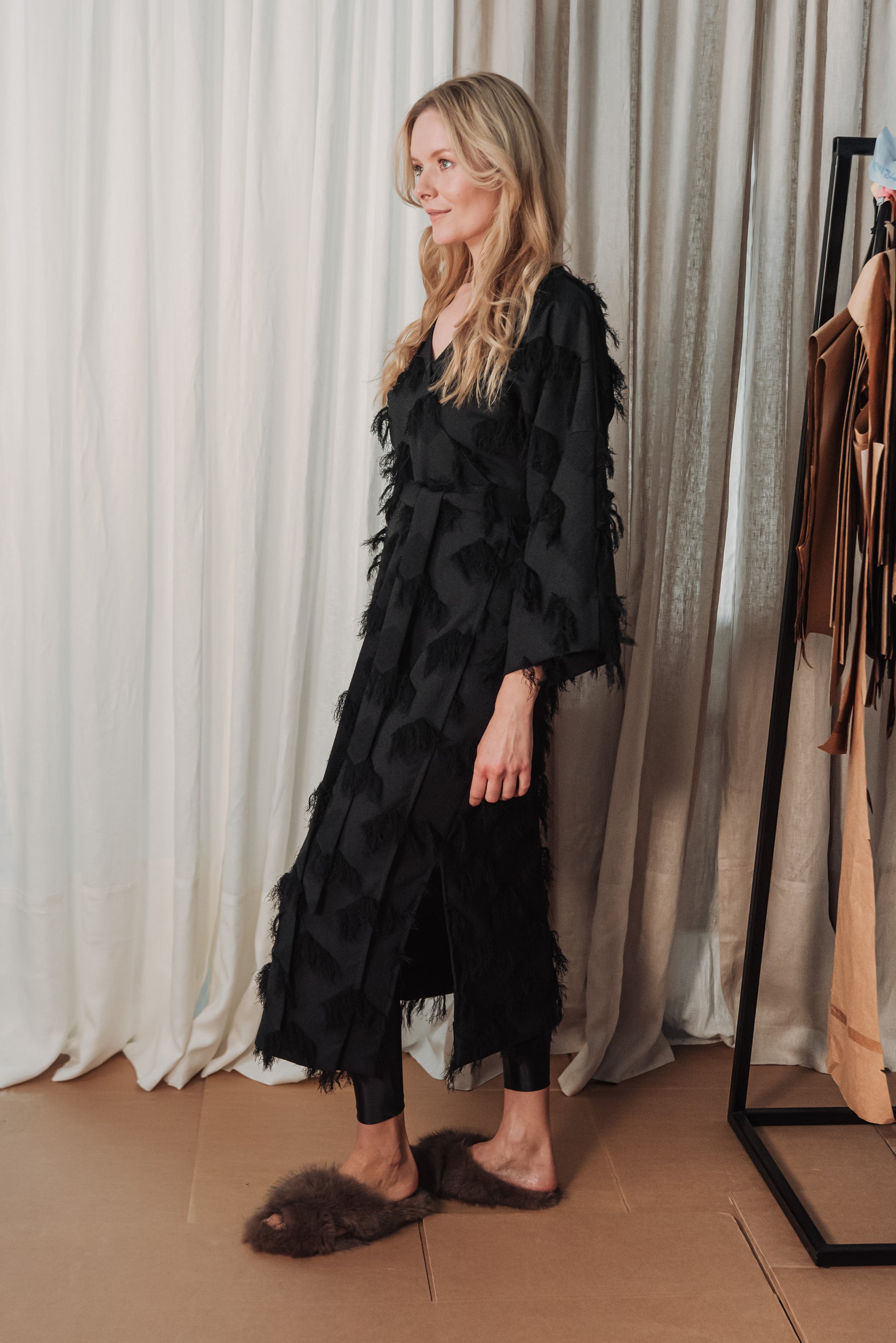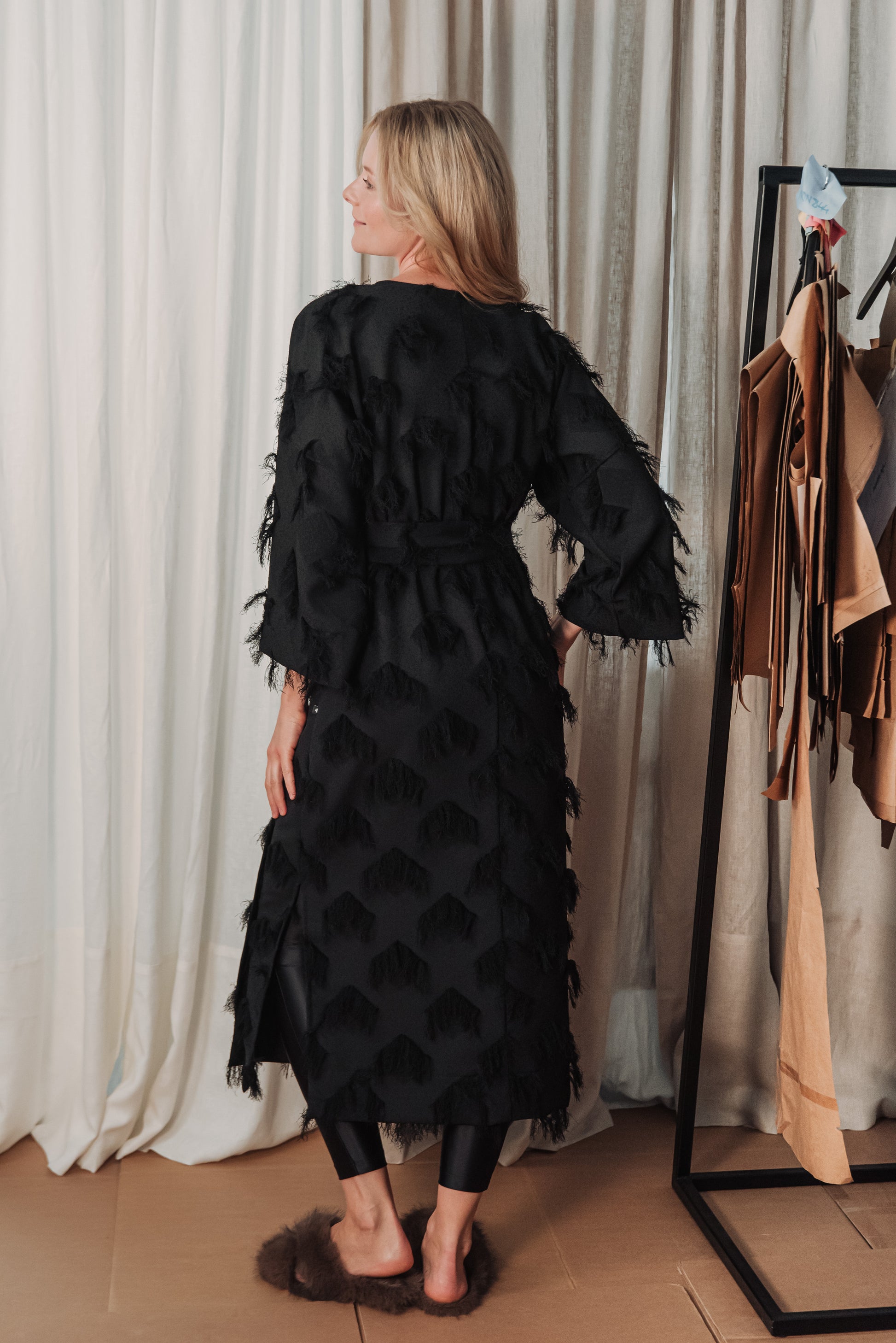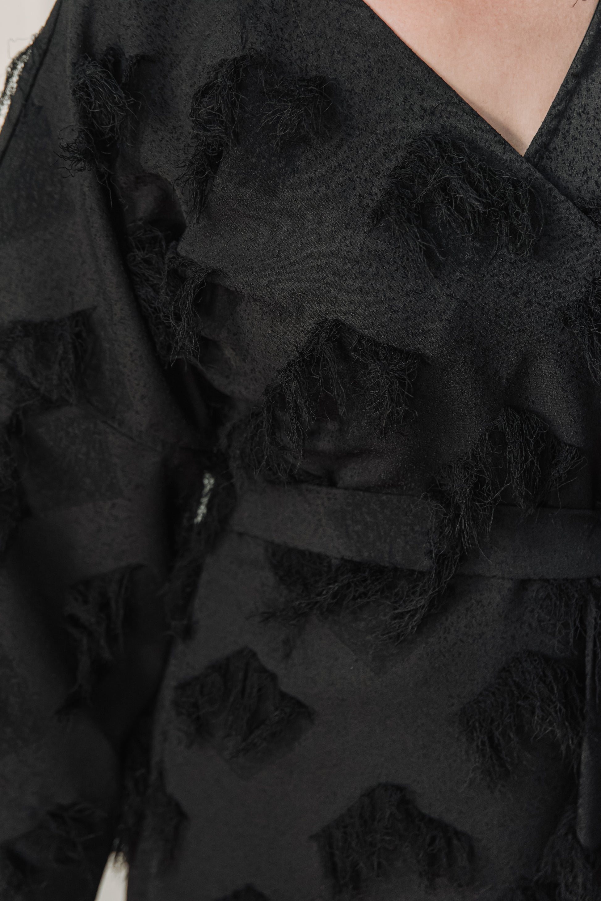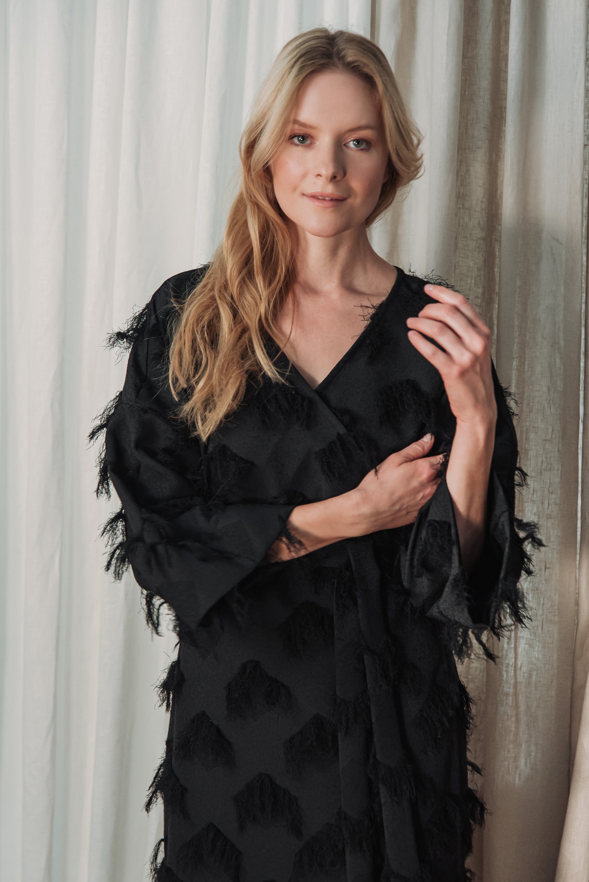 > Our ANAU wrap dress is the epitome of clean elegance — its unique, fringed textured fabric comes to life with every movement - the black color is a timeless classic, making it a particularly elegant choice during the upcoming holiday season: be it Christmas dinner, an intimate family gathering, or a festive event.