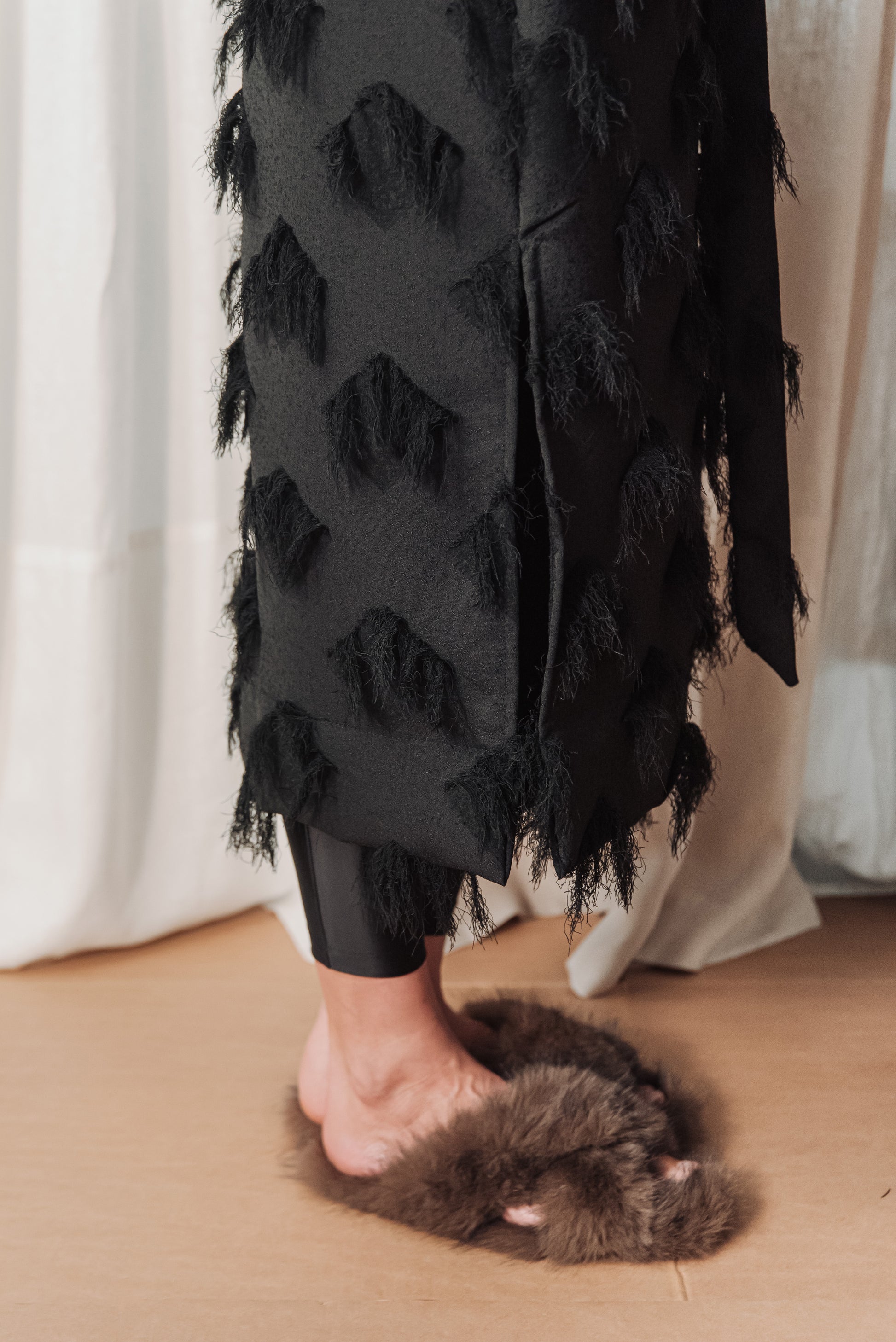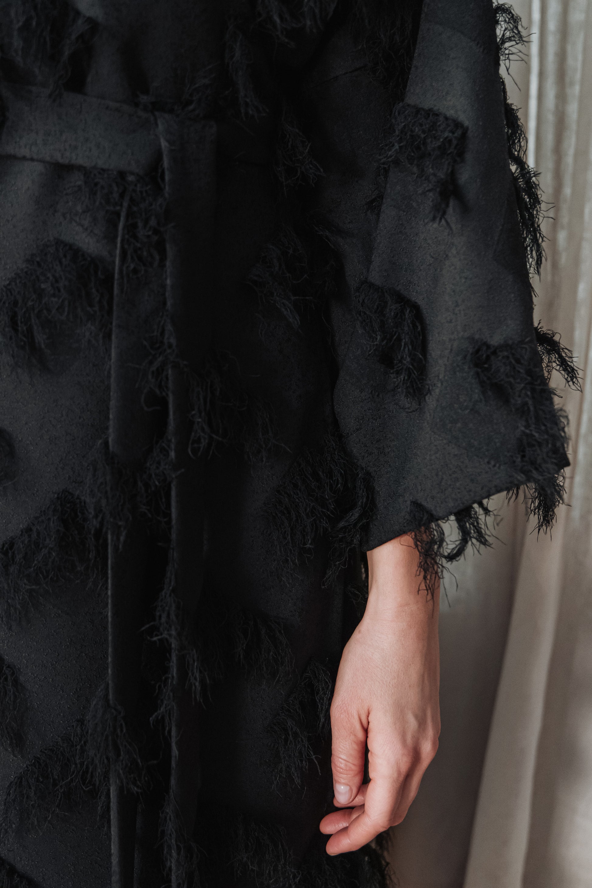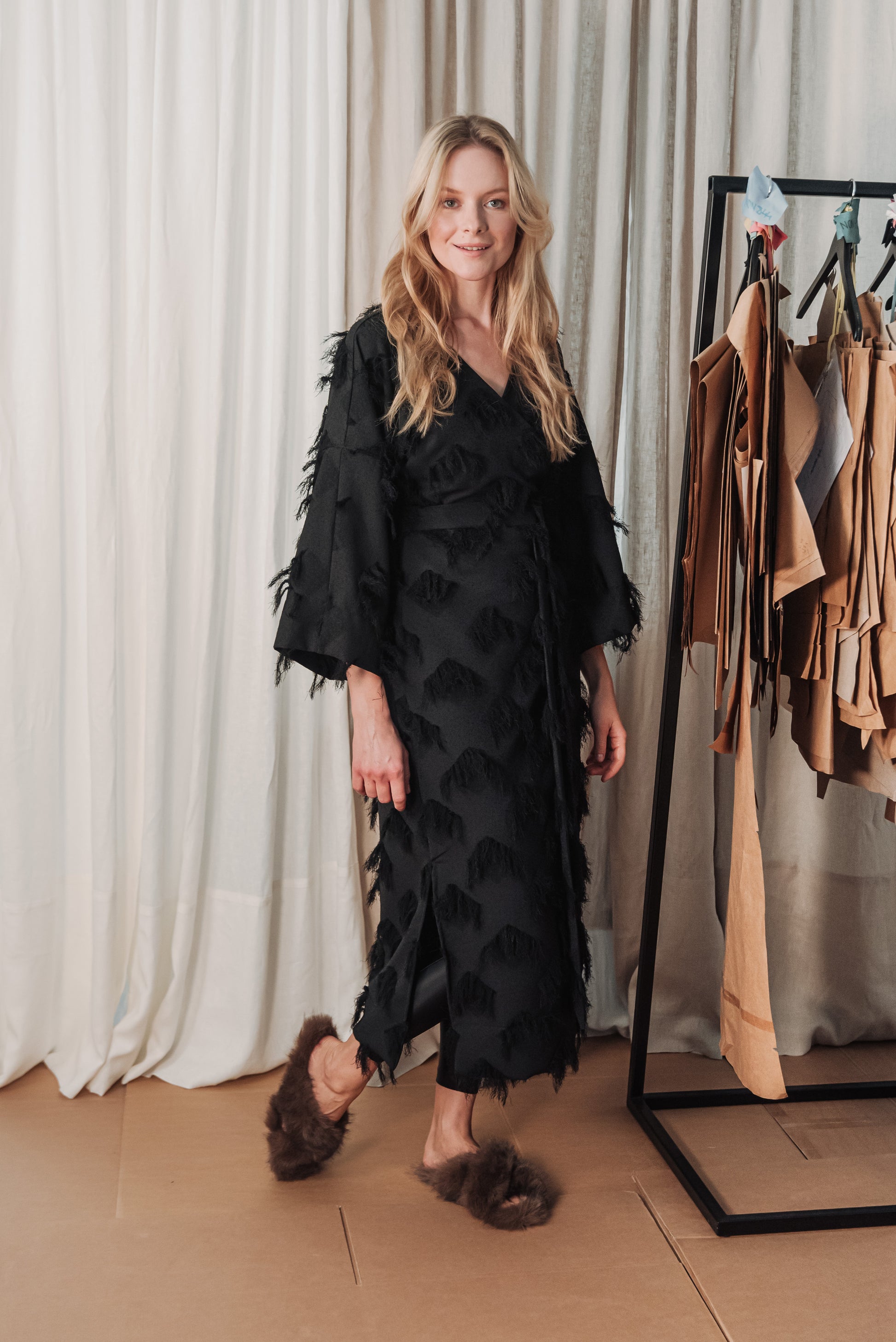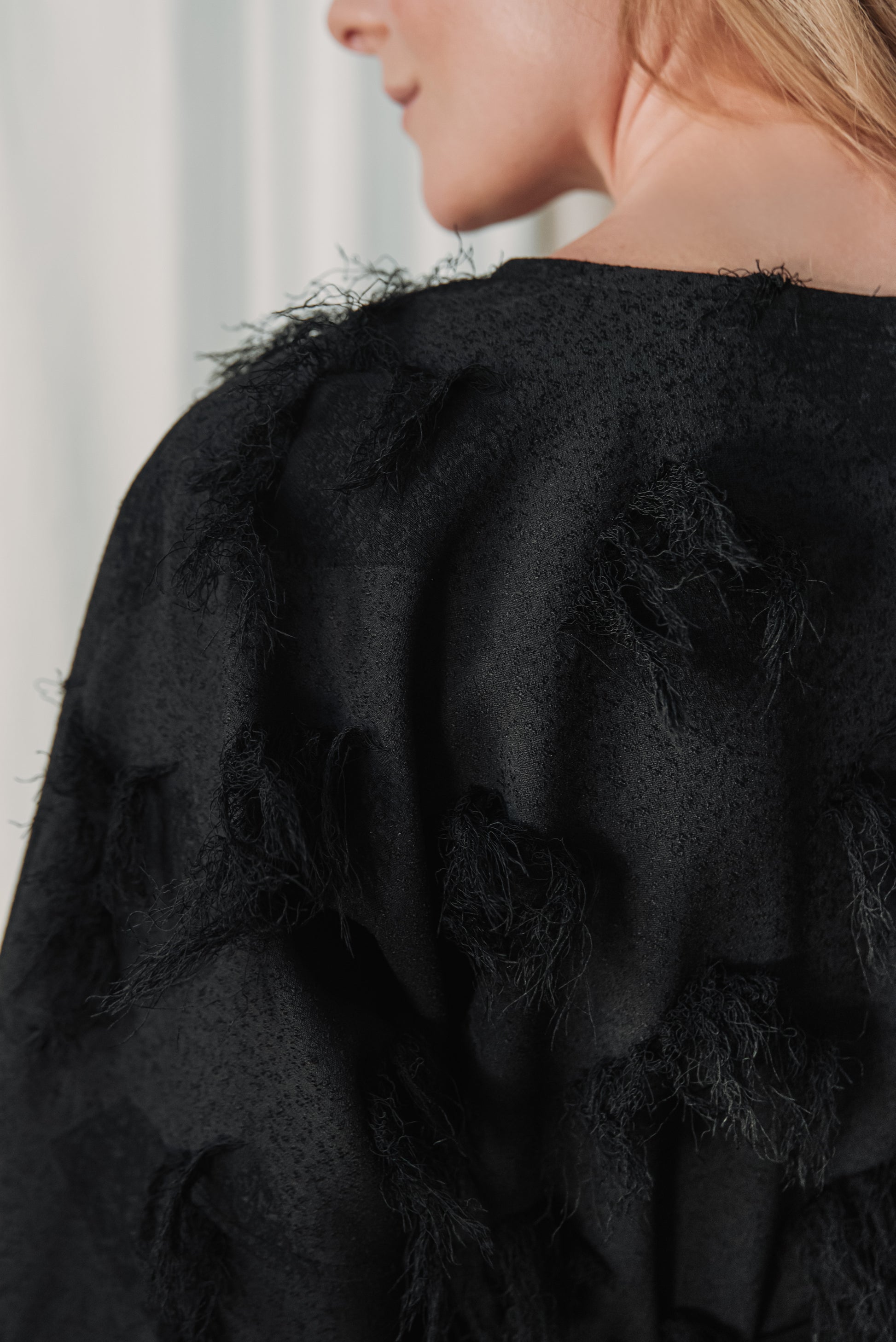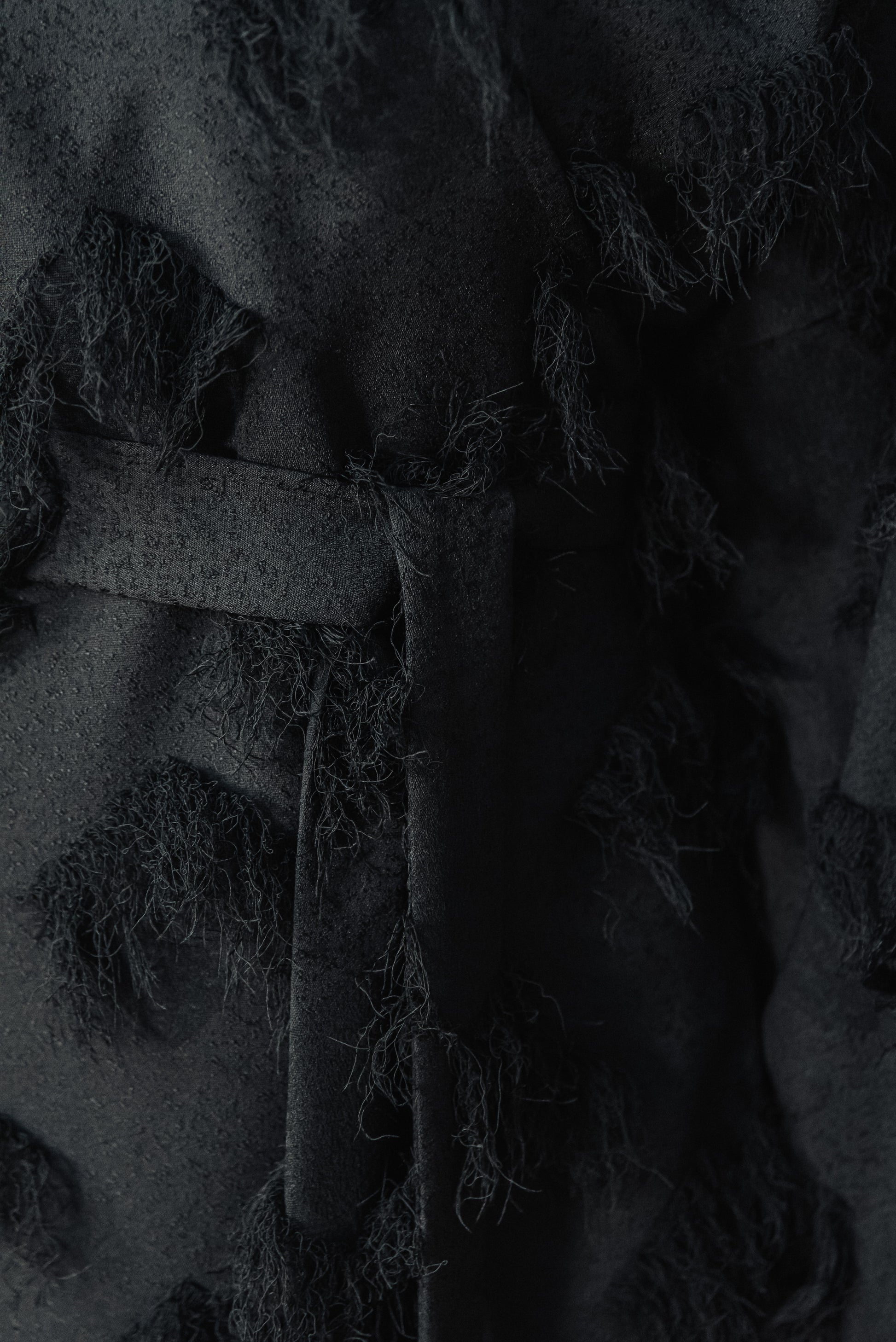 > Our ANAU wrap dress is the epitome of clean elegance — its unique, fringed textured fabric comes to life with every movement - the black color is a timeless classic, making it a particularly elegant choice during the upcoming holiday season: be it Christmas dinner, an intimate family gathering, or a festive event.