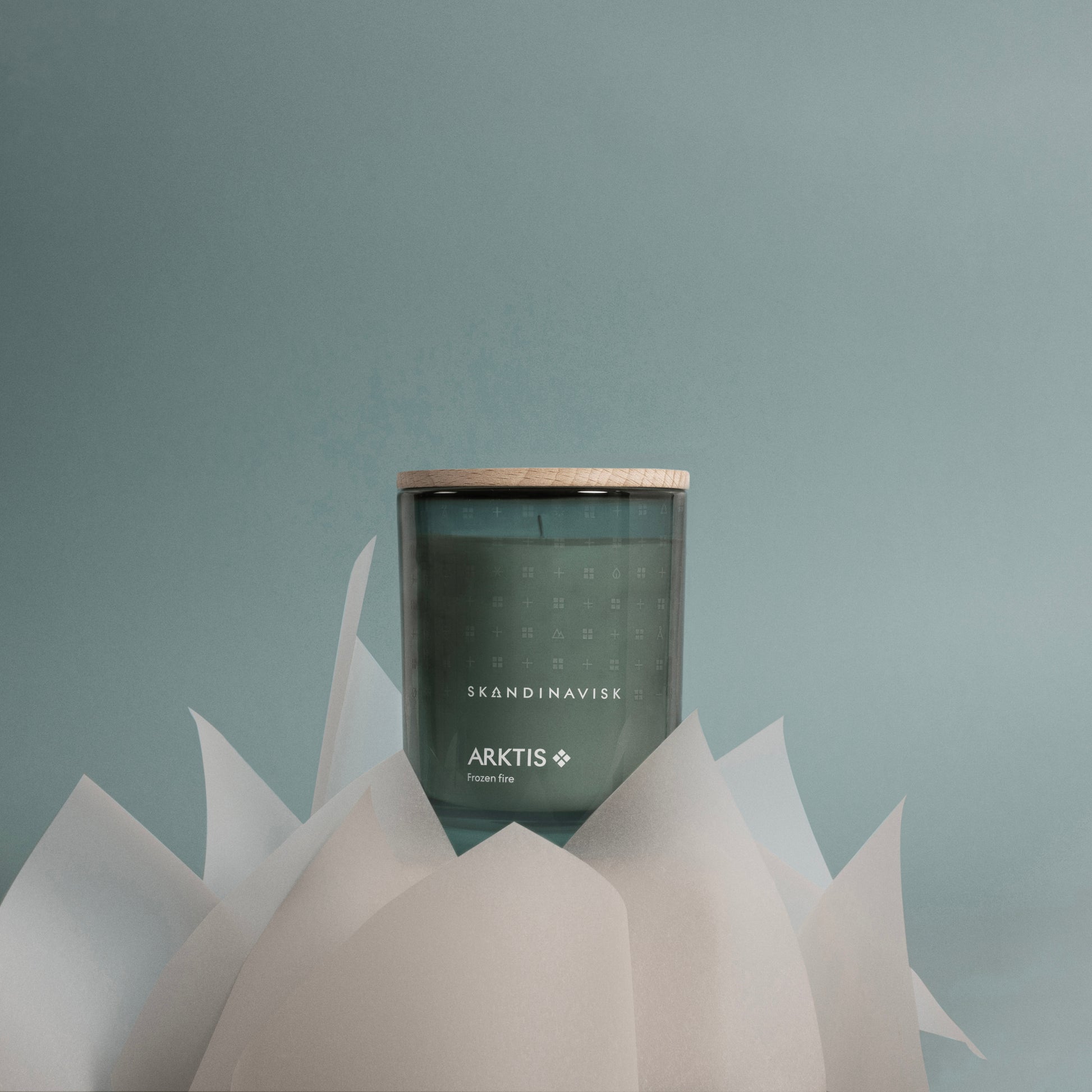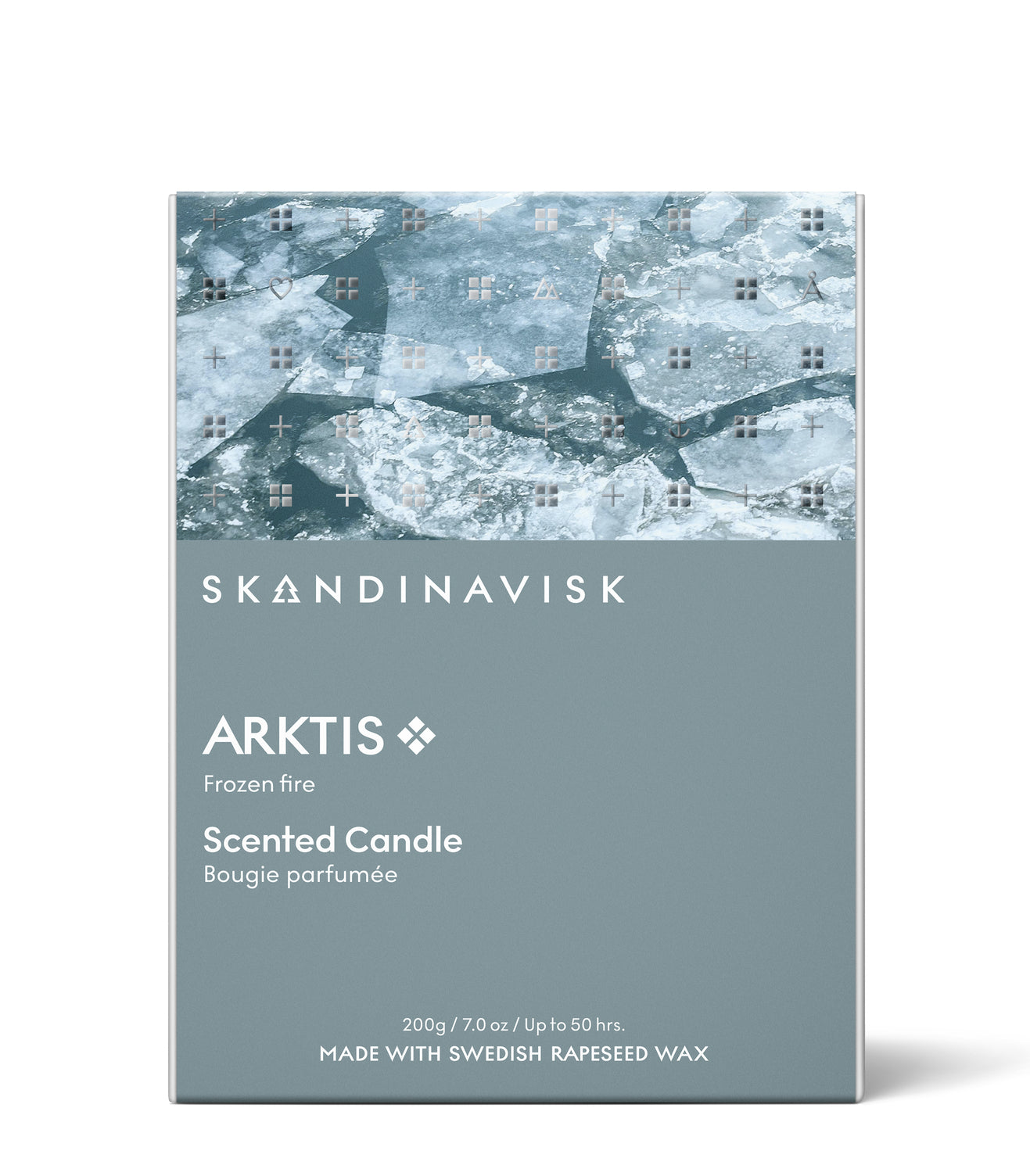 > Special edition ARKTIS scented candle with seasonal design and box.