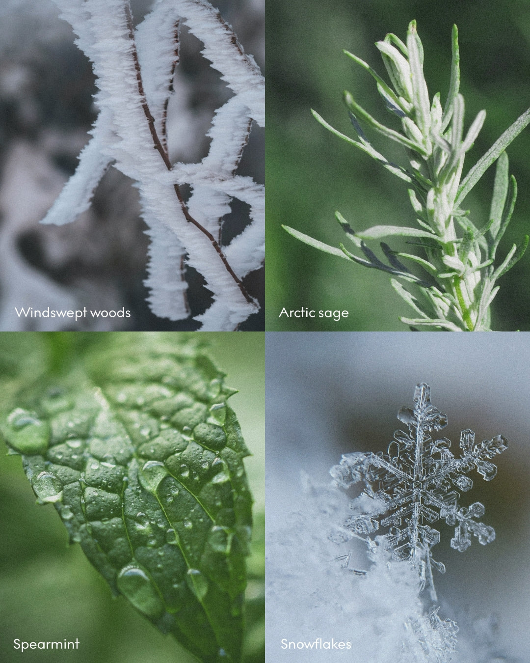 > Fragrance notes: Windswept trees and arctic sage, spearmint and snowflakes.