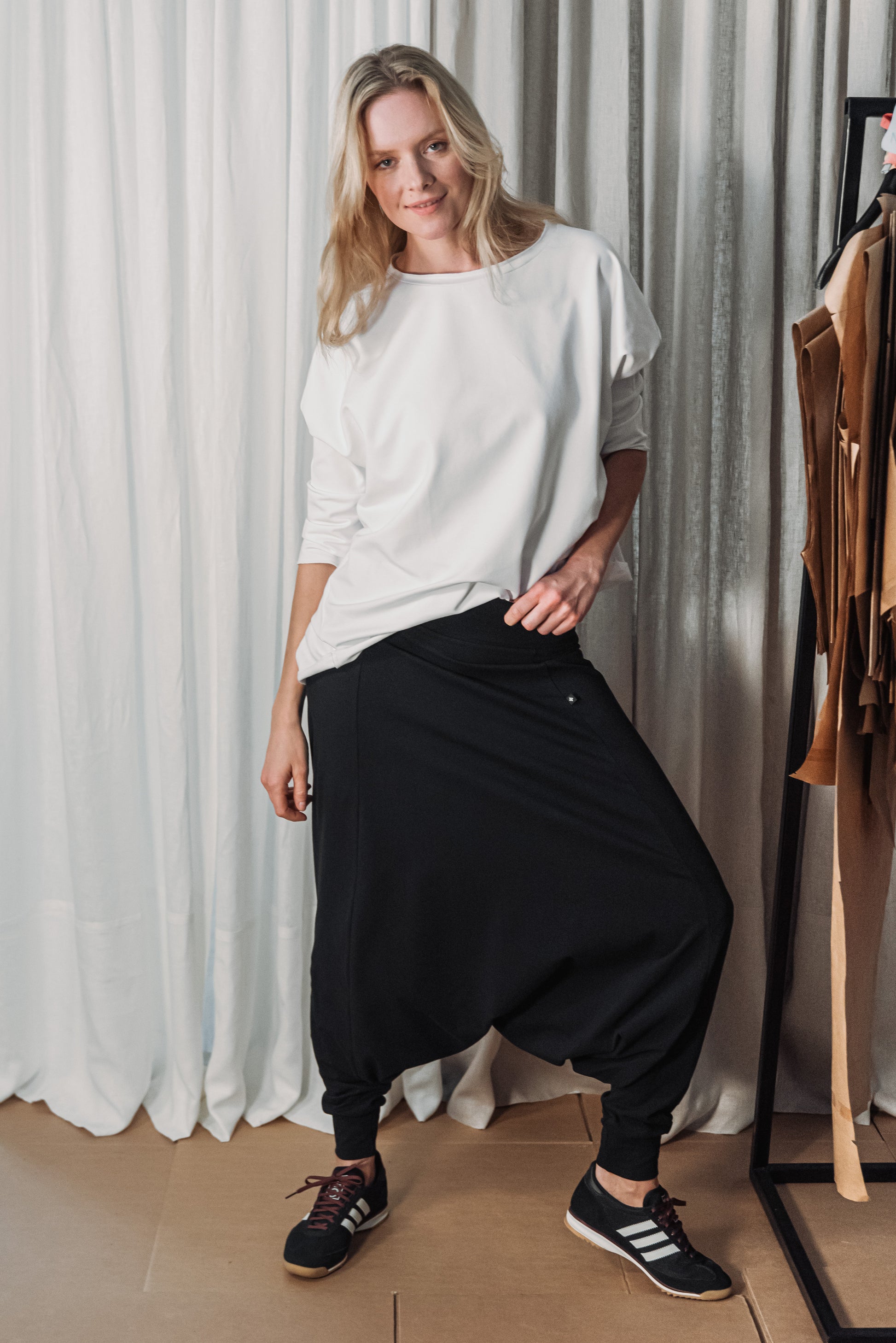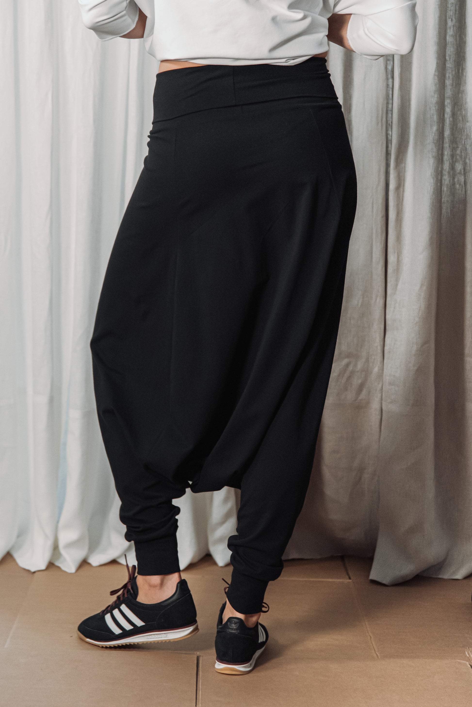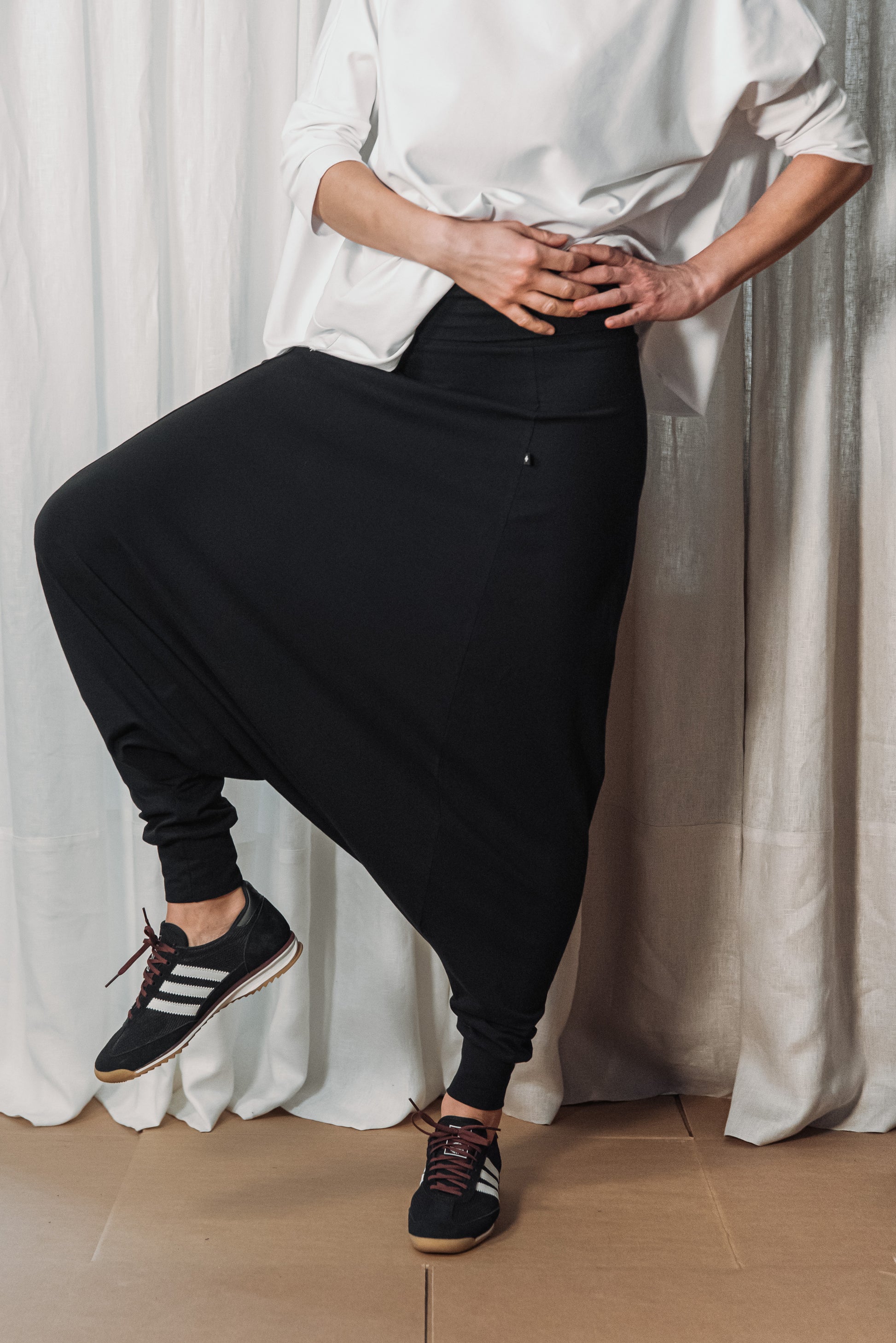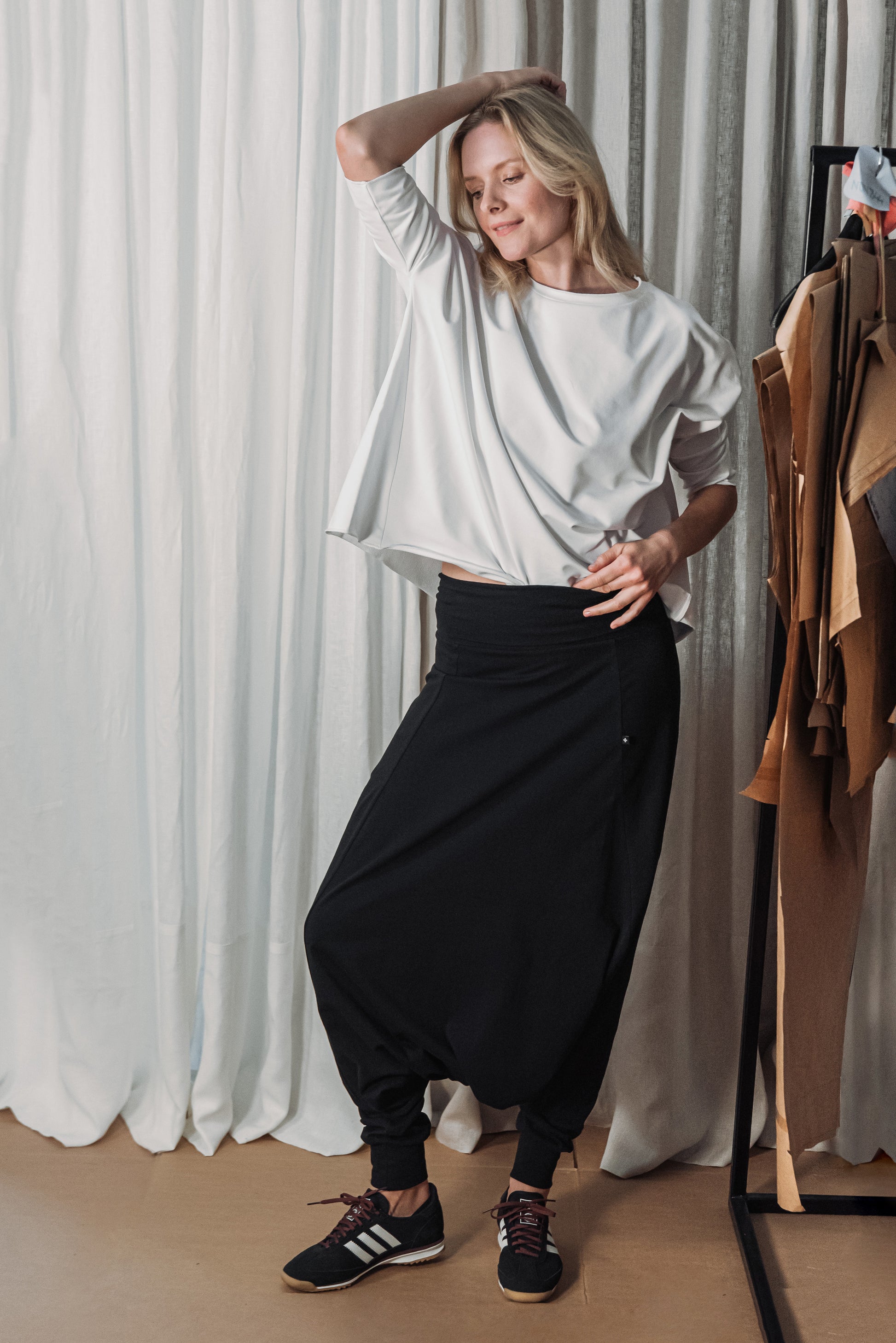 > The waist of the AUM pants is made of double material and can be folded back (so it is comfortable for new mothers) - very deep bottom, with a fitted part at the ankle. Pulled up to the chest, it can also be worn as overalls - extremely comfortable and cool style. Number one favorite based on our customers' feedback - because it is so natural and easy to wear.