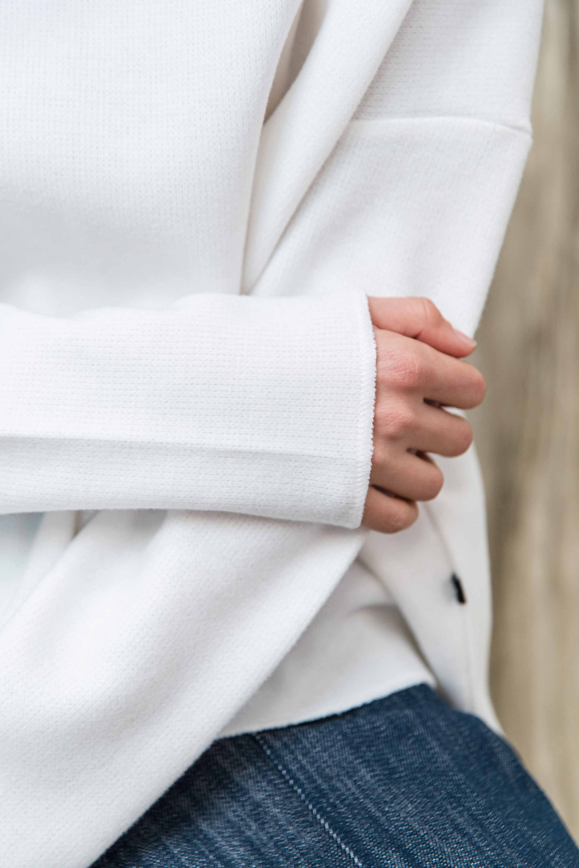The medium-thick, soft knit texture has a natural elasticity that gently follows your movements while providing pleasant warmth. Its surface is extremely soft, silky to the touch, has a soft drape, and gently glides against the skin — this gives it that immediately noticeable comfort that is especially good on colder days. The structured interweaving of the fibers ensures stability, yet retains the intimate, homely softness that is characteristic of quality knit fabrics. Due to the natural softness, the surface may slightly pill with wear - this is a completely normal process typical of knitted fabrics that develops during everyday use. If you experience this, the smaller lumps can be carefully removed by hand or with a gentle pilling remover, so the material retains its harmonious, soft appearance and beauty for a long time. The warmth, elasticity and softness of the texture combine to create a material that is both reliable, comfortable and gently embracing — a truly pleasant companion for everyday life in the cooler seasons.