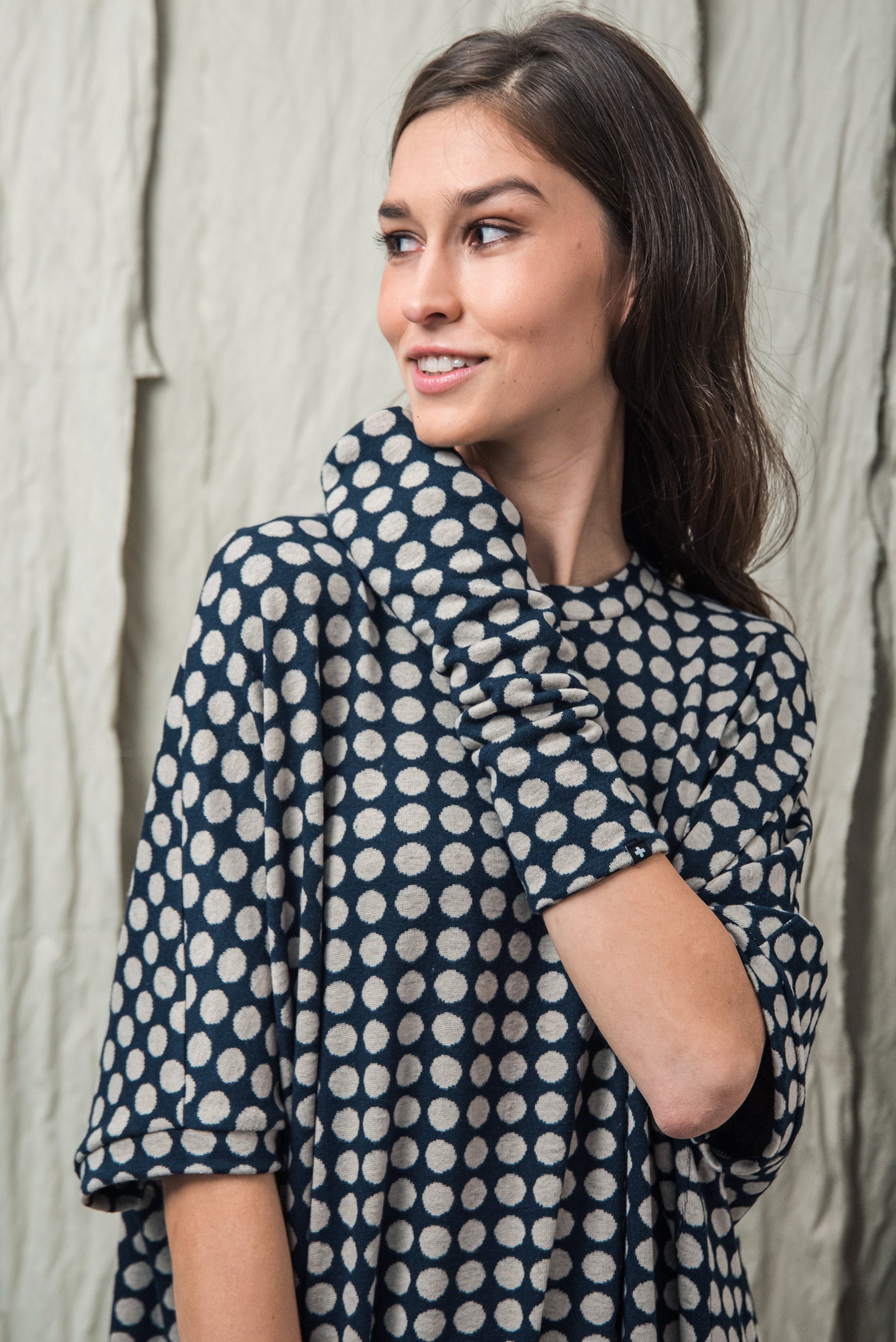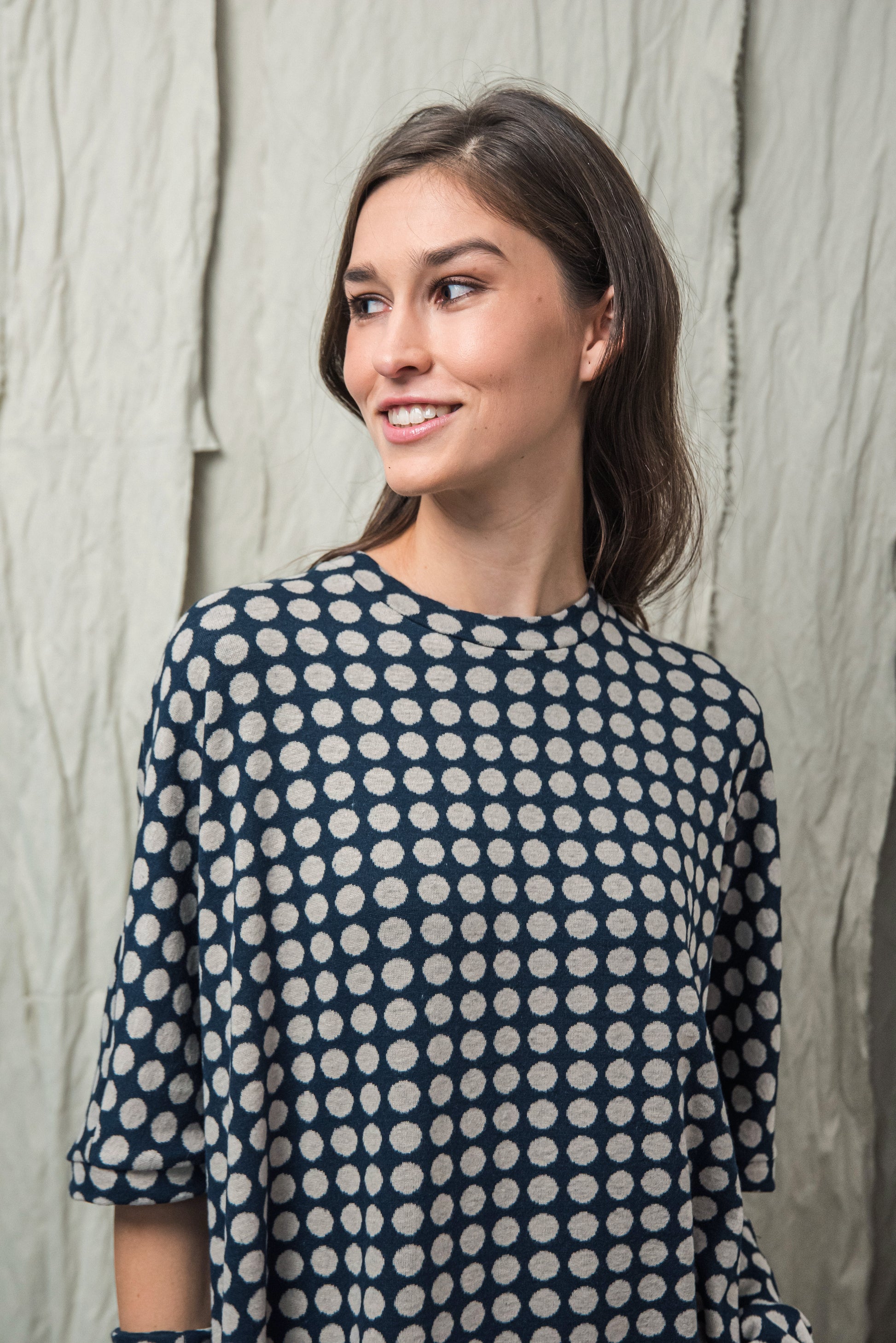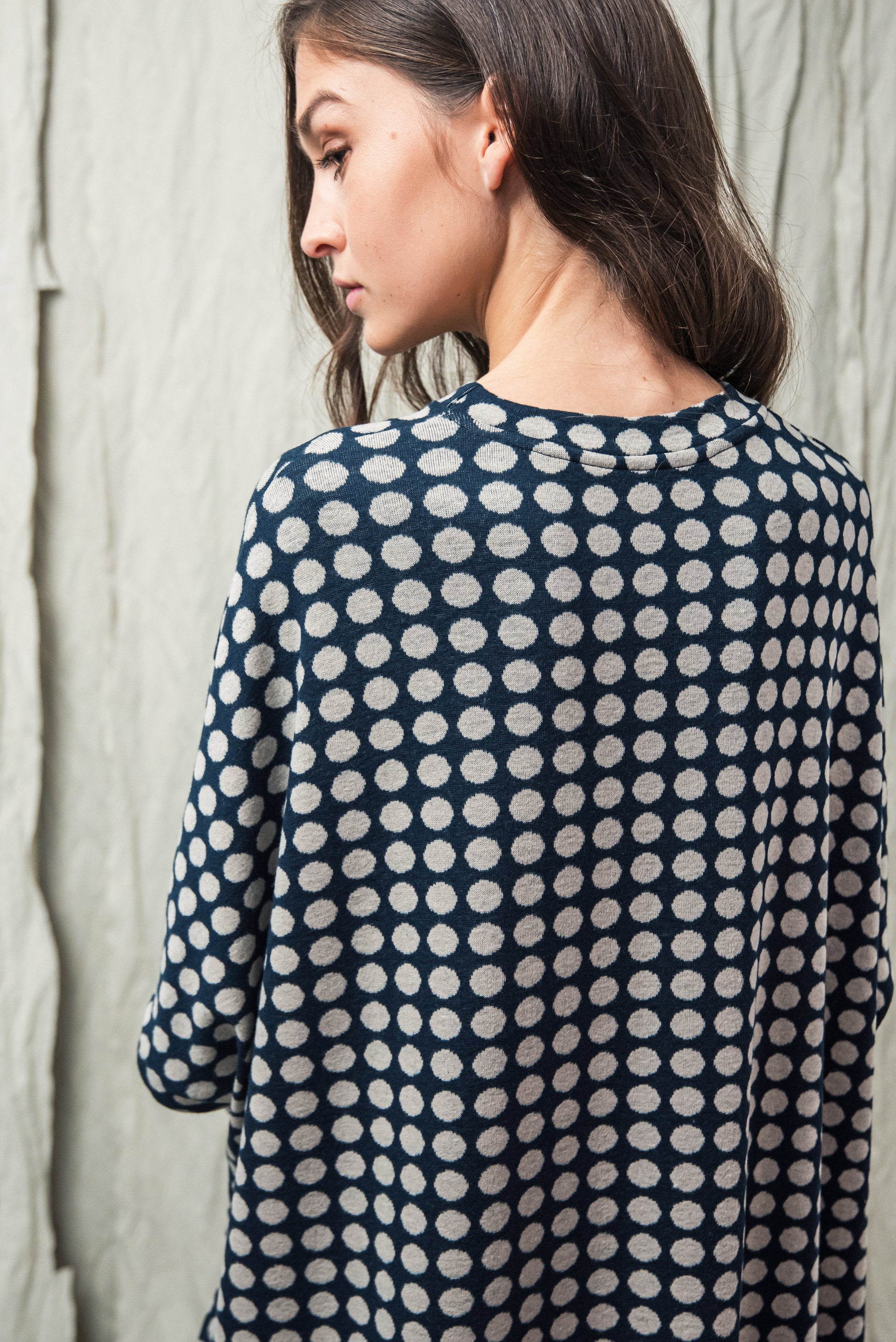The knitted fabric with a polka dot pattern on a blue background has a soft, natural feel and feels pleasantly warm when worn. Its slightly elastic structure allows for easy movement while maintaining its shape. The texture is comfortable, airy and durable, well ventilated and ideal for everyday wear. The pattern is playful yet understated, so it fits harmoniously with clean, timeless pieces.