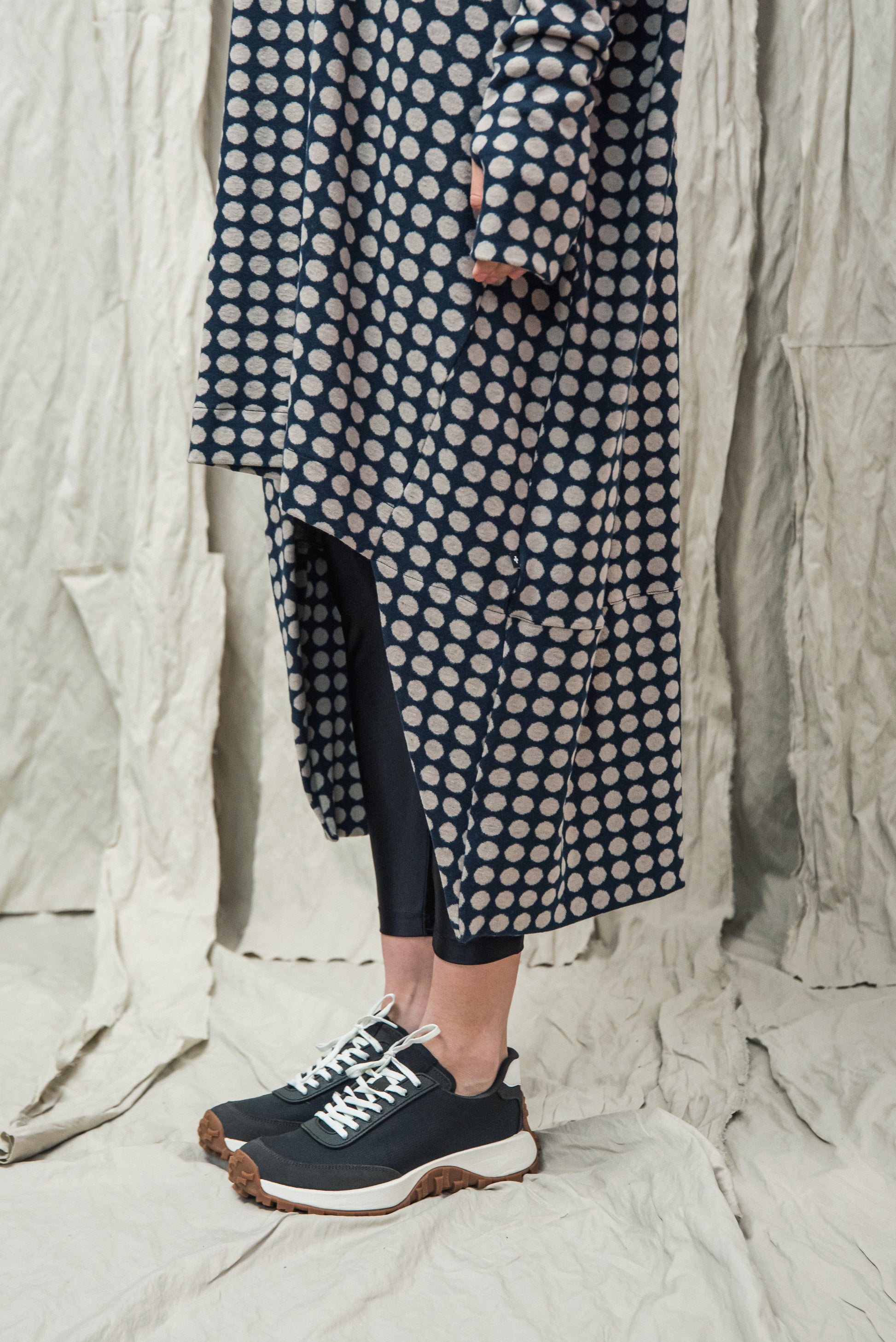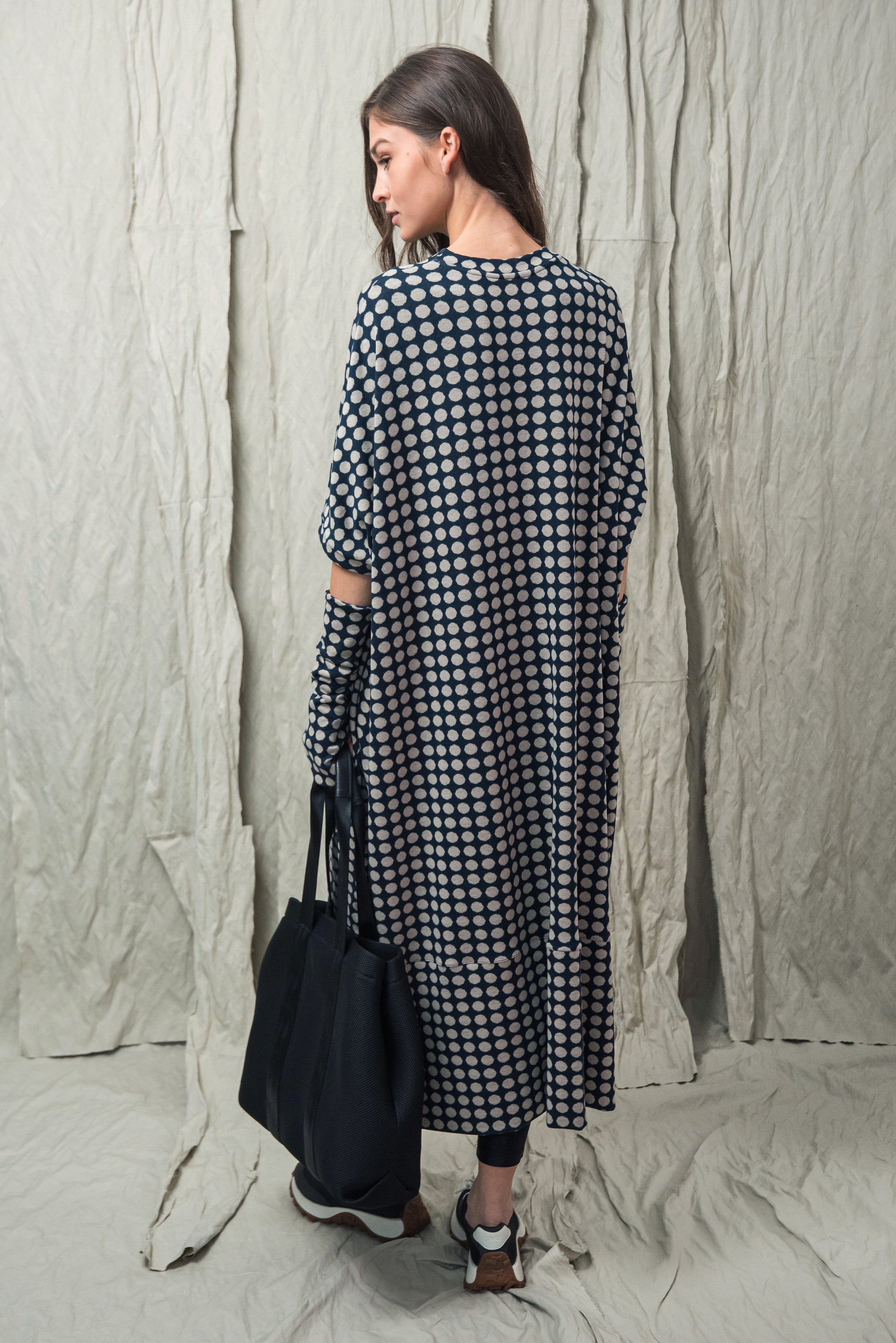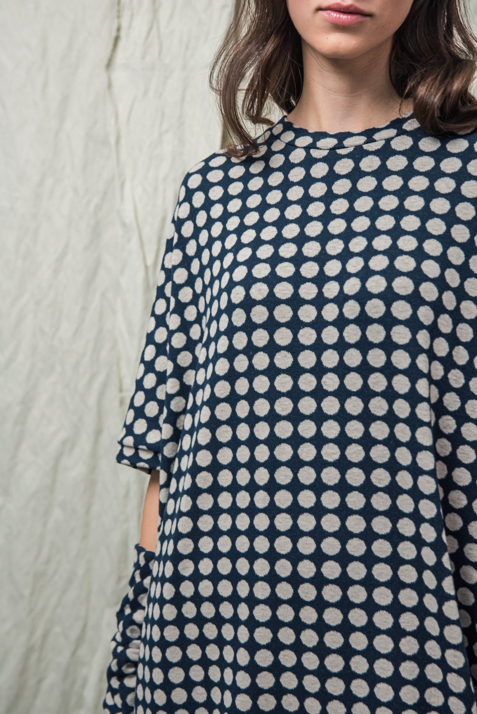 The knitted fabric with a polka dot pattern on a blue background has a soft, natural feel and feels pleasantly warm when worn. Its slightly elastic structure allows for easy movement while maintaining its shape. The texture is comfortable, airy and durable, well ventilated and ideal for everyday wear. The pattern is playful yet understated, so it fits harmoniously with clean, timeless pieces.