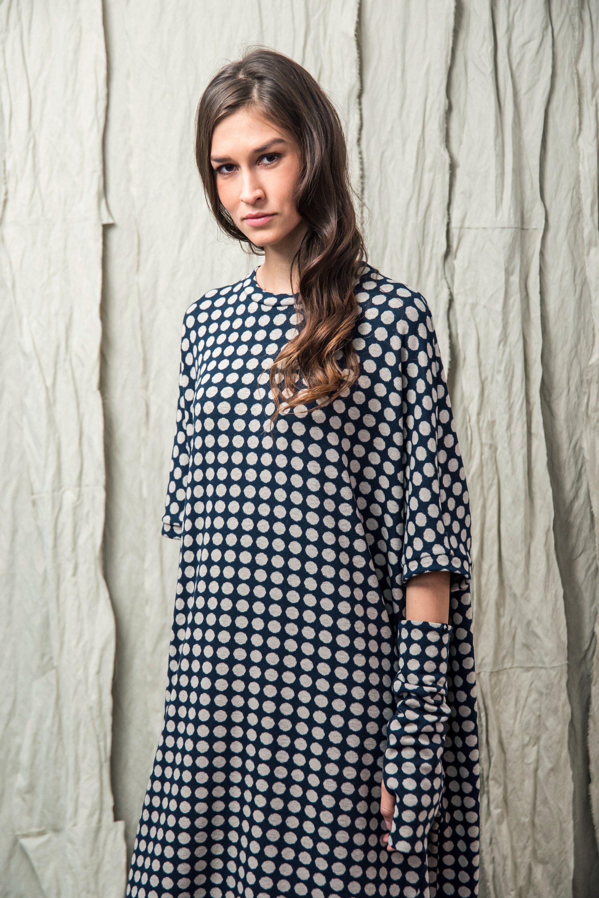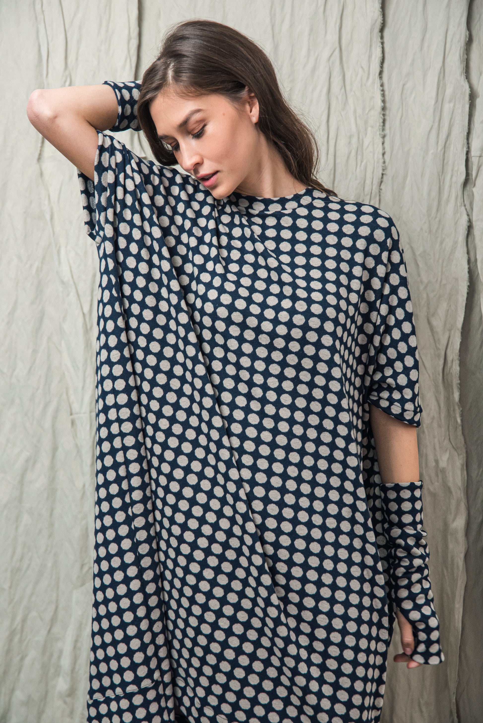 > The GOBE dress is a light, playful piece that offers freedom and presence at the same time. Its asymmetrical length – shorter in the front, longer in the back – adds subtle movement to the silhouette, while the loose, flowing shape creates a natural elegance. Its round neckline and comfortable, casual sleeves ensure a relaxed feel, whether combined as a dress or as a long top. The pattern adds character, but does not distract from the clean NONPLUS character; the piece is as special as it is understated. GOBE is the ideal choice for anyone who loves free-flowing, easy-to-fall shapes and who is looking for a piece of clothing that makes you feel comfortable and stylish at the same time.