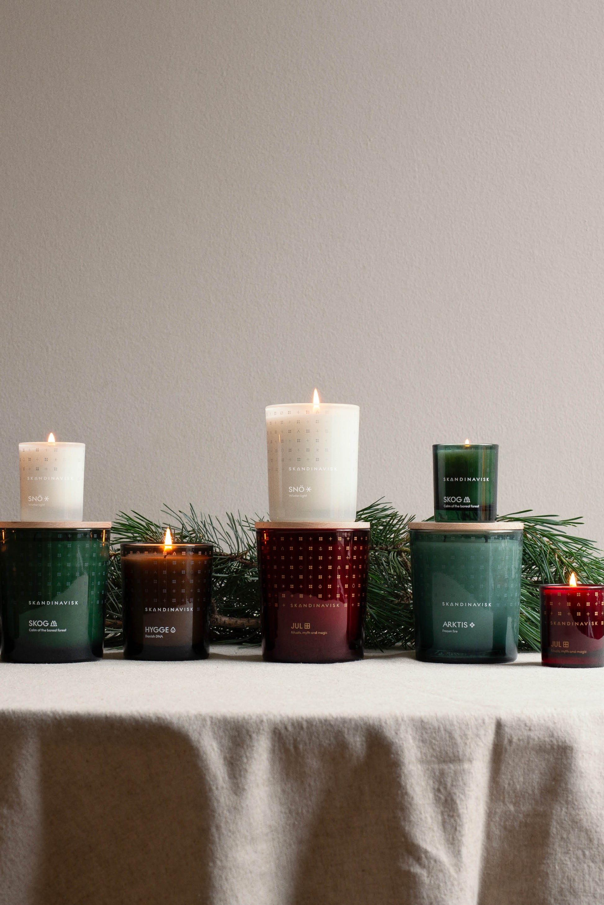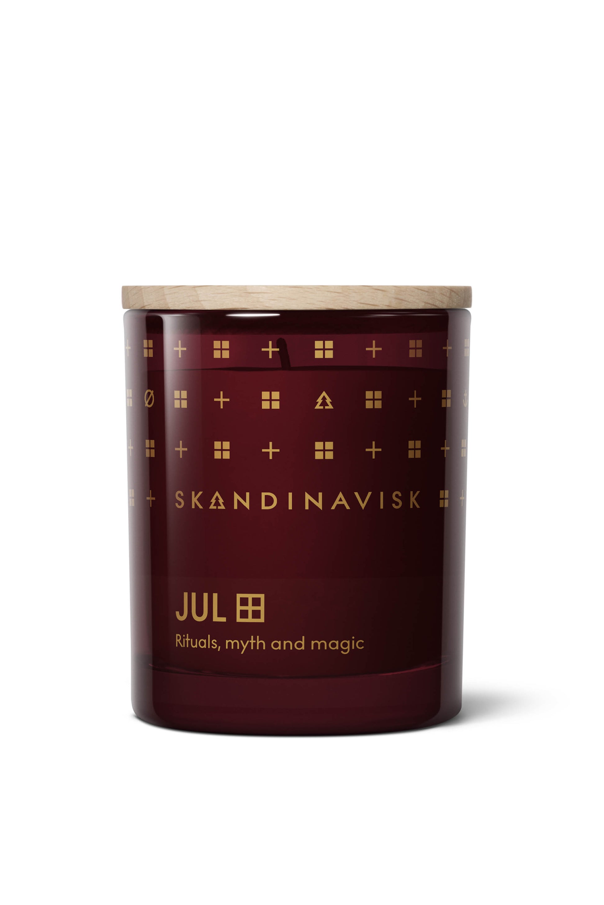 > Special edition JUL scented candle with seasonal design and box . The wax is derived from sustainably grown and GMO-free Swedish rapeseed oil, non-GMO, and is blended to burn steadily and slowly with the least possible impact on the environment. Vegan and Cruelty-free mixture. Cast in a painted glass candle holder , pure cotton wick cal and engraved With FSC-certified beech wood lid. The packaging card and packaging sourced from sustainably managed northern forests, made with natural dyes . 65g, with a burn time of up to 20 hours. The glass can be reused as a tealight or candle holder, or for any storage purpose.