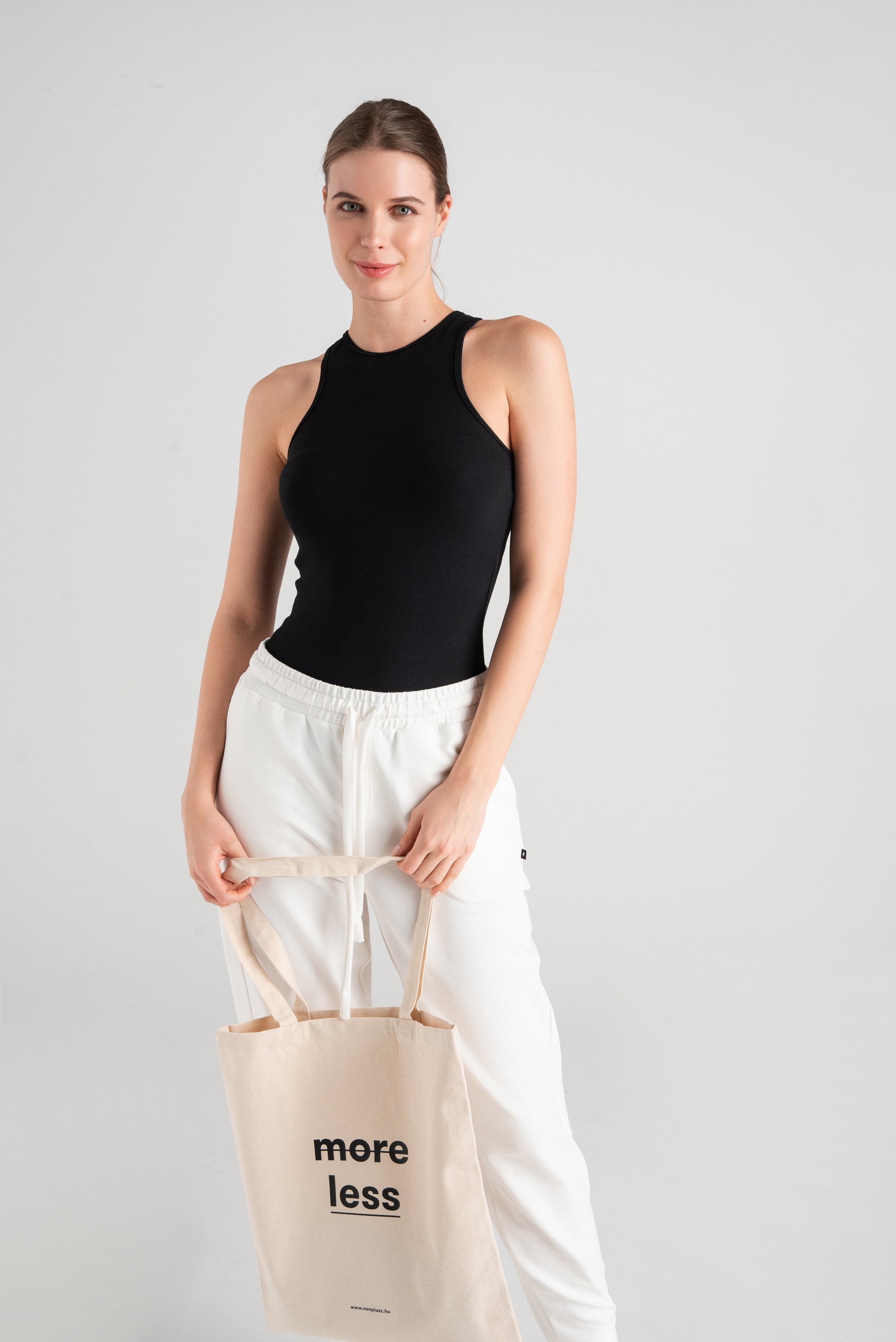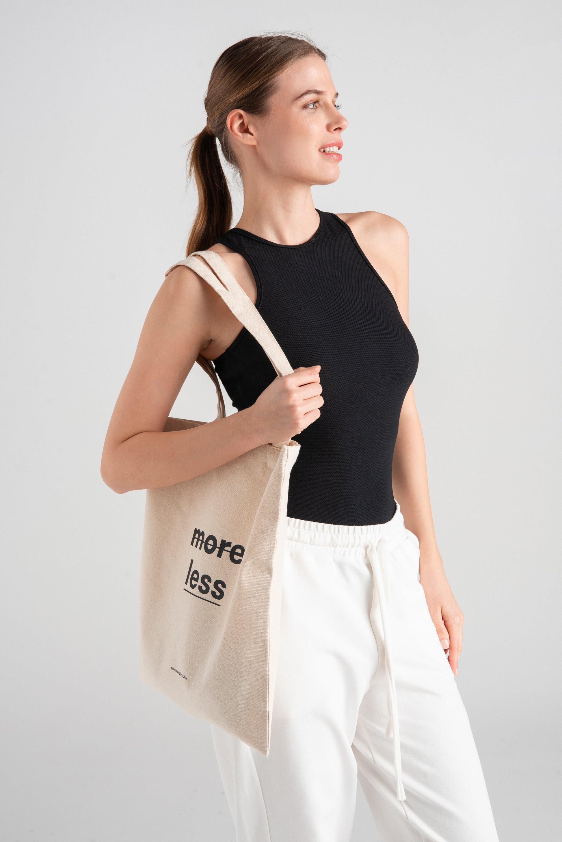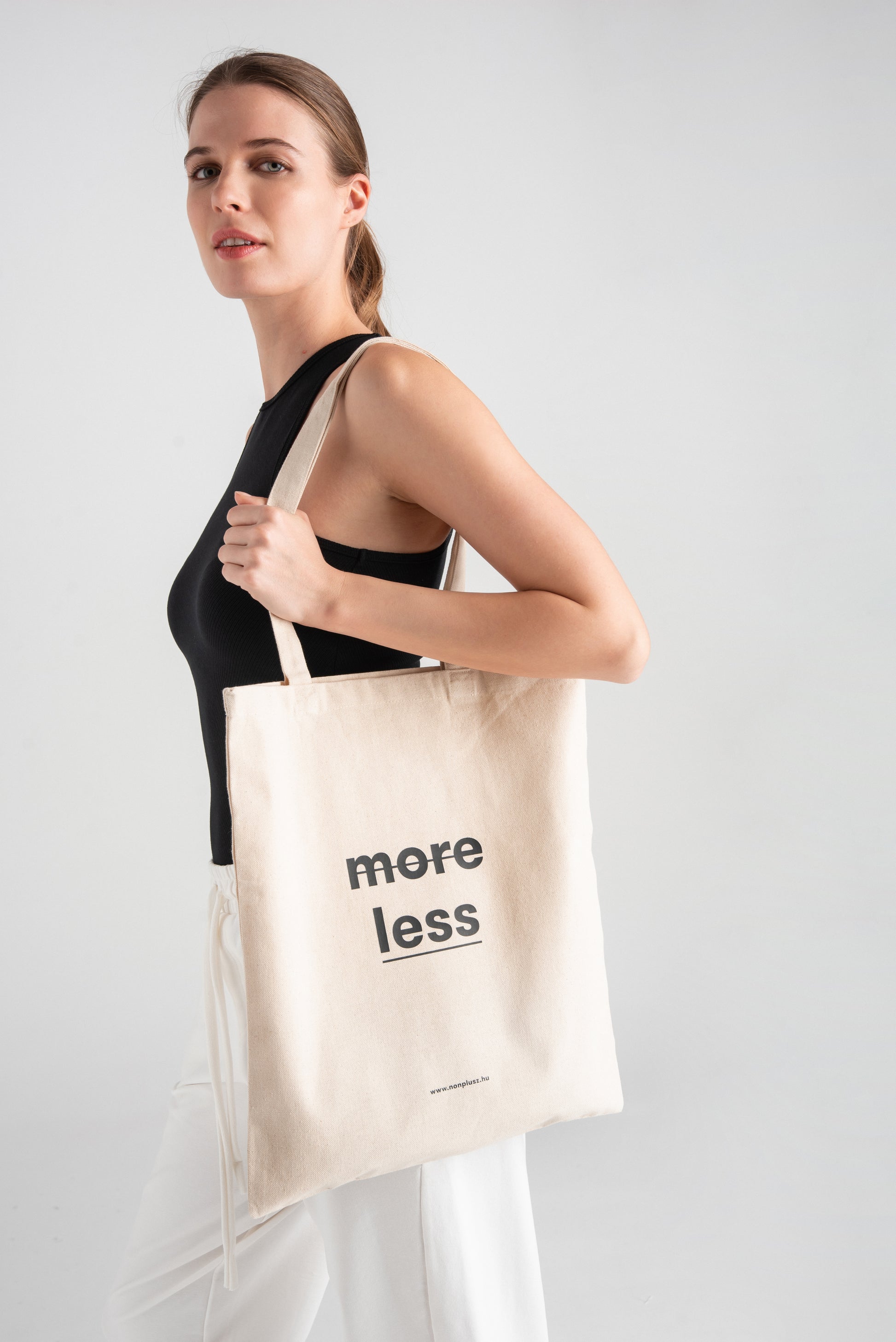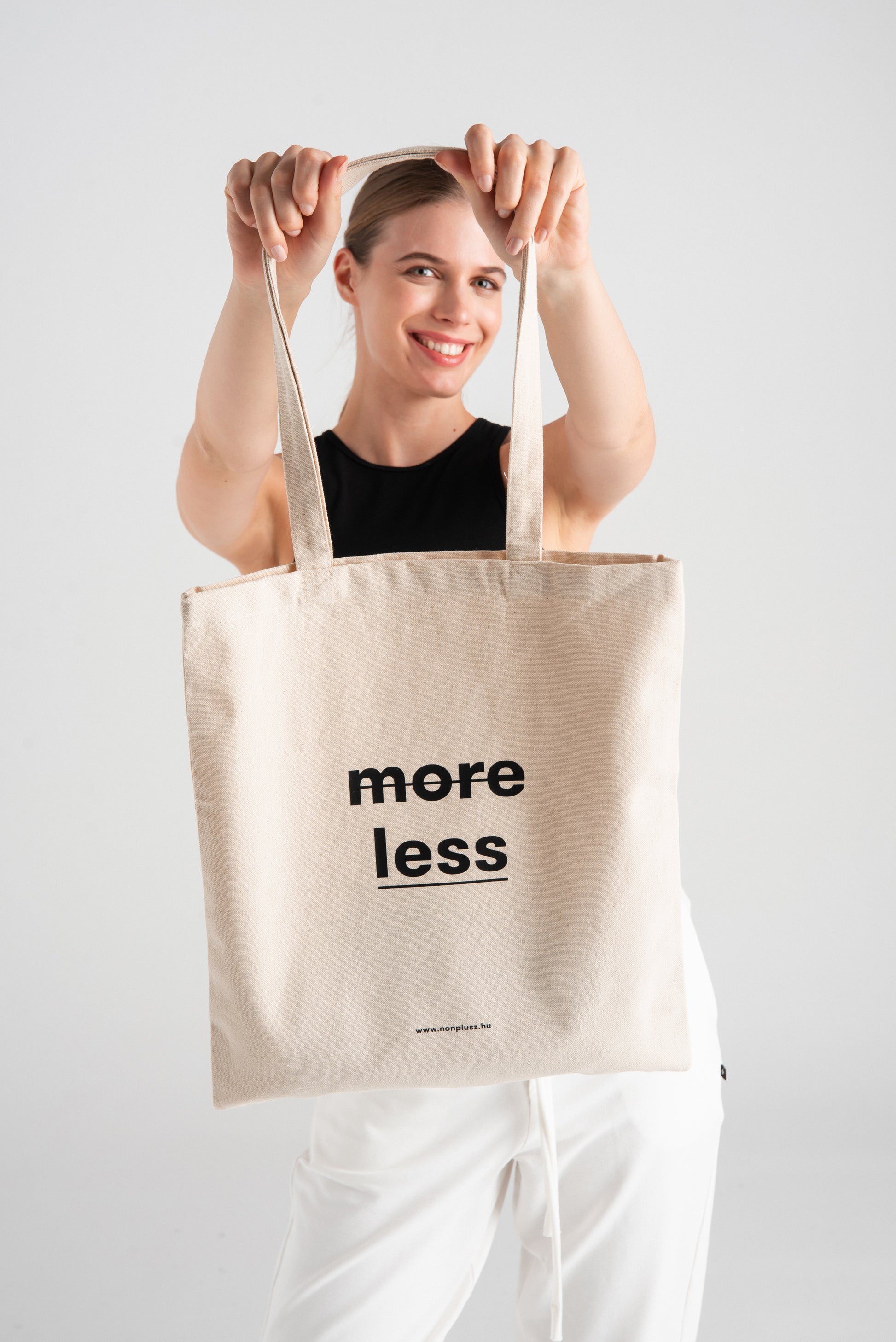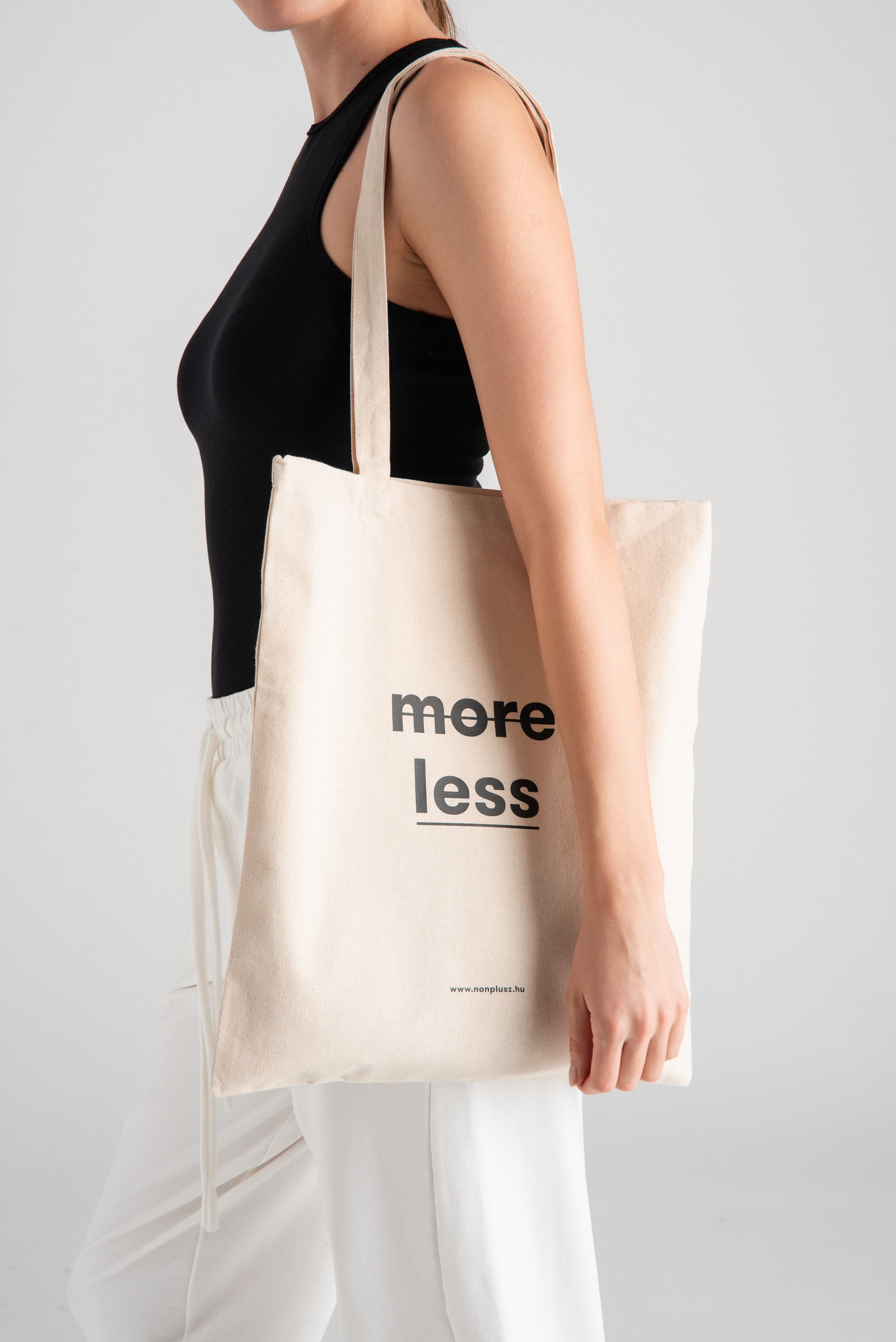 > KE Our cotton bag with "more less" graphics is an eco-friendly alternative to disposable shopping bags. Always have one or two in your bag, so you can eliminate unnecessary paper or plastic waste from your life when shopping.