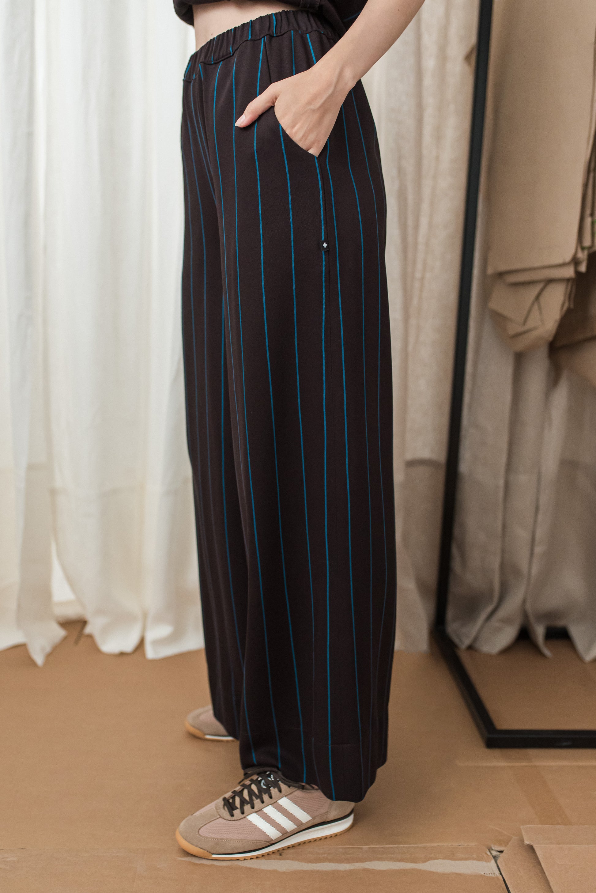 > The KONE pants are a loose-fitting, comfortable piece. Their elastic waist gently hugs the body – it doesn't constrict, but it still holds, so they stay comfortable even when moving all day long. There are two practical pockets on the side, and the cut widens downwards, giving the pants a light yet distinct look. Made for the fall season from a brown-based turquoise striped material, they lend a clean, elegant character while being easy to pair with other basic pieces.