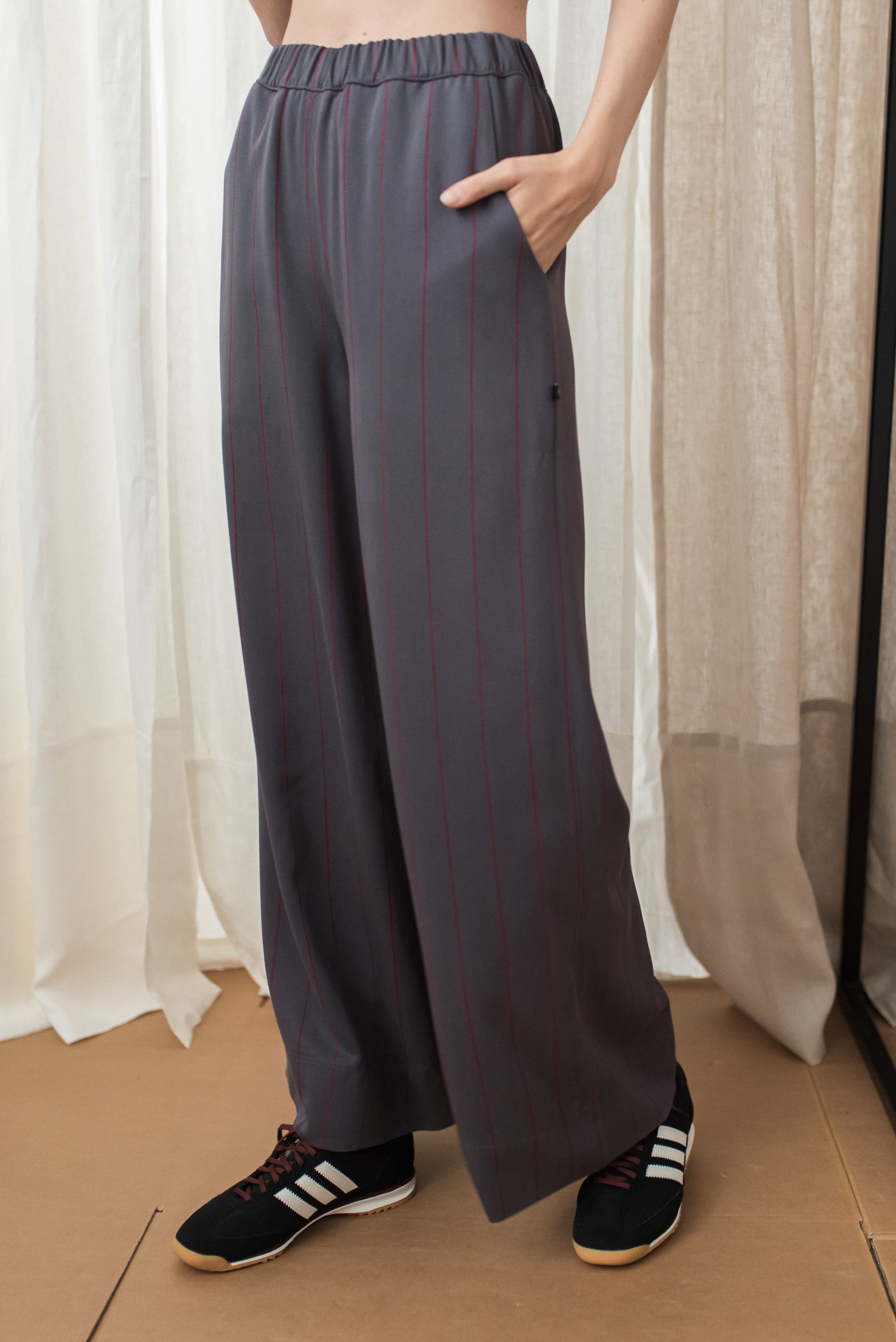 > The KONE pants are a loose-fitting, comfortable piece. Their elastic waist gently hugs the body – it doesn't constrict, but it still holds, so they stay comfortable even when moving all day long. There are two practical pockets on the side, and the cut widens downwards, giving the pants a light yet distinct look. Made for the fall season from a brown-based turquoise striped material, they lend a clean, elegant character while being easy to pair with other basic pieces.