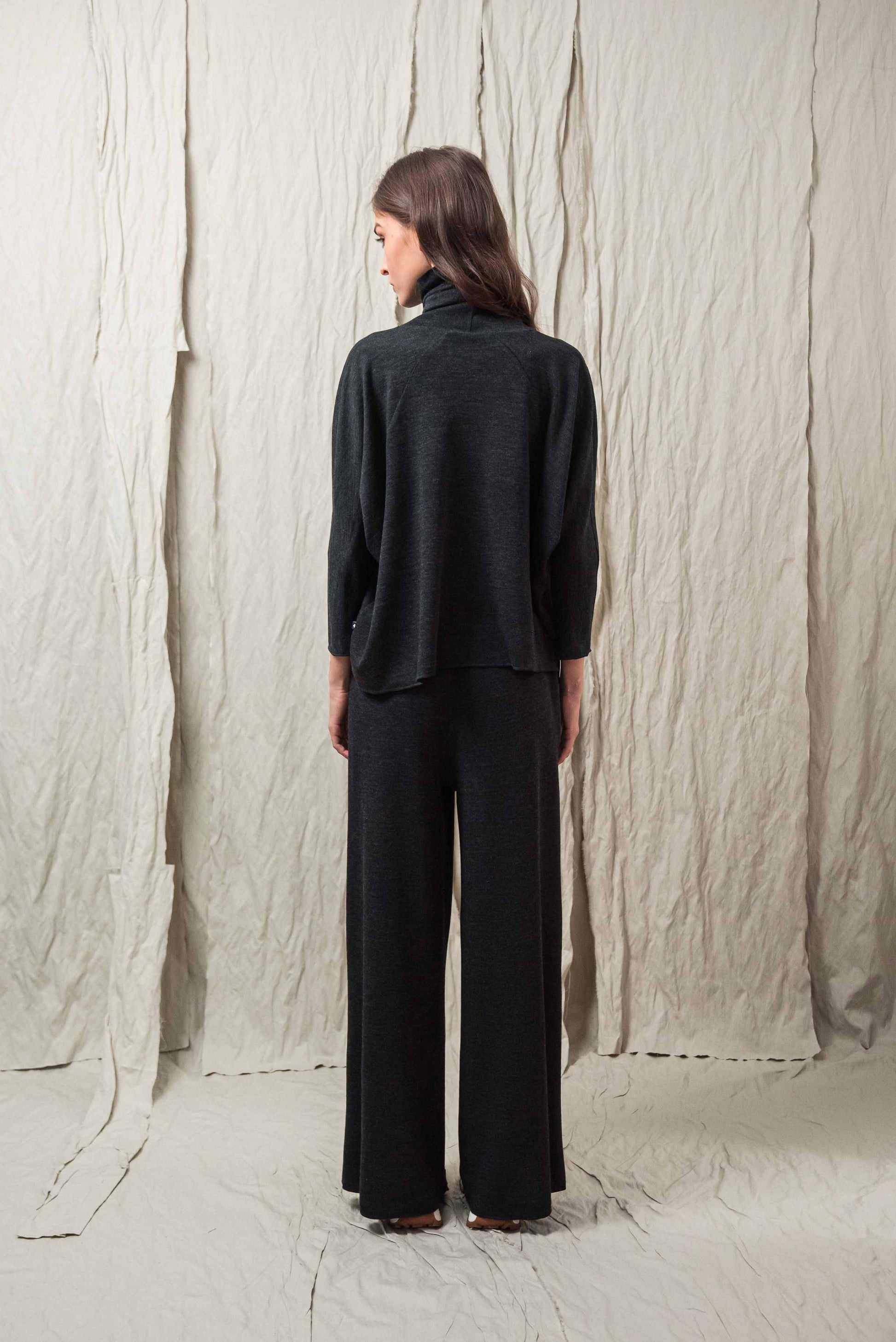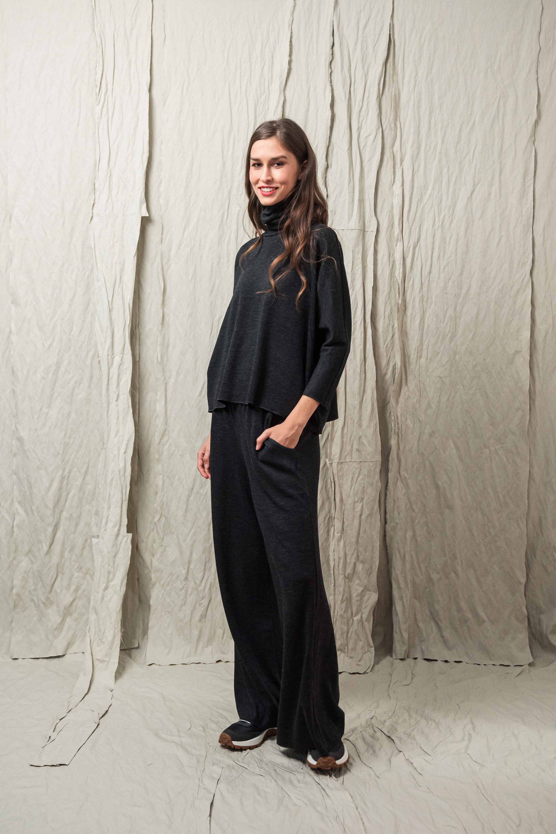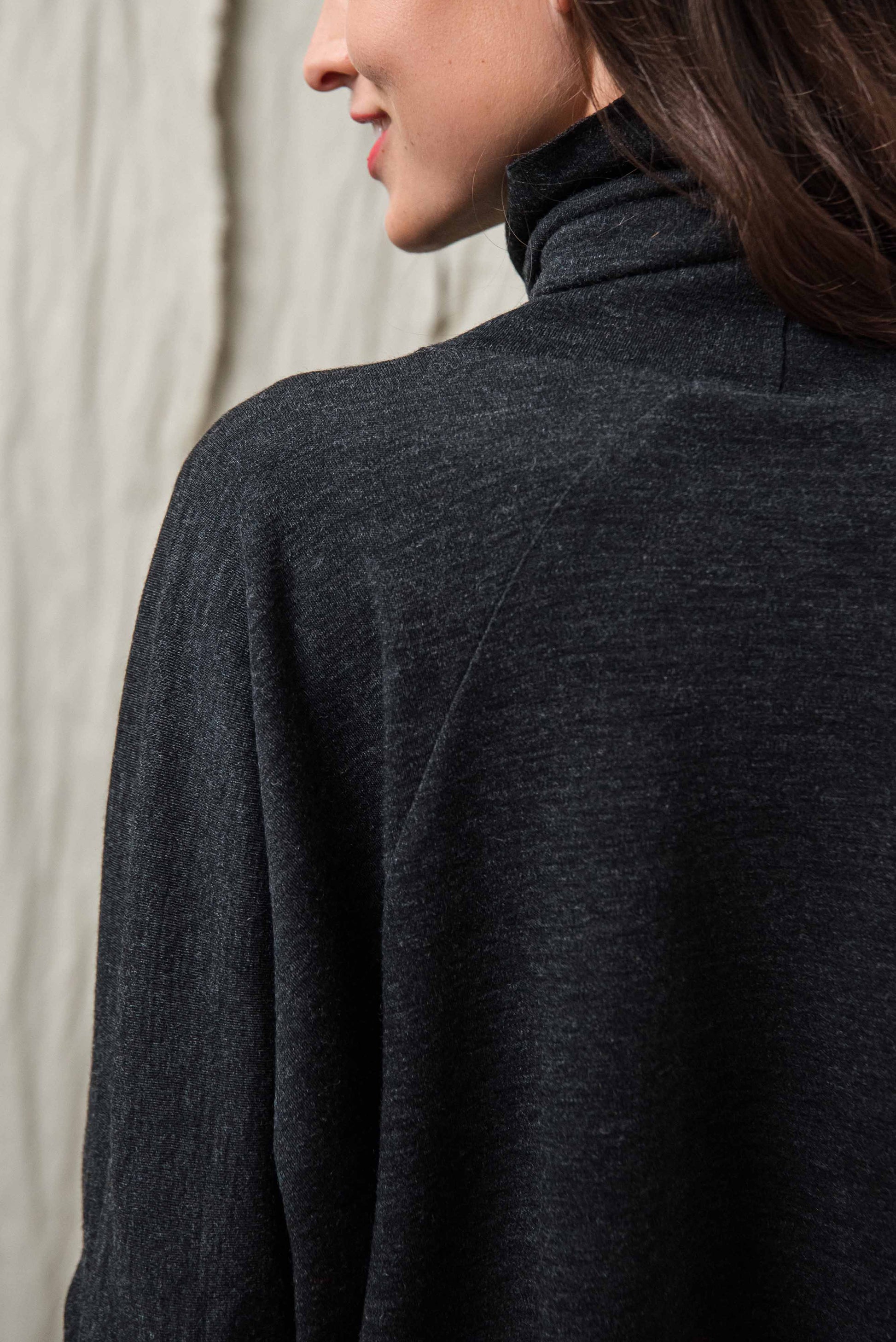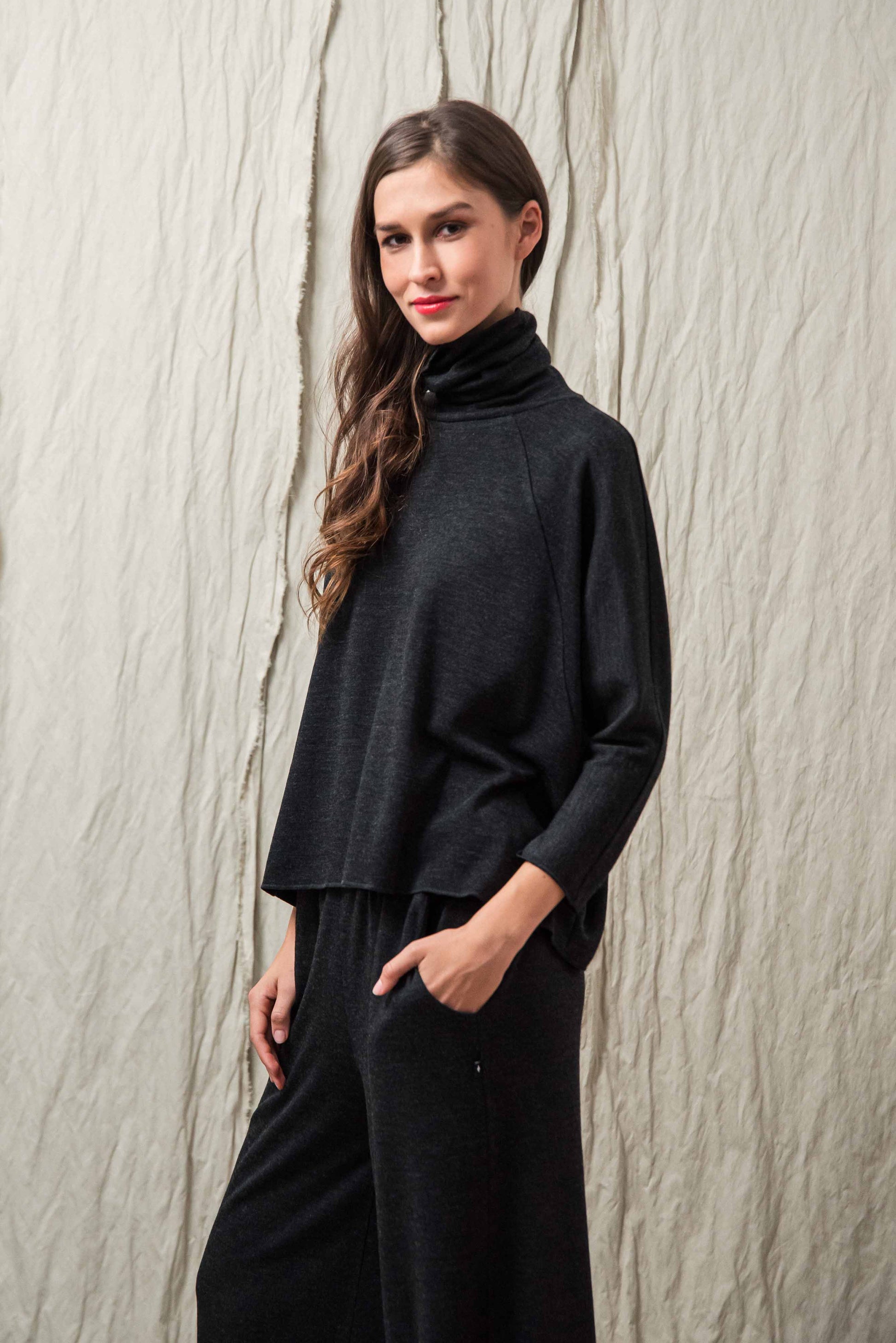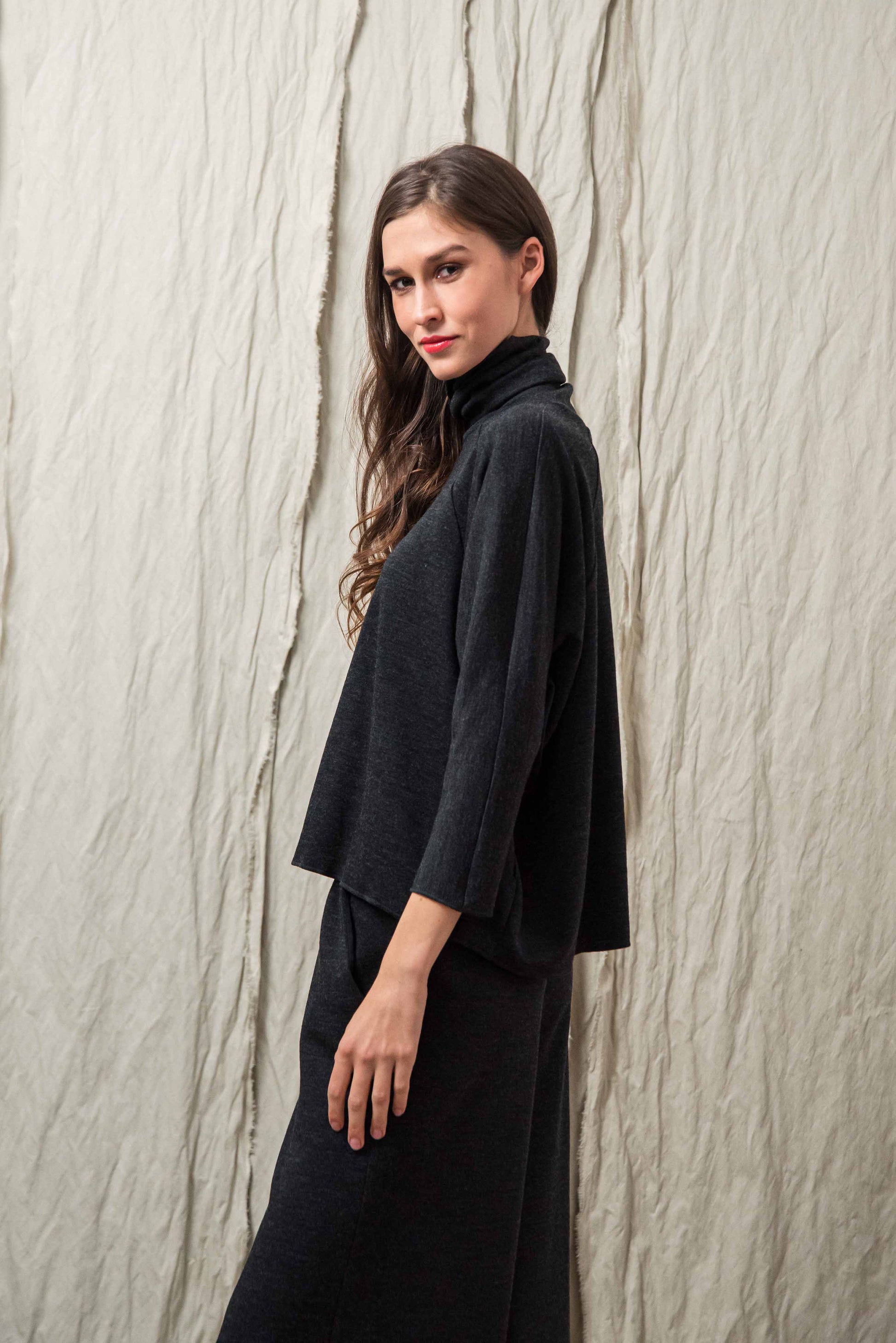 > The LISY top is the top version of the SONA dress, with its clean proportions and comfortable cut, it is a reliable piece for everyday wear. Its loose, loose fit and raglan sleeves allow for free movement, while the turtleneck gives a distinct, characterful look. The ¾ sleeve length makes it practical, easy to layer, and creates a balanced effect when worn alone or under a jacket. The microlocked material edges appear as a generous, yet subtle detail, making the top unique in a restrained way. When worn in a set with our KONE trousers, it provides a uniform, well-thought-out look, and when complemented with our INE gloves made of the same material, it creates a complete, harmonious overall look.