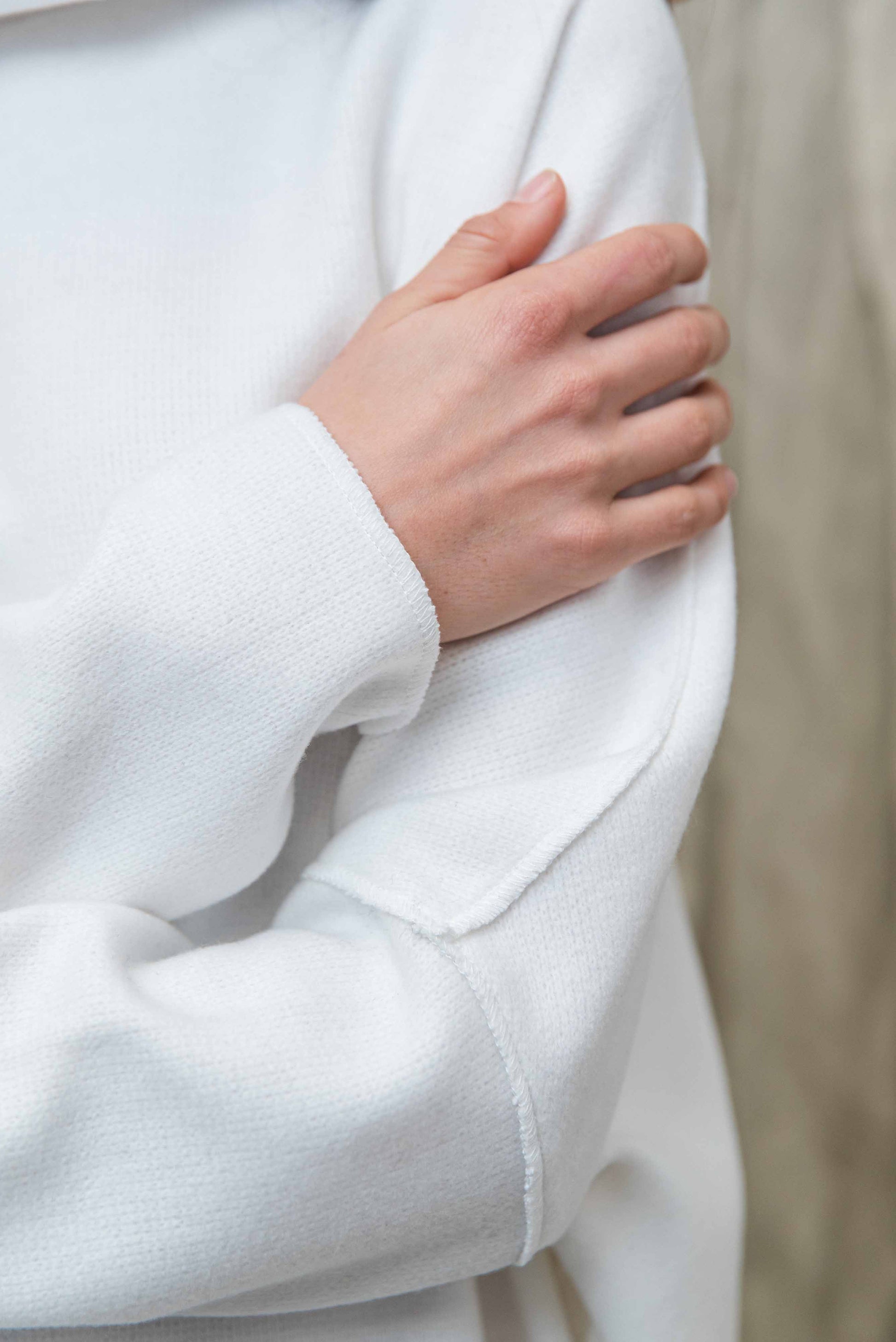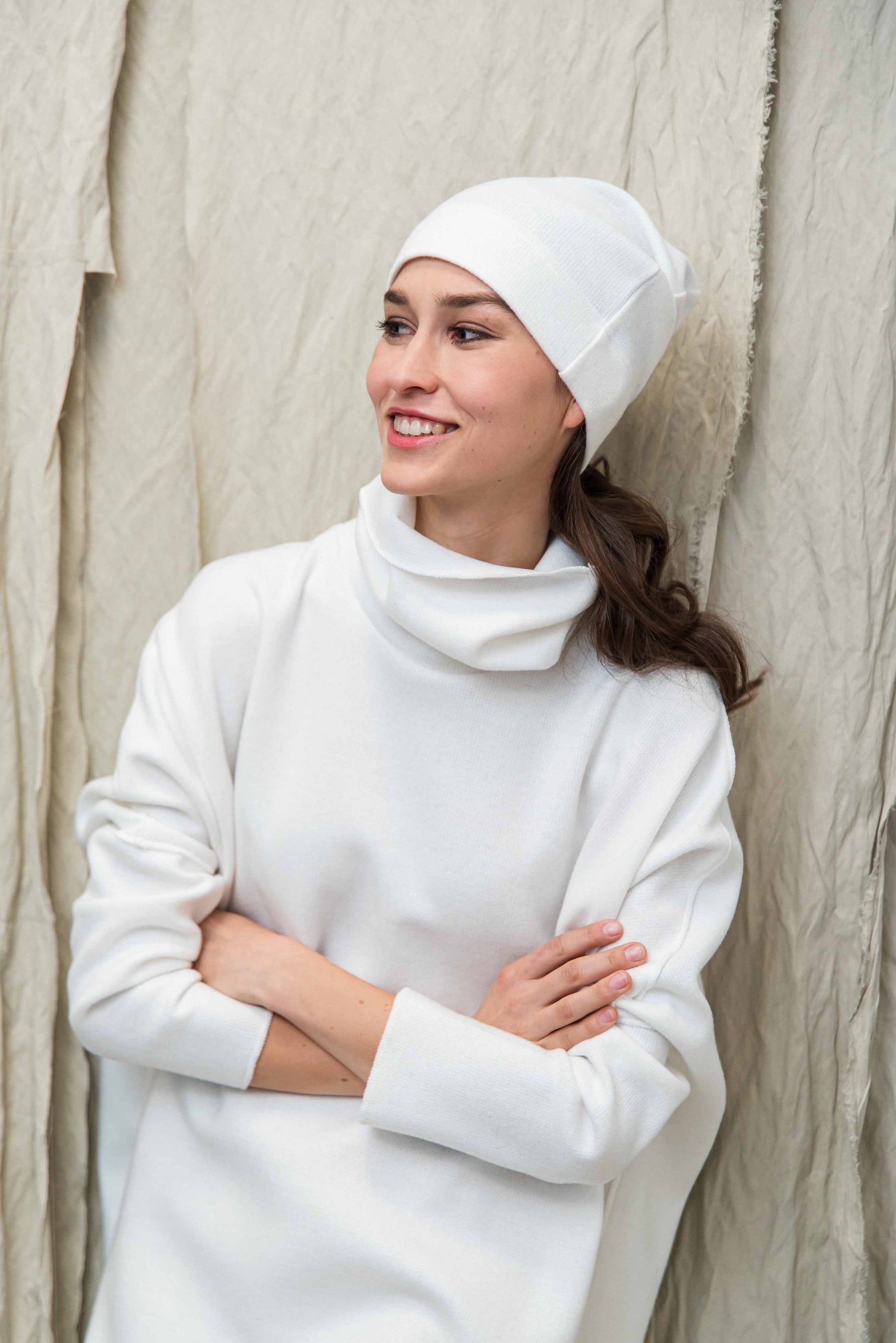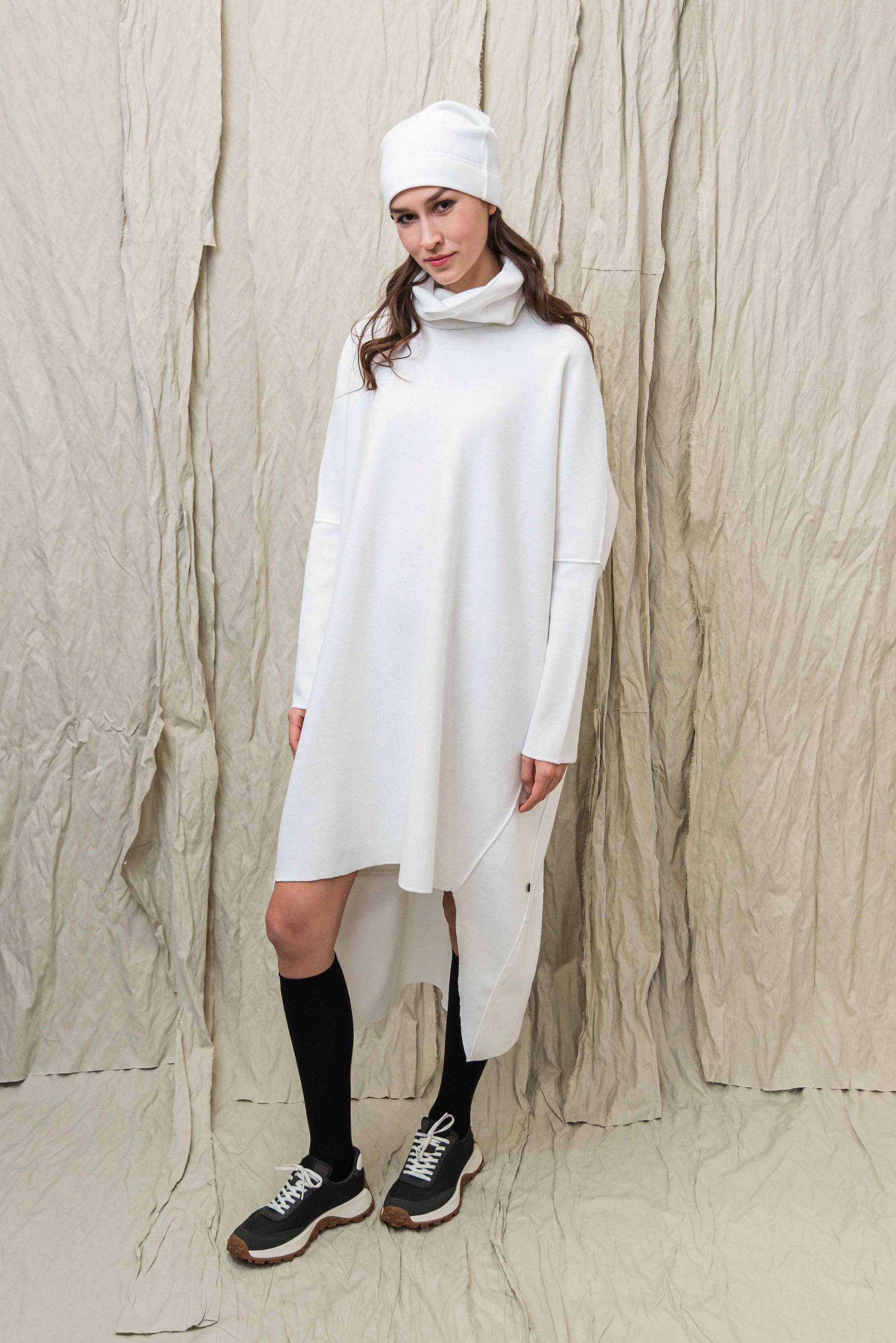 Made of soft, stretchy knit fabric, it provides pleasant warmth and freedom of movement on cooler days. The turtleneck and the asymmetrical cut, slightly longer at the back, give the piece a special character that playfully follows the body's lines. Comfortable yet stylish, it gives a clean, modern look on its own as a dress or combined with trousers - representing the conscious, relaxed aesthetic of NONPLUS.