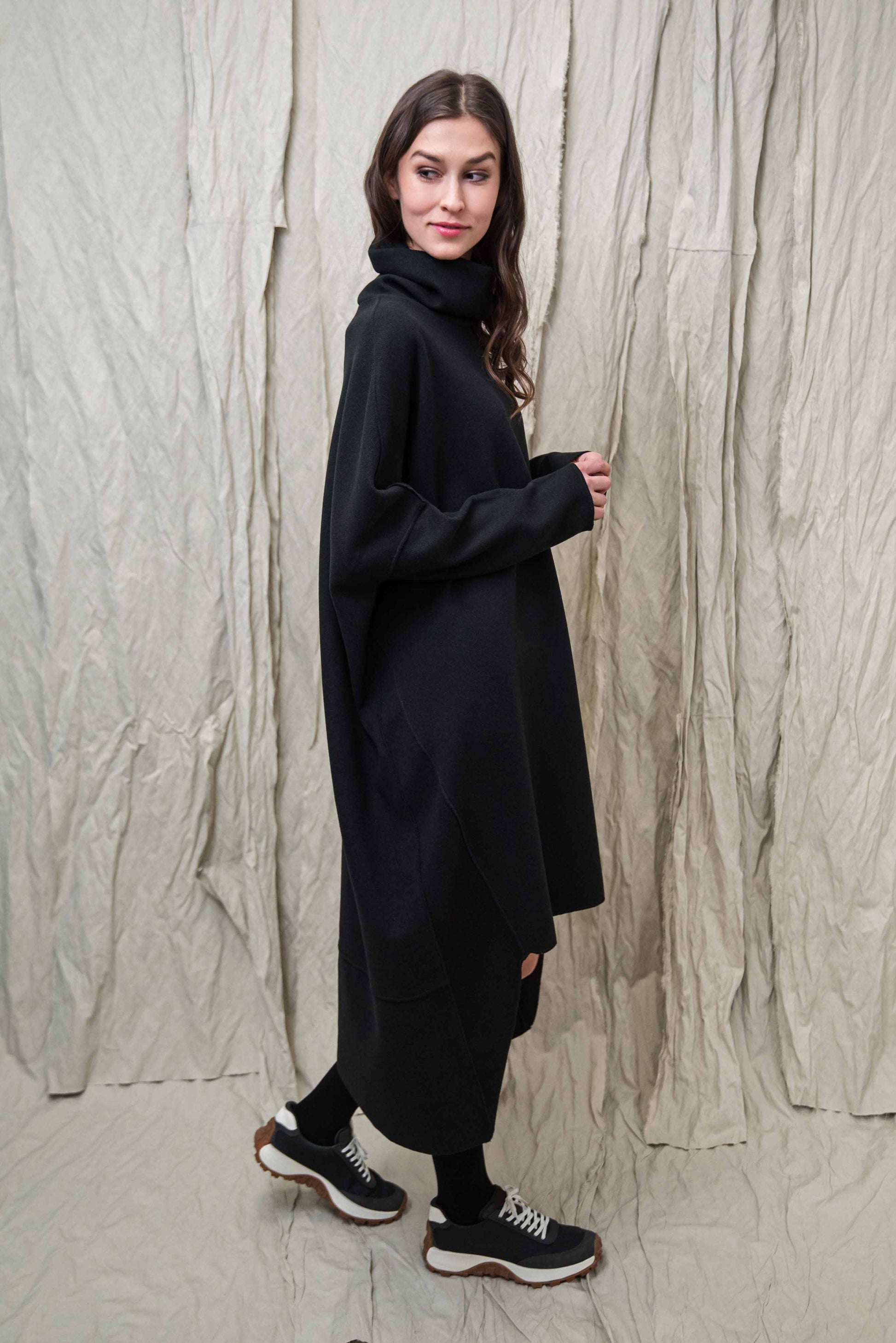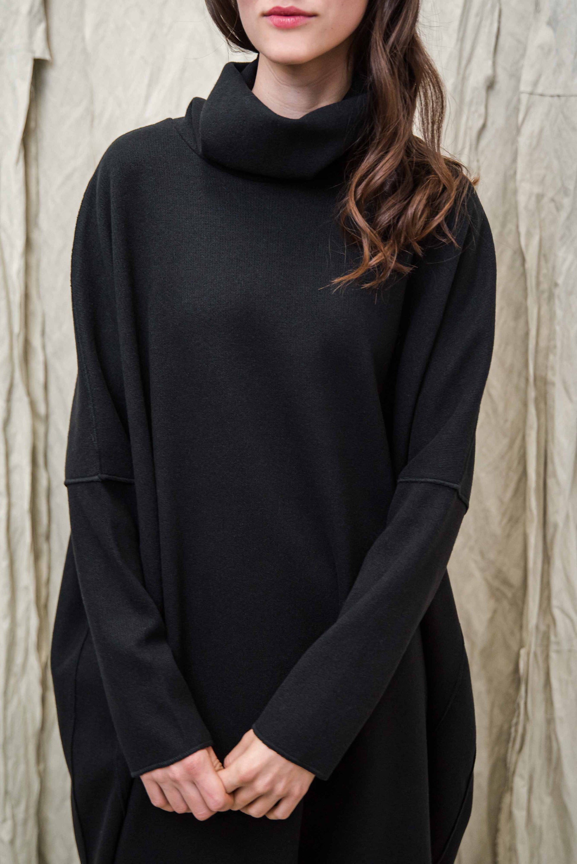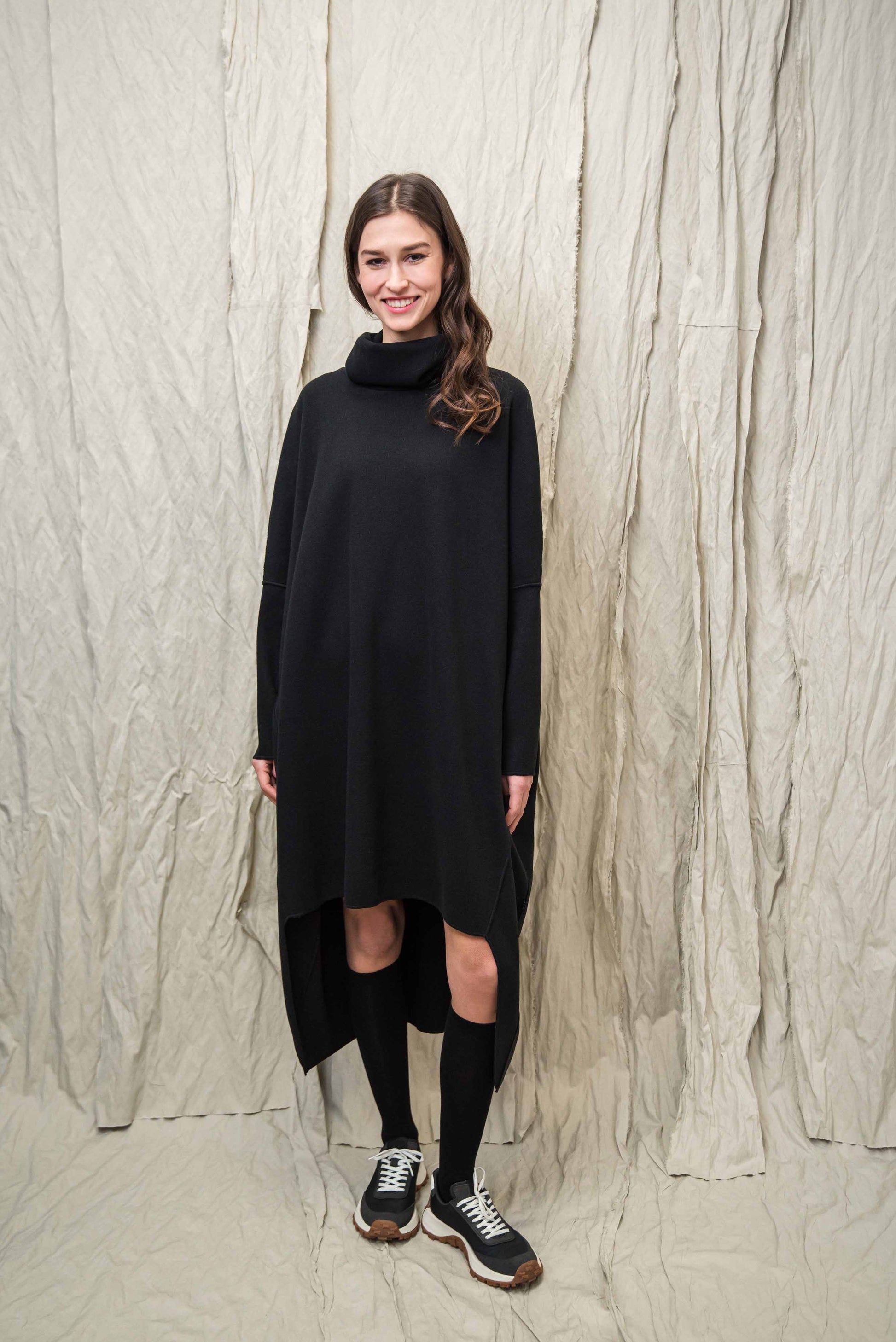 Made of soft, stretchy knit fabric, it provides pleasant warmth and freedom of movement on cooler days. The turtleneck and the asymmetrical cut, slightly longer at the back, give the piece a special character that playfully follows the body's lines. Comfortable yet stylish, it gives a clean, modern look on its own as a dress or combined with trousers - representing the conscious, relaxed aesthetic of NONPLUS.