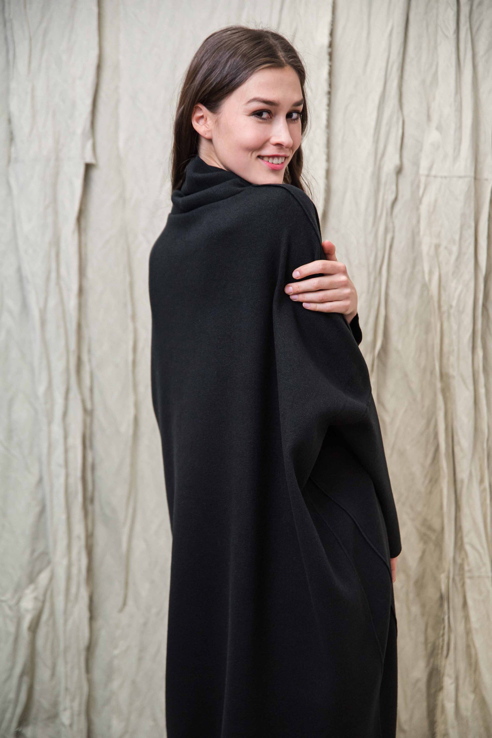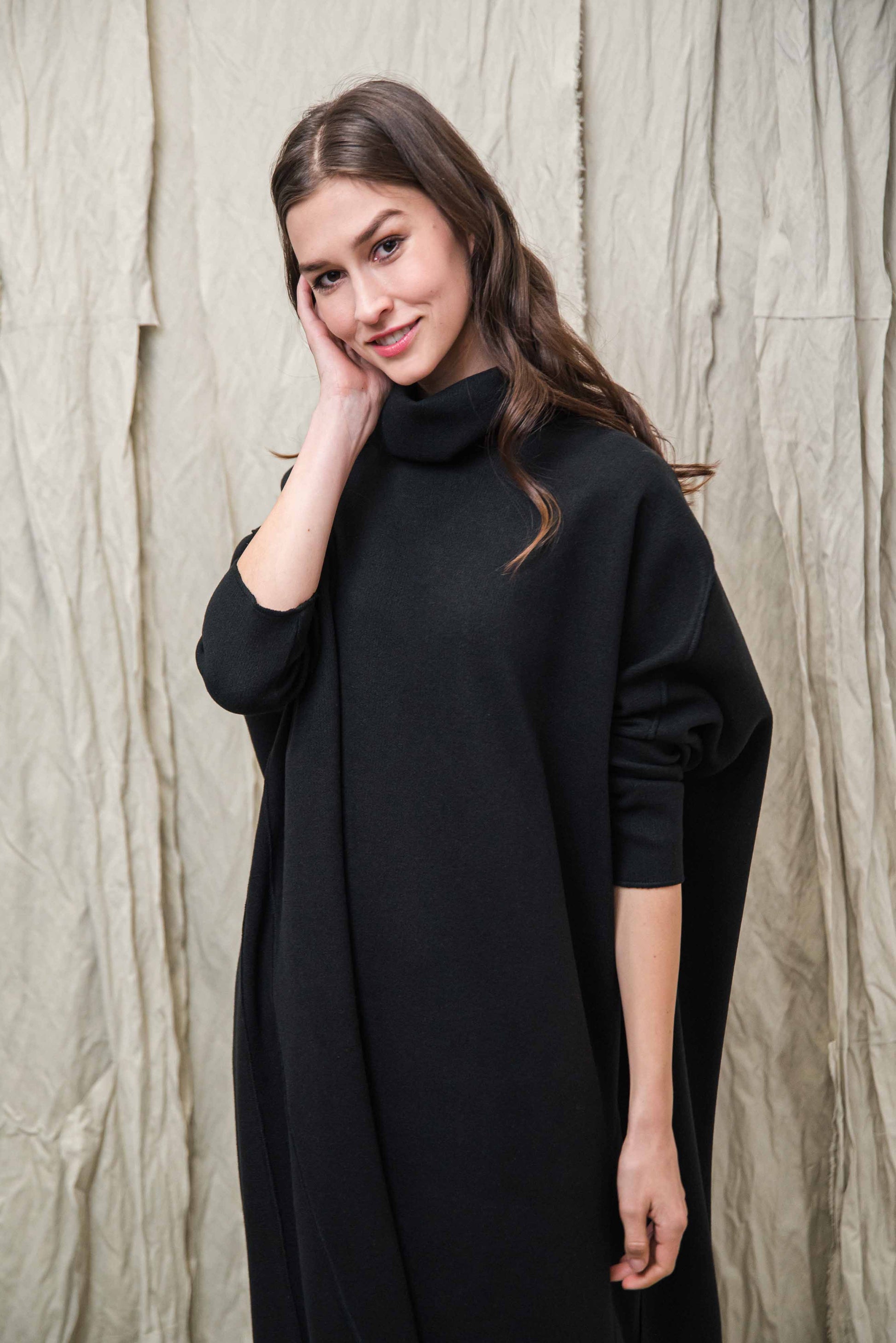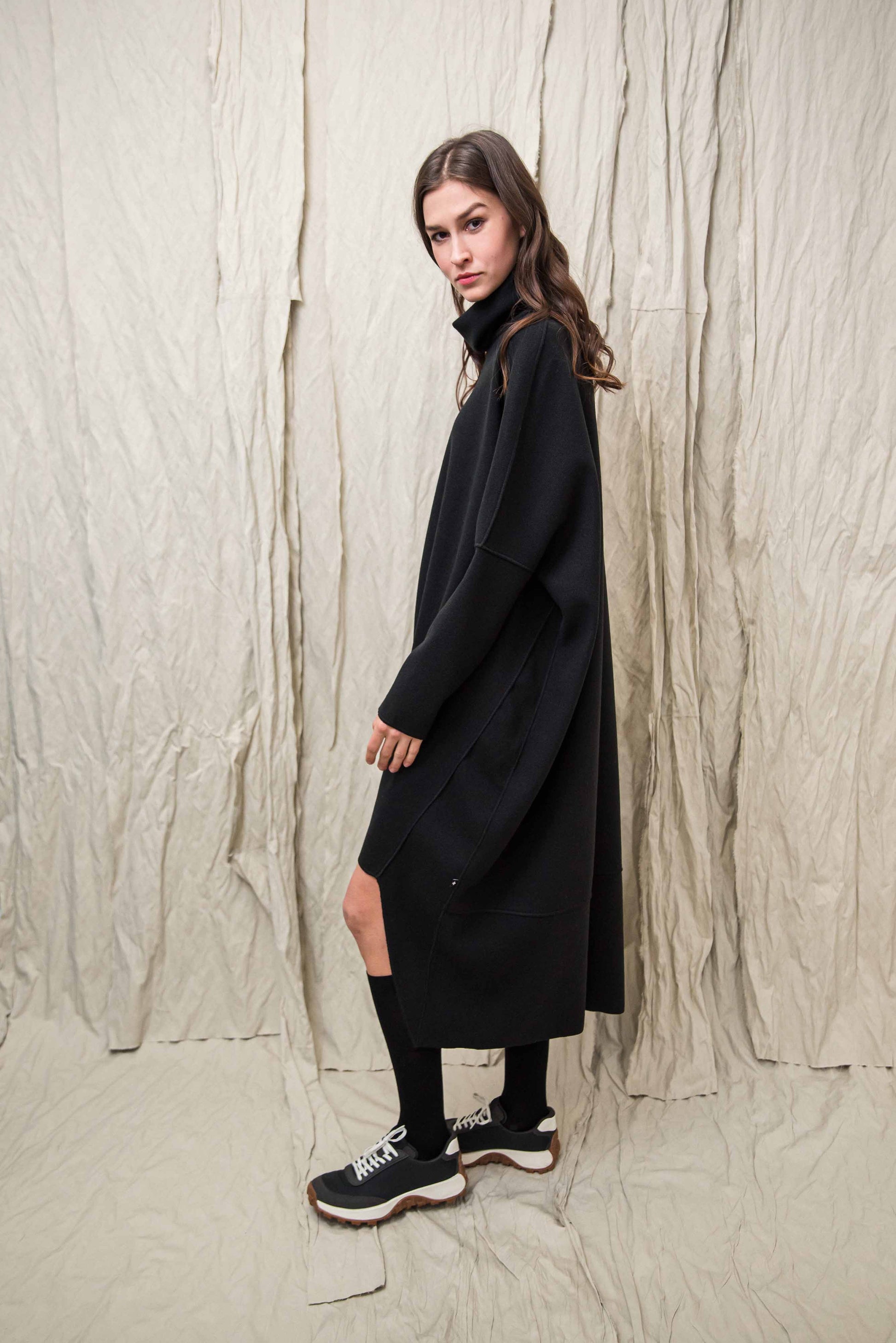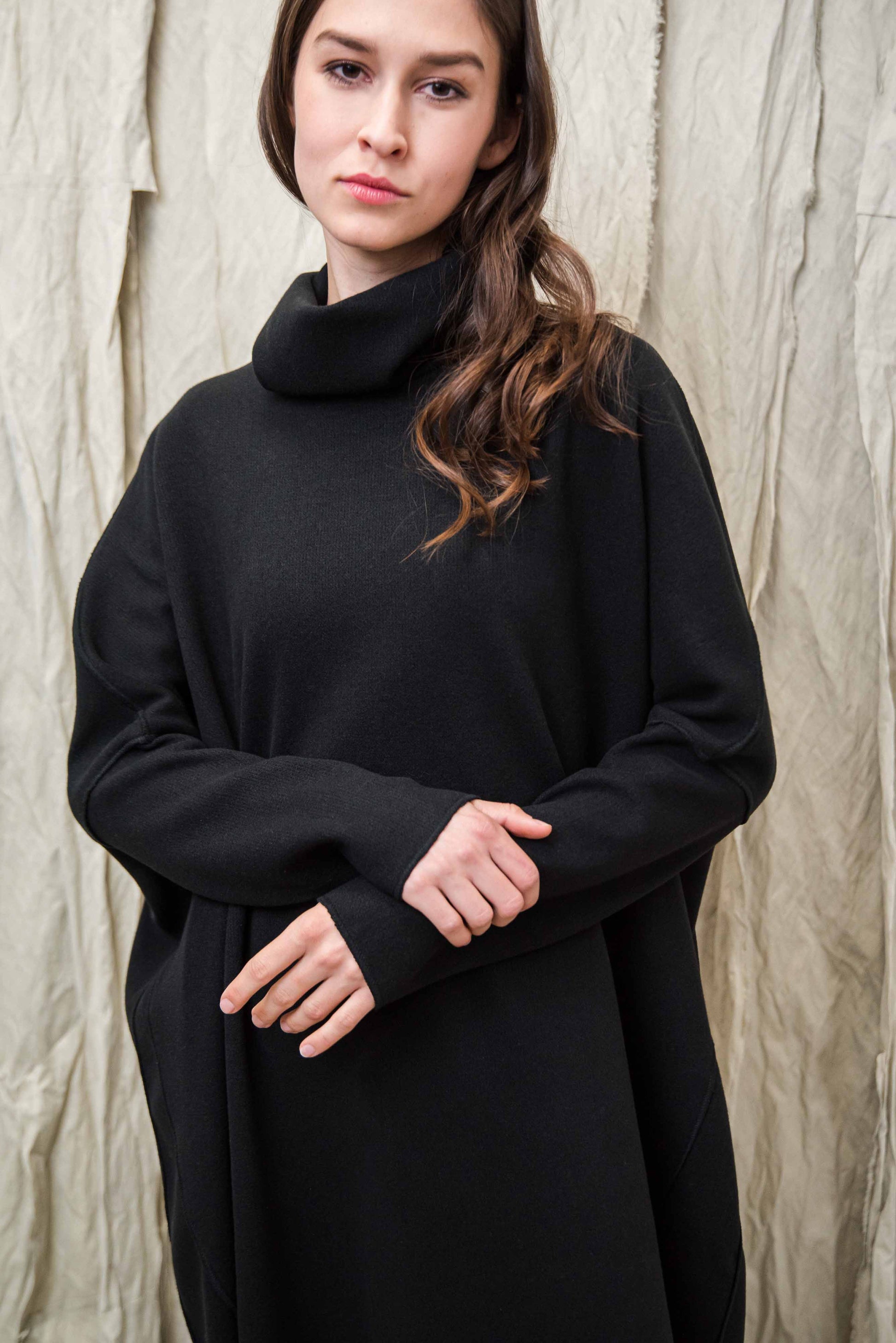 Made of soft, stretchy knit fabric, it provides pleasant warmth and freedom of movement on cooler days. The turtleneck and the asymmetrical cut, slightly longer at the back, give the piece a special character that playfully follows the body's lines. Comfortable yet stylish, it gives a clean, modern look on its own as a dress or combined with trousers - representing the conscious, relaxed aesthetic of NONPLUS.
