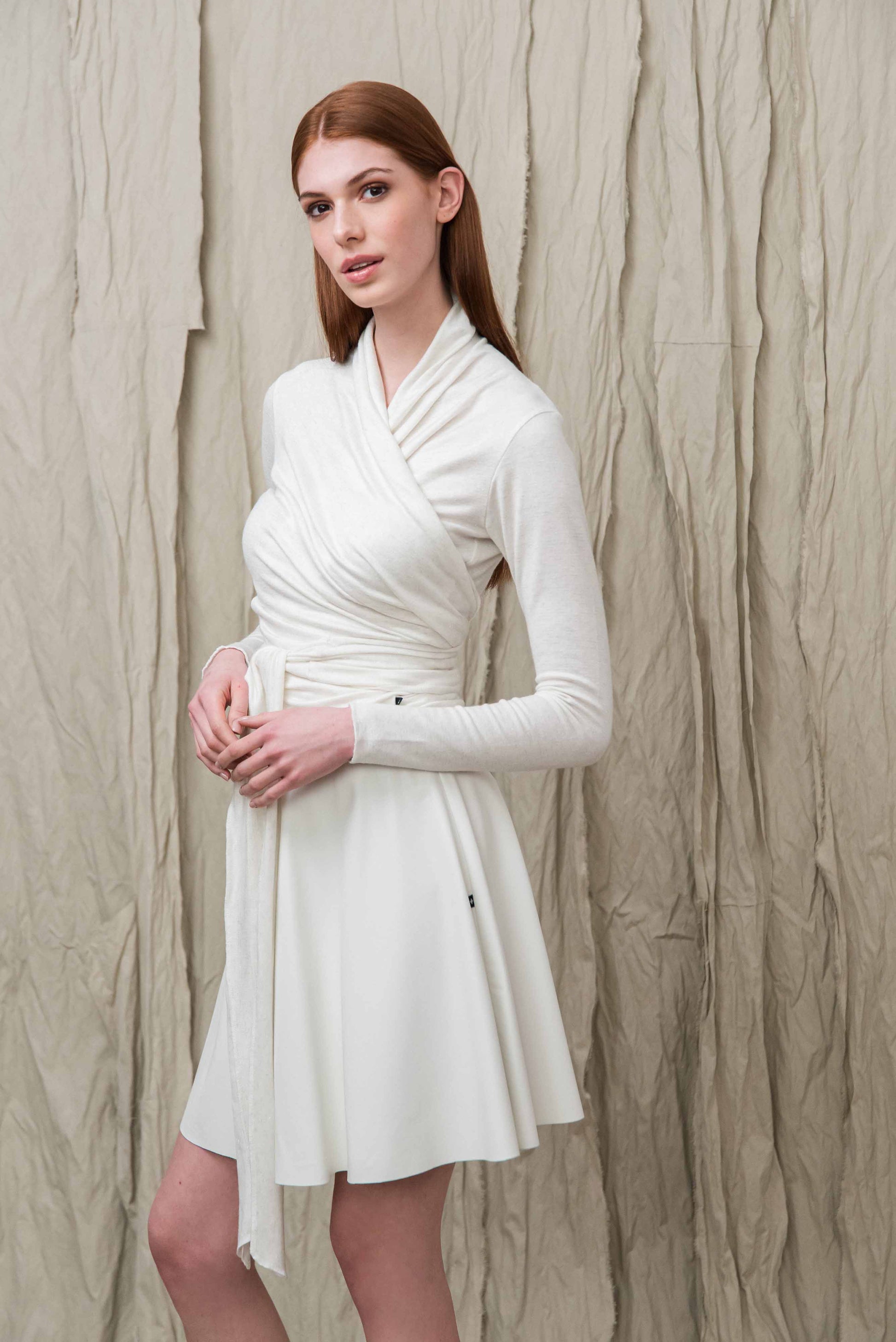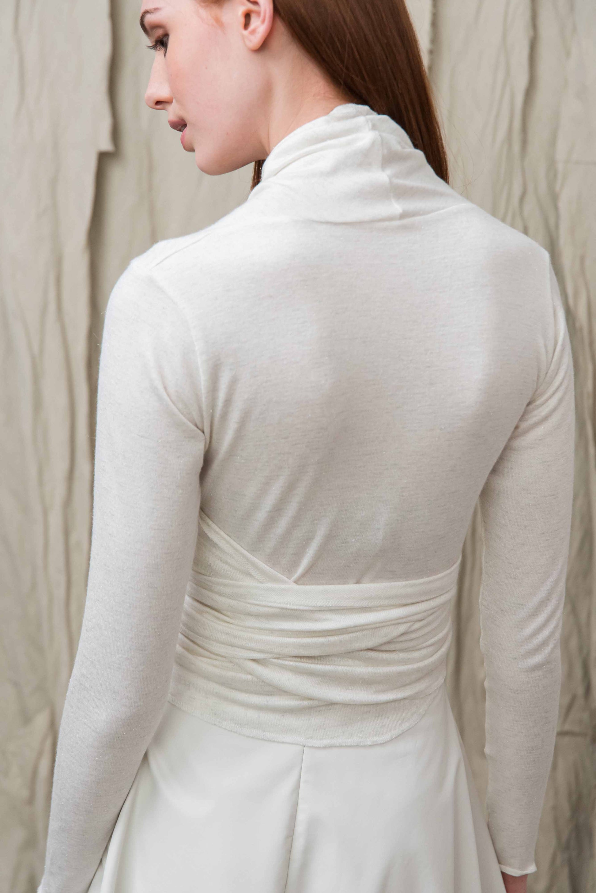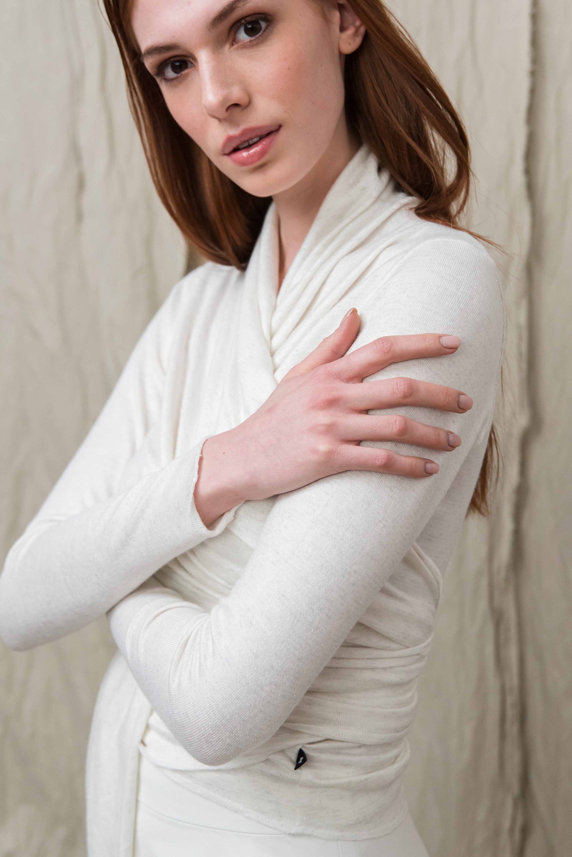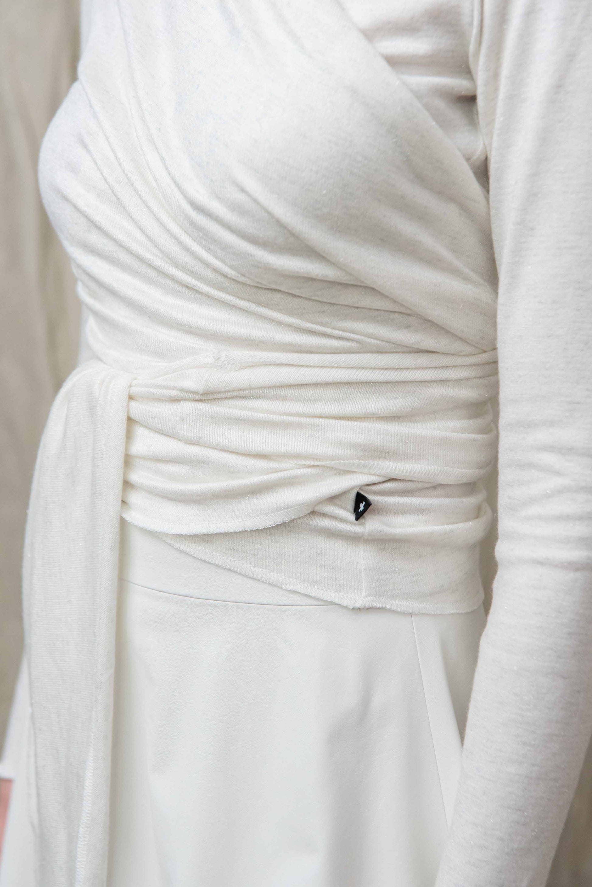 > The NOMI top is a feminine, long-sleeved piece made of soft knitted fabric that gently follows the lines of the body. The wrap-around style can be tied in the front or back – adjusting it to your mood and occasion. You can wear it with trousers, a skirt, or over a dress as an extra layer. It's a versatile and comfortable piece that allows for authentic self-expression in dressing.