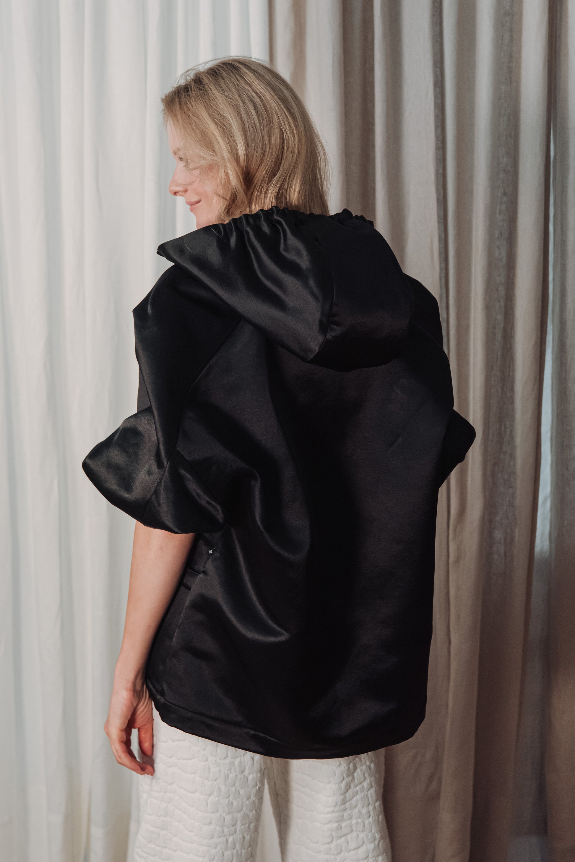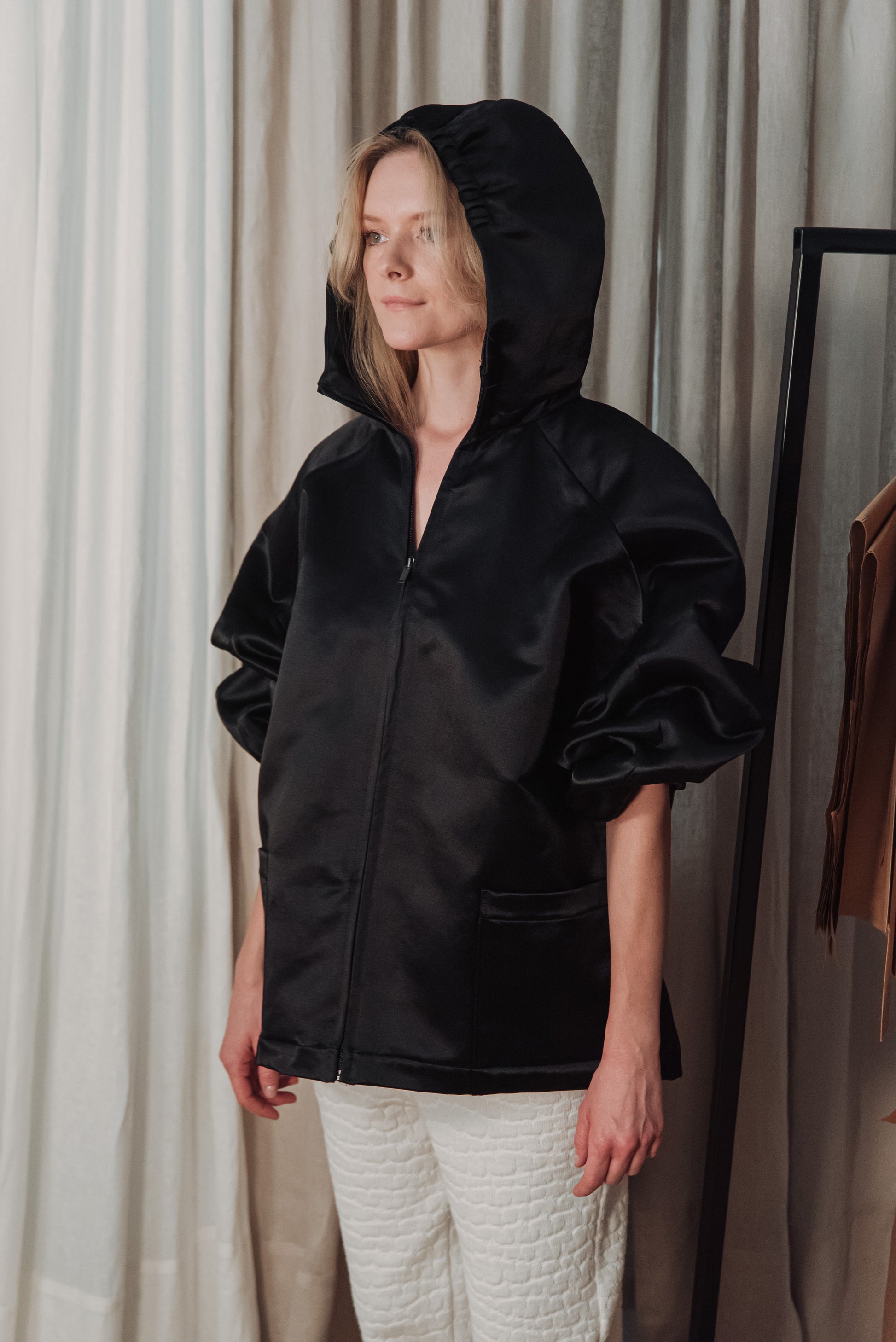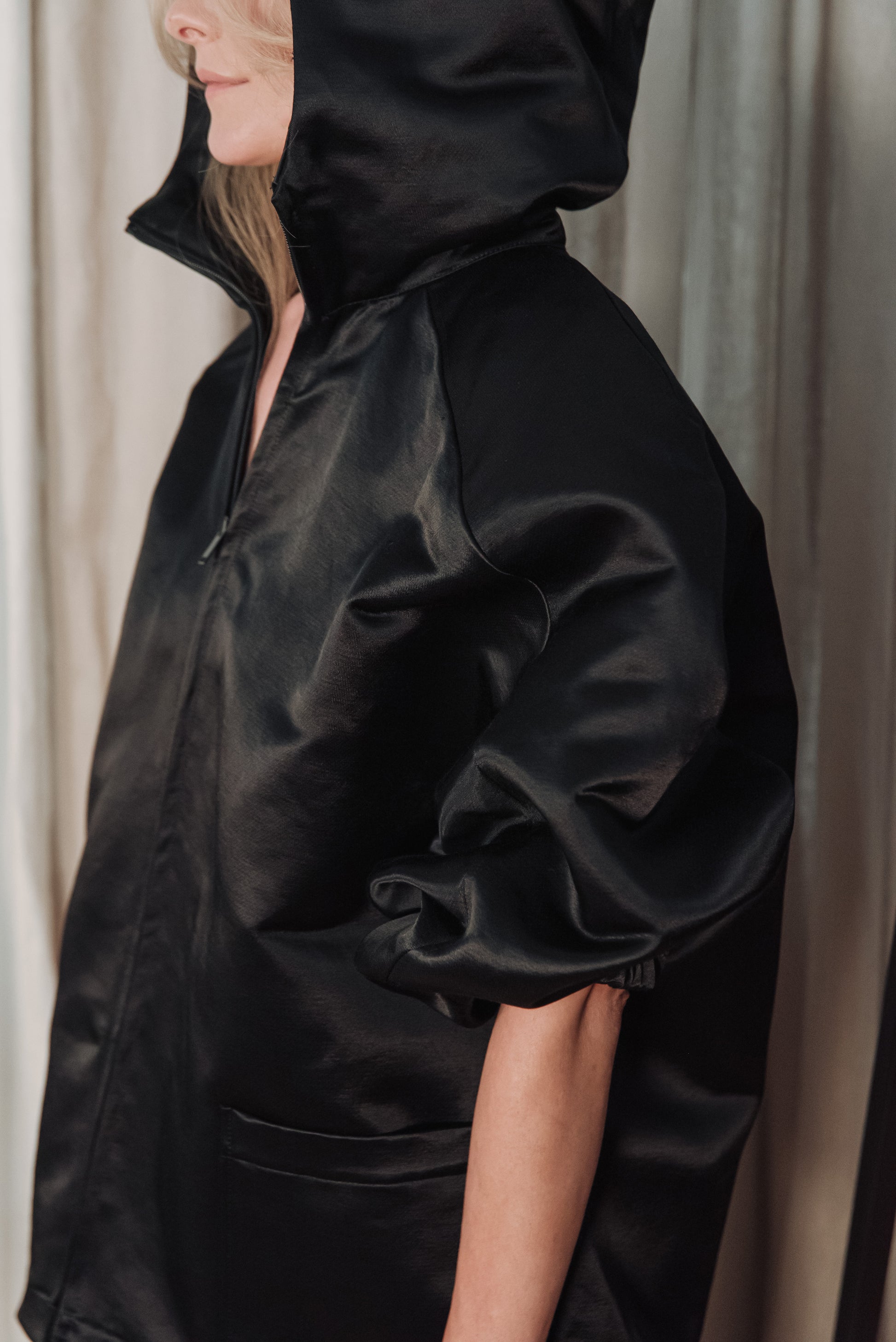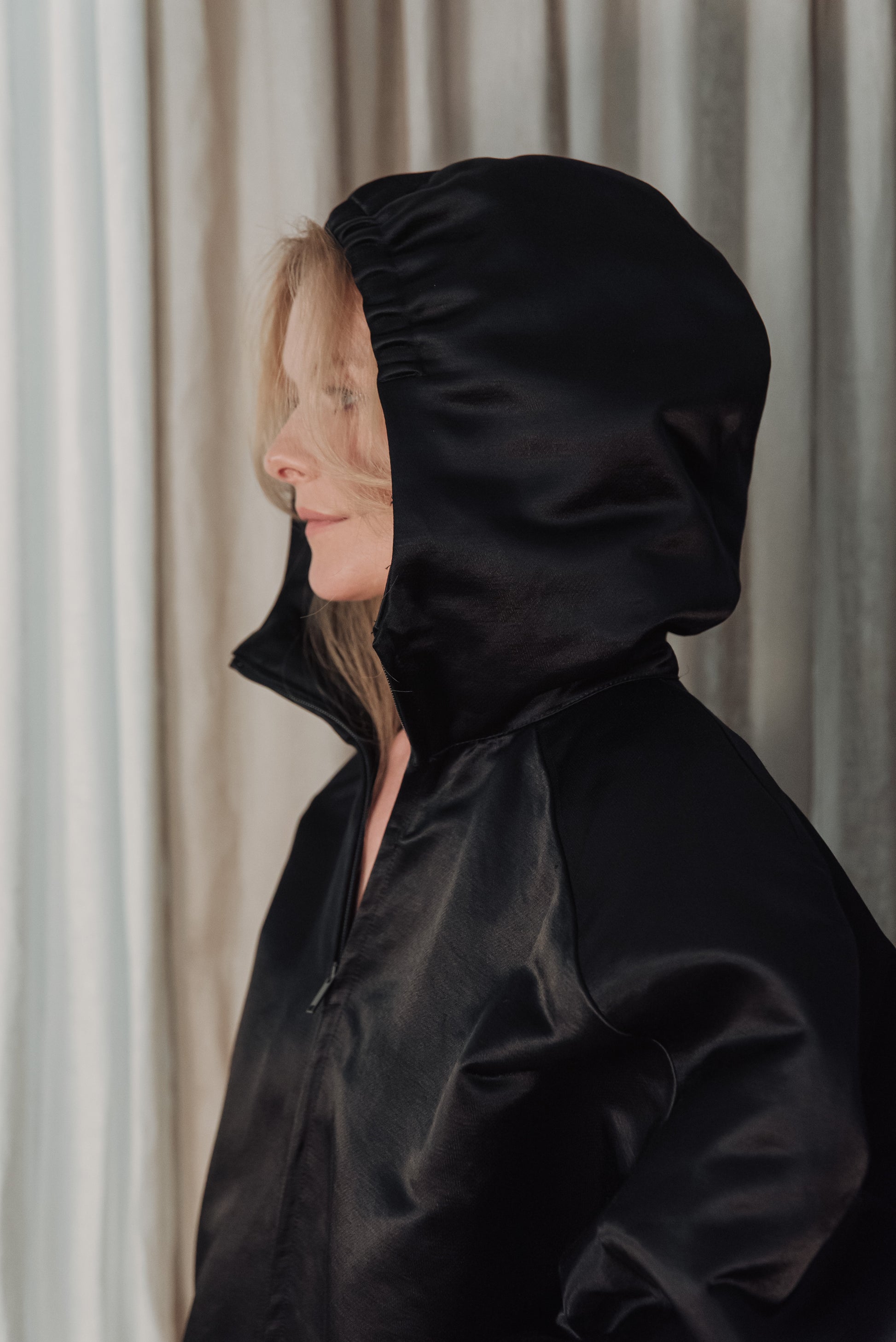 > The OGA jacket embodies the characteristic minimalism of NONPLUS: a clean, yet powerful piece that stands out with its distinct shapes and delicate details. The large, drawn-in hood and front zip give a modern, functional line, while maintaining the jacket's understated elegance. The material is medium-thick, densely woven and durable, yet pleasant - the natural, silky sheen of the cotton blended with cupro lends an elegant surface that highlights the structured lines of the piece. Its touch is smooth, noble, and its appearance is a combination of quality and timelessness. The OGA jacket is the essence of the NONPLUS aesthetic: clean, functional and confident - a staple that radiates strength and sophistication at the same time.