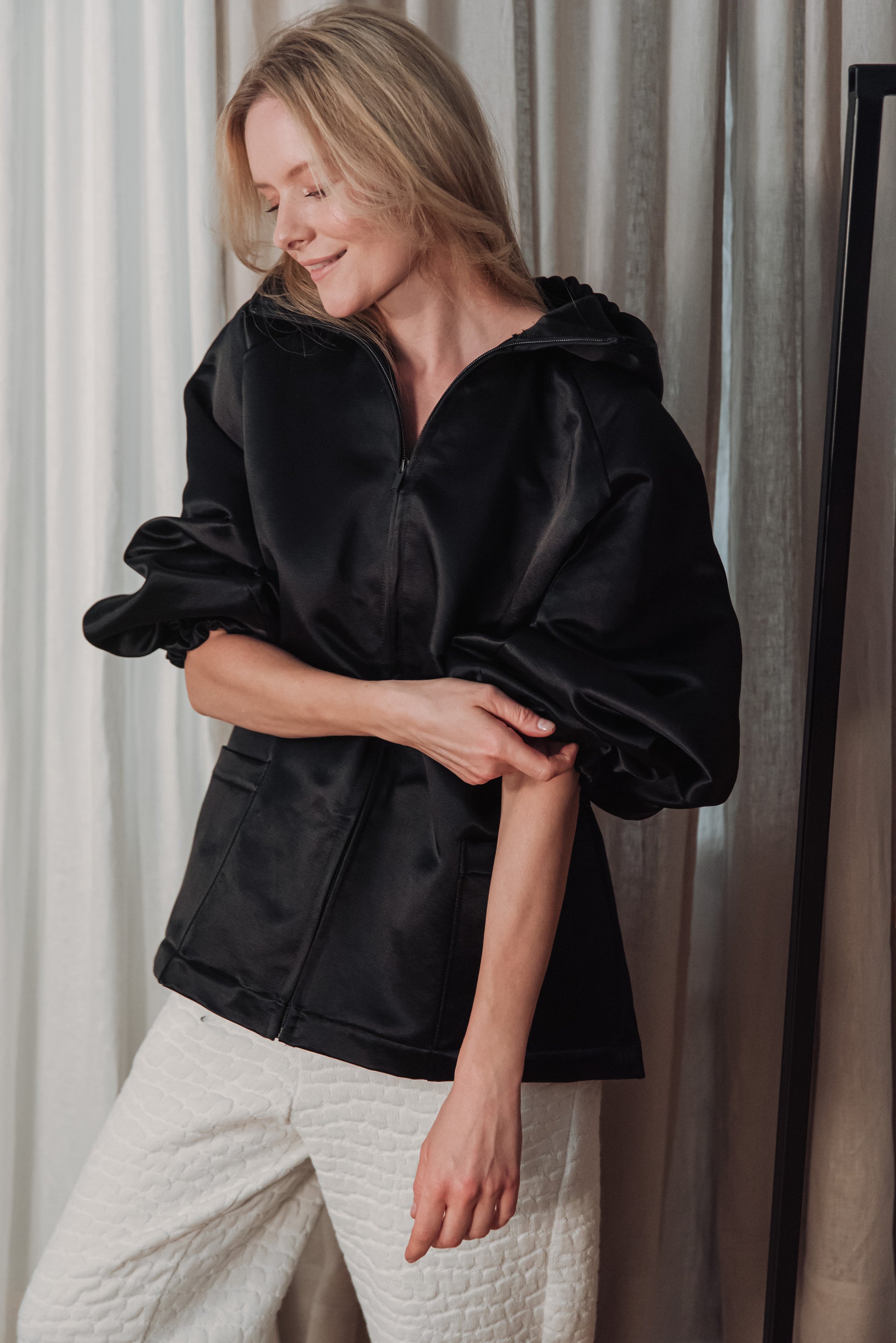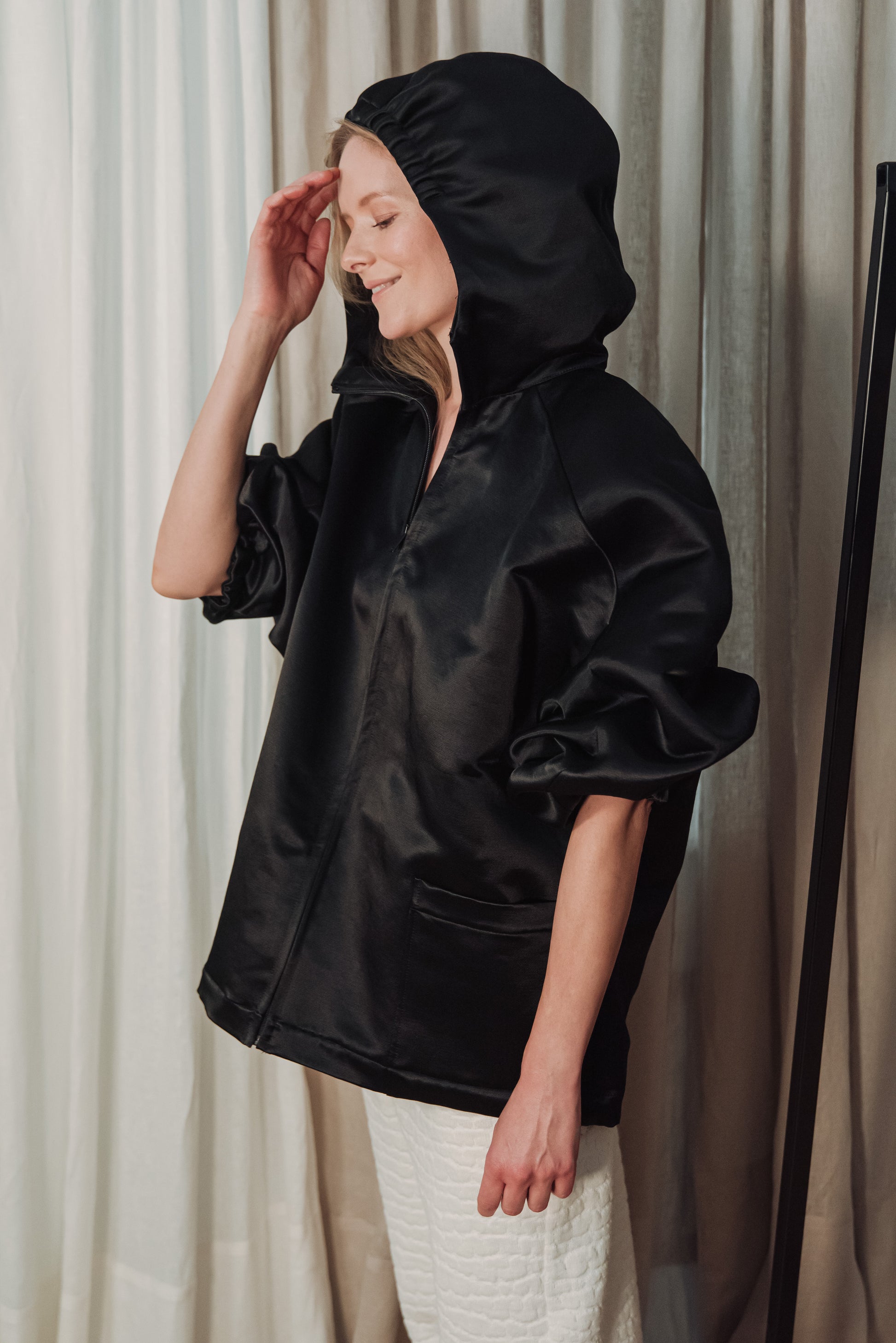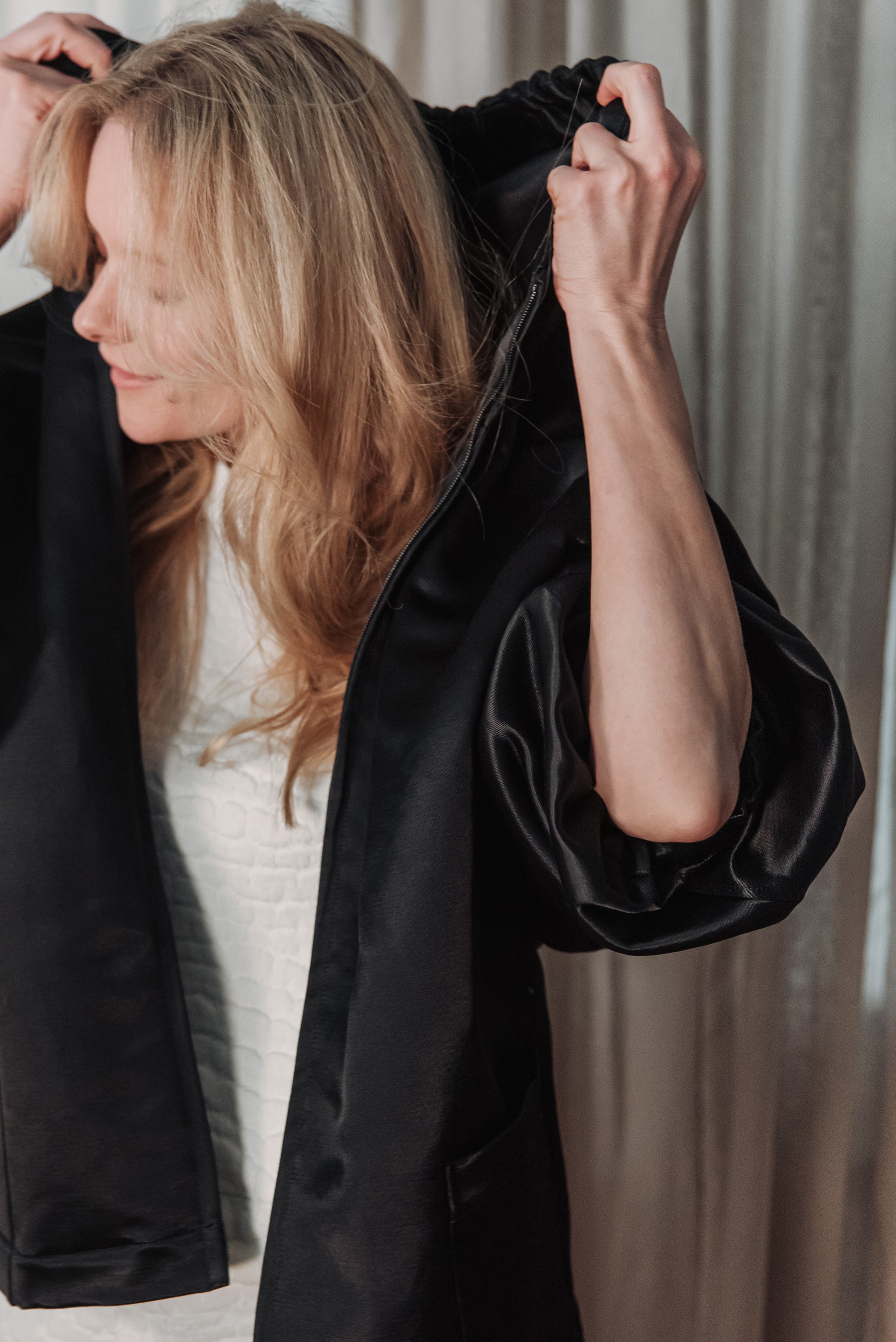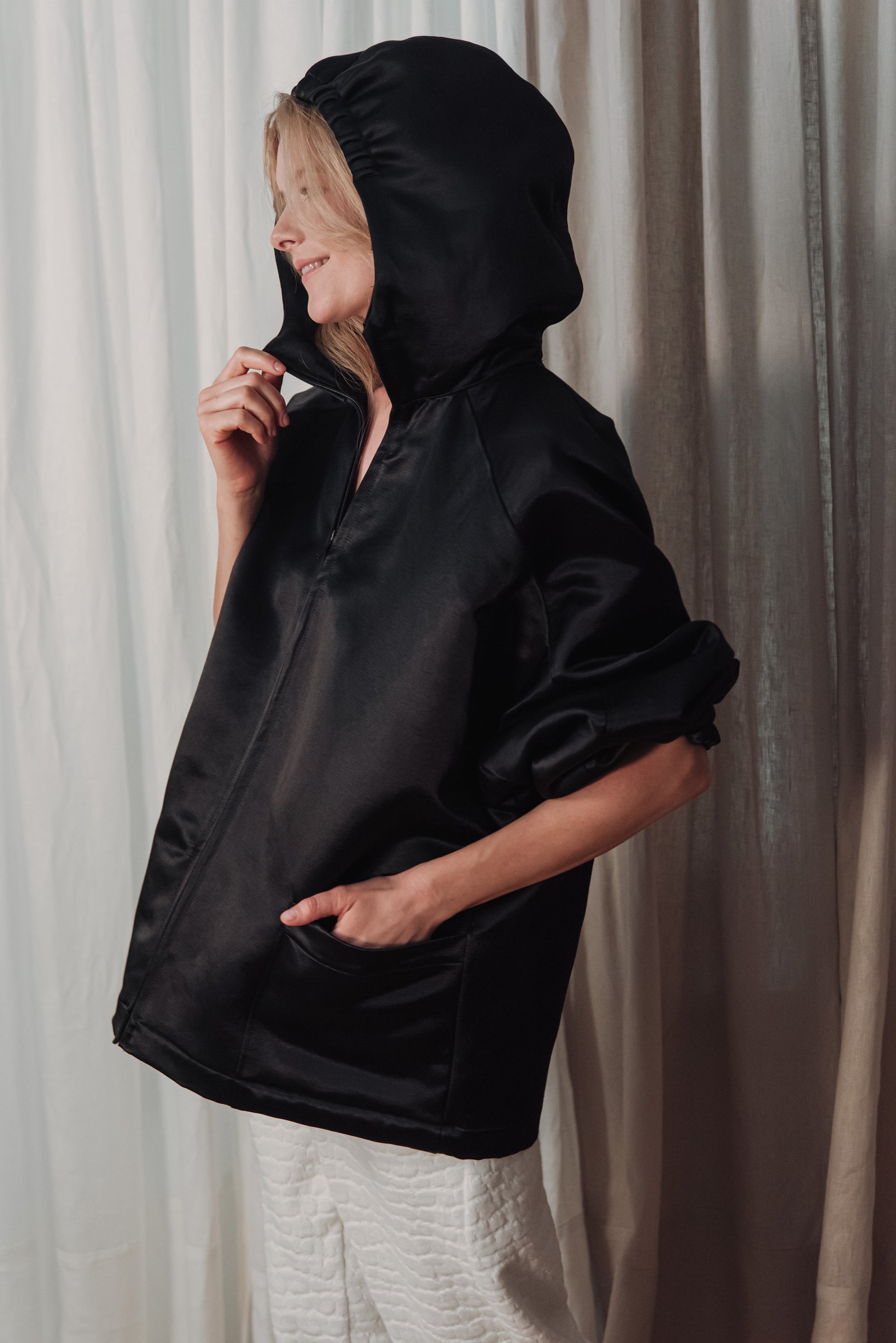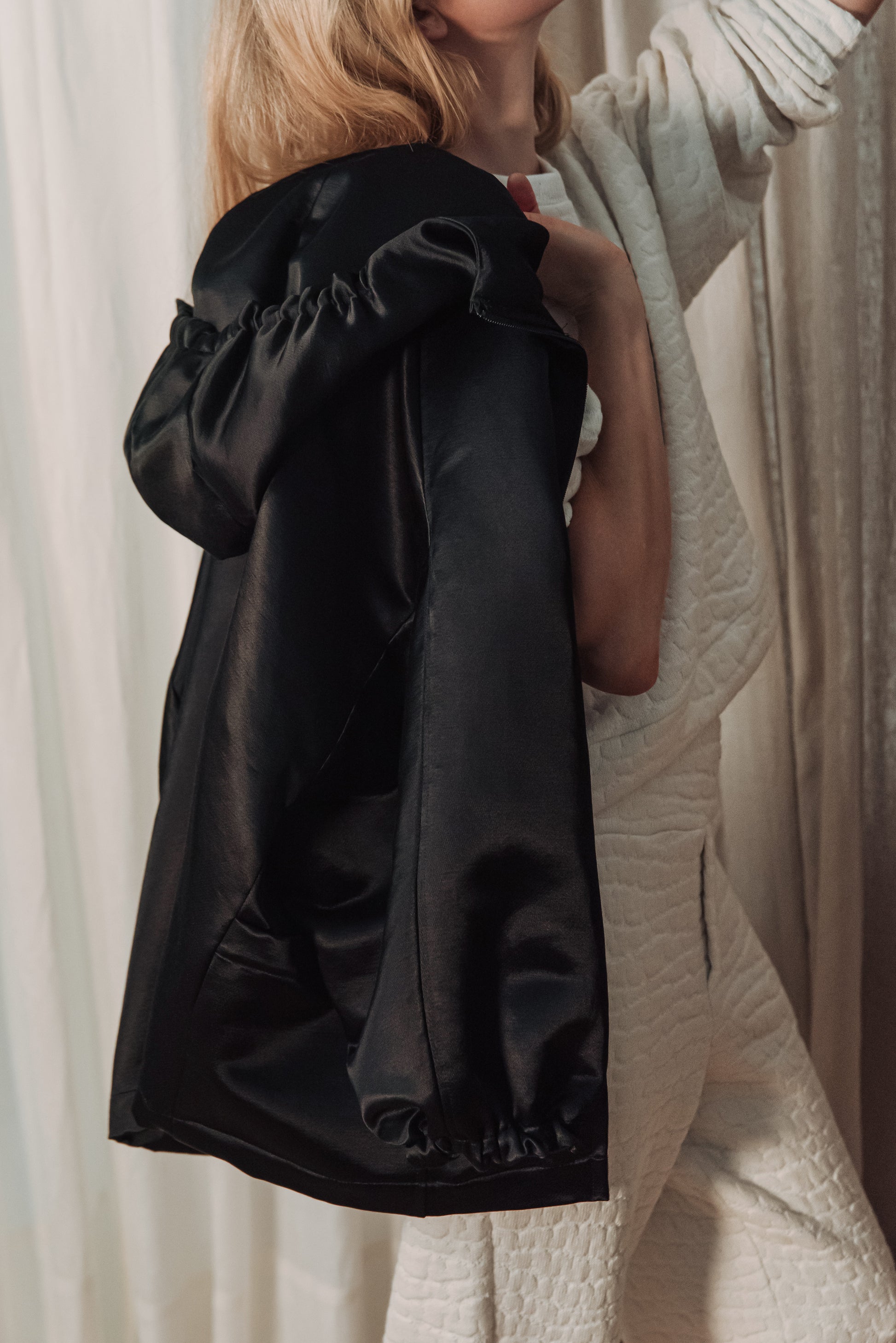 > The OGA jacket embodies the characteristic minimalism of NONPLUS: a clean, yet powerful piece that stands out with its distinct shapes and delicate details. The large, drawn-in hood and front zip give a modern, functional line, while maintaining the jacket's understated elegance. The material is medium-thick, densely woven and durable, yet pleasant - the natural, silky sheen of the cotton blended with cupro lends an elegant surface that highlights the structured lines of the piece. Its touch is smooth, noble, and its appearance is a combination of quality and timelessness. The OGA jacket is the essence of the NONPLUS aesthetic: clean, functional and confident - a staple that radiates strength and sophistication at the same time.