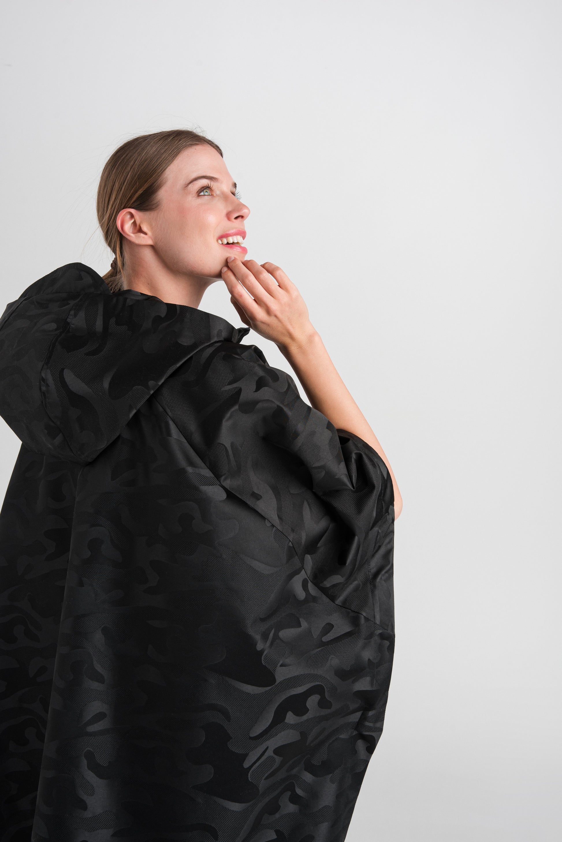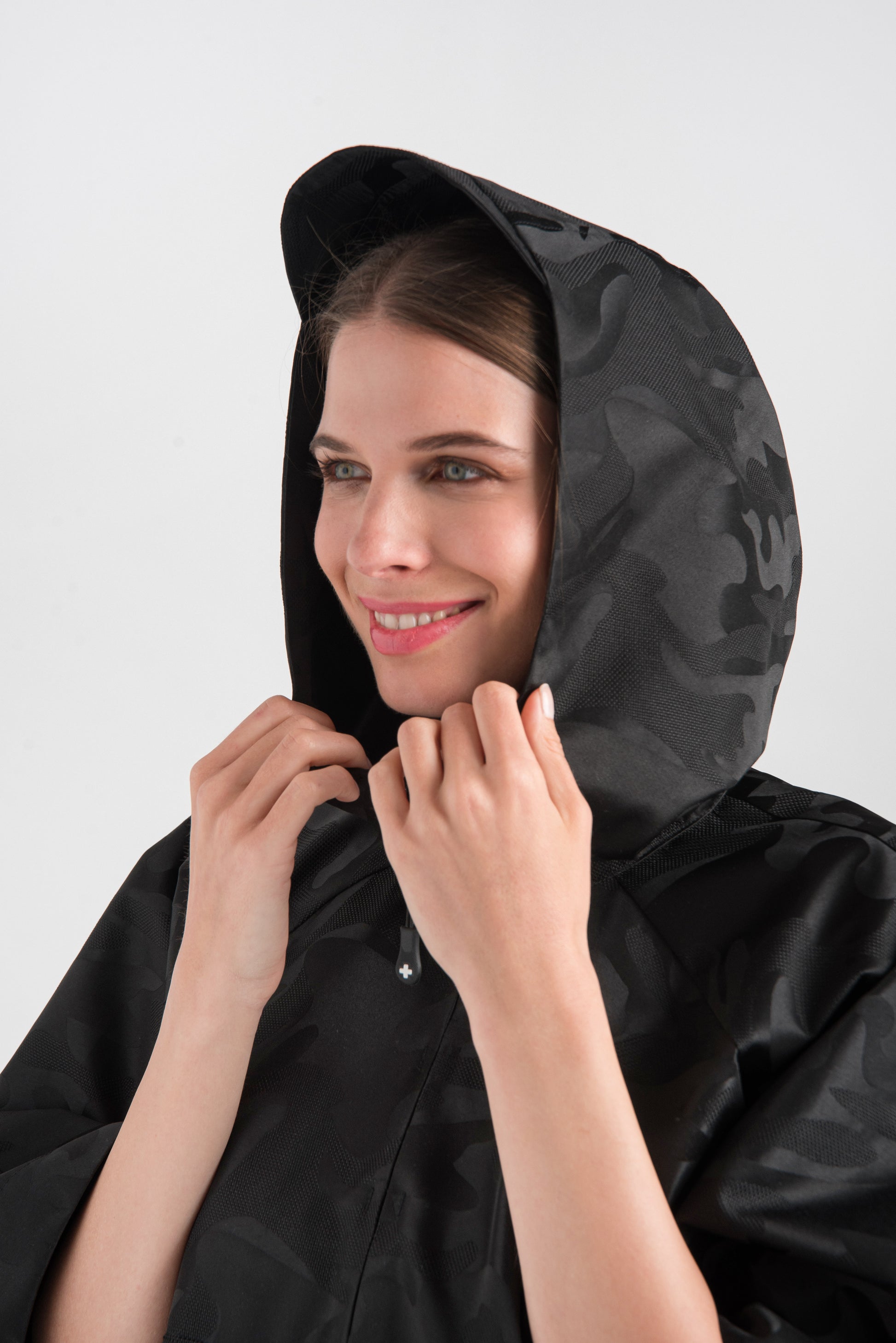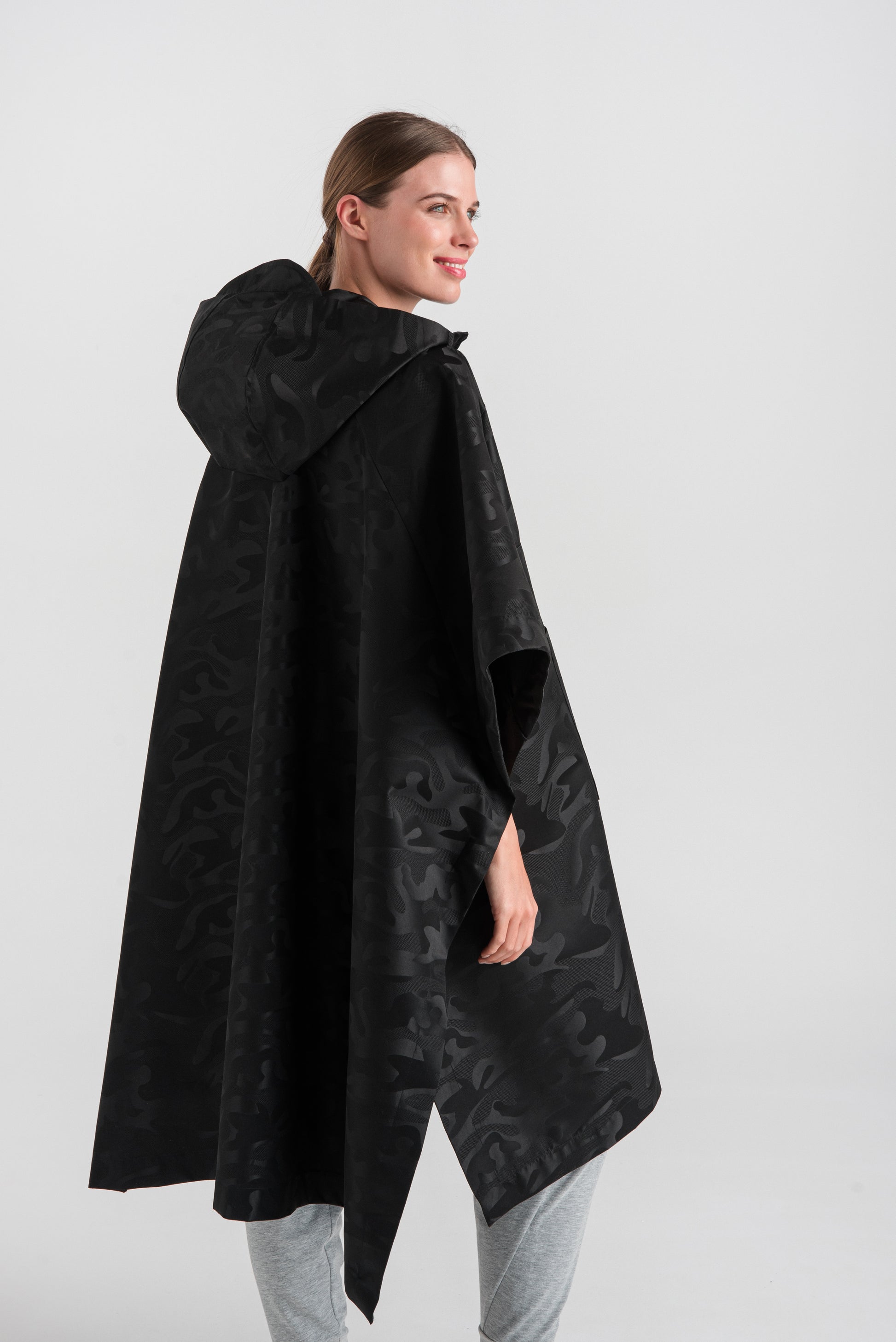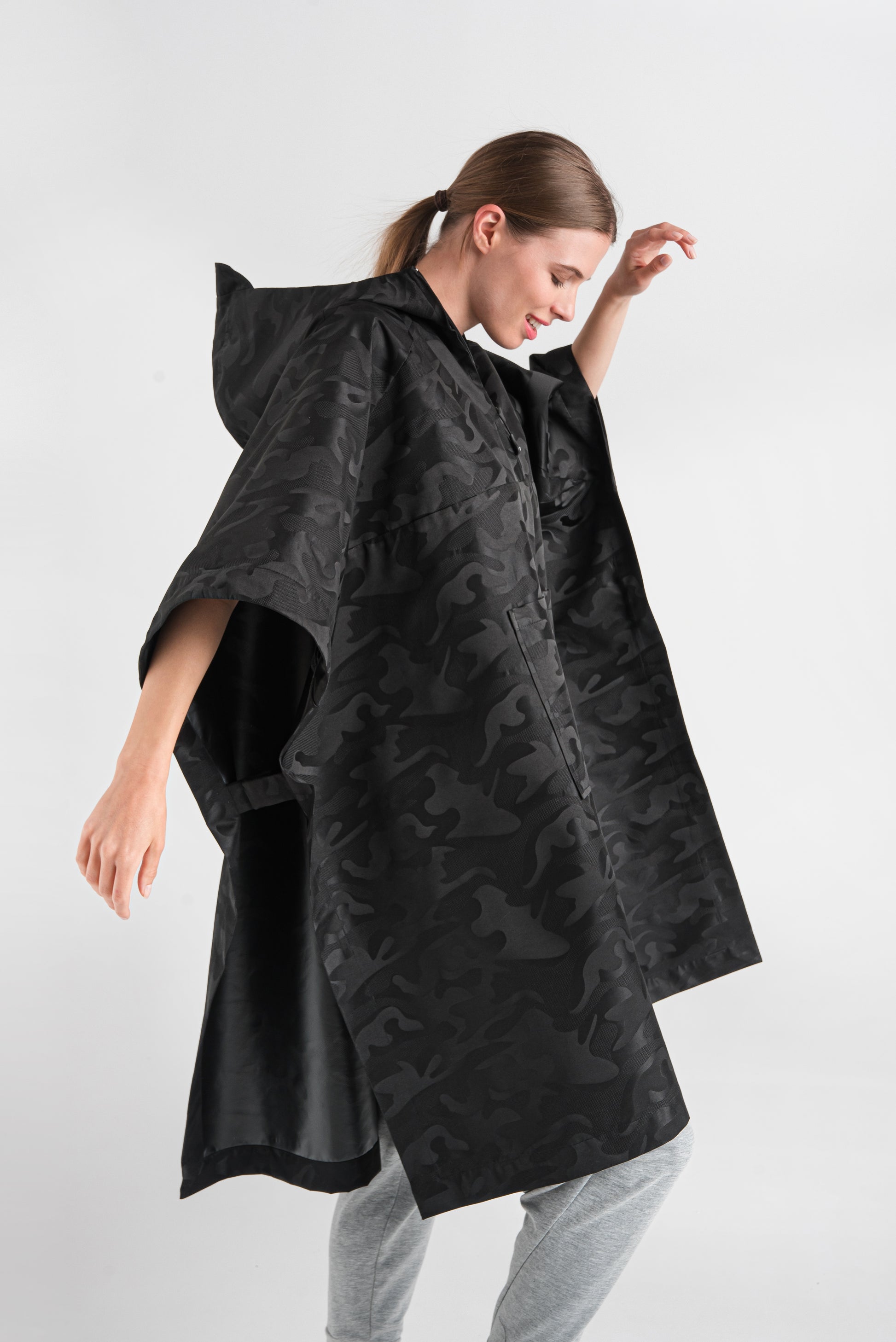 > Our loose-fitting, long OITA poncho made of water-repellent material is a very spectacular, extra style. It is made with a short zipper and velcro under the sleeves on both sides, and its large, brimmed hood is super cool. The exciting pattern of our black jacquard raincoat material gives this style a special effect.