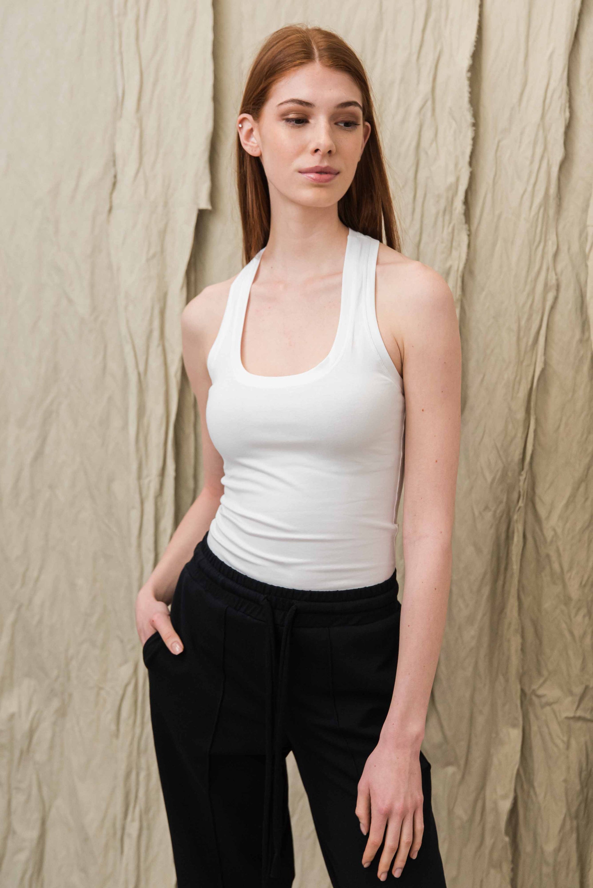 > The ONS tank top is one of the most timeless pieces in the nonplus BASIC collection – we have been making it in the same shape for 16 years because it simply goes with everything. It is a body-hugging, tight-fitting cut with a classic sporty back cut that works well with a sports back bra. Its soft, stretchy cotton material ensures all-day comfort, is durable, yet lightweight. It can be layered, but also stands on its own – a true staple that you will reach for again and again. It is clean, practical and stylish – exactly what you need from a good tank top.