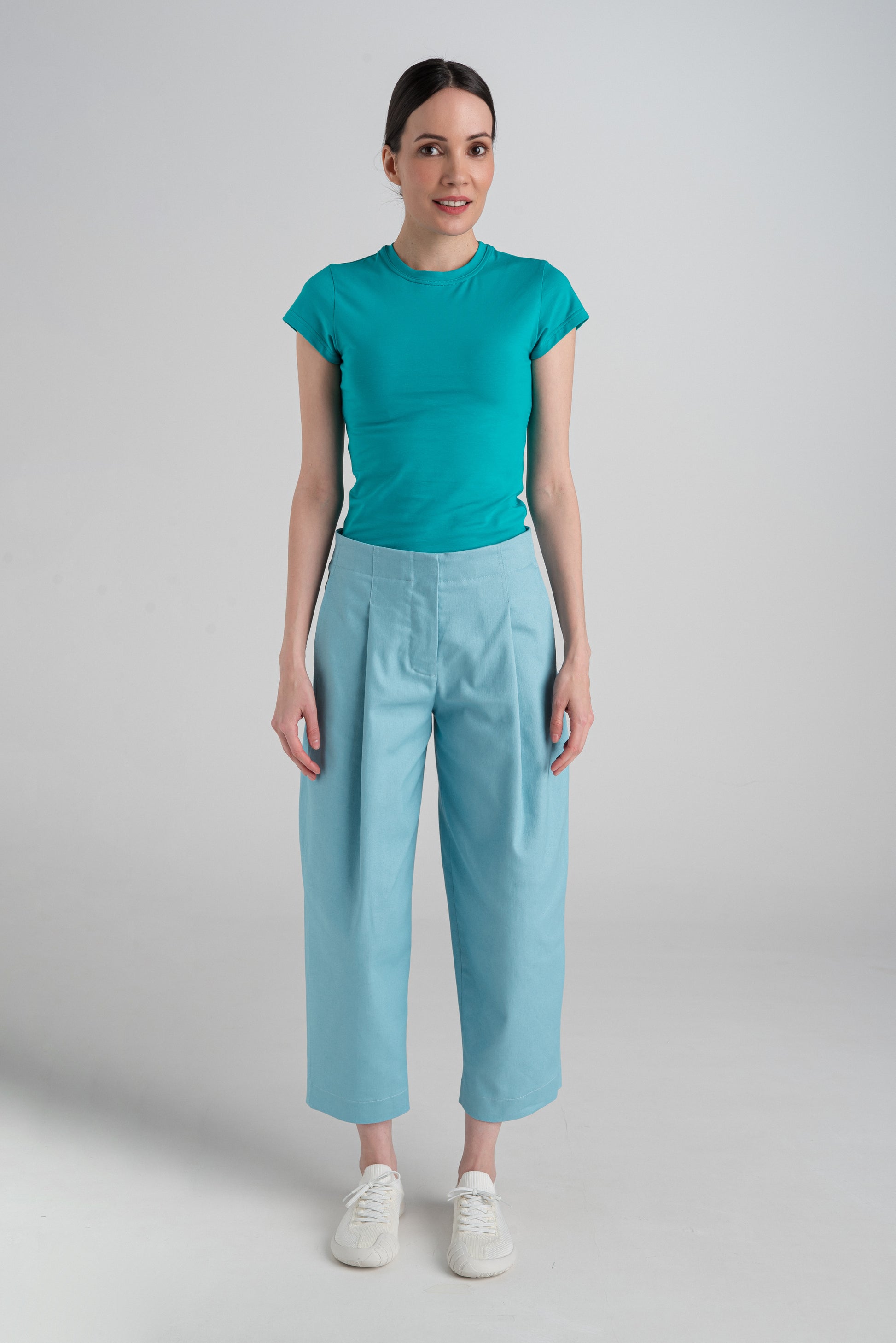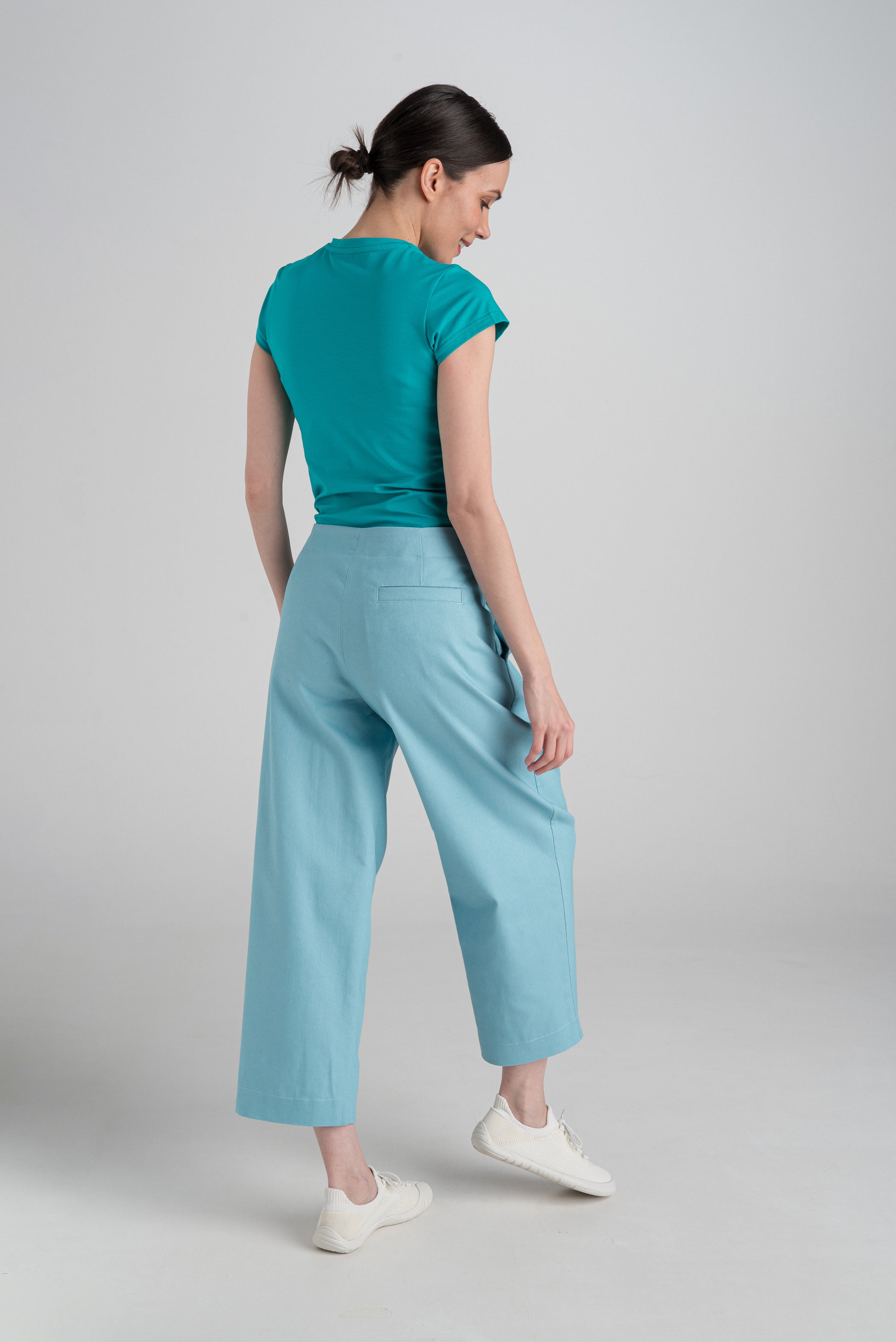 > Our SEBA pants are a loose, 3/4 length, loose fit with a zip and snap closure. Thanks to their cut, they widen and then taper slightly downwards, making them the most comfortable to wear on a busy day.