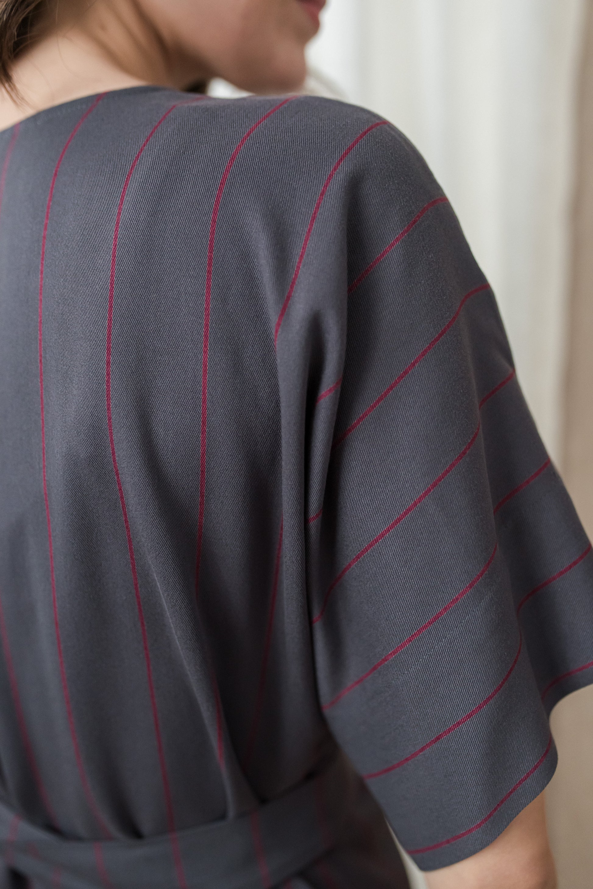 > The SEPA wrap top is a unique piece, yet also ideal for everyday wear. The crossed cut line subtly shapes the silhouette, and the waist is accentuated by a belt that can be adjusted to fit the wearer. Its short, wide sleeves and straight lines create a modern, comfortable and elegant overall effect. The turquoise striped material on a brown base gives a playful dynamism that is both restrained and characterful.