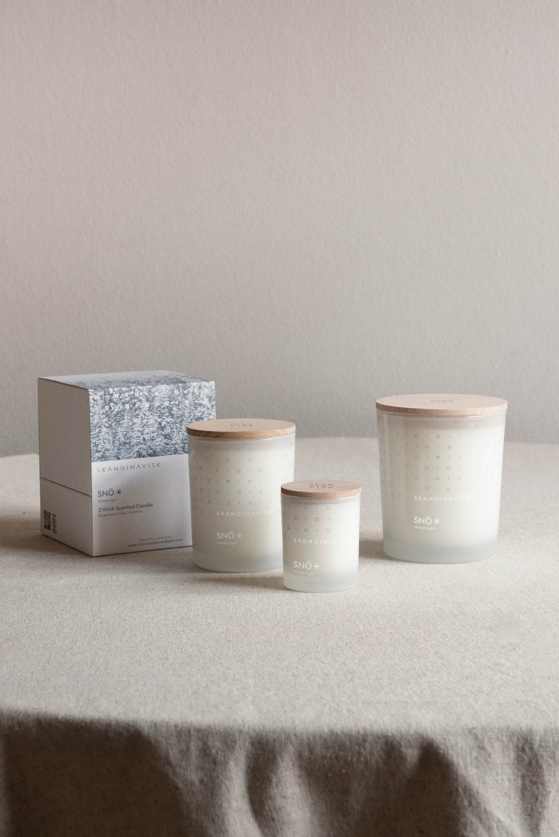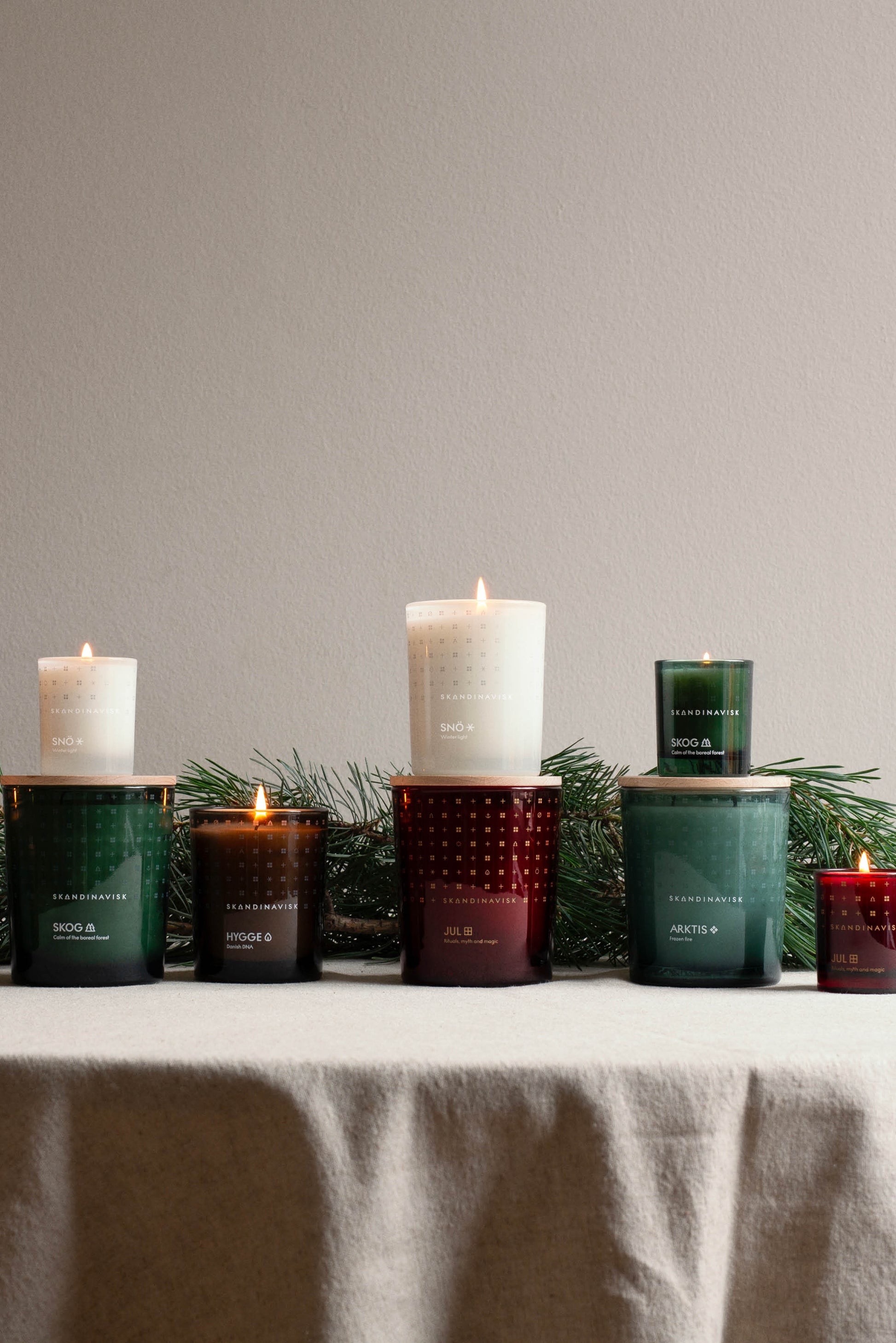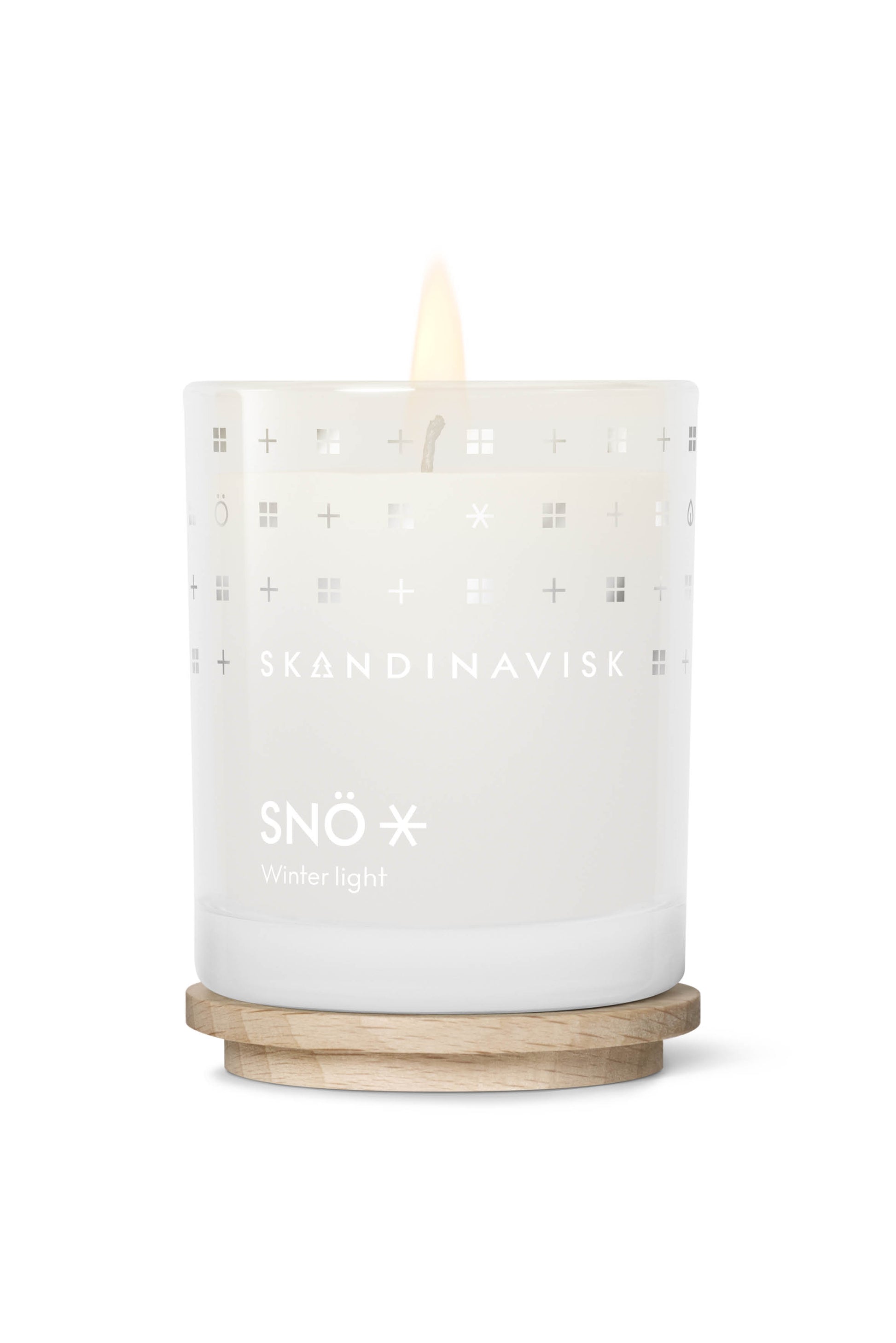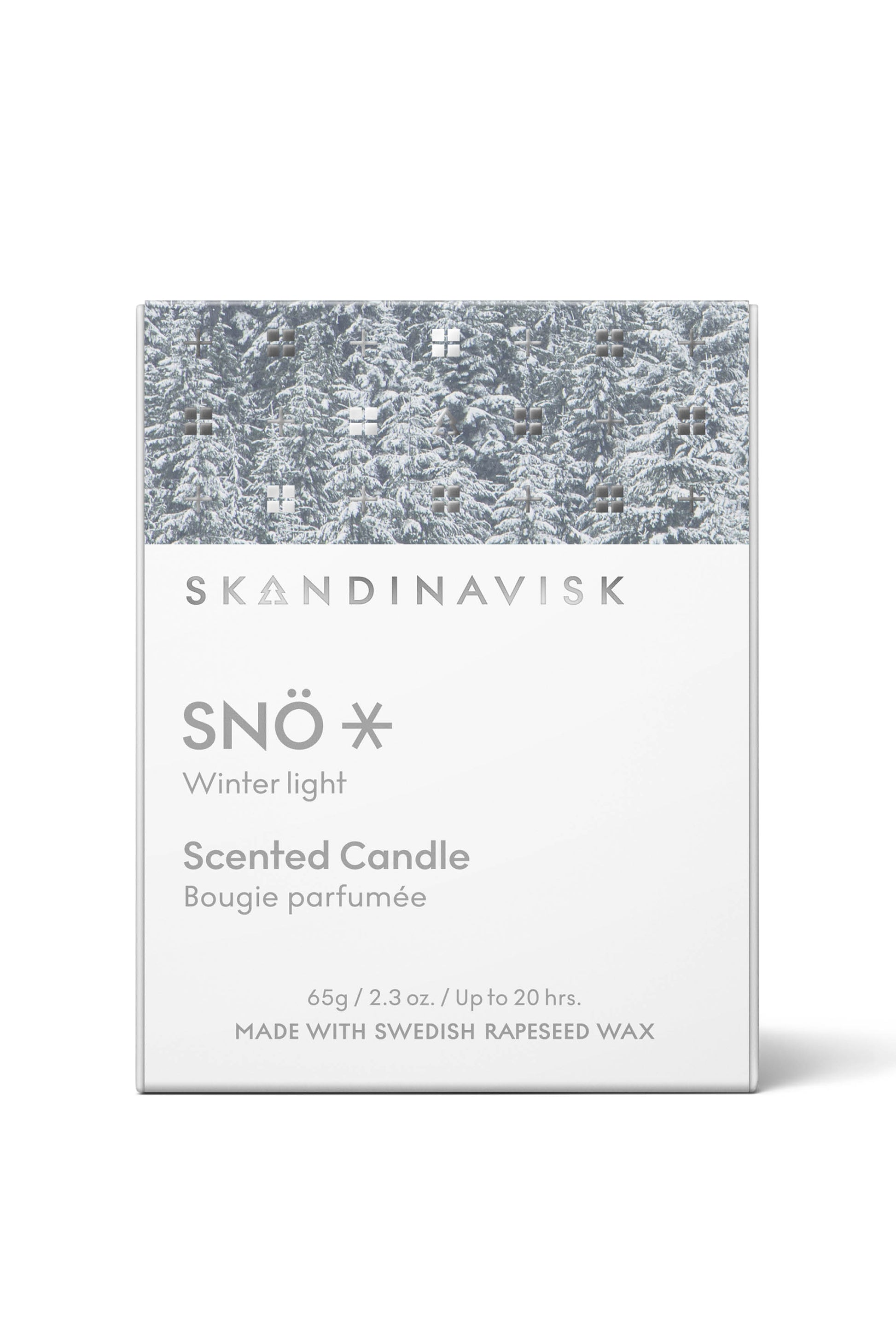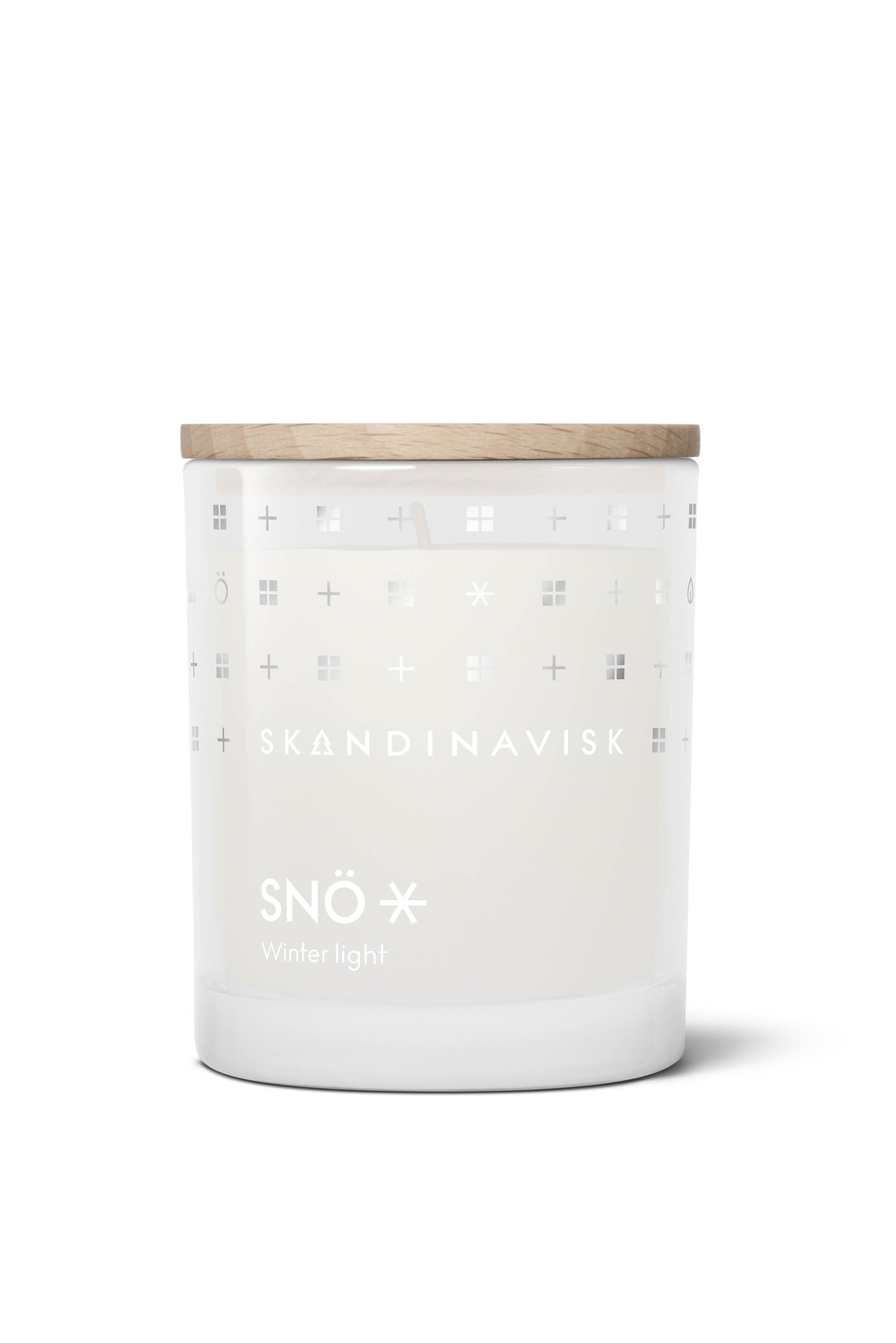 > Special edition SNÖ scented candle with seasonal design and box. The wax is made from sustainably grown and GMO-free Swedish rapeseed oil, non-GMO, and is blended to burn steadily and slowly with the least possible impact on the environment. Vegan and Cruelty-free mixture . Cast in a painted glass candle holder , pure cotton wick cal and engraved With FSC-certified beech wood lid. The packaging card and packaging sourced from sustainably managed northern forests, made with natural dyes . 65g, with a burn time of up to 20 hours. The glass can be reused as a tealight or candle holder, or for any storage purpose.