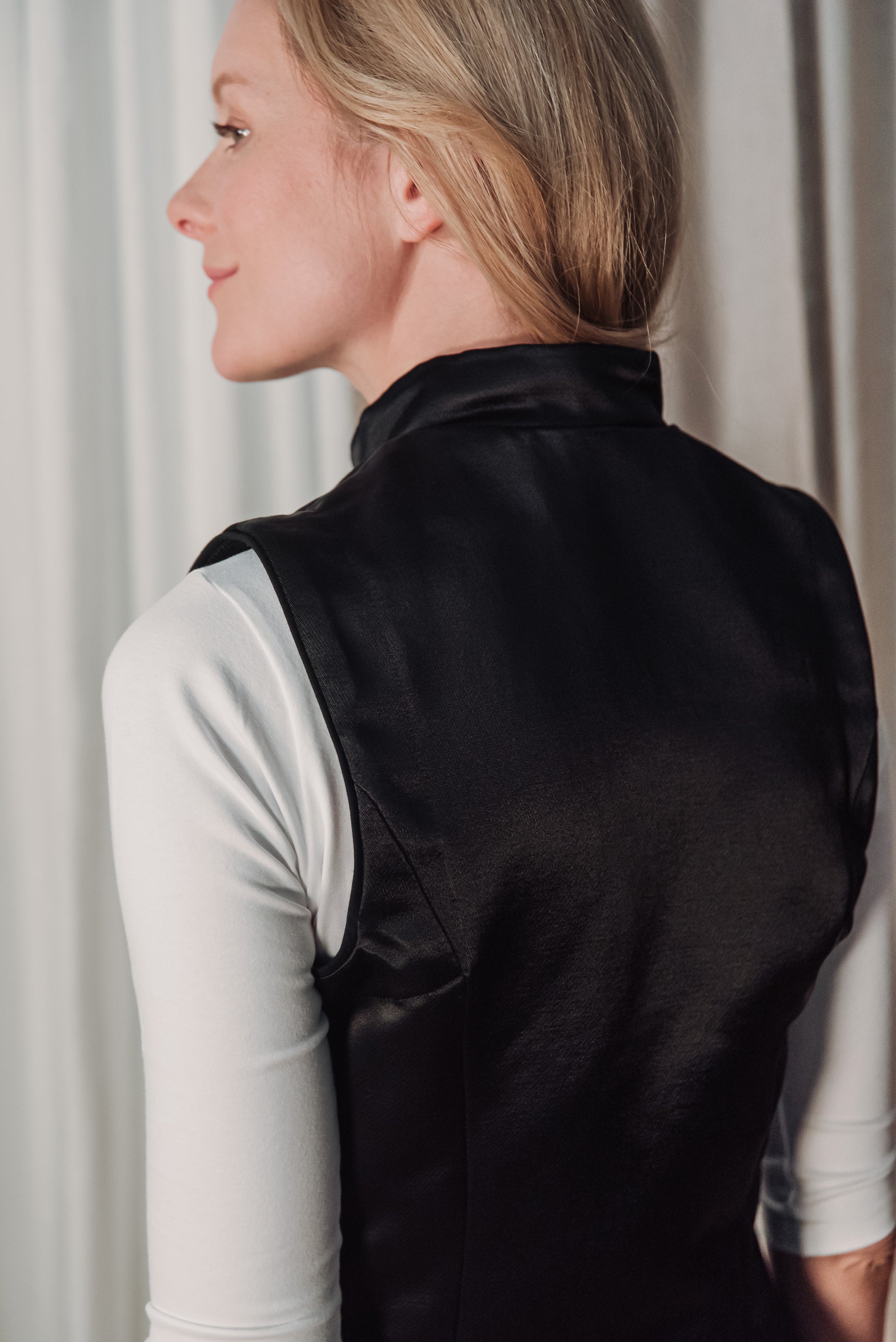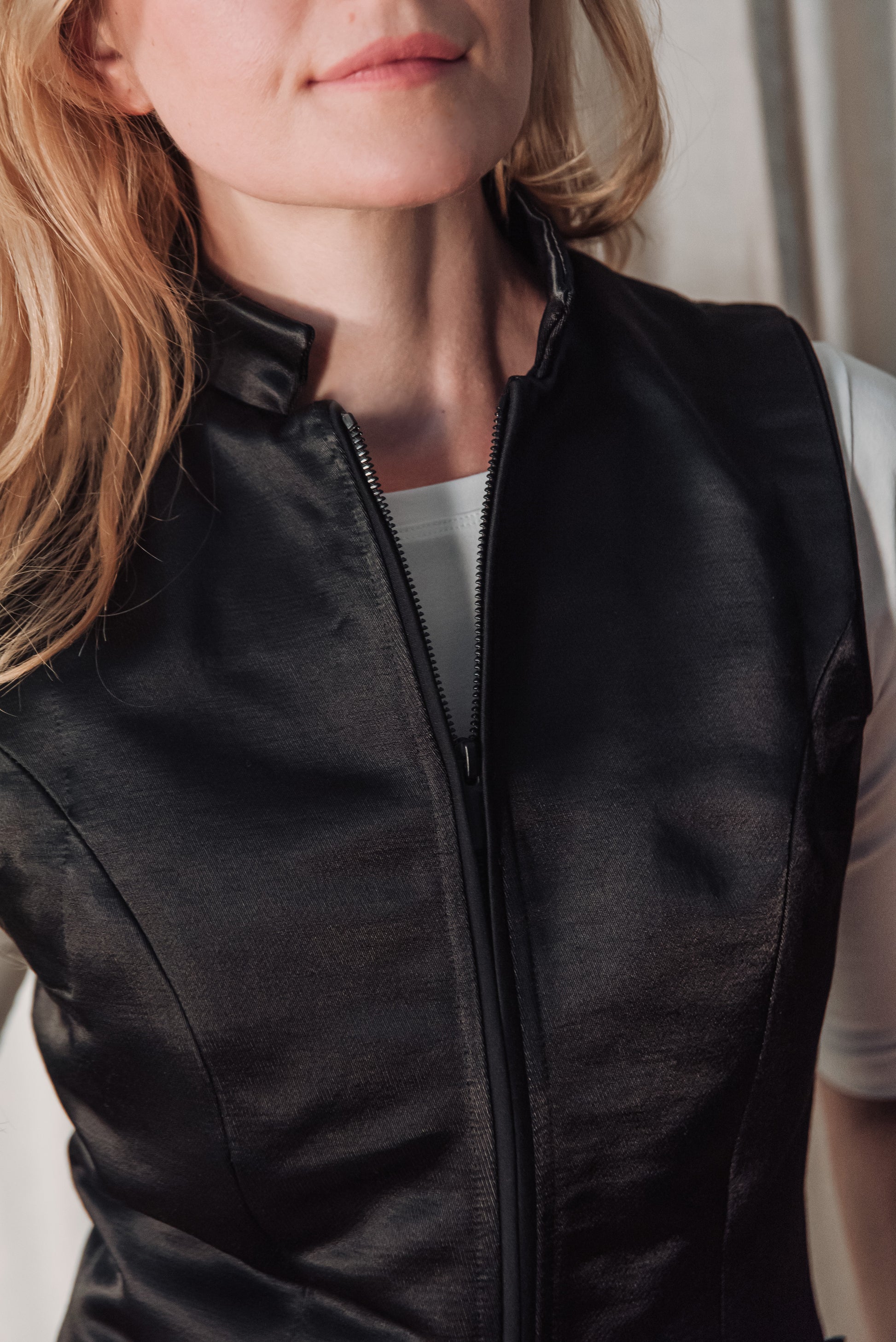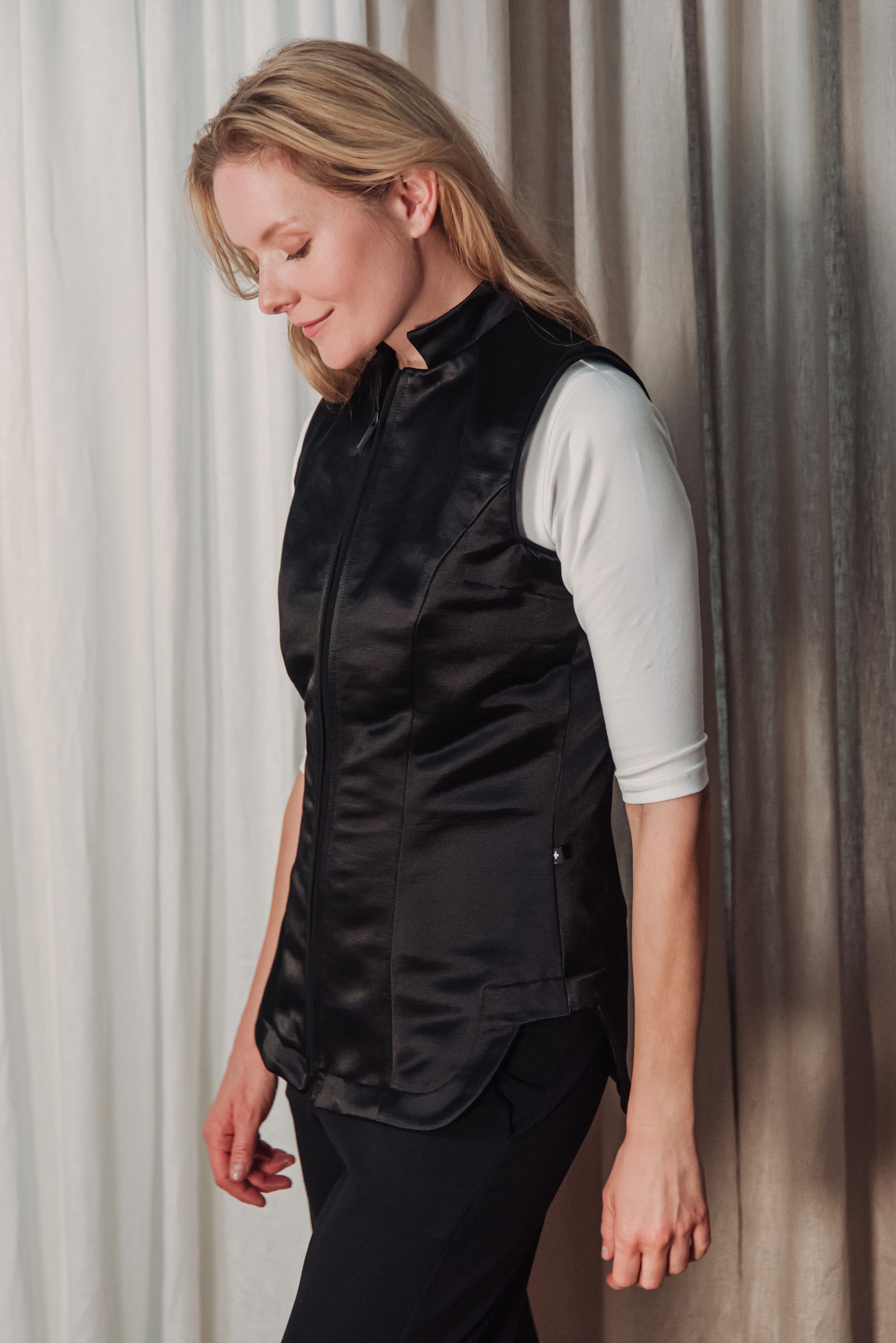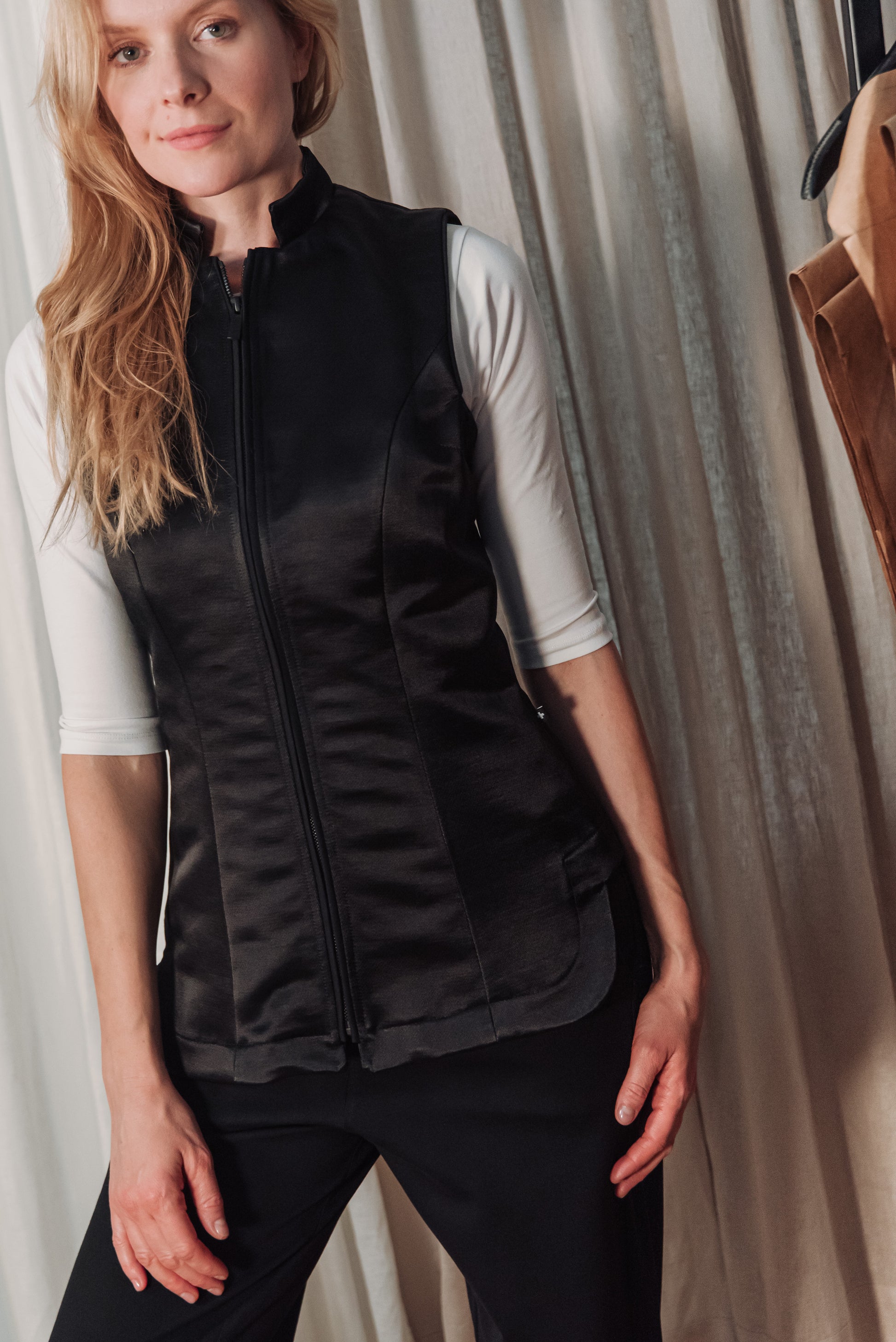 > The CALE vest is a combination of clean lines and sophisticated details. Its slim cut gently follows the body, while the shiny material gives the look an elegant character. The full-length zipper at the front is a modern, functional solution that makes the piece both practical and timeless. Reflecting the NONPLUS design approach, the vest takes comfort to a new level: precisely tailored, yet comfortable, making it the perfect choice for everyday wear or layering. A piece that completes your wardrobe with subtle strength and understated elegance.