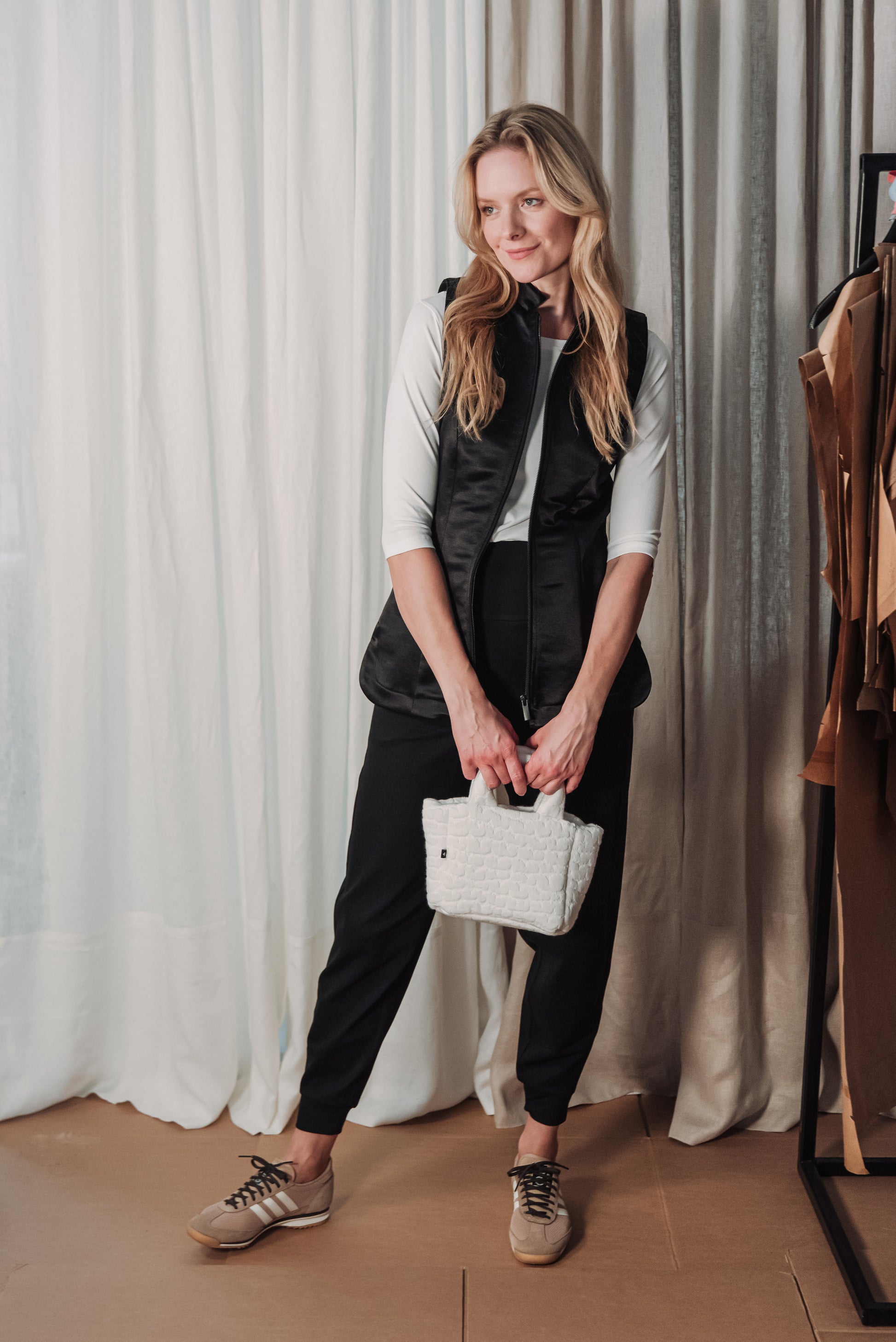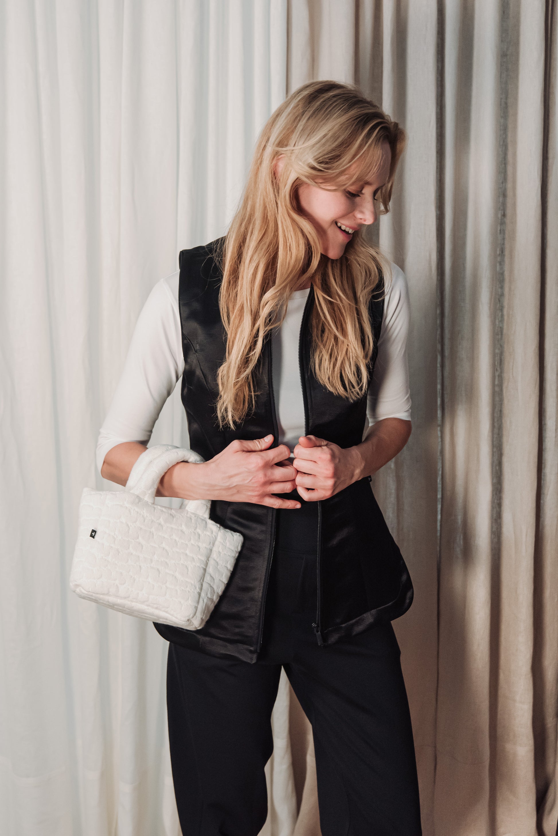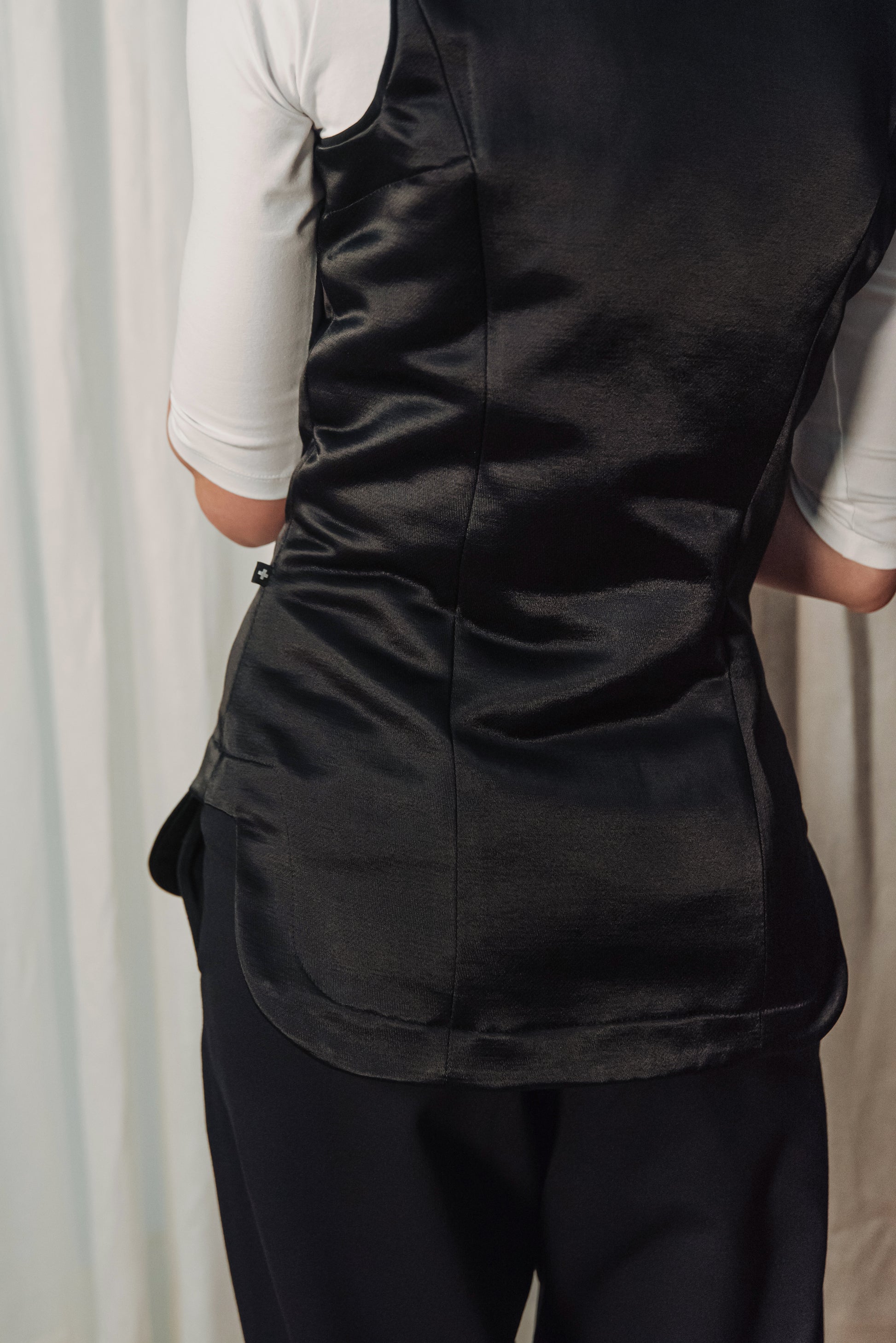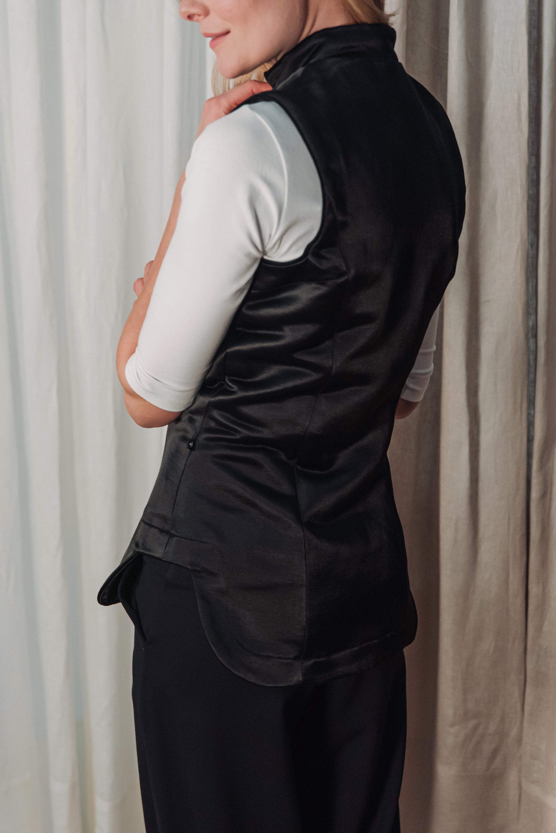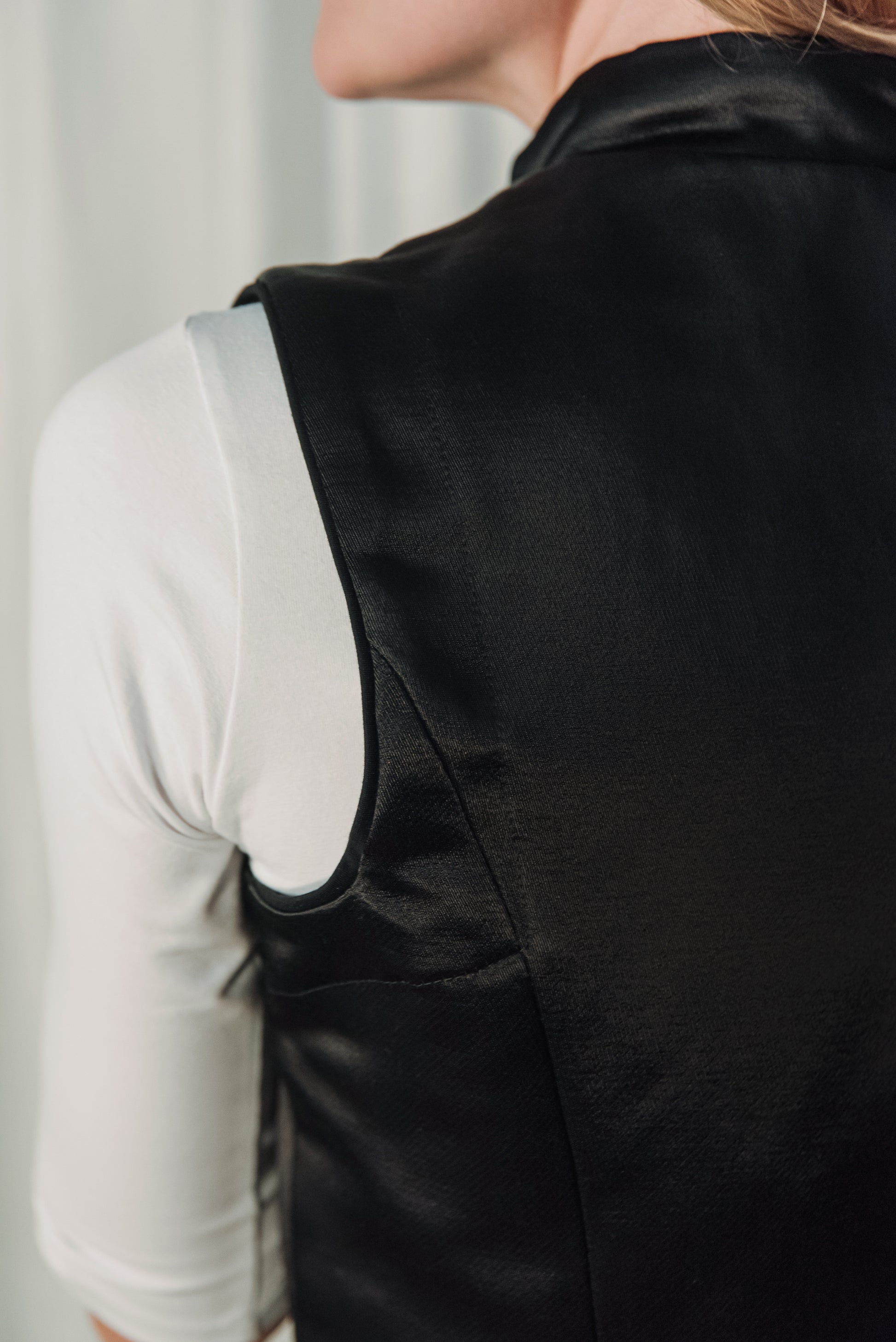 > The CALE vest is a combination of clean lines and sophisticated details. Its slim cut gently follows the body, while the shiny material gives the look an elegant character. The full-length zipper at the front is a modern, functional solution that makes the piece both practical and timeless. Reflecting the NONPLUS design approach, the vest takes comfort to a new level: precisely tailored, yet comfortable, making it the perfect choice for everyday wear or layering. A piece that completes your wardrobe with subtle strength and understated elegance.