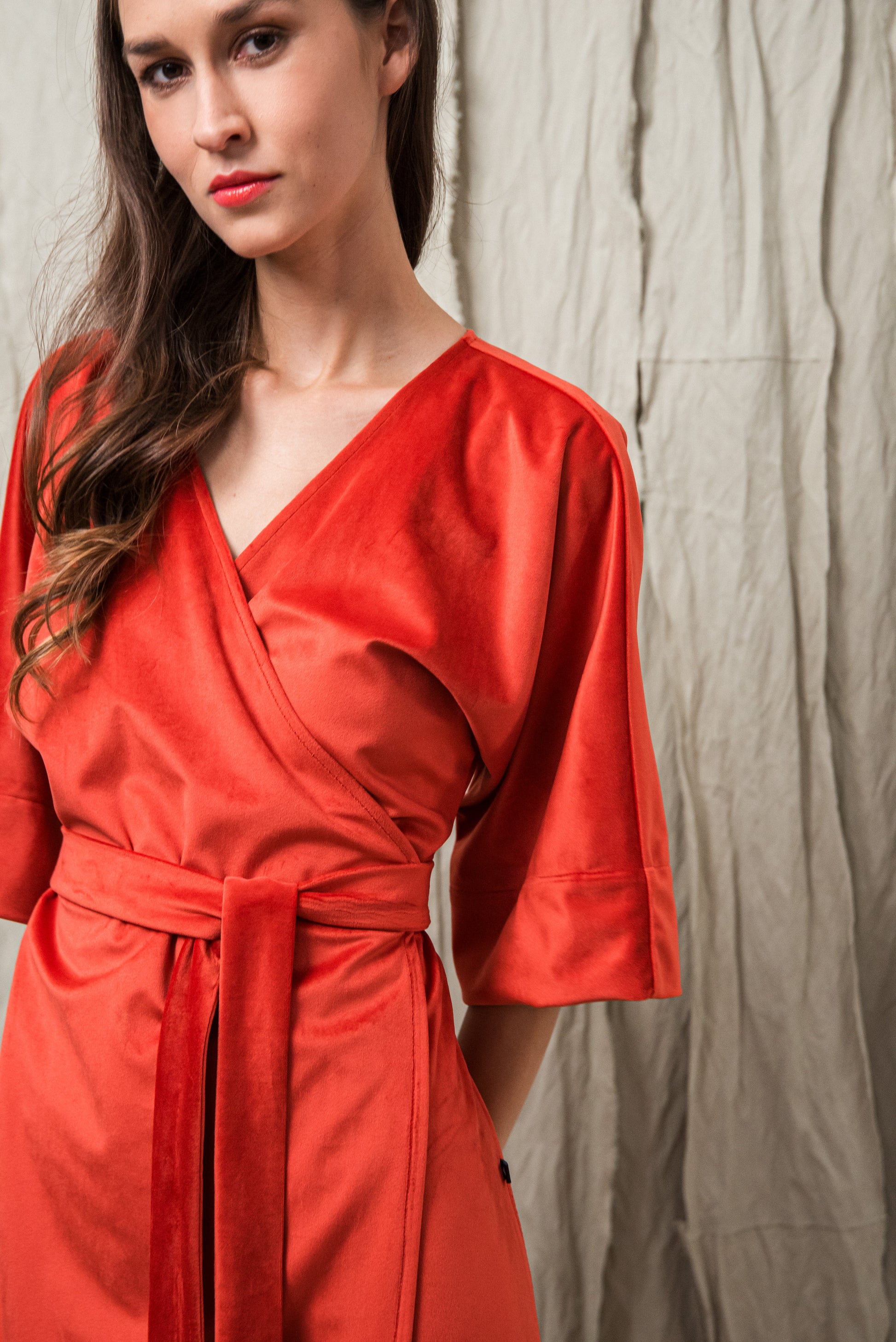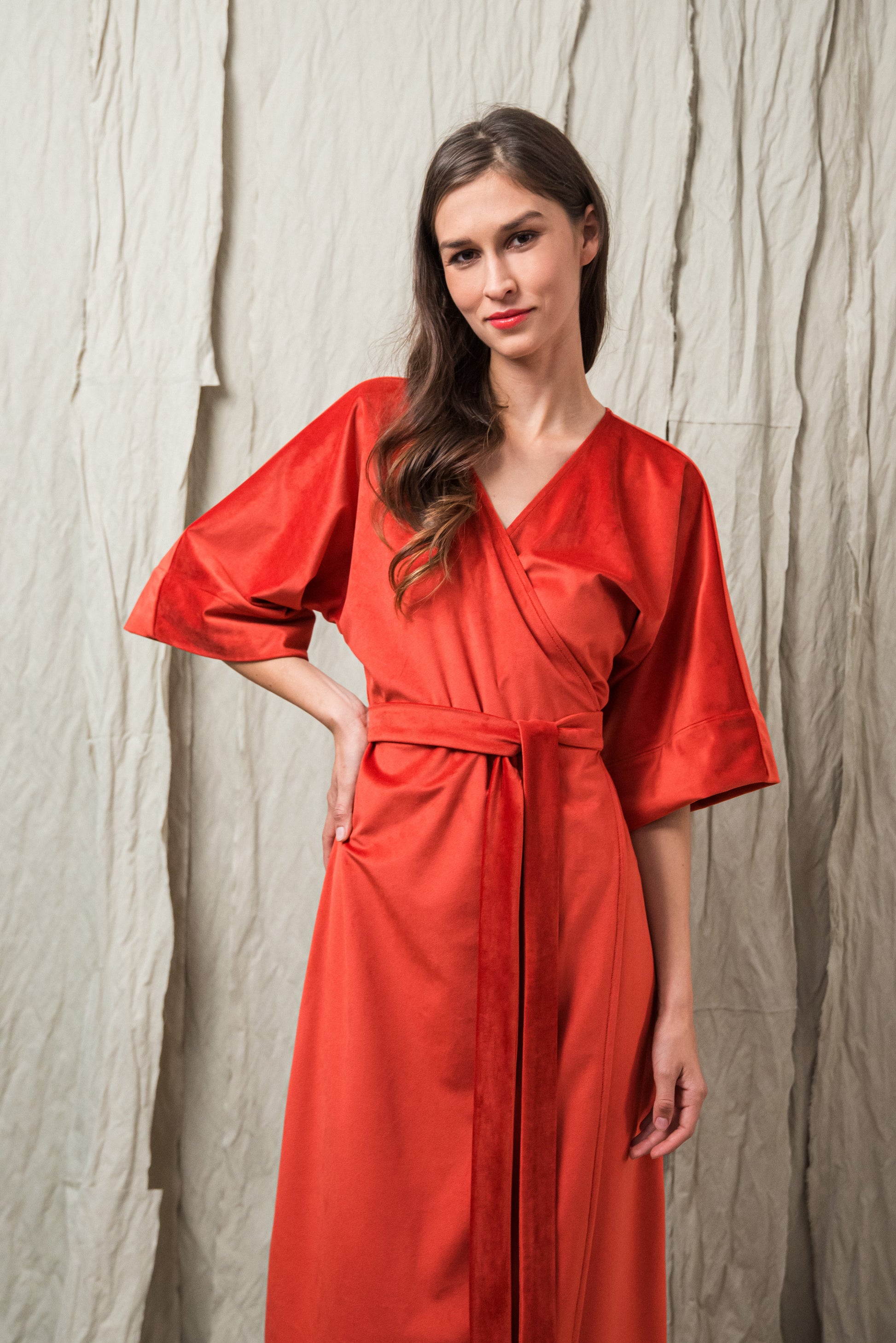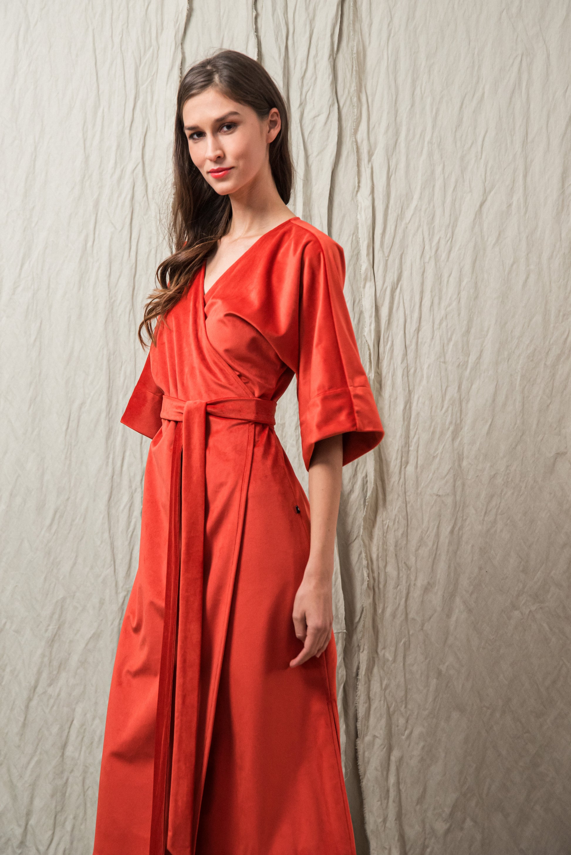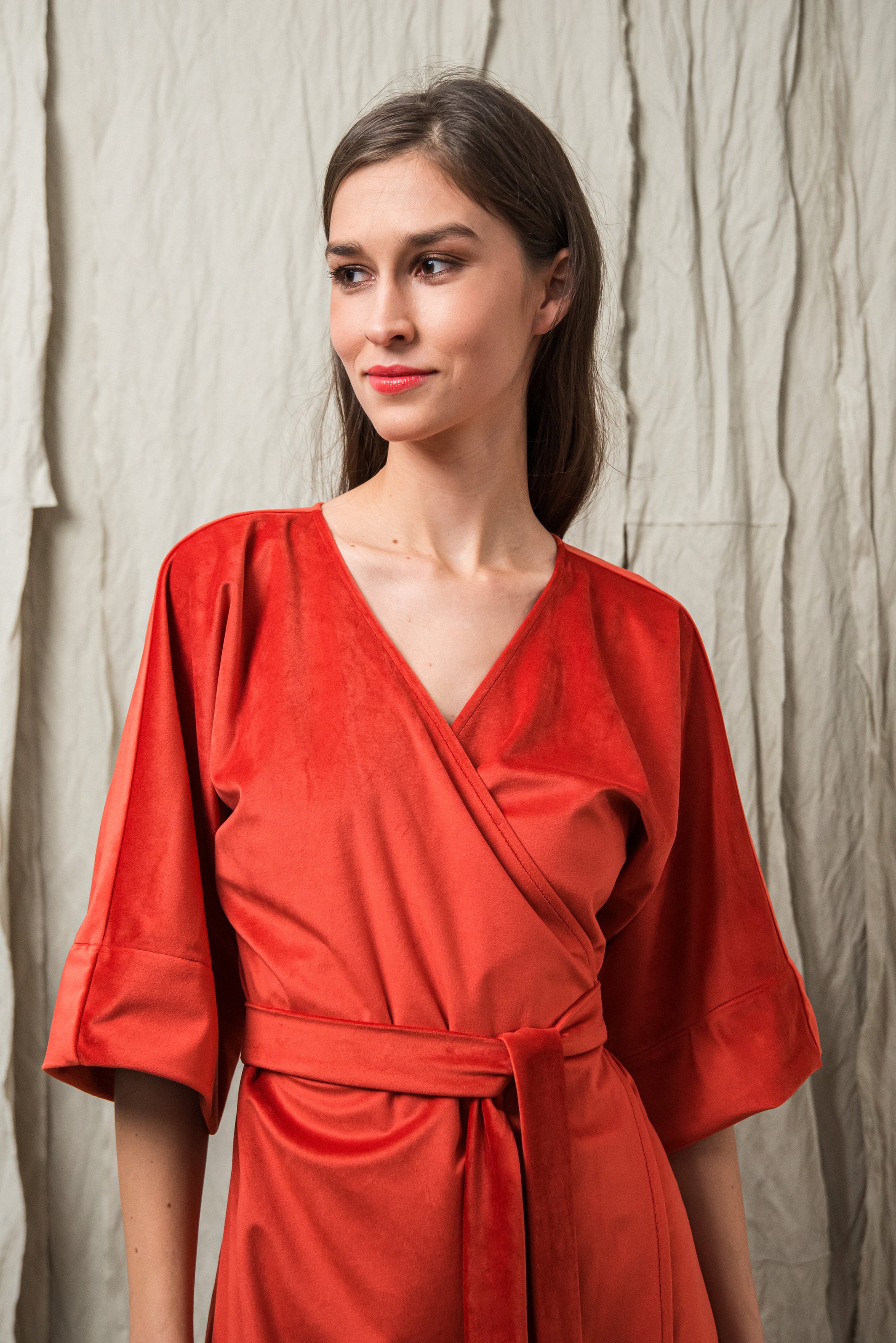 A minimalista szabás és az oldalsó megkötő nőies, finoman hangsúlyos sziluettet ad, miközben a részletekben rejlő luxus érzését sugározza. Ez a ruha a visszafogott fényűzés és a természetes elegancia ünnepi megnyilvánulása.
