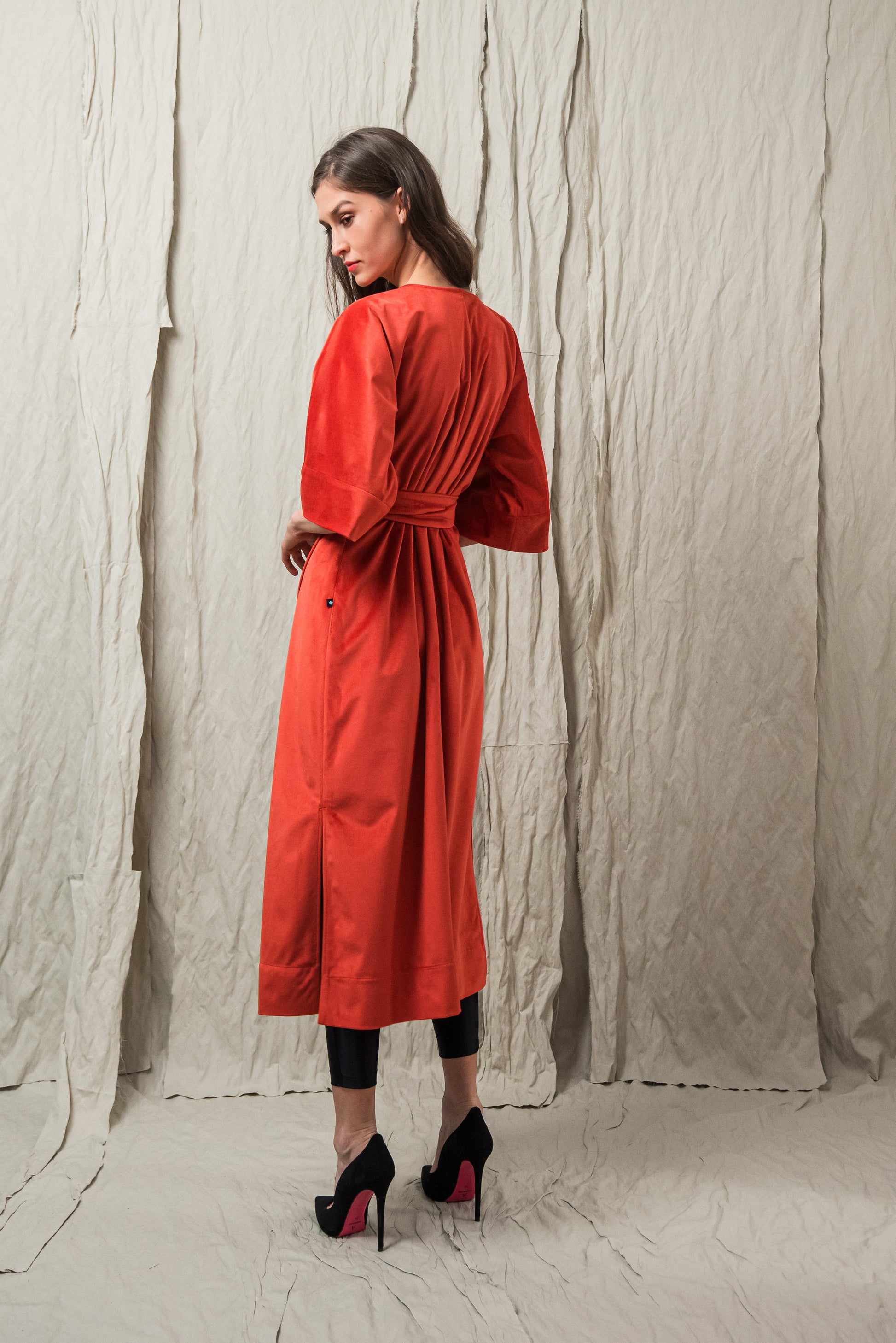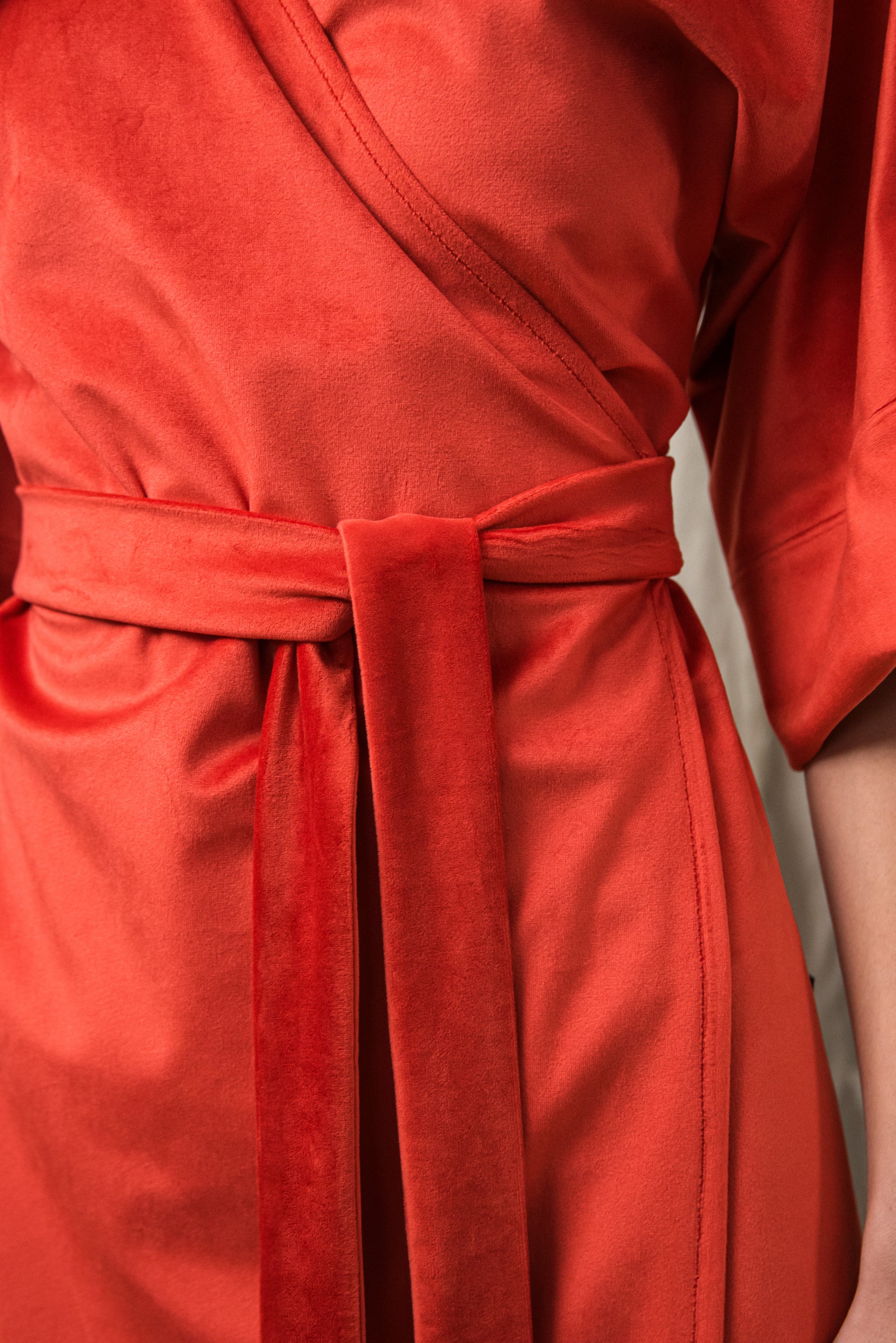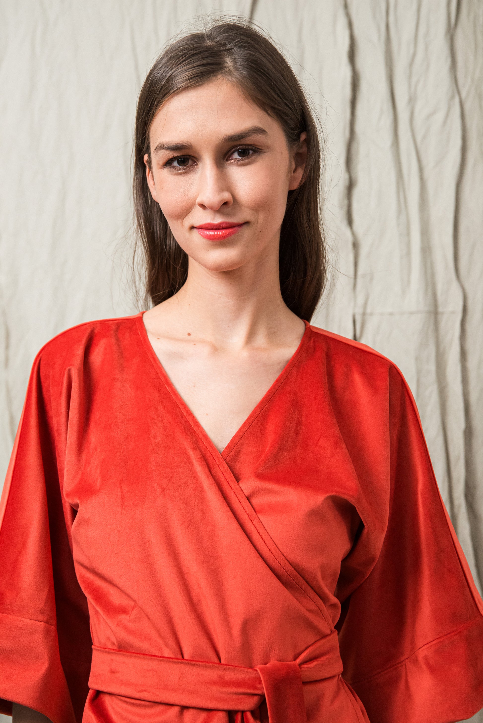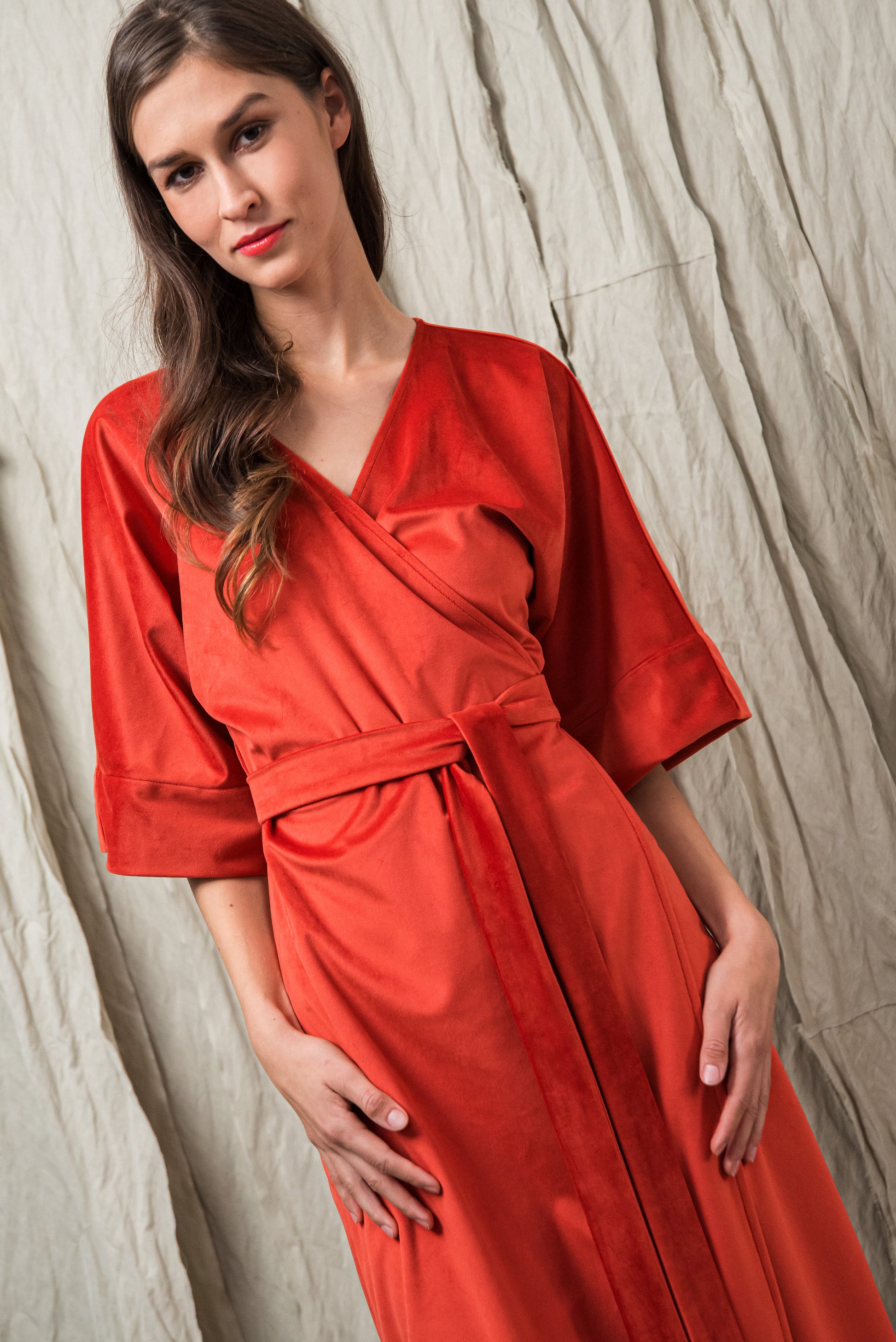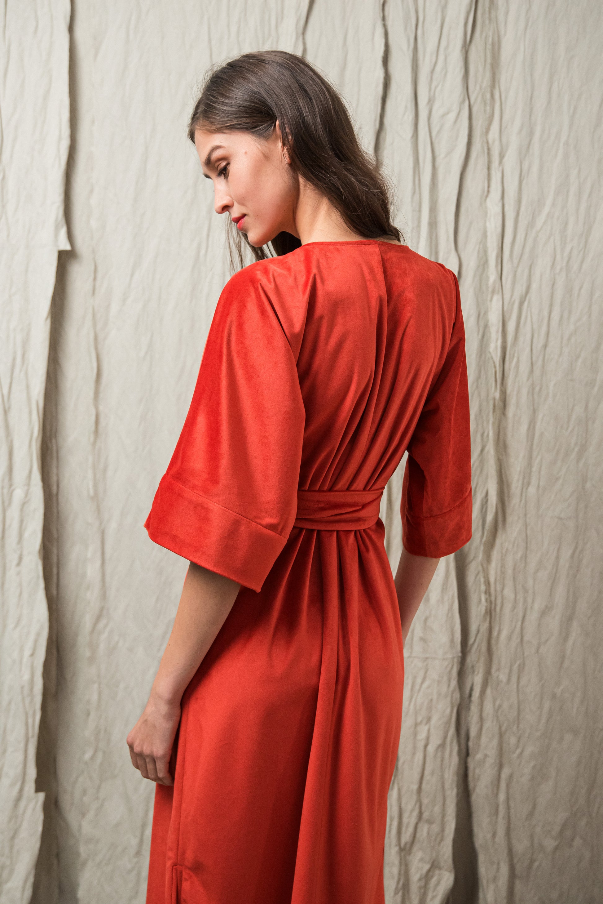 A minimalista szabás és az oldalsó megkötő nőies, finoman hangsúlyos sziluettet ad, miközben a részletekben rejlő luxus érzését sugározza. Ez a ruha a visszafogott fényűzés és a természetes elegancia ünnepi megnyilvánulása.