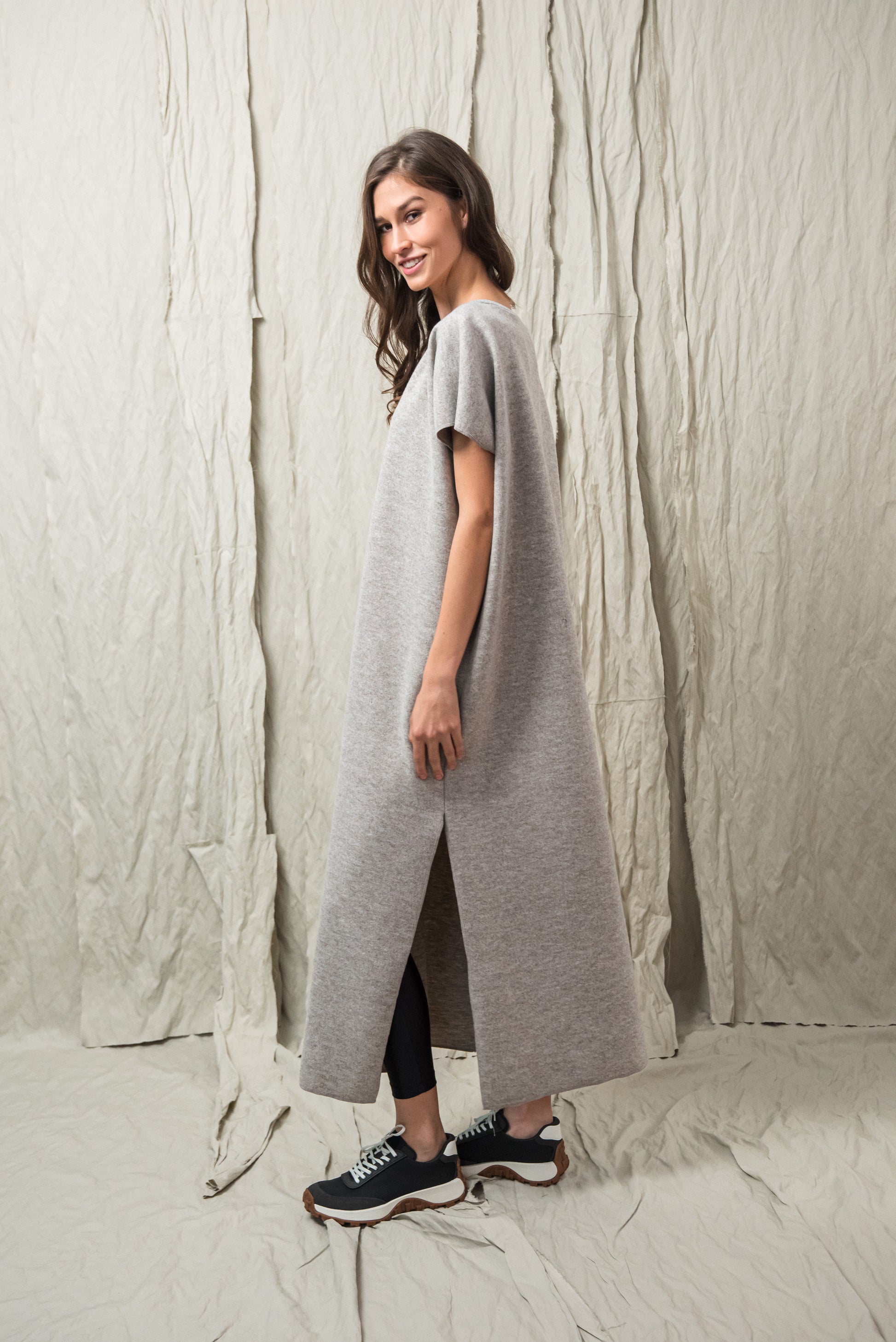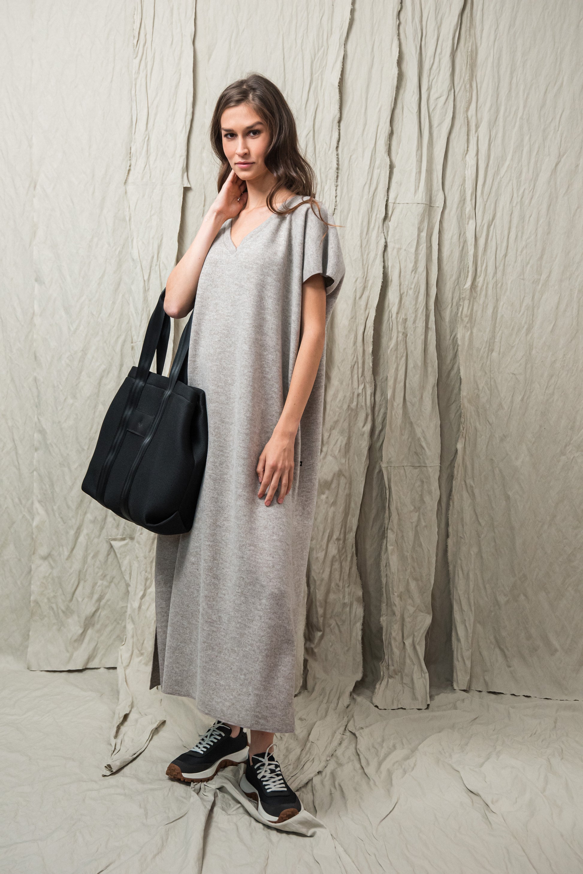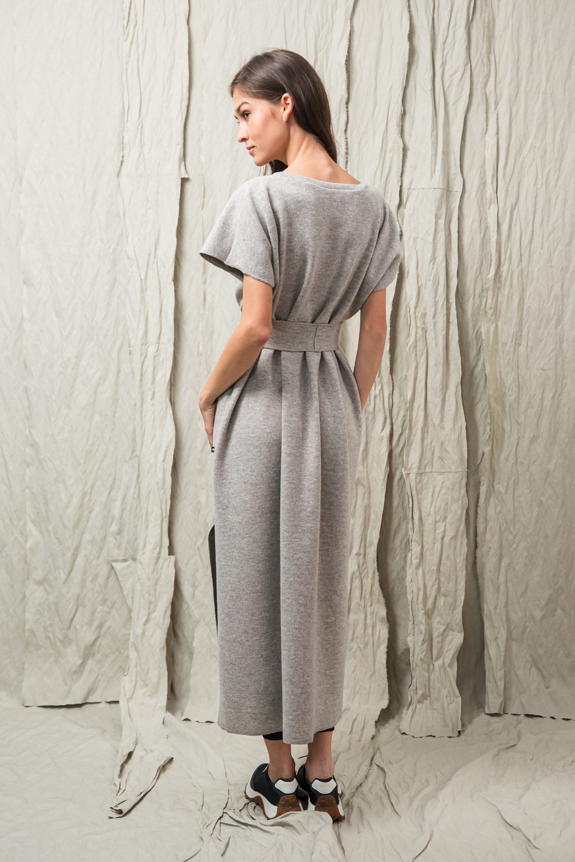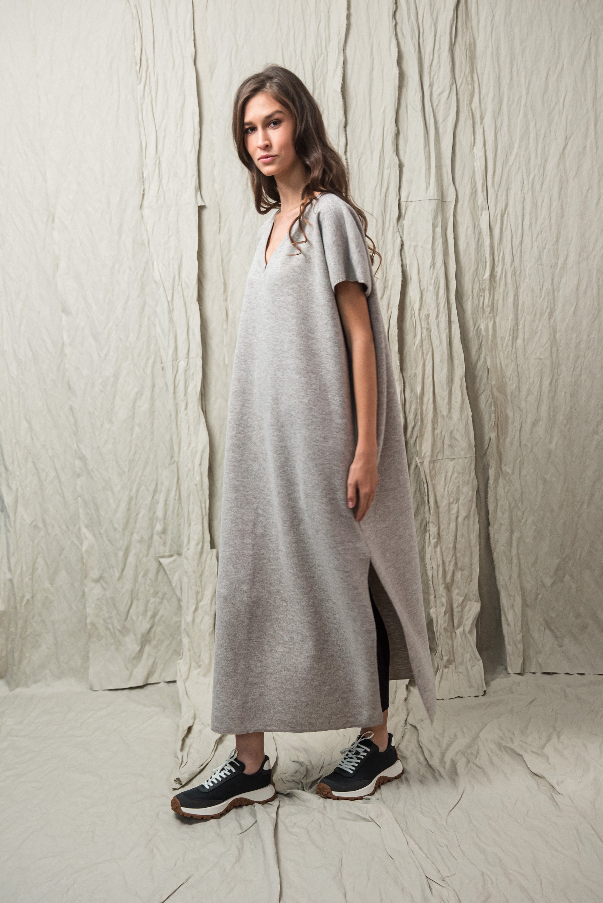 > AWA ruhánk tökéletes viselet, ami egyszerre egyszerű és karakteres. Laza, V‑nyakú fazonját oldalsó sliccek dobják fel, amelyek finom mozgásteret adnak a mindennapokhoz. Anyagából készült övvel a testkontúr rögtön kirajzolódik - de öv nélkül is viselhető. Anyaga puha, kényelmes - fazonja pedig időtlen eleganciát kölcsönöz. A mikrolock eldolgozás szép, letisztult vonalakat eredményez, így a ruhadarab egyszerre hat sportosan könnyednek és finoman nőiesnek. A NONPLUS filozófiáját tükrözve: ez a ruhadarab egyszerre természetes, fenntartható és hosszú távon hordható – a letisztult, mégis figyelemfelkeltő design jegyében.