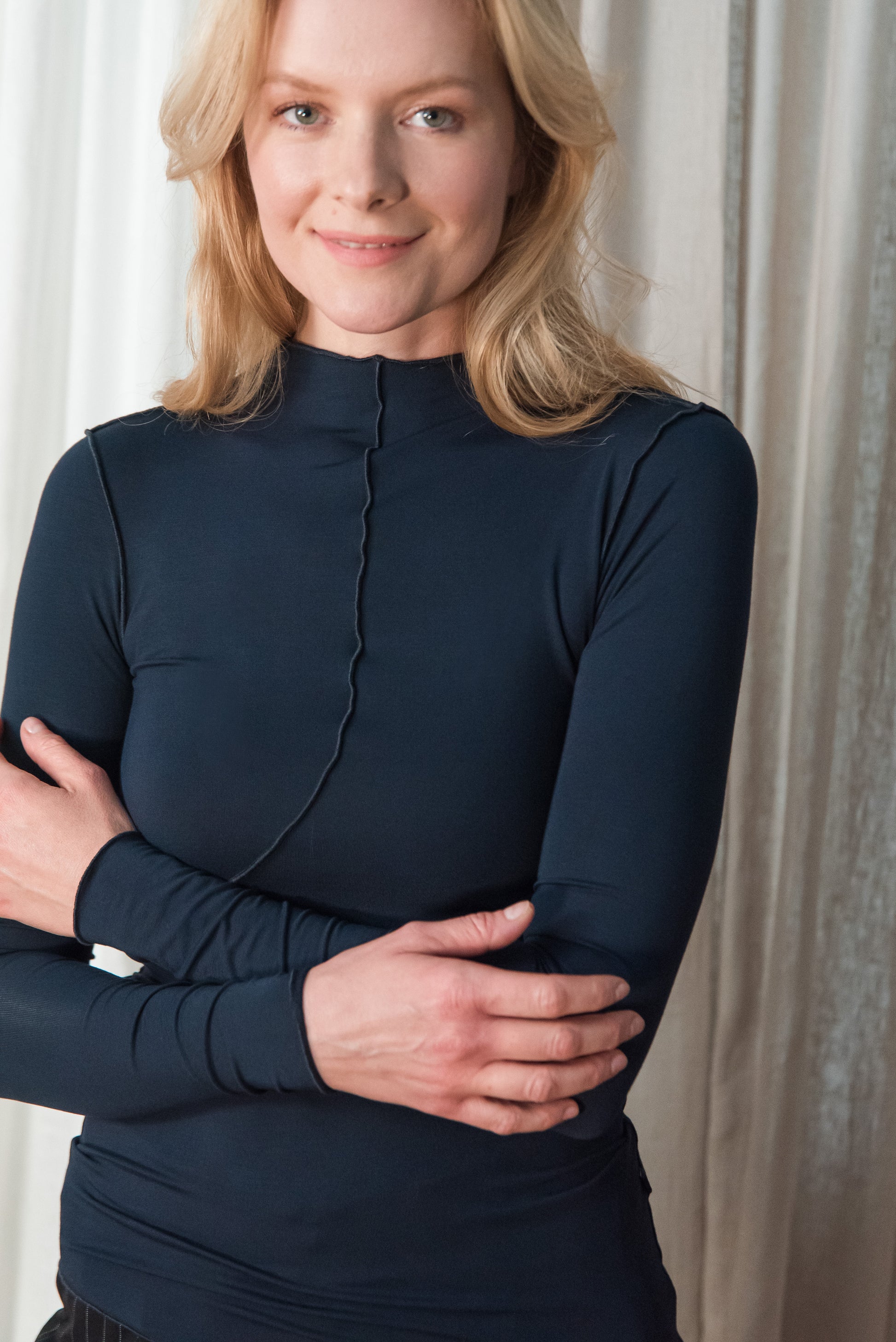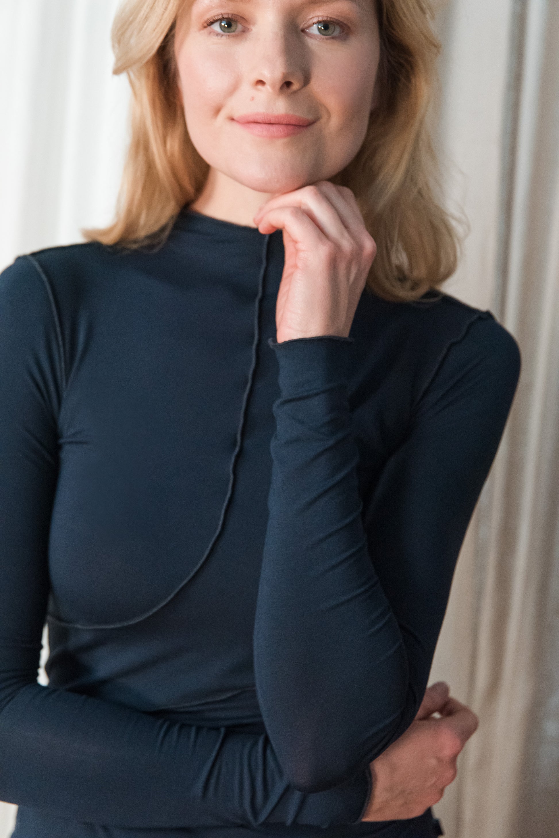 > BINU hosszú ujjú felsőnk szűk szabású, rugalmas alapdarab, amely kényelmes viselet a hétköznapokban, mégis különleges megjelenést nyújt. Letisztult vonalvezetését az aszimmetrikus szabású alj, valamint a mikrolock eldolgozás teszi karakteressé – nemcsak a szabásvonalakon, de az ujja végén, a nyakkivágásnál és az alján is ez a részlet ad finoman hangsúlyos textúrát a darabnak. Testhez simuló fazonja jól rétegezhető, ugyanakkor önmagában is határozott, mégis visszafogott megjelenést biztosít.