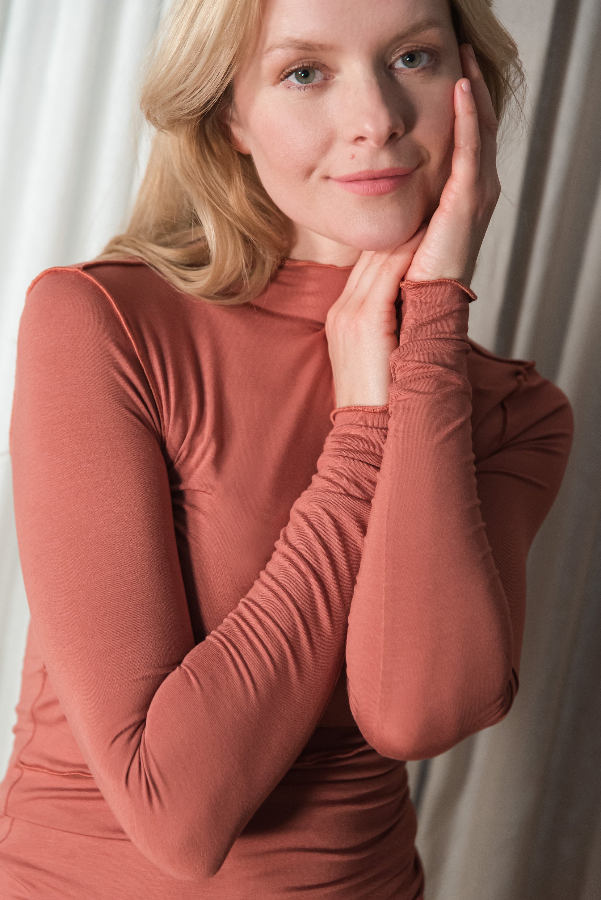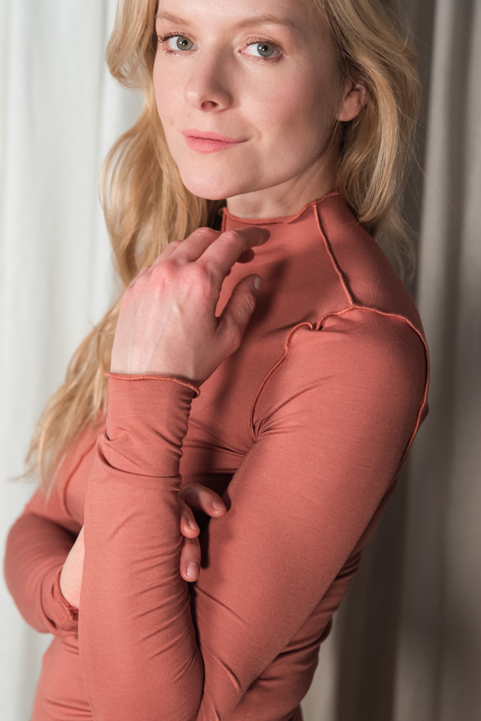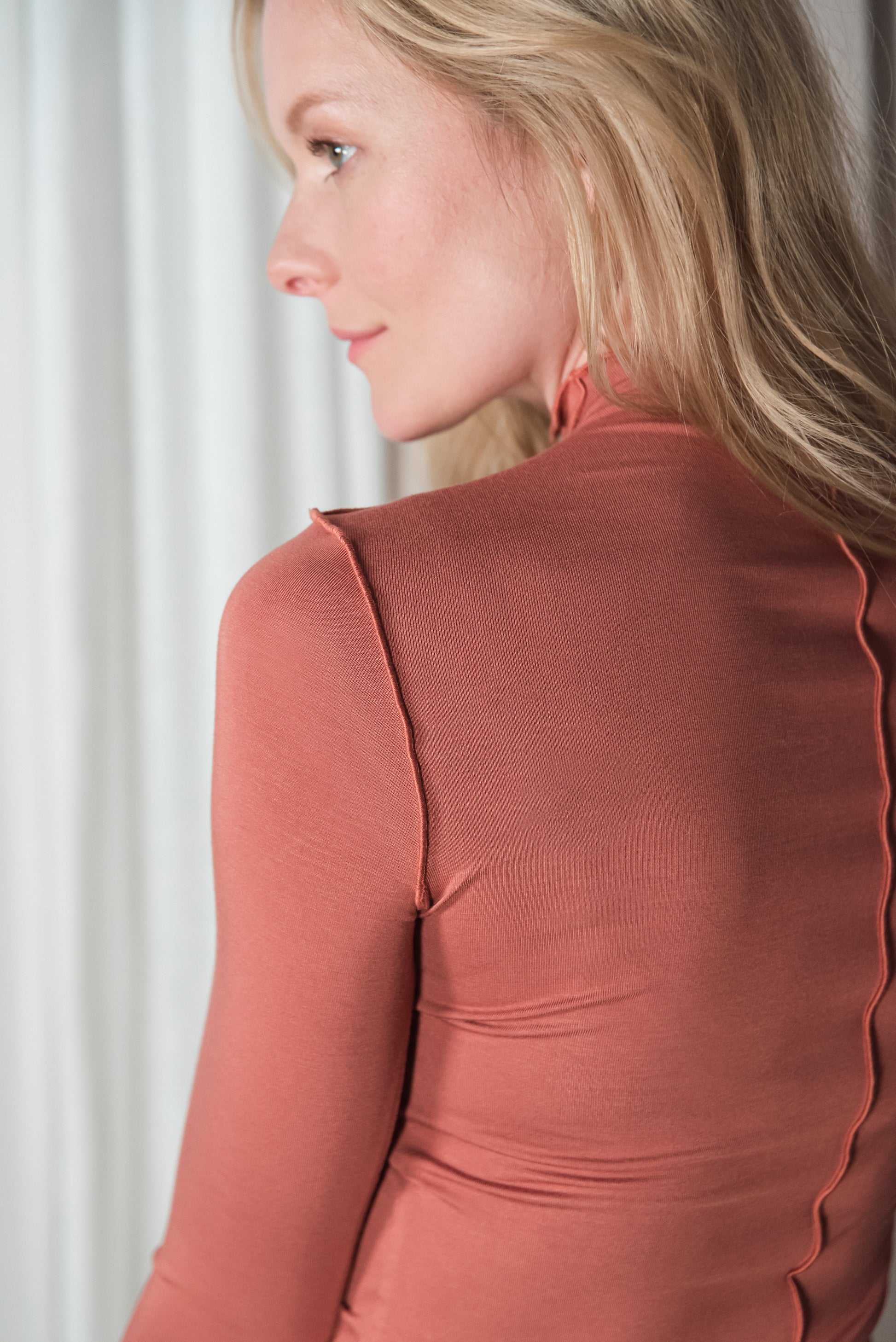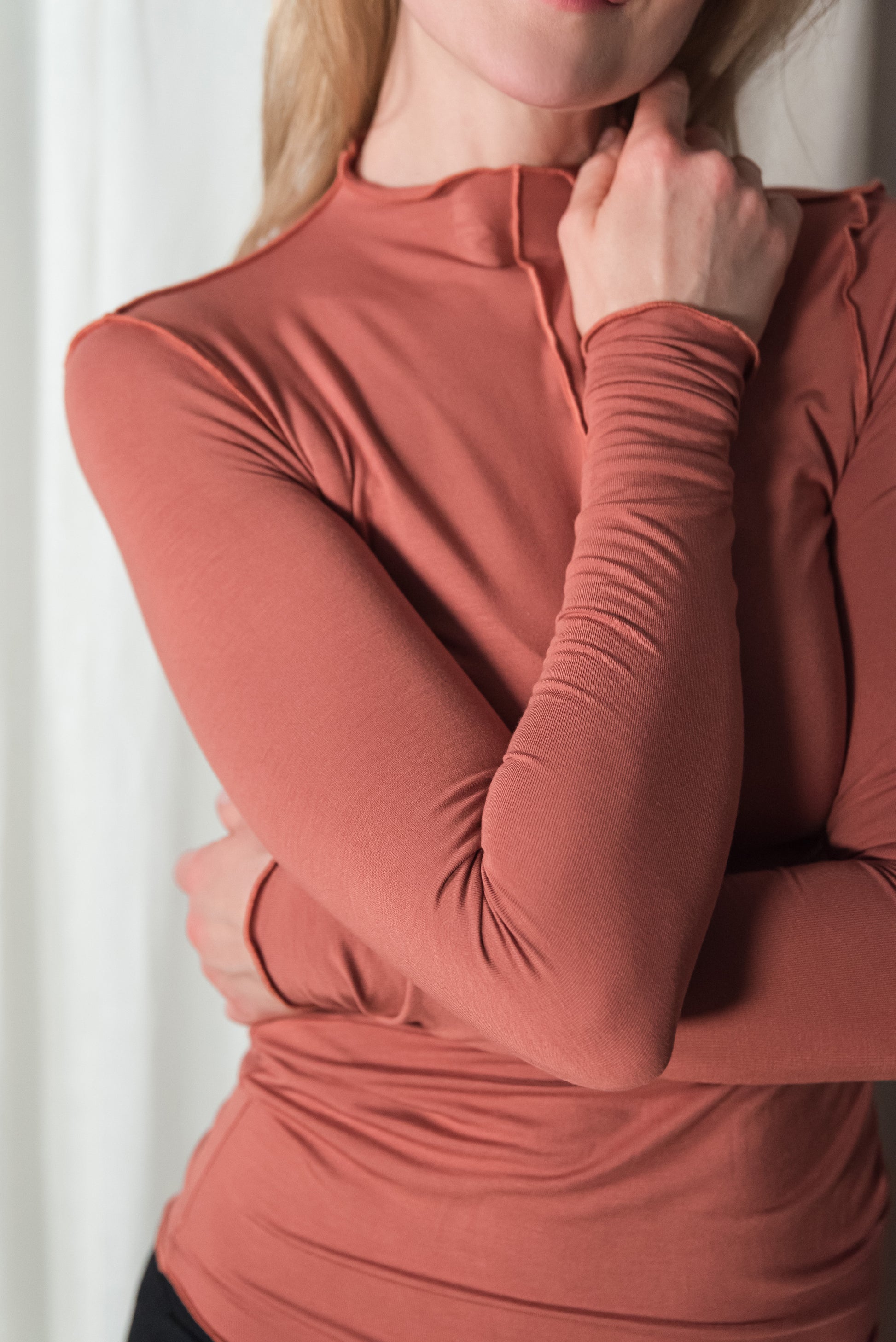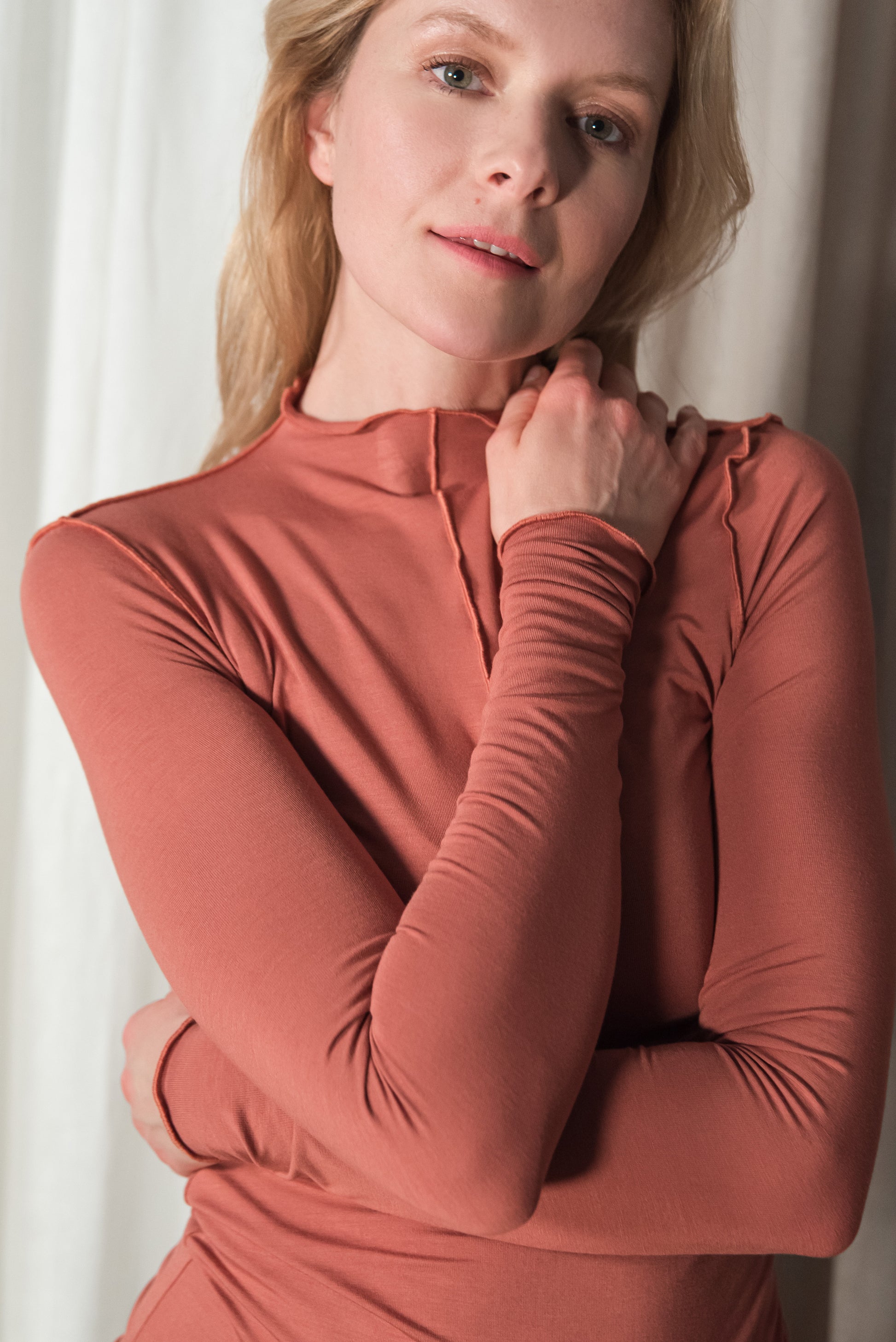 > BINU hosszú ujjú felsőnk szűk szabású, rugalmas alapdarab, amely kényelmes viselet a hétköznapokban, mégis különleges megjelenést nyújt. Letisztult vonalvezetését az aszimmetrikus szabású alj, valamint a mikrolock eldolgozás teszi karakteressé – nemcsak a szabásvonalakon, de az ujja végén, a nyakkivágásnál és az alján is ez a részlet ad finoman hangsúlyos textúrát a darabnak. Testhez simuló fazonja jól rétegezhető, ugyanakkor önmagában is határozott, mégis visszafogott megjelenést biztosít.