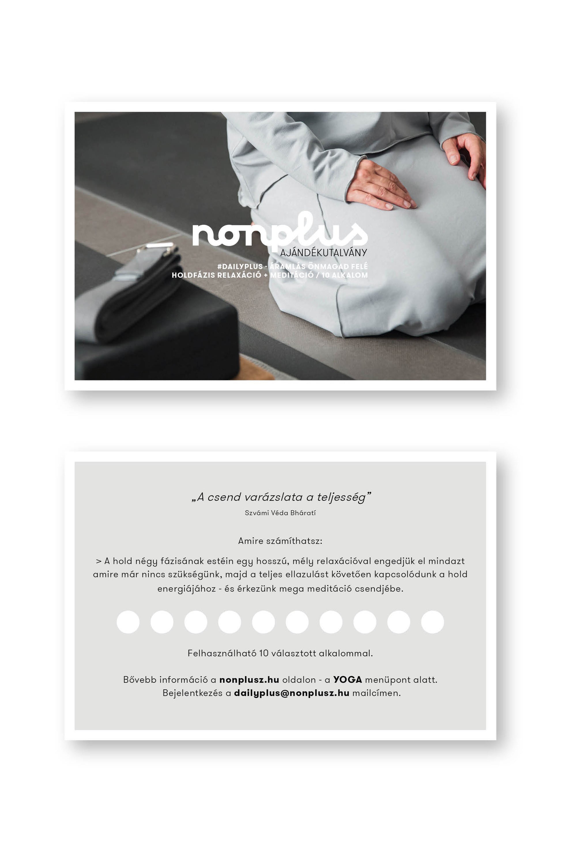 A NONPLUS #dailyplus papír alapú ajándékutalvány, mely 10 alkalommal használható fel, egy választott időpontban. Személyes és örömteli ajándék bárkinek, akinek 10x1,5 óra elmélyült MEDITATÍV CSEND-et szeretnél ajándékozni.