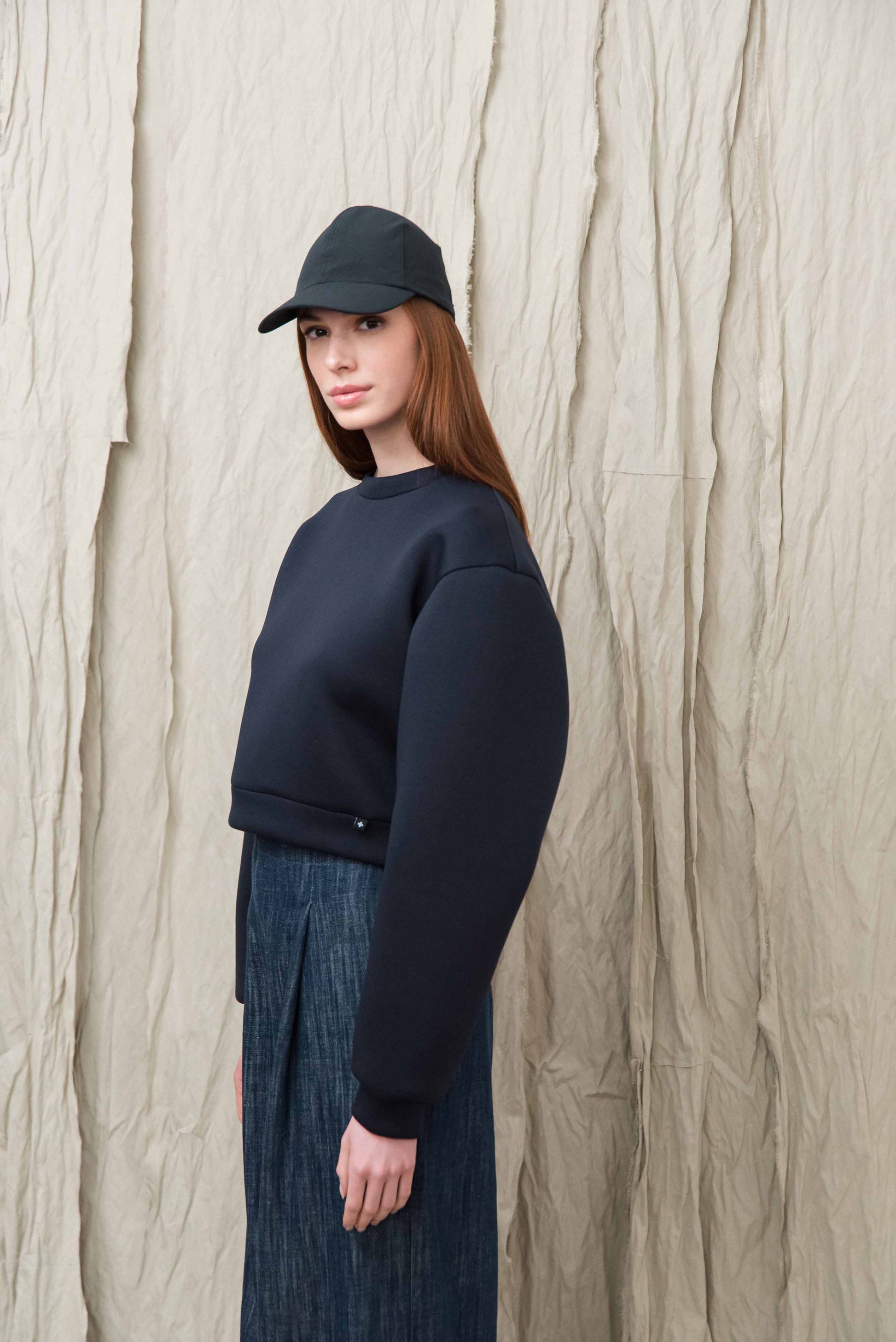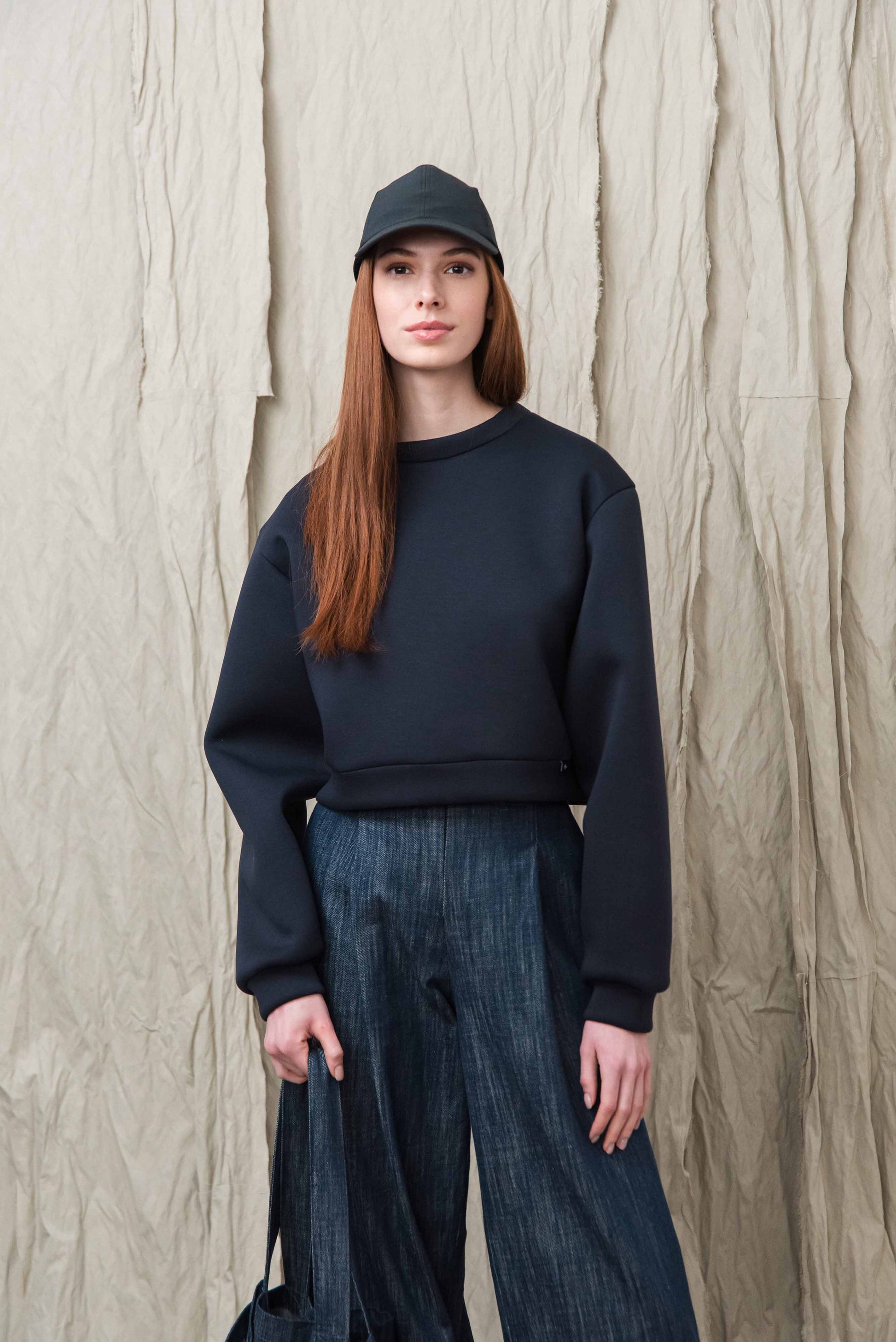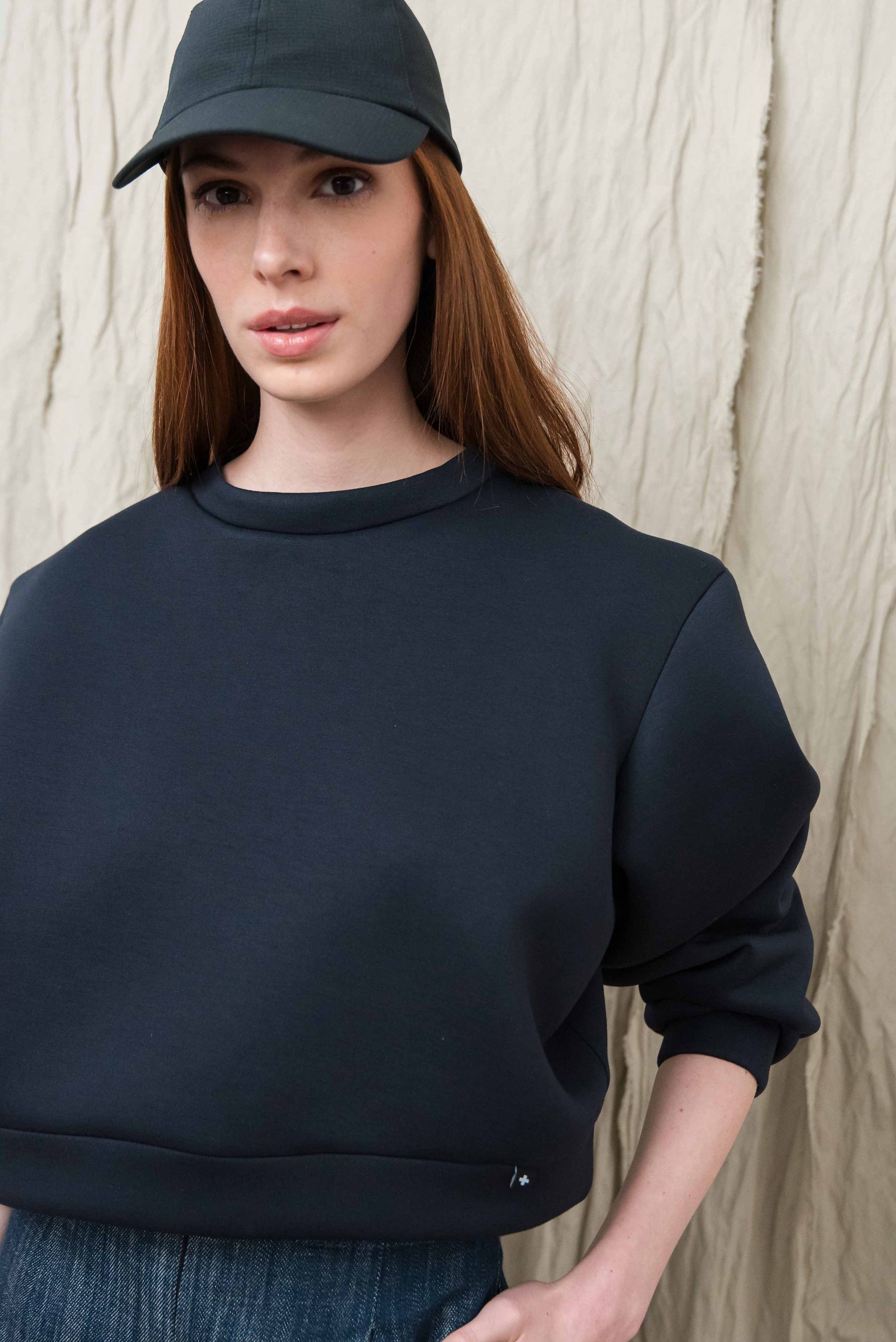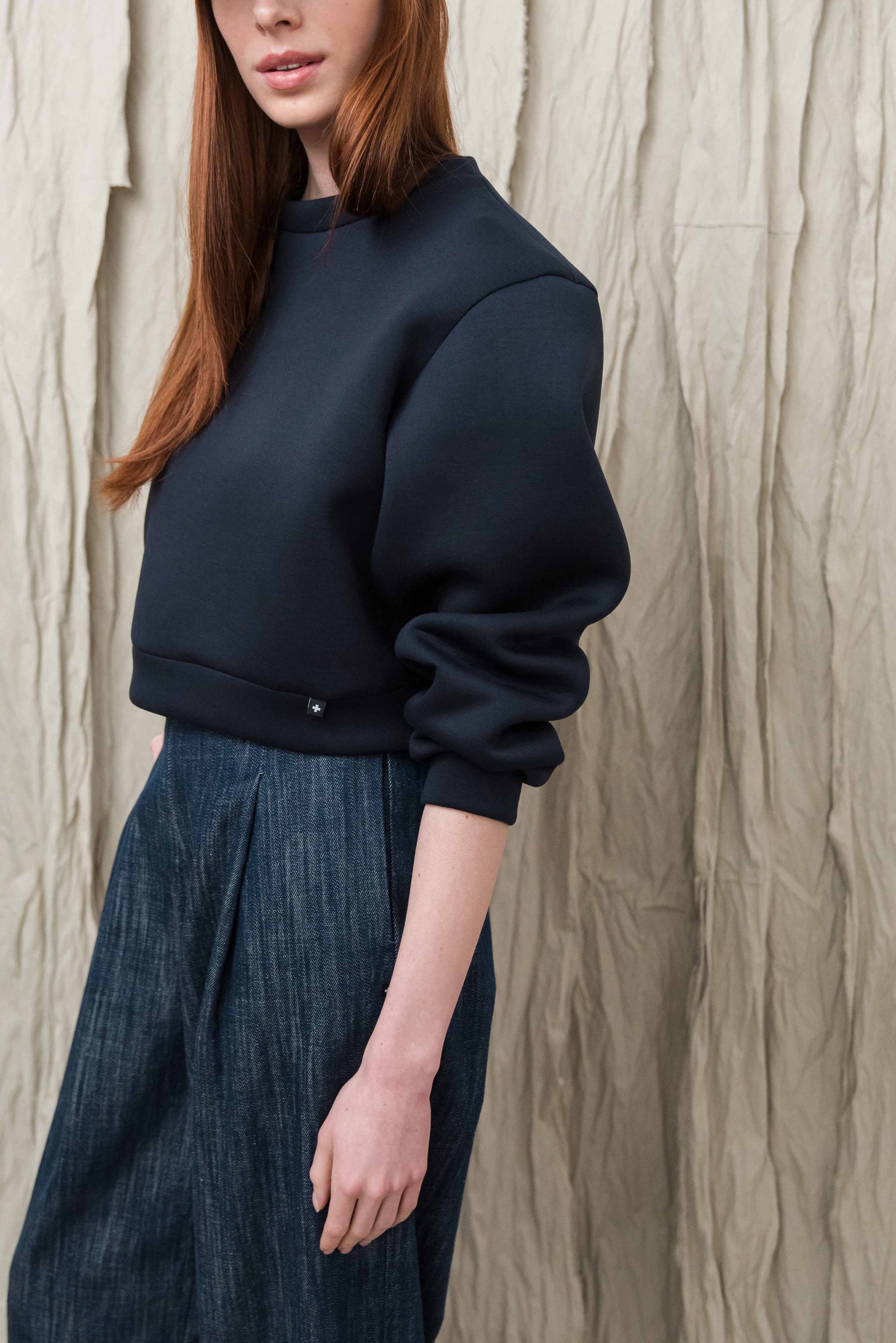 A pulóver könnyű, úgynevezett „scuba” jellegű technikai anyagból készül, amely sima felületű és enyhén szivacsos szerkezetű, így stabil, mégis kellemesen puha érzetet ad. A poliészter alapú összetétel hozzájárul az anyag tartósságához, jó alakmegtartó képességéhez és gyűrődésállóságához, ezért a ruhadarab hosszabb használat során is megőrzi letisztult megjelenését. A könnyű, rugalmas szerkezet komfortos viseletet biztosít, miközben a pulóver formája szépen megtartott marad.