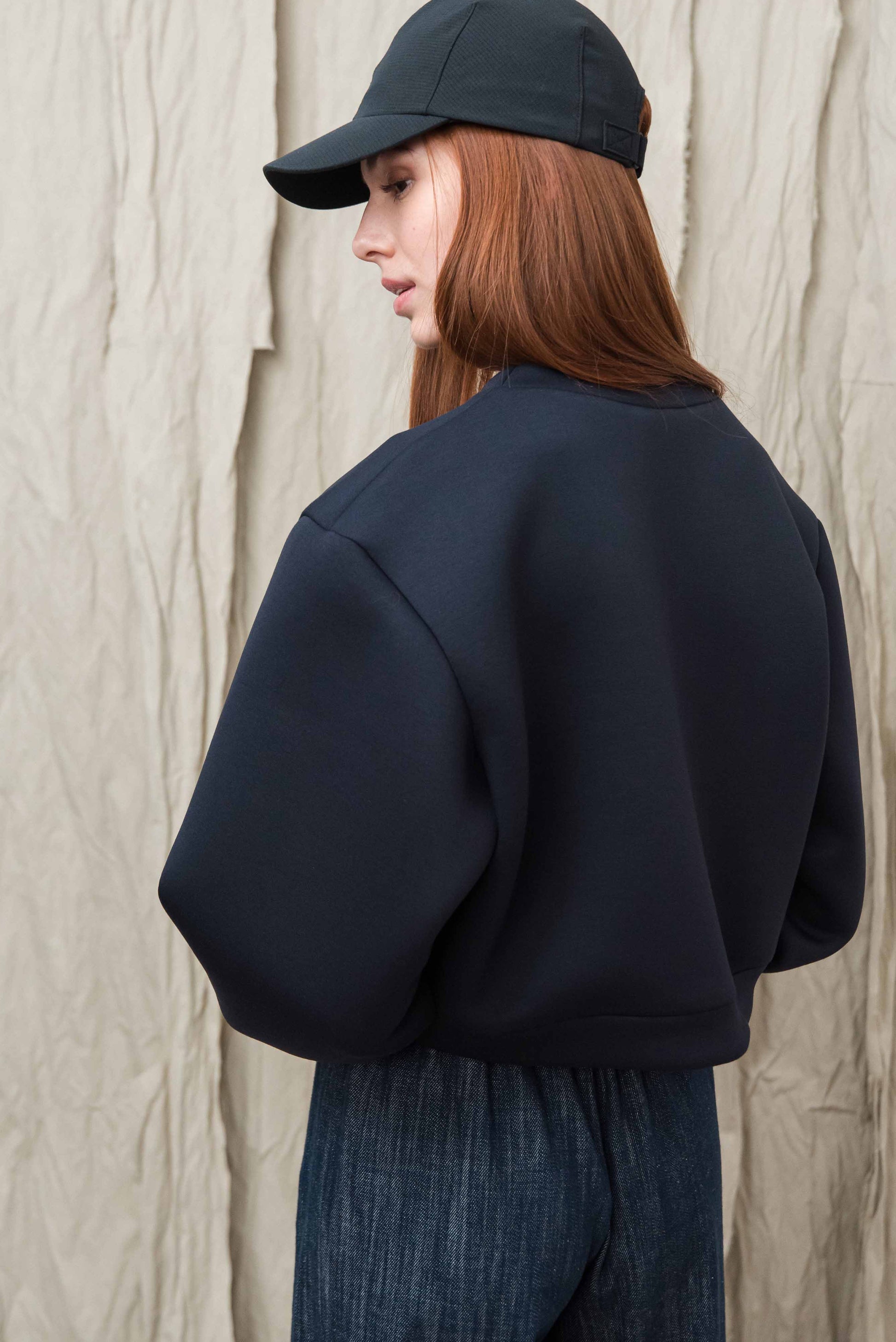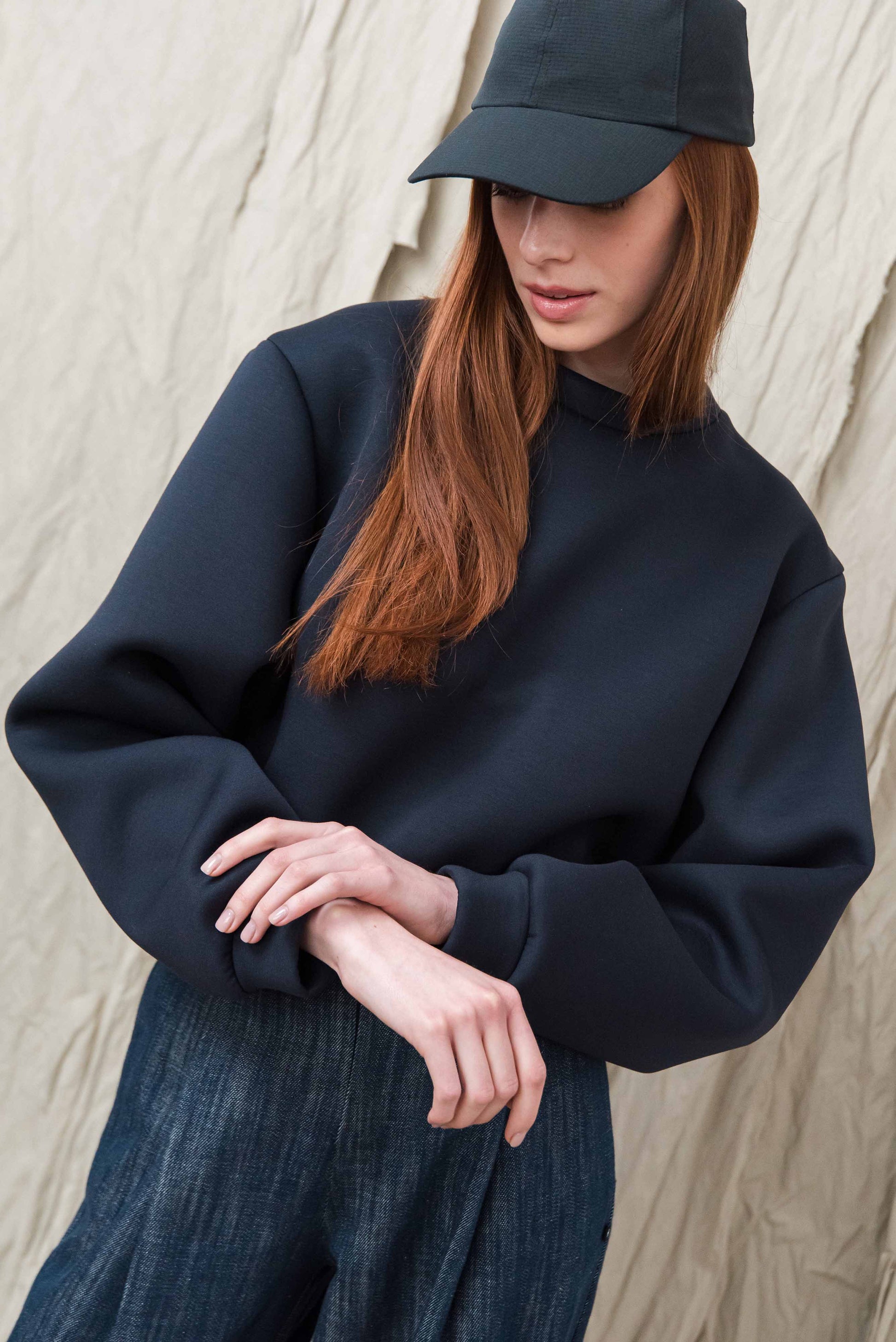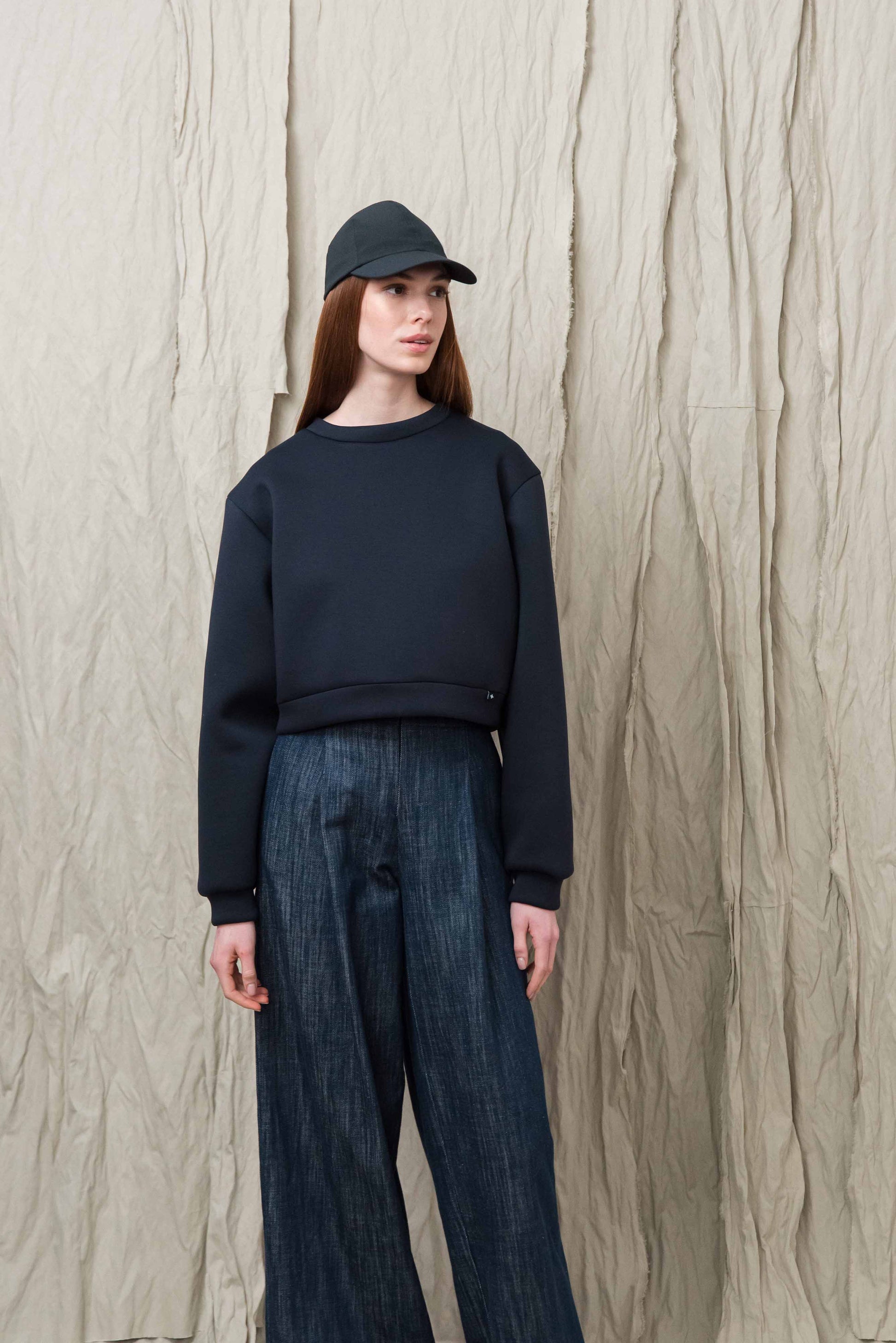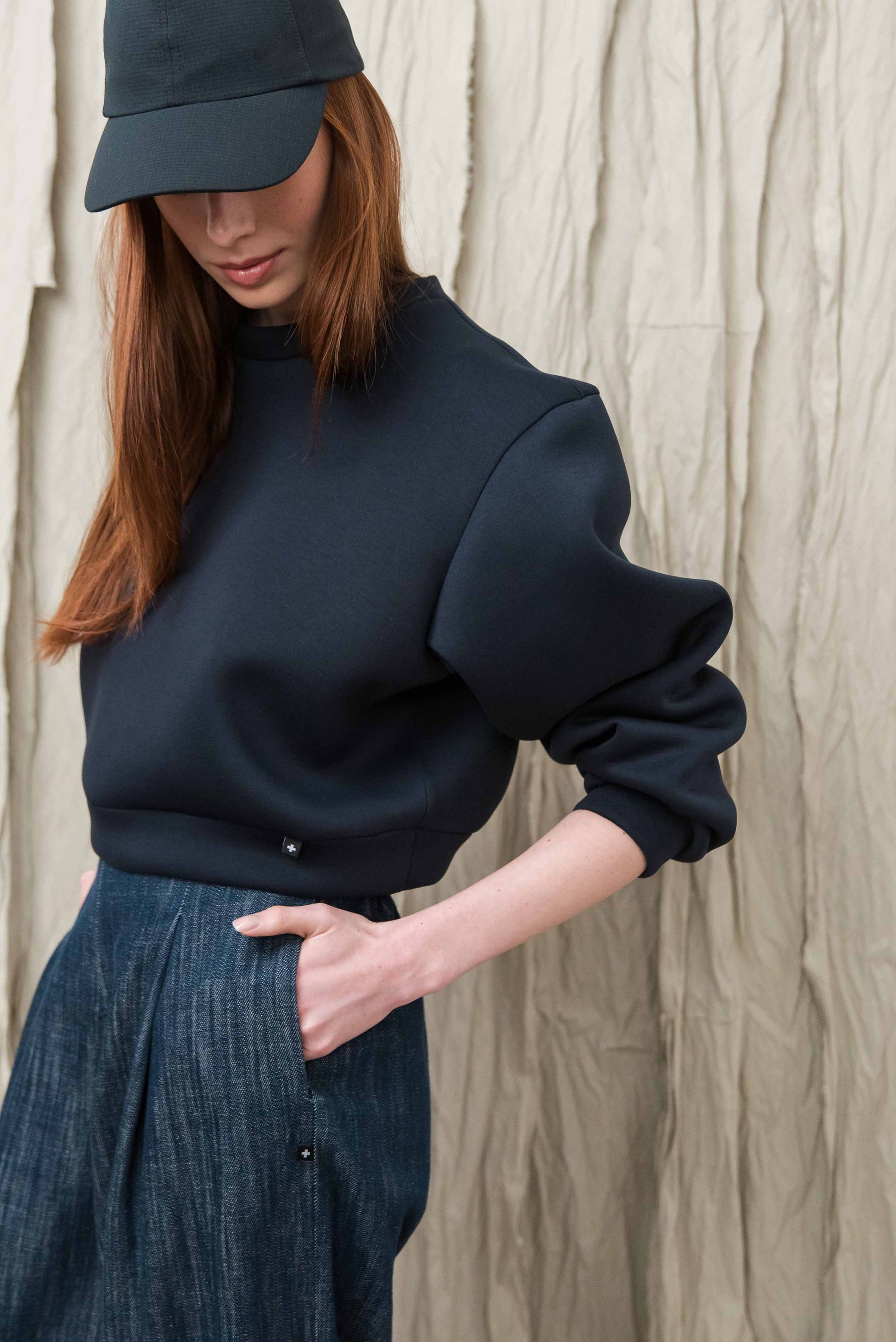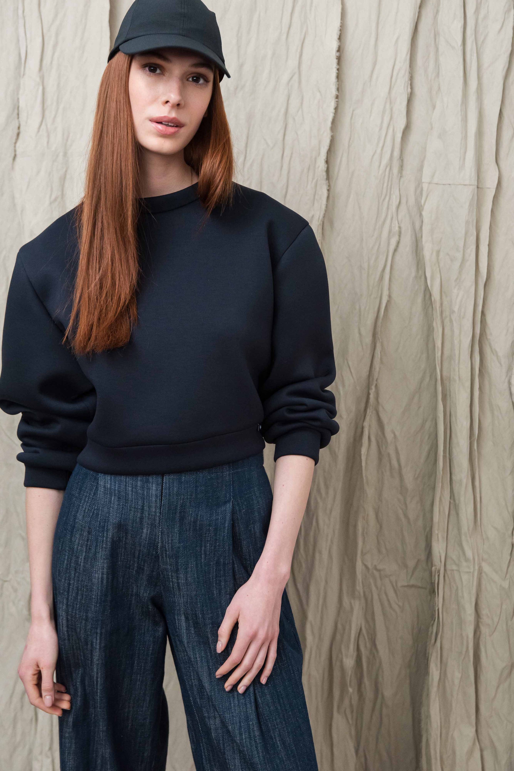 A pulóver könnyű, úgynevezett „scuba” jellegű technikai anyagból készül, amely sima felületű és enyhén szivacsos szerkezetű, így stabil, mégis kellemesen puha érzetet ad. A poliészter alapú összetétel hozzájárul az anyag tartósságához, jó alakmegtartó képességéhez és gyűrődésállóságához, ezért a ruhadarab hosszabb használat során is megőrzi letisztult megjelenését. A könnyű, rugalmas szerkezet komfortos viseletet biztosít, miközben a pulóver formája szépen megtartott marad.