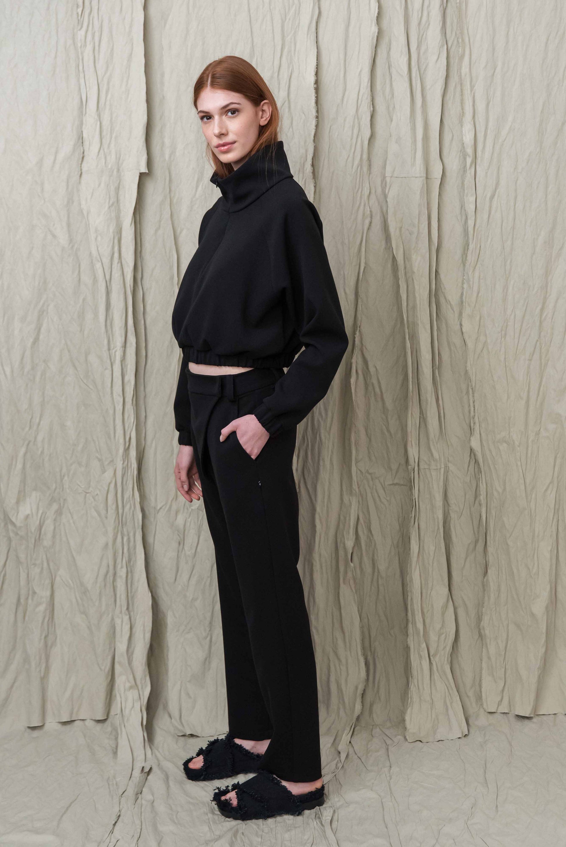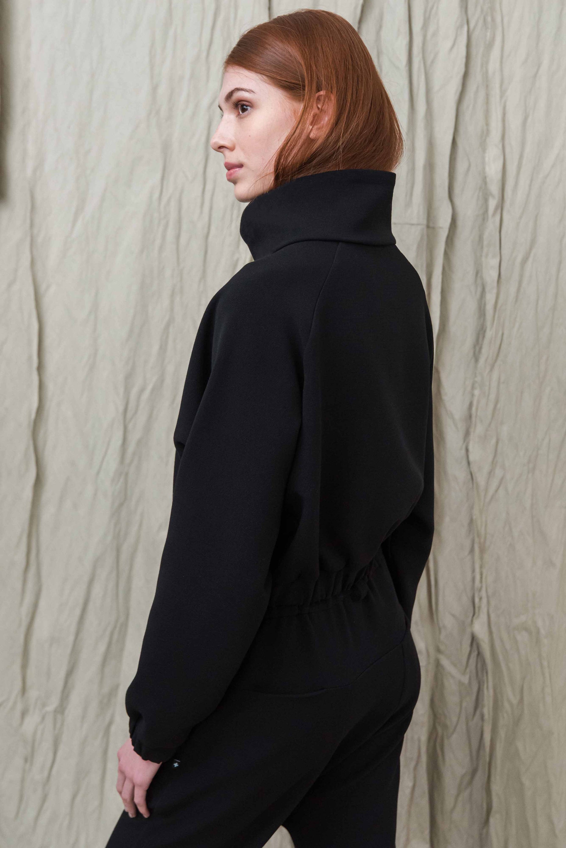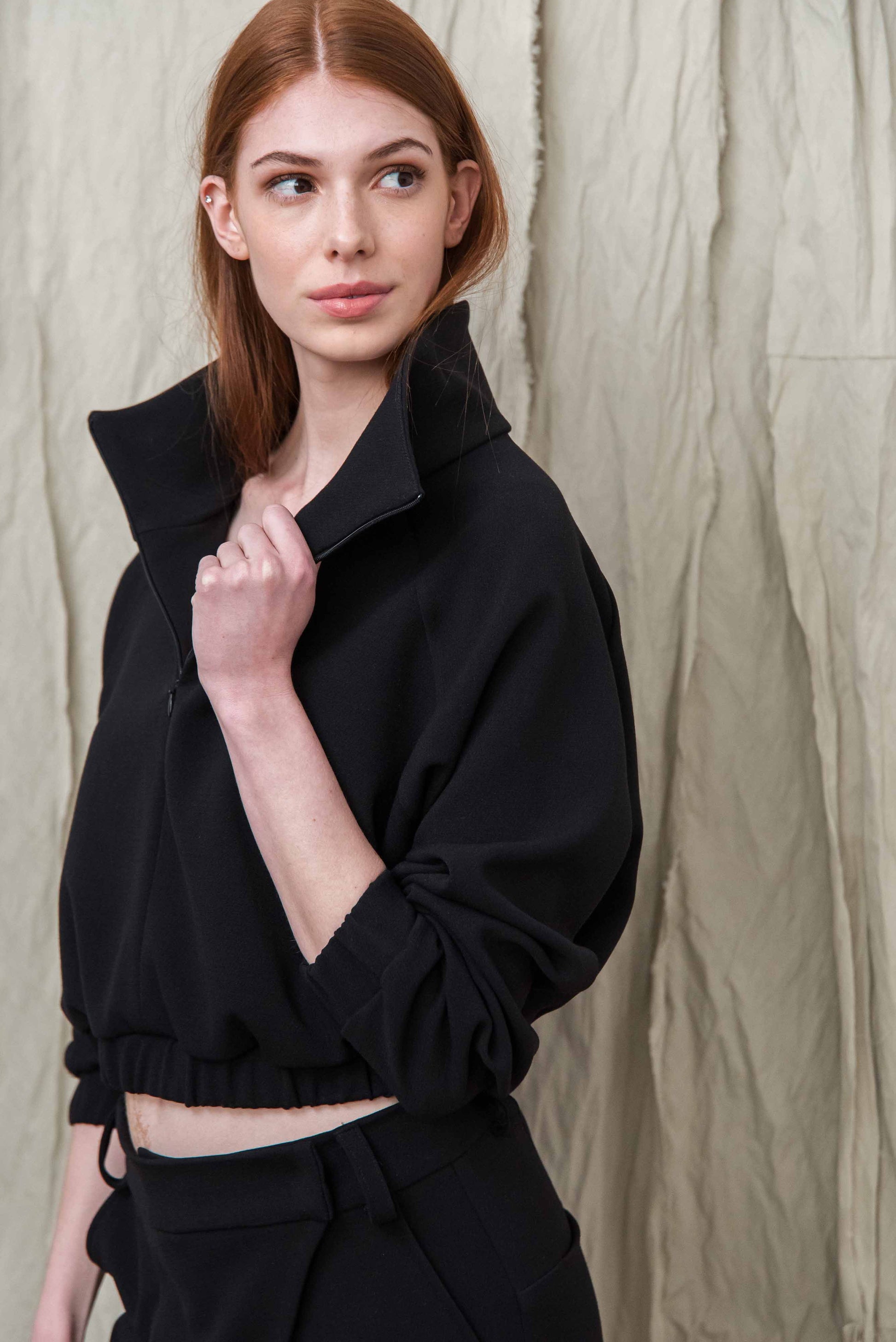 > Az ITTE felső egy karakteres, mégis letisztult darab, amely egyszerre ad tartást és szabadságot a mindennapokban. Rövidített fazonja és finoman húzott alja természetes arányokat teremt, miközben kényelmesen illeszkedik a testhez. Elöl rejtett cipzárral záródik, amely felhúzva és lehúzva is jól működik – így a megjelenés és a nyitottság mértéke is szabadon alakítható. A magas, strukturált gallér nemcsak esztétikai elem, hanem védelmet és melegséget is ad a hűvösebb napokon. Puha esésű, mégis formát tartó anyaga biztosítja, hogy mozgás közben is megőrizze letisztult formáját. Könnyen kombinálható nadrággal vagy szoknyával, így egyszerre alkalmas hétköznapi és tudatosan összeállított szettekhez. Egy olyan alapdarab, amely egyszerűségével támogatja a kiegyensúlyozott, átgondolt öltözködést.