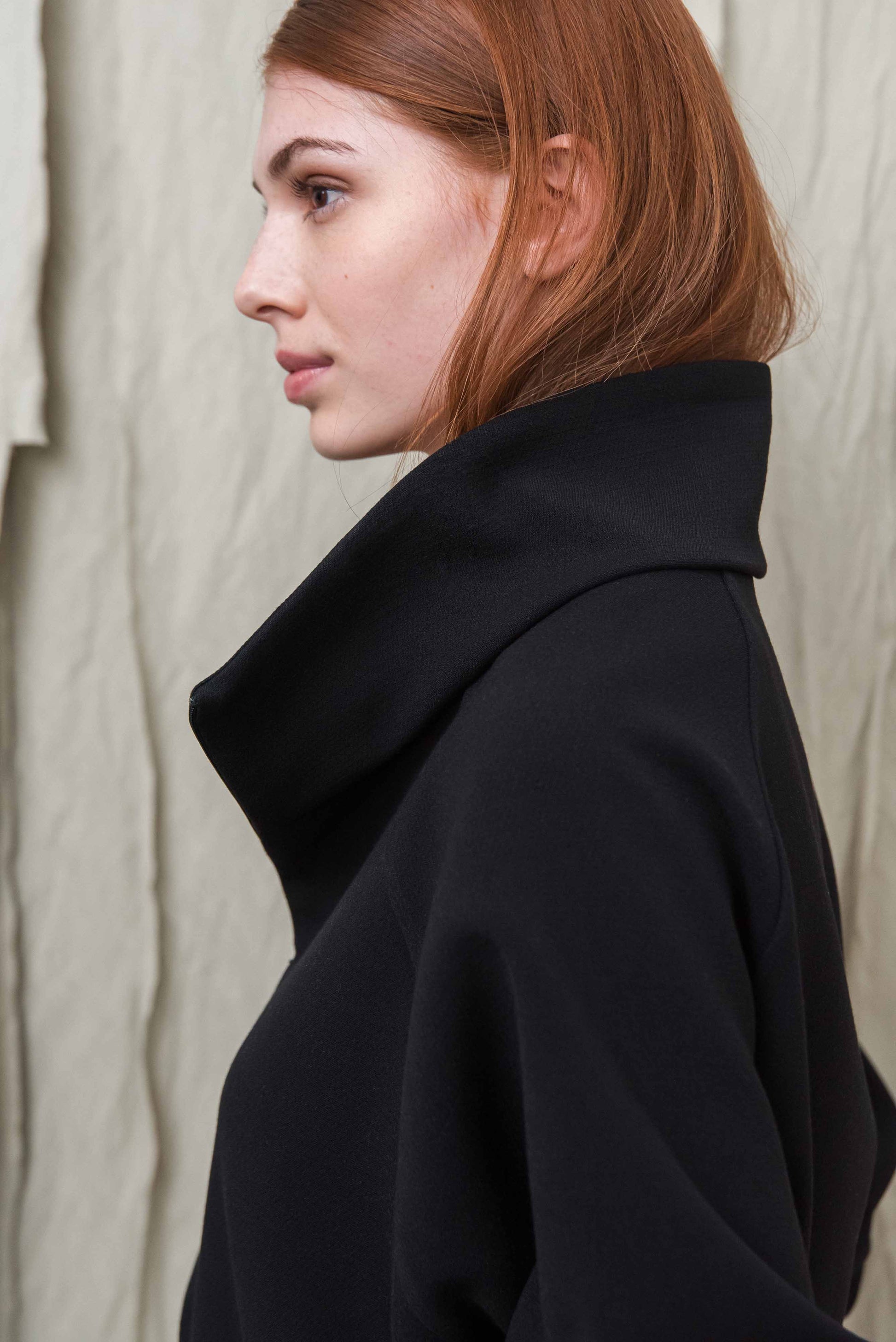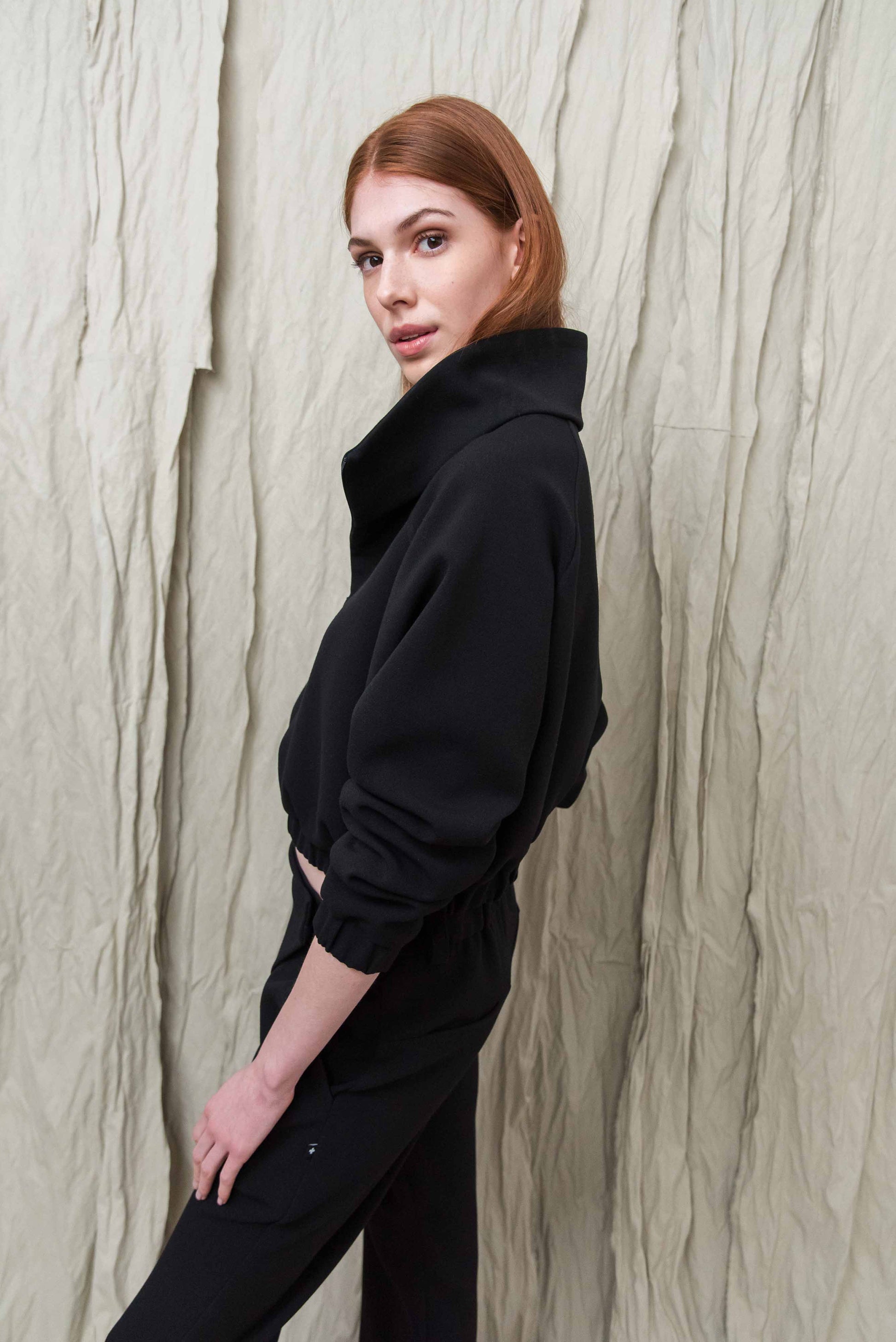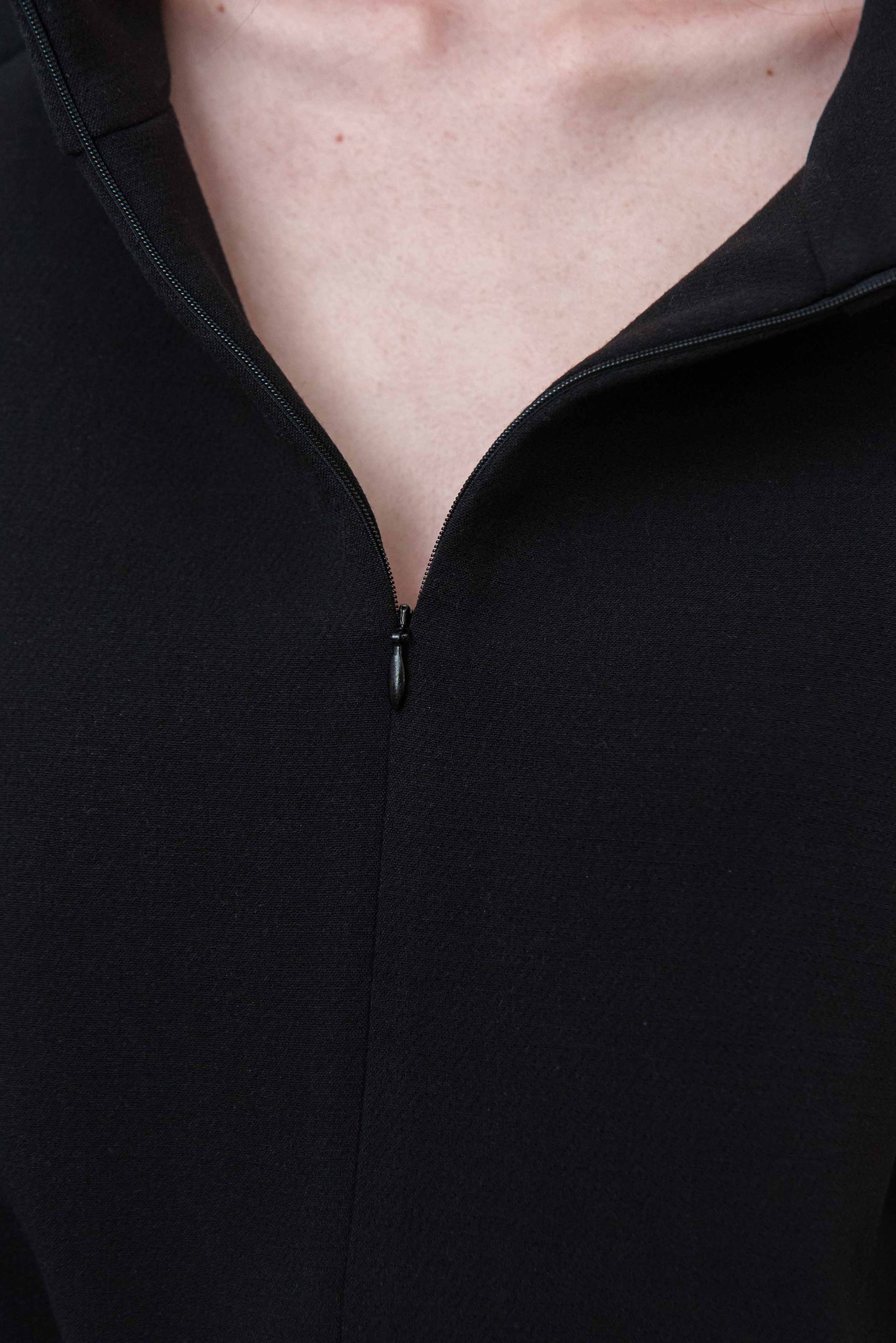 > Az ITTE felső egy karakteres, mégis letisztult darab, amely egyszerre ad tartást és szabadságot a mindennapokban. Rövidített fazonja és finoman húzott alja természetes arányokat teremt, miközben kényelmesen illeszkedik a testhez. Elöl rejtett cipzárral záródik, amely felhúzva és lehúzva is jól működik – így a megjelenés és a nyitottság mértéke is szabadon alakítható. A magas, strukturált gallér nemcsak esztétikai elem, hanem védelmet és melegséget is ad a hűvösebb napokon. Puha esésű, mégis formát tartó anyaga biztosítja, hogy mozgás közben is megőrizze letisztult formáját. Könnyen kombinálható nadrággal vagy szoknyával, így egyszerre alkalmas hétköznapi és tudatosan összeállított szettekhez. Egy olyan alapdarab, amely egyszerűségével támogatja a kiegyensúlyozott, átgondolt öltözködést.