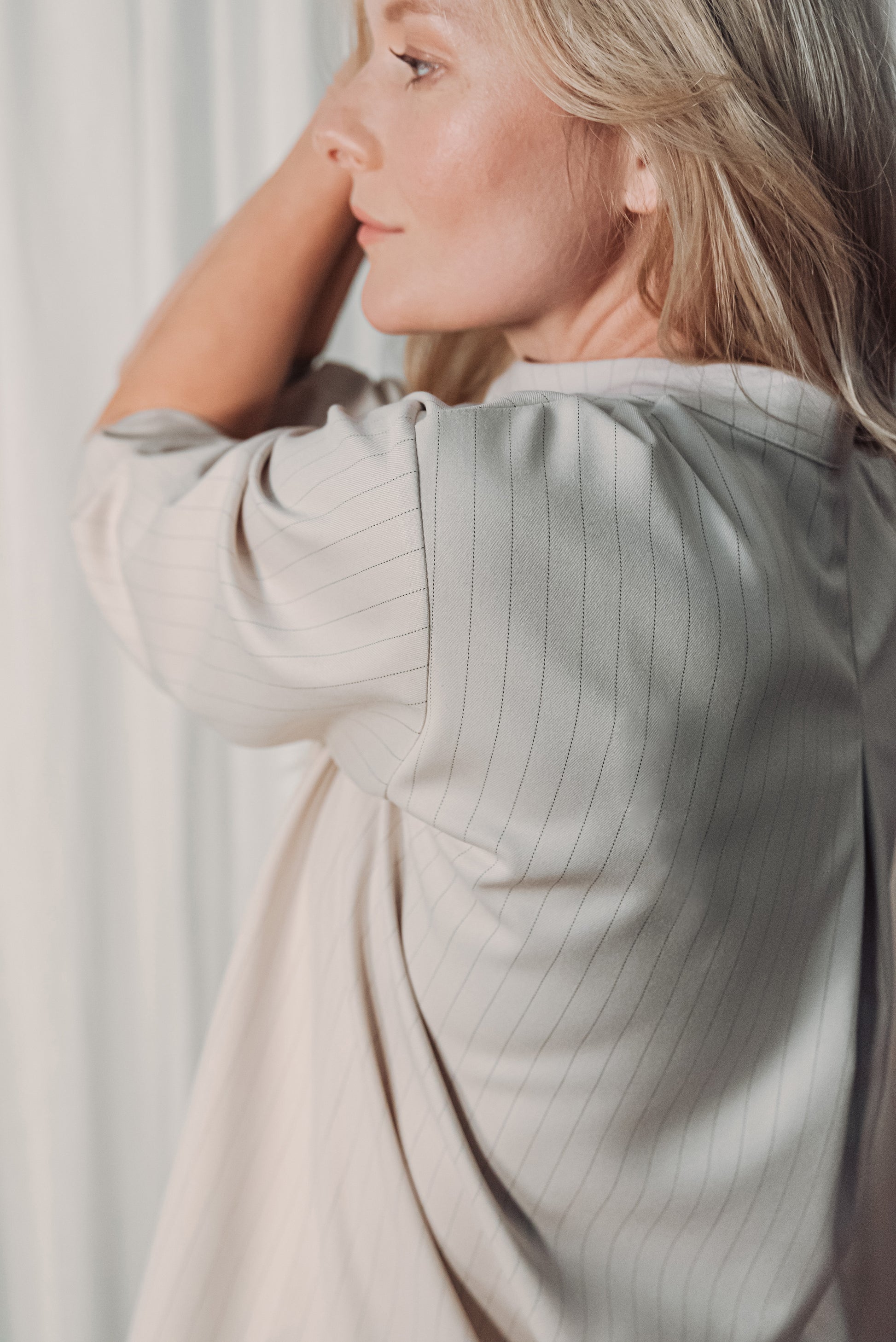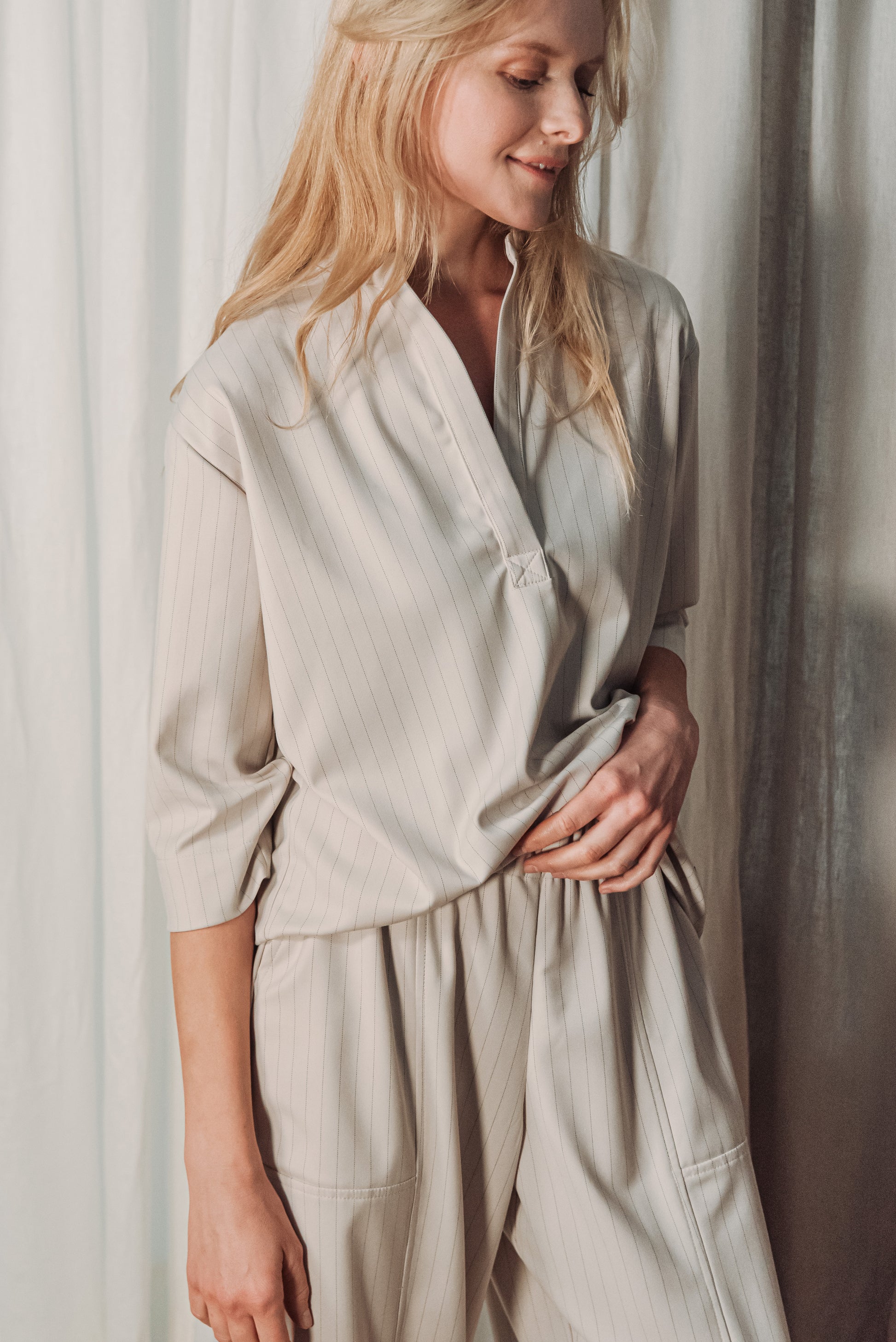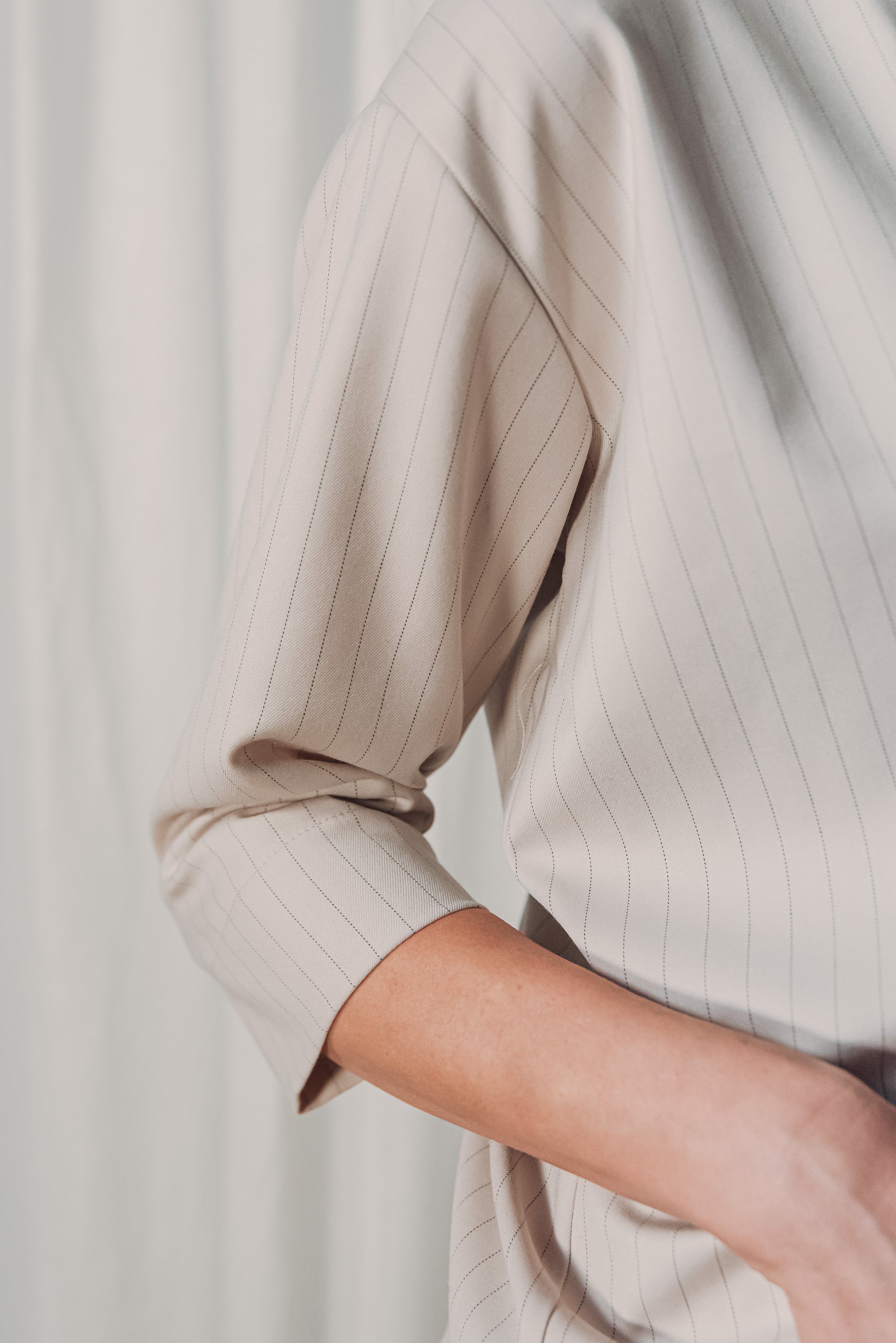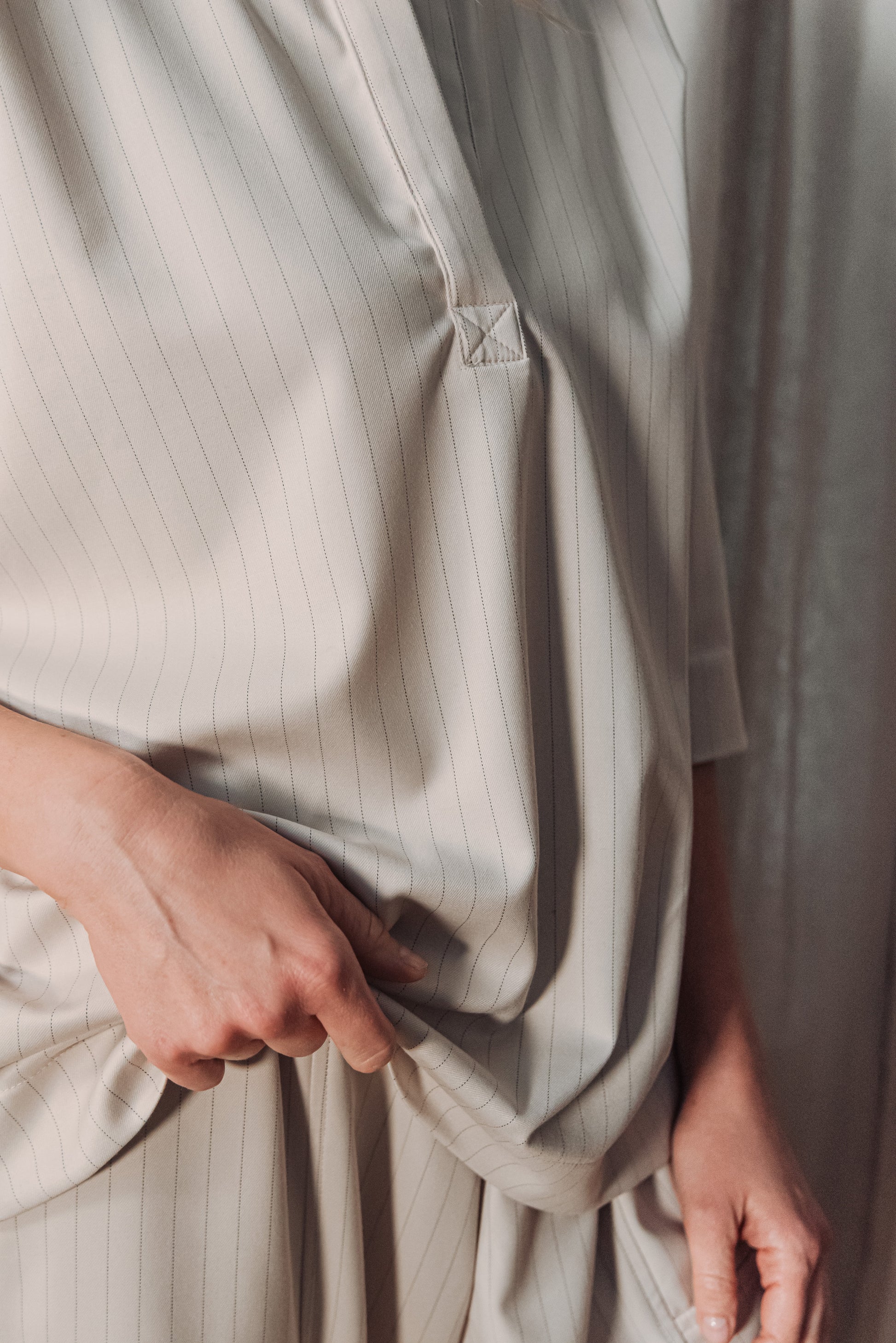 Közepes vastagságú, lágy esésű, csíkos kevert viszkóz anyag, amely kellemes tapintású és jól tartja formáját. Nem rugalmas, mégis természetesen követi a test mozgását, így egész napos viselésre is kényelmes választás.