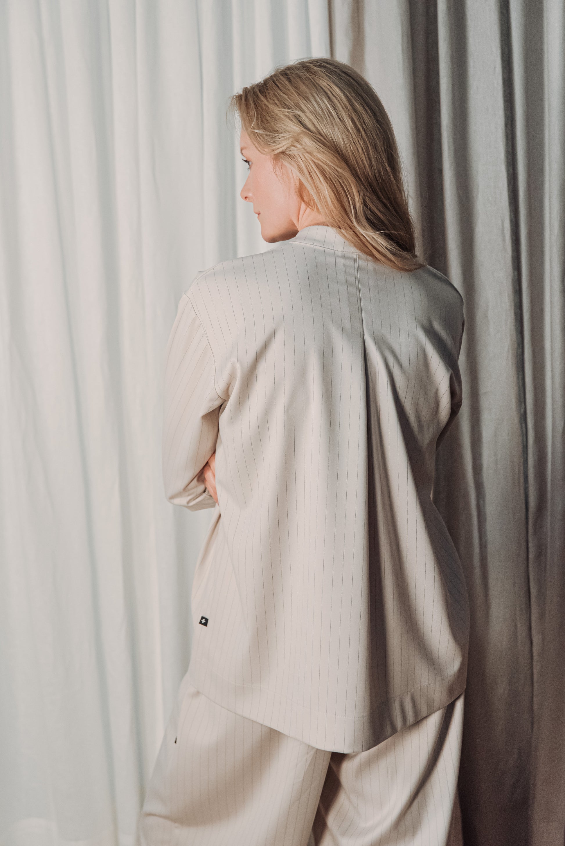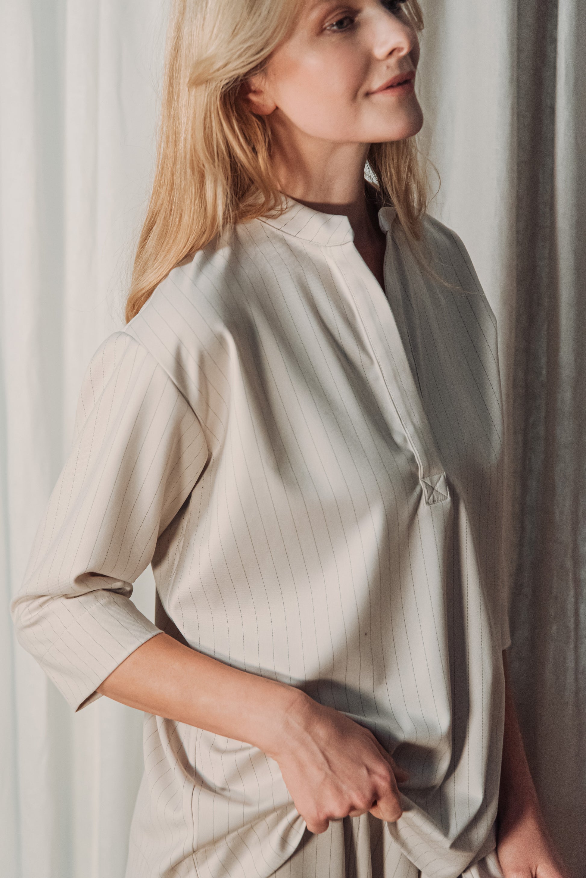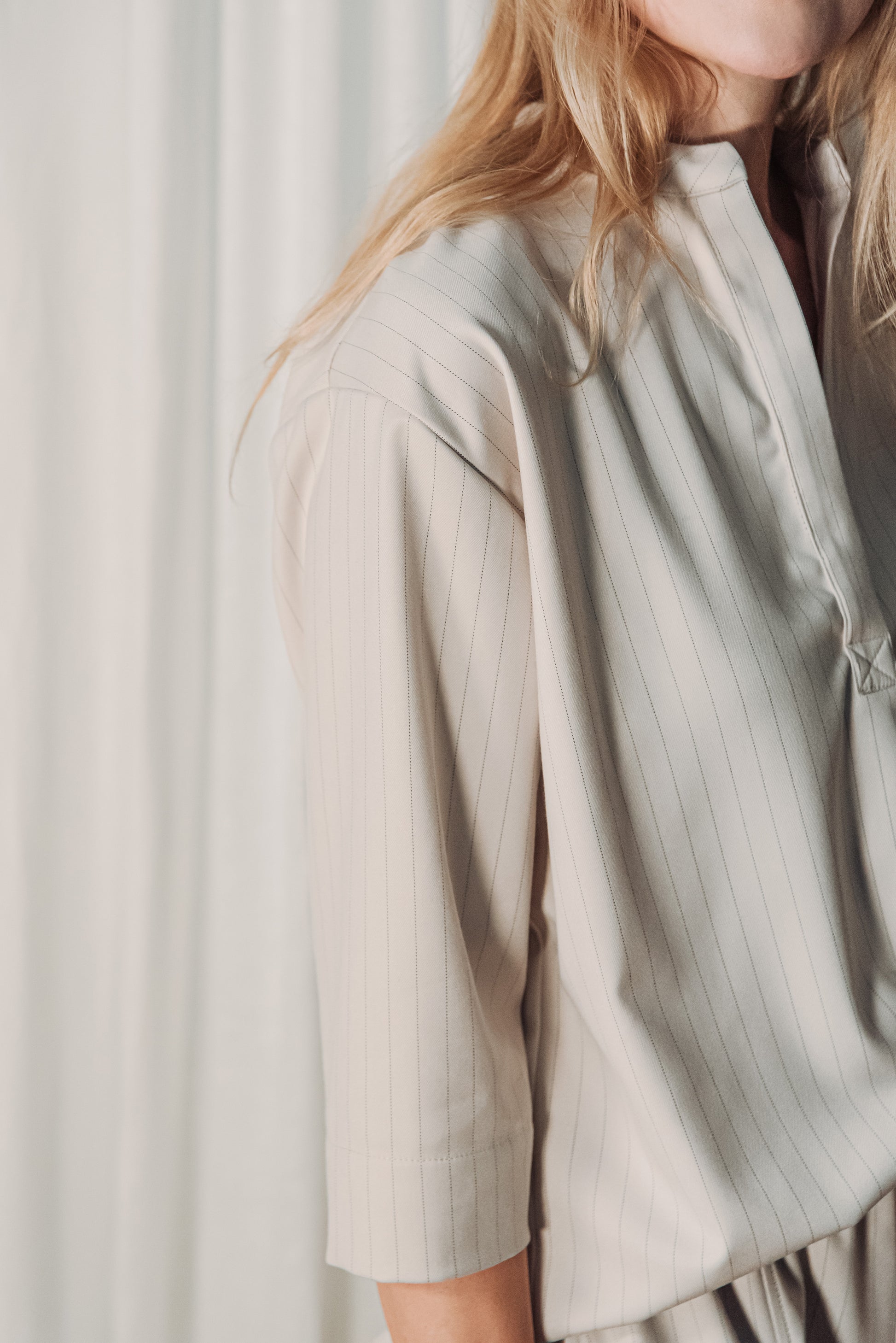 Közepes vastagságú, lágy esésű, csíkos kevert viszkóz anyag, amely kellemes tapintású és jól tartja formáját. Nem rugalmas, mégis természetesen követi a test mozgását, így egész napos viselésre is kényelmes választás.