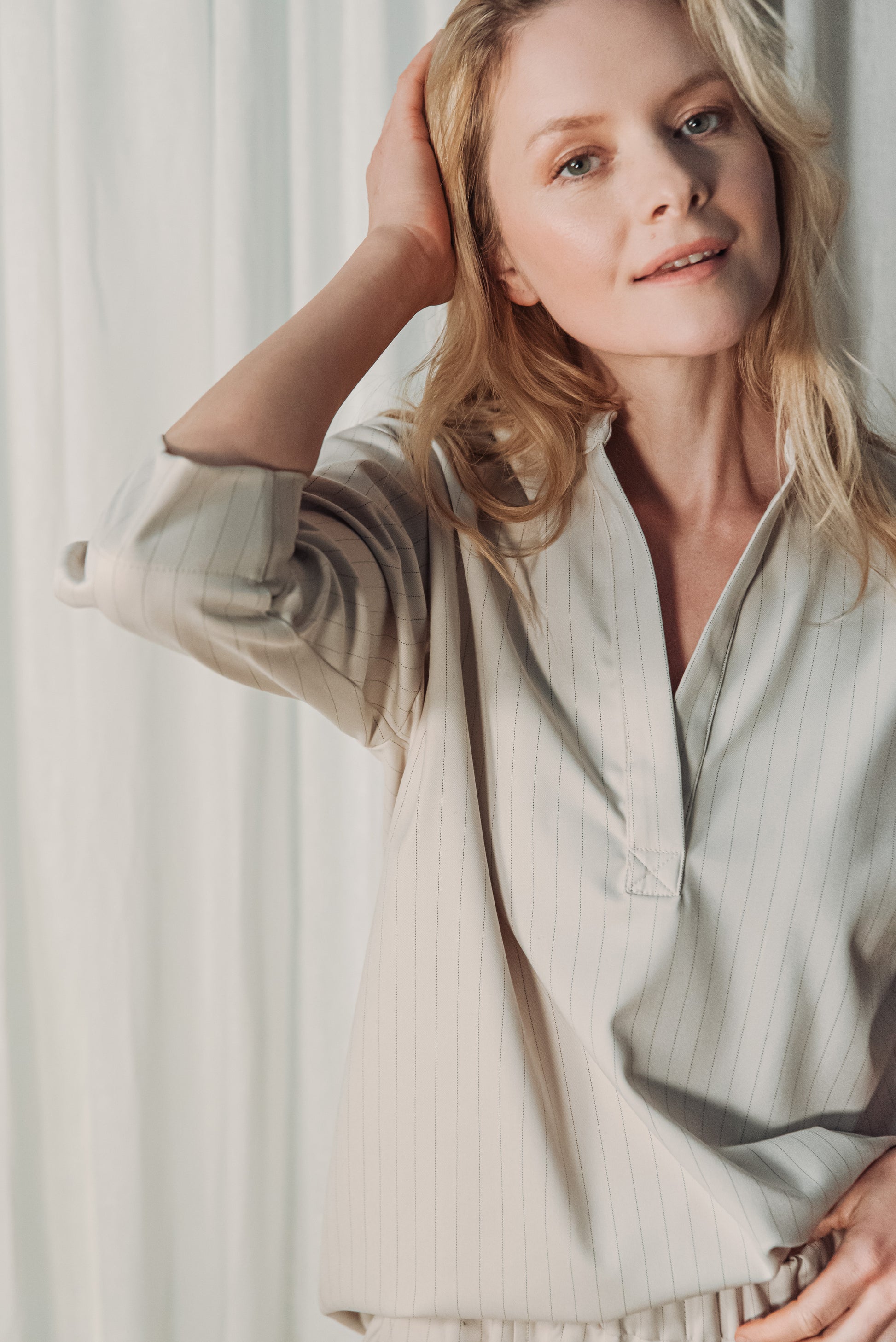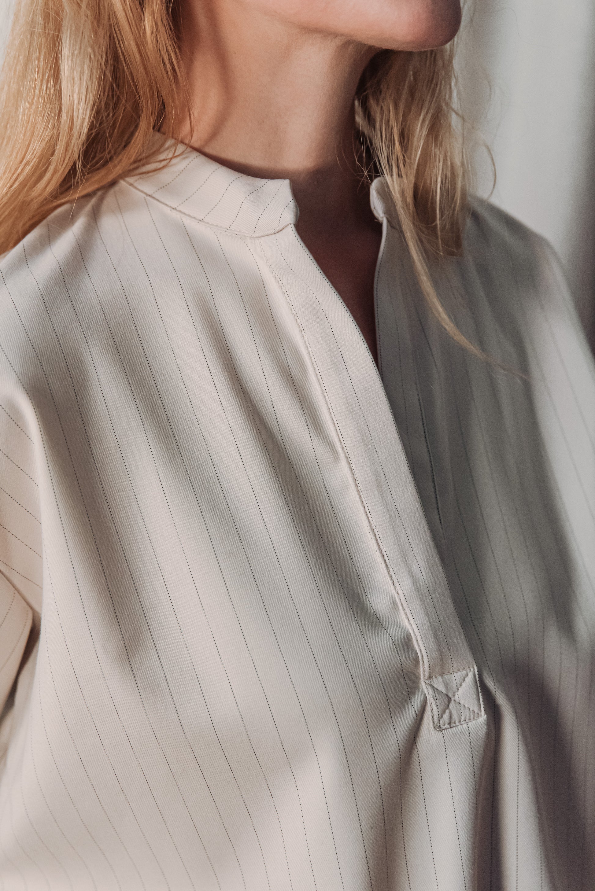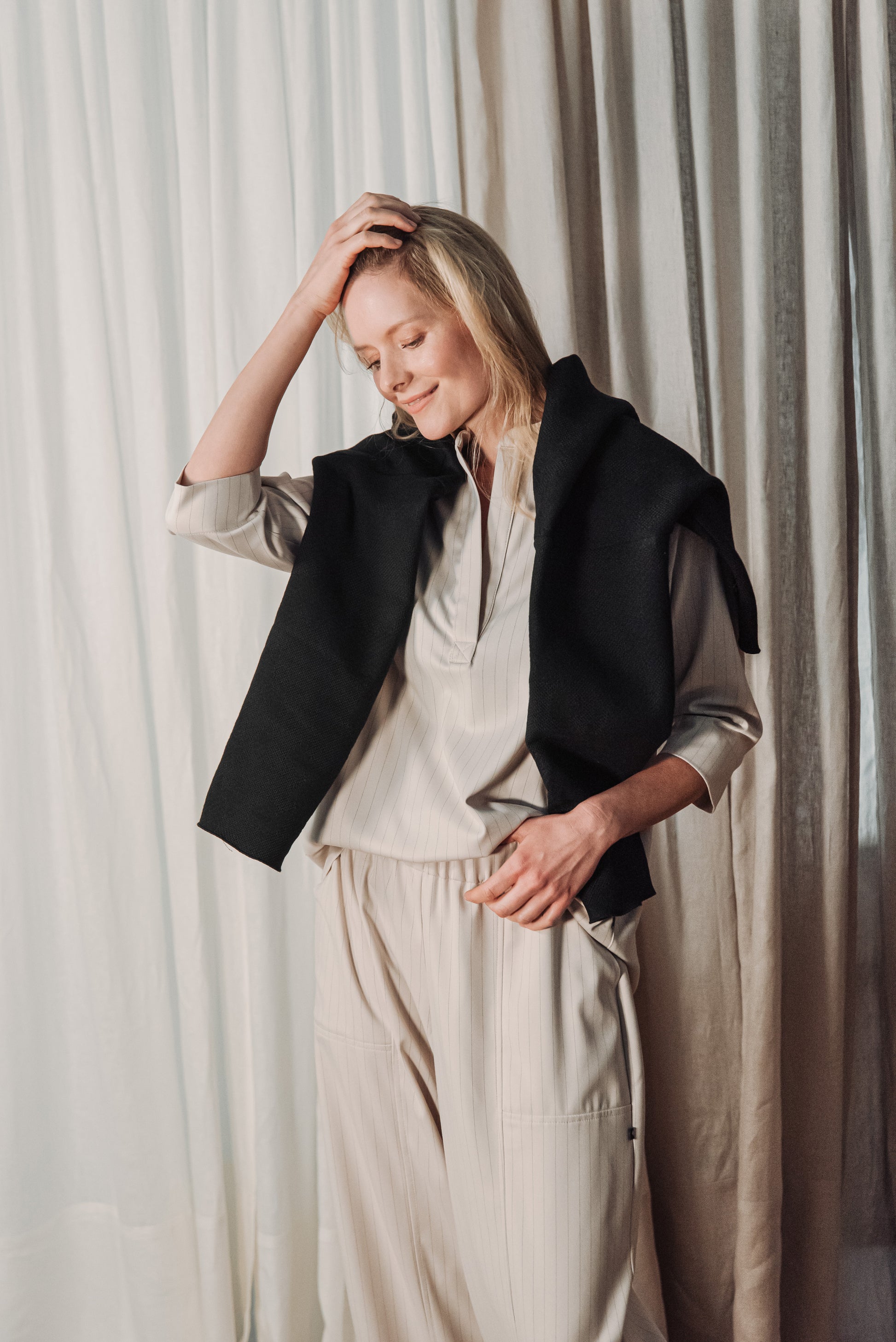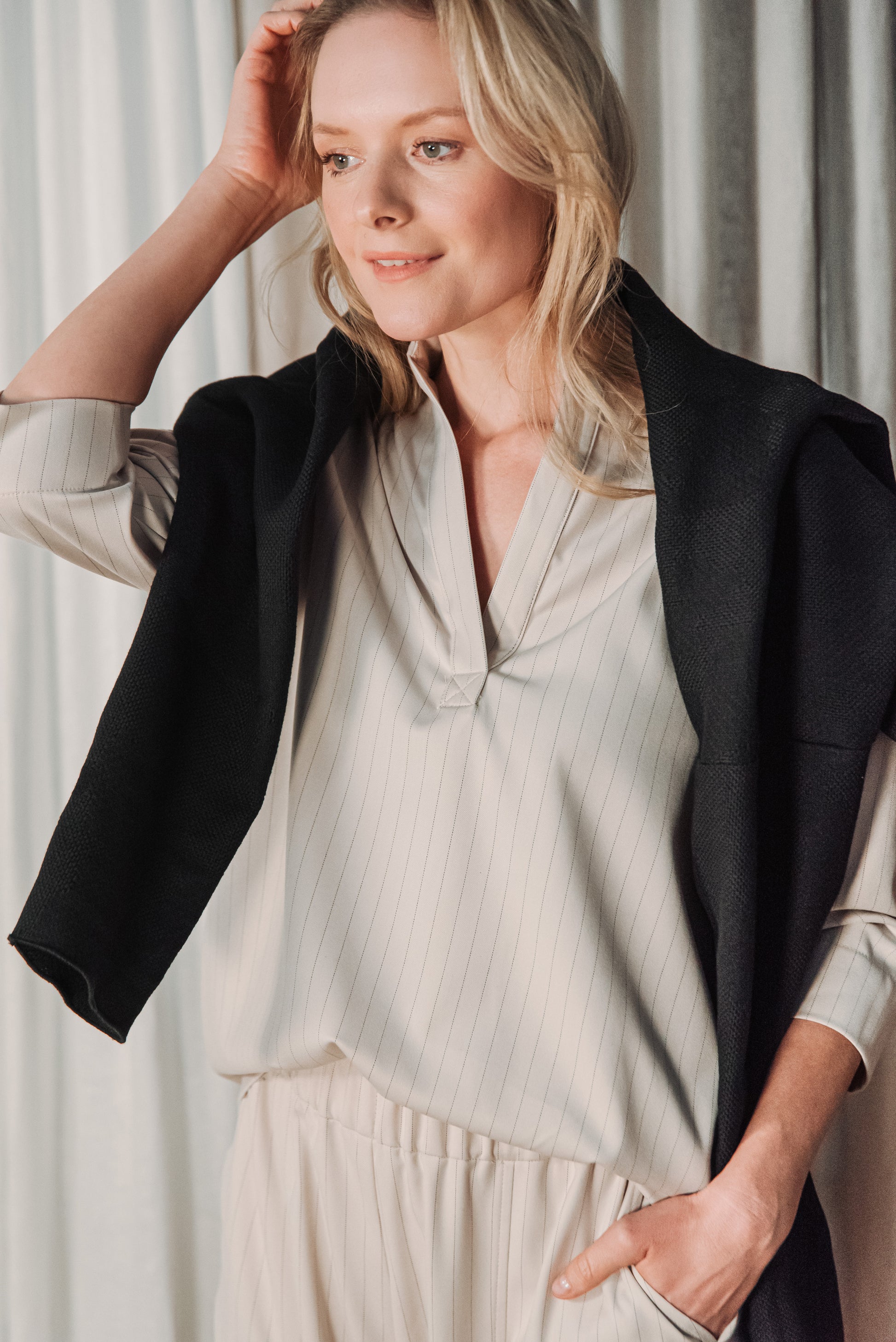 Közepes vastagságú, lágy esésű, csíkos kevert viszkóz anyag, amely kellemes tapintású és jól tartja formáját. Nem rugalmas, mégis természetesen követi a test mozgását, így egész napos viselésre is kényelmes választás.