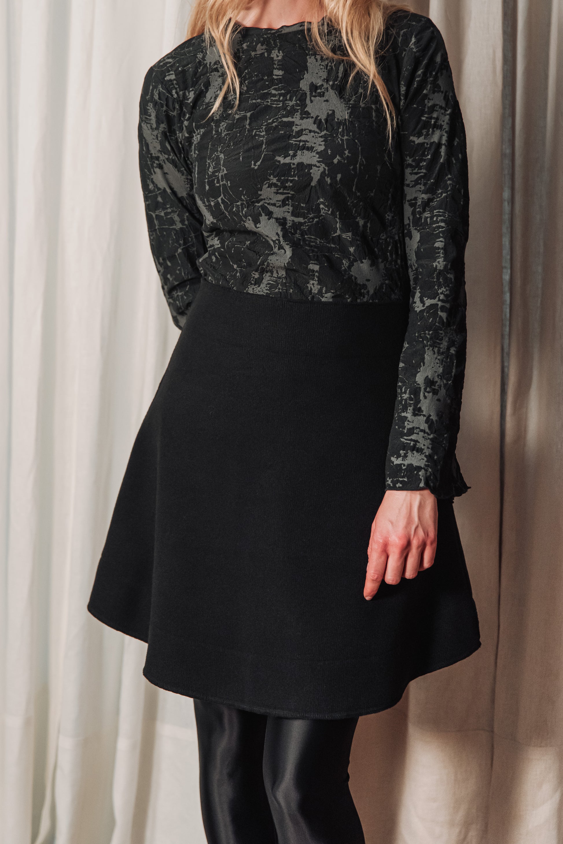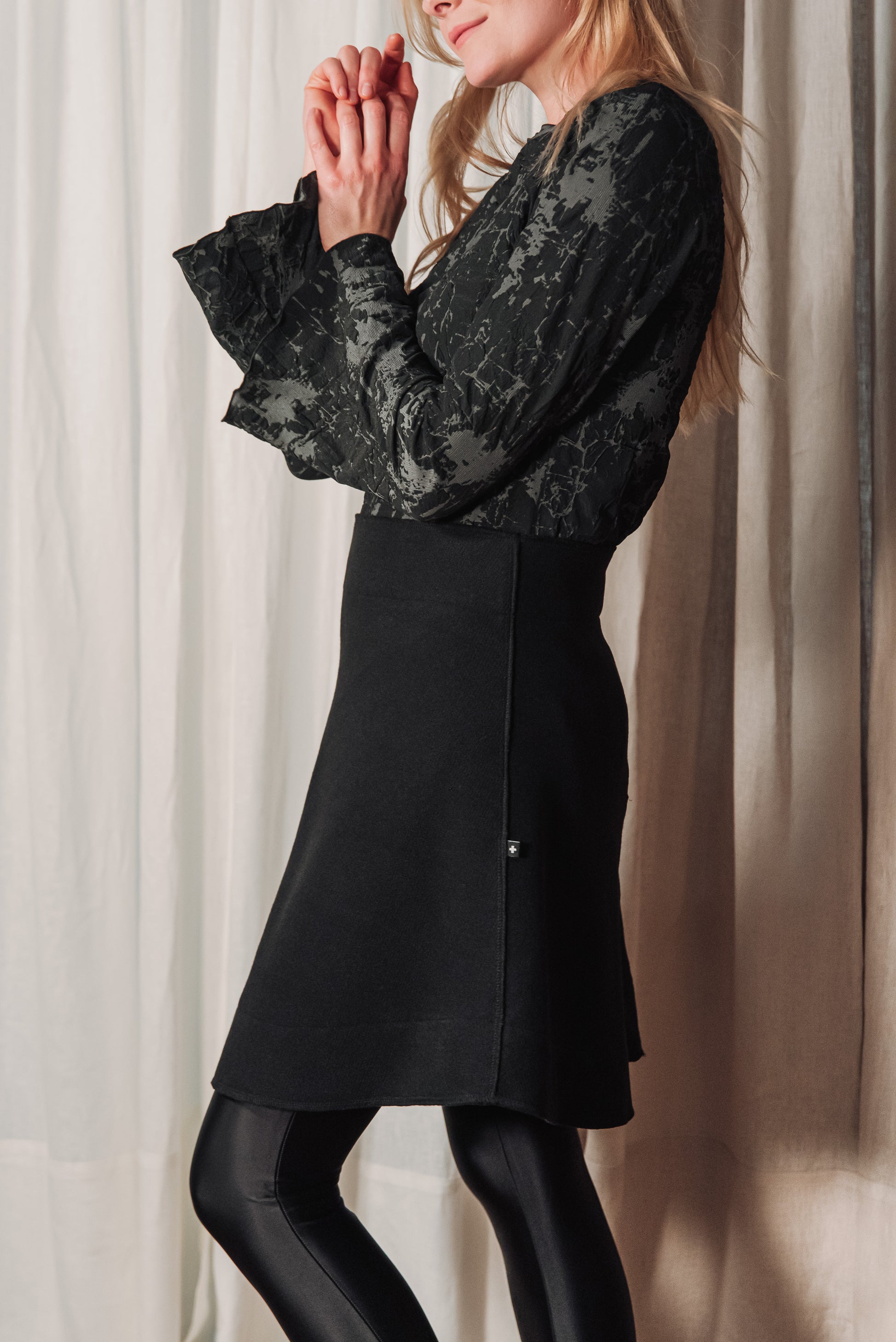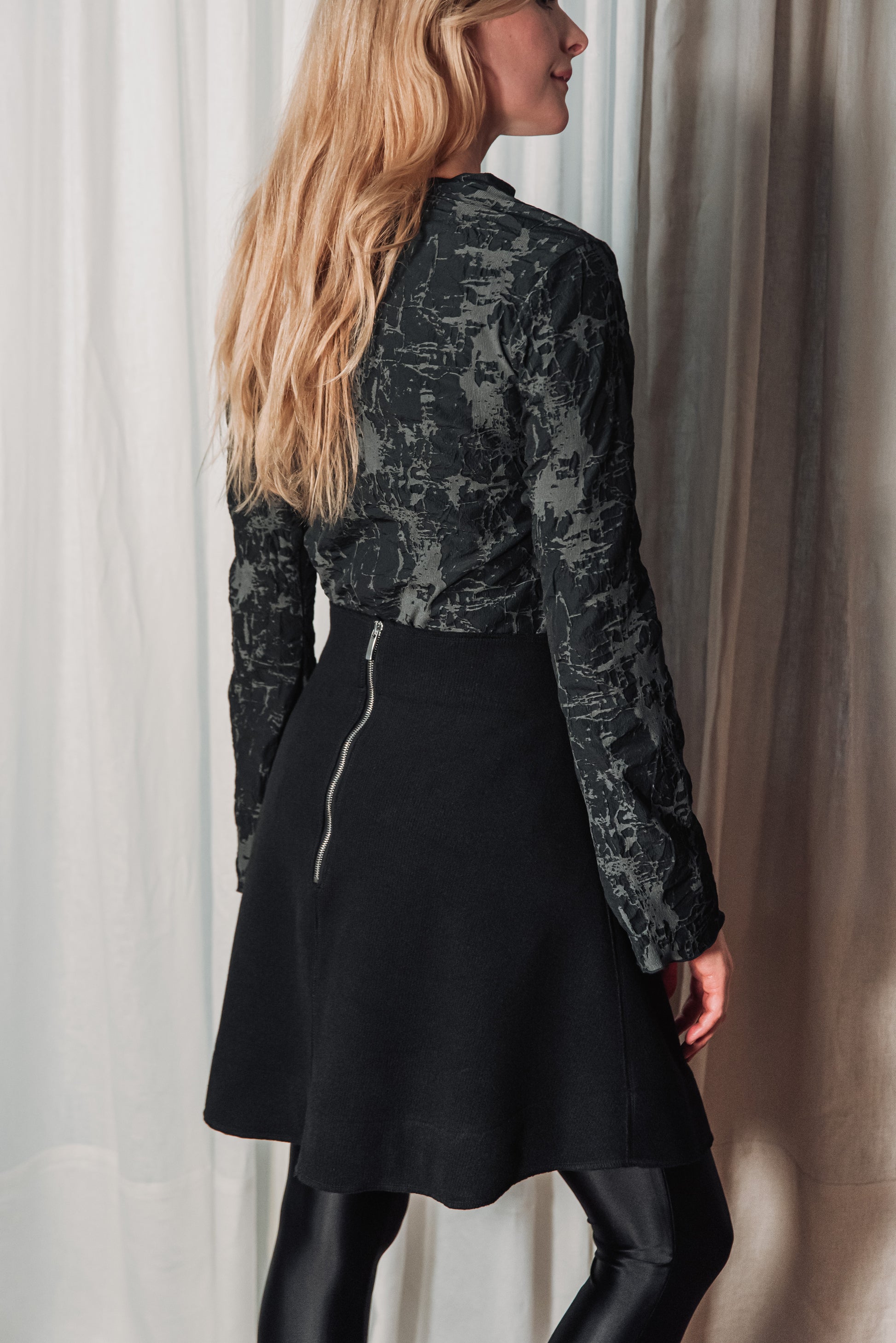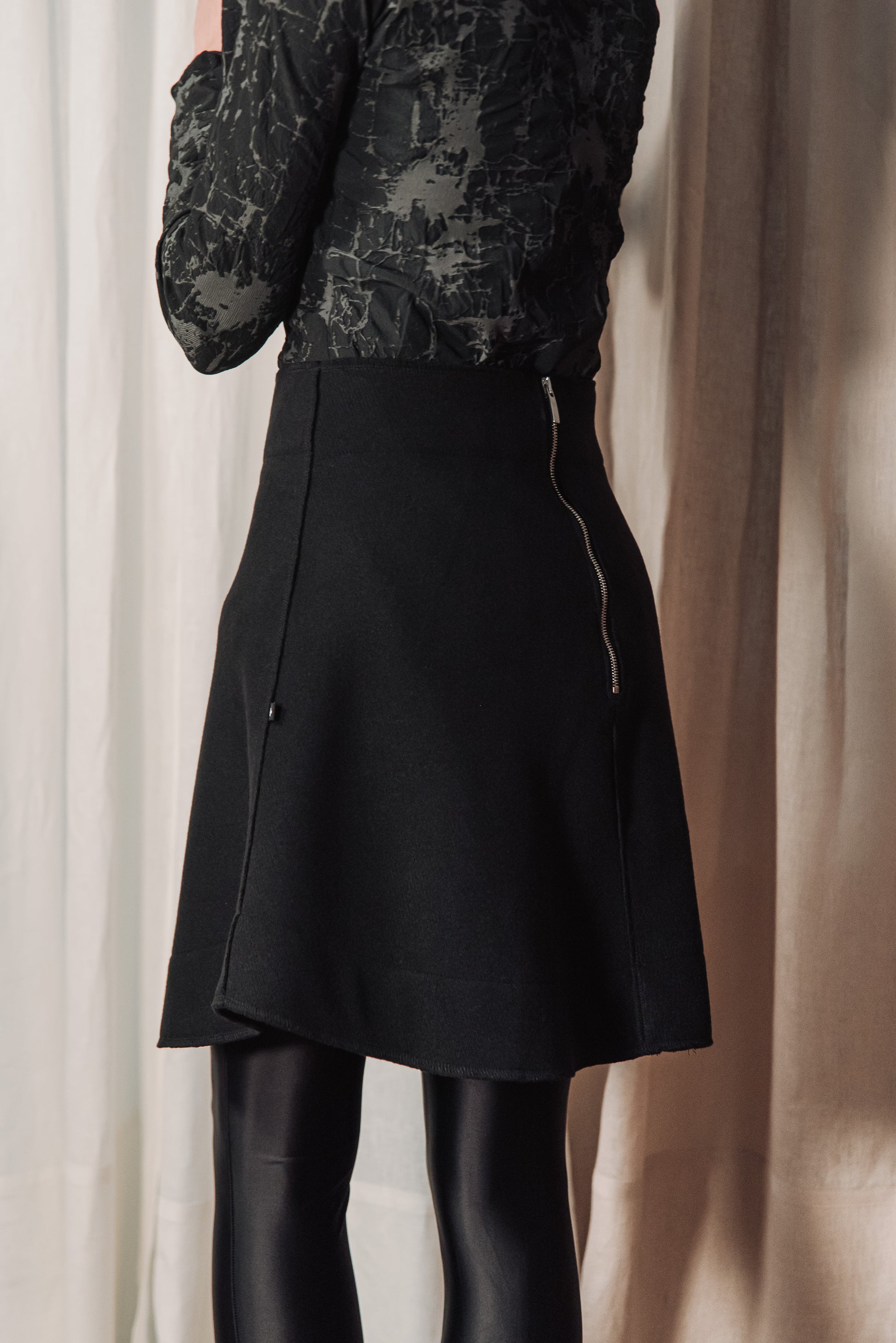 > A KEJI szoknya a letisztult nőiesség és a kényelmes elegancia találkozása. Rövid, lefelé bővülő fazonja íves aljban végződik, amely finoman hangsúlyozza a nőies vonalakat. A hátul elhelyezett fém zipzár modern, vagány részletként teszi teljessé a darabot. Puha, rugalmas anyagának köszönhetően egész nap komfortos viseletet biztosít. Kombinálható sportos vagy elegáns felsőkkel, így a mindennapok sokoldalú alapdarabja lehet. A NONPLUS filozófiájához hűen a KEJI szoknya az egyszerűségben rejlő harmóniát képviseli.