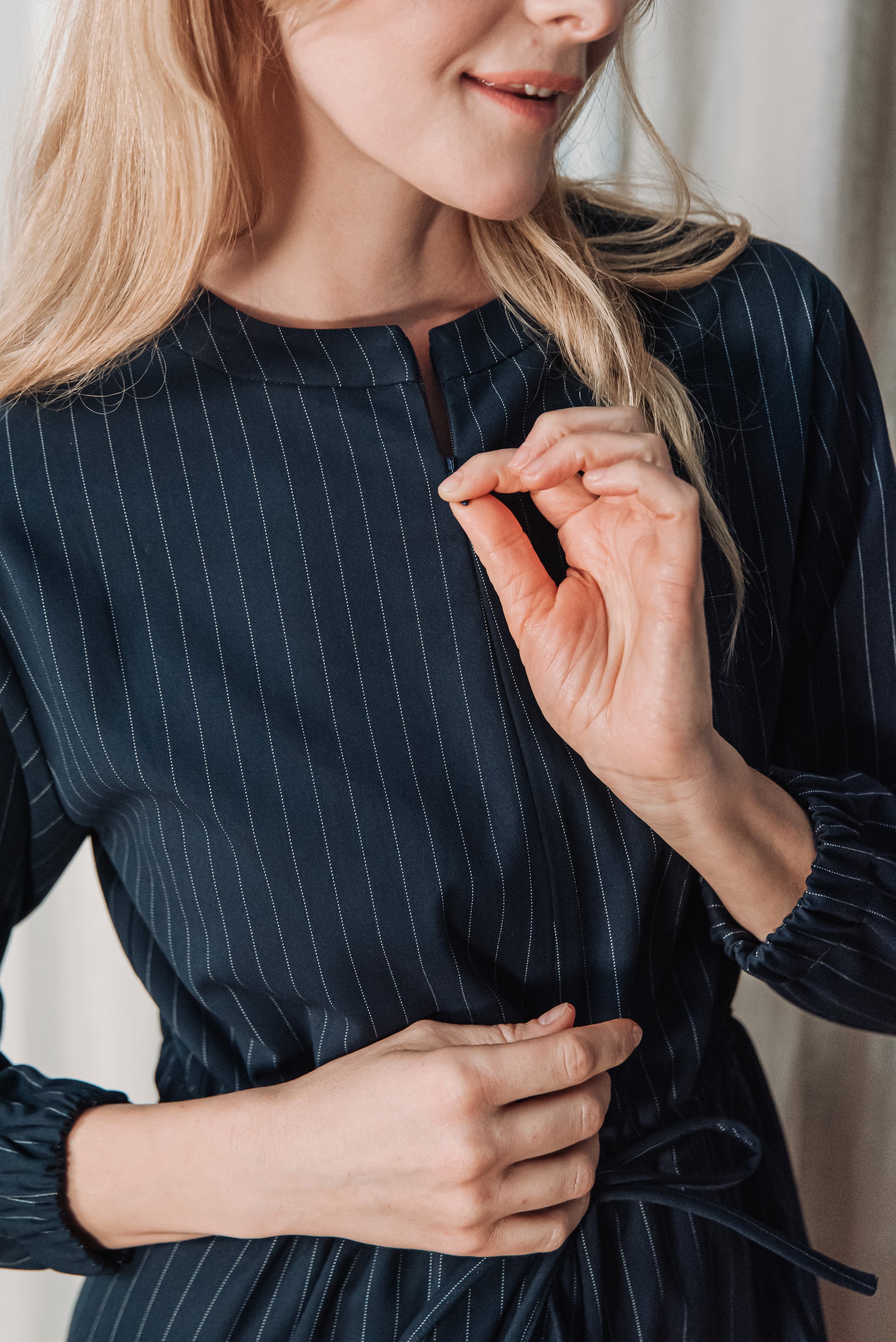 Közepes vastagságú, lágy esésű, csíkos kevert viszkóz anyag, amely kellemes tapintású és jól tartja formáját. Nem rugalmas, mégis természetesen követi a test mozgását, így egész napos viselésre is kényelmes választás.