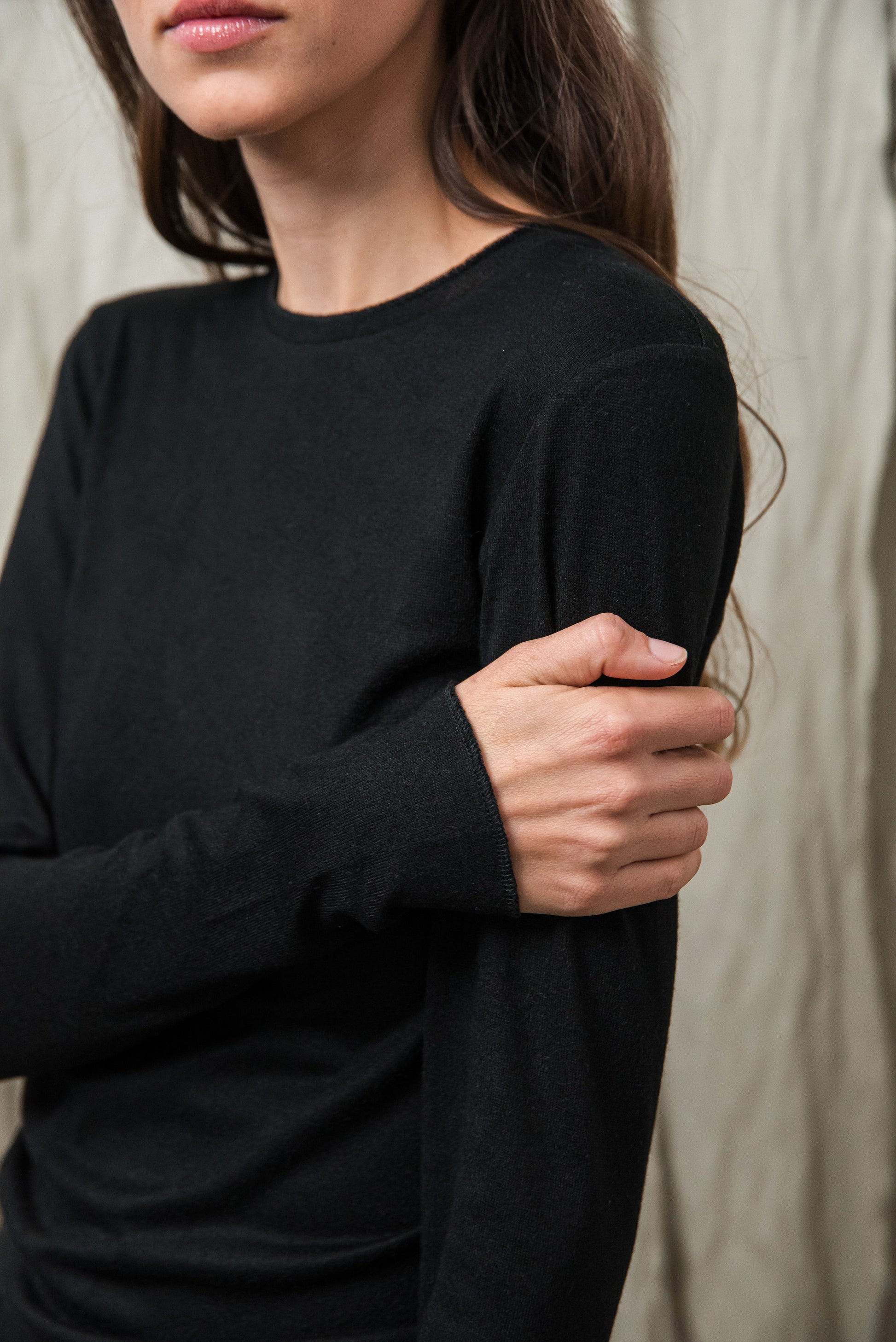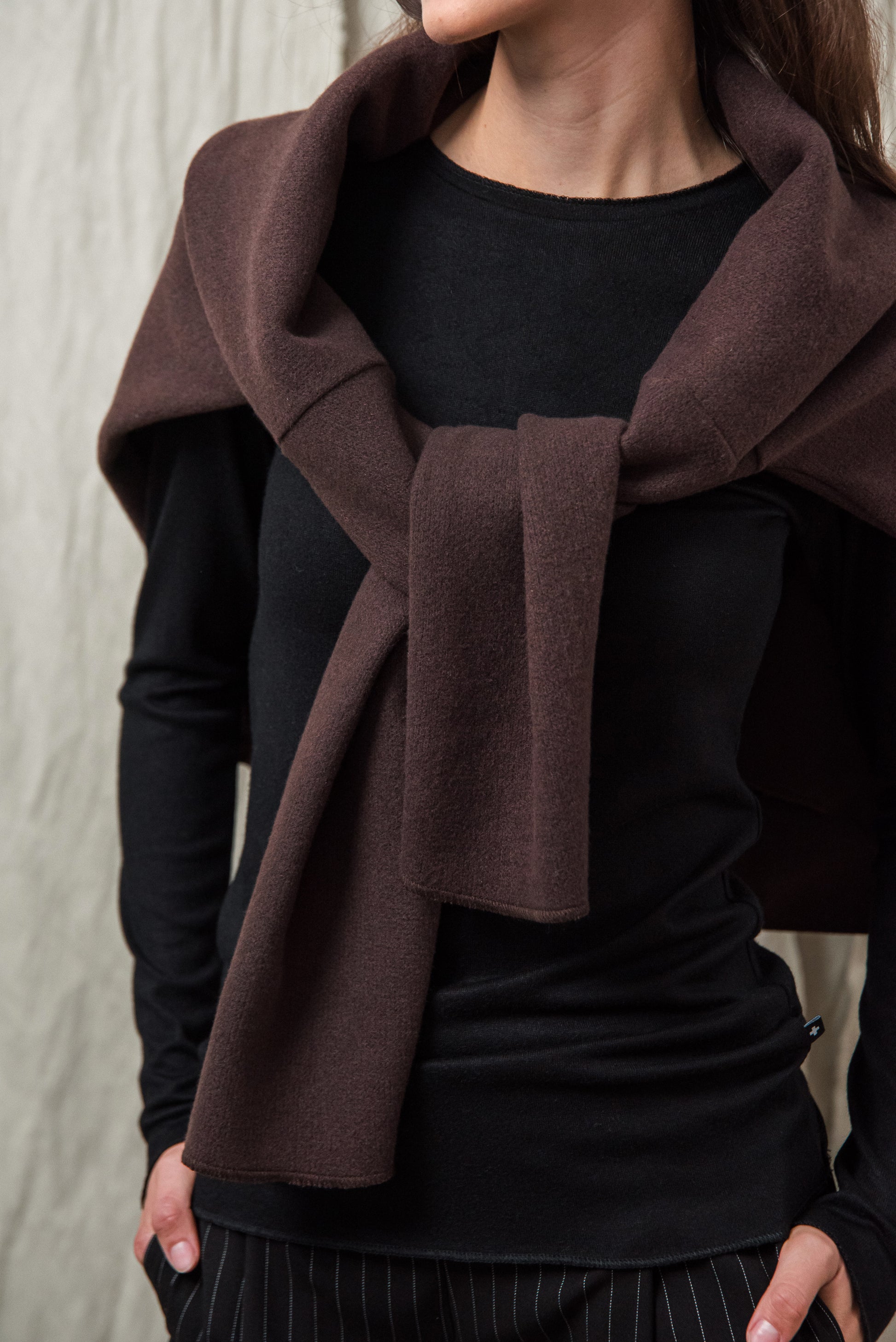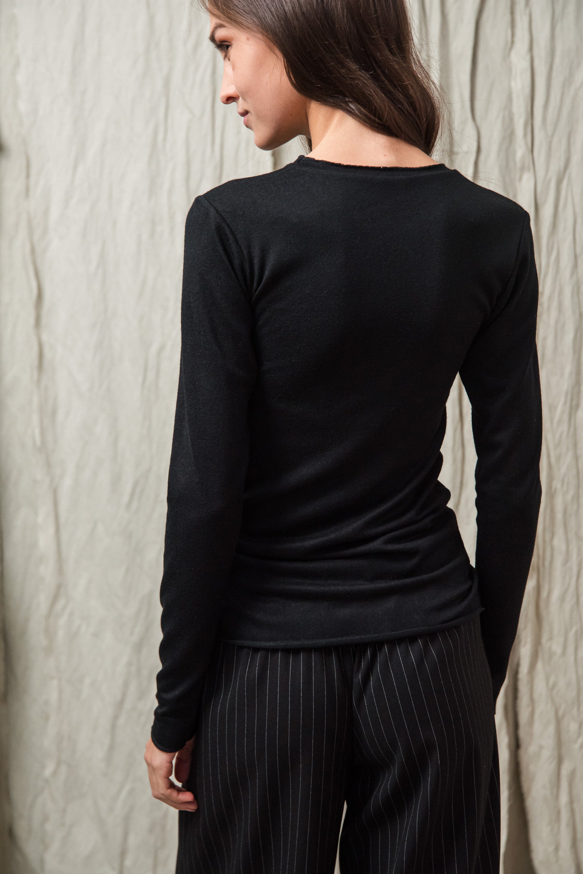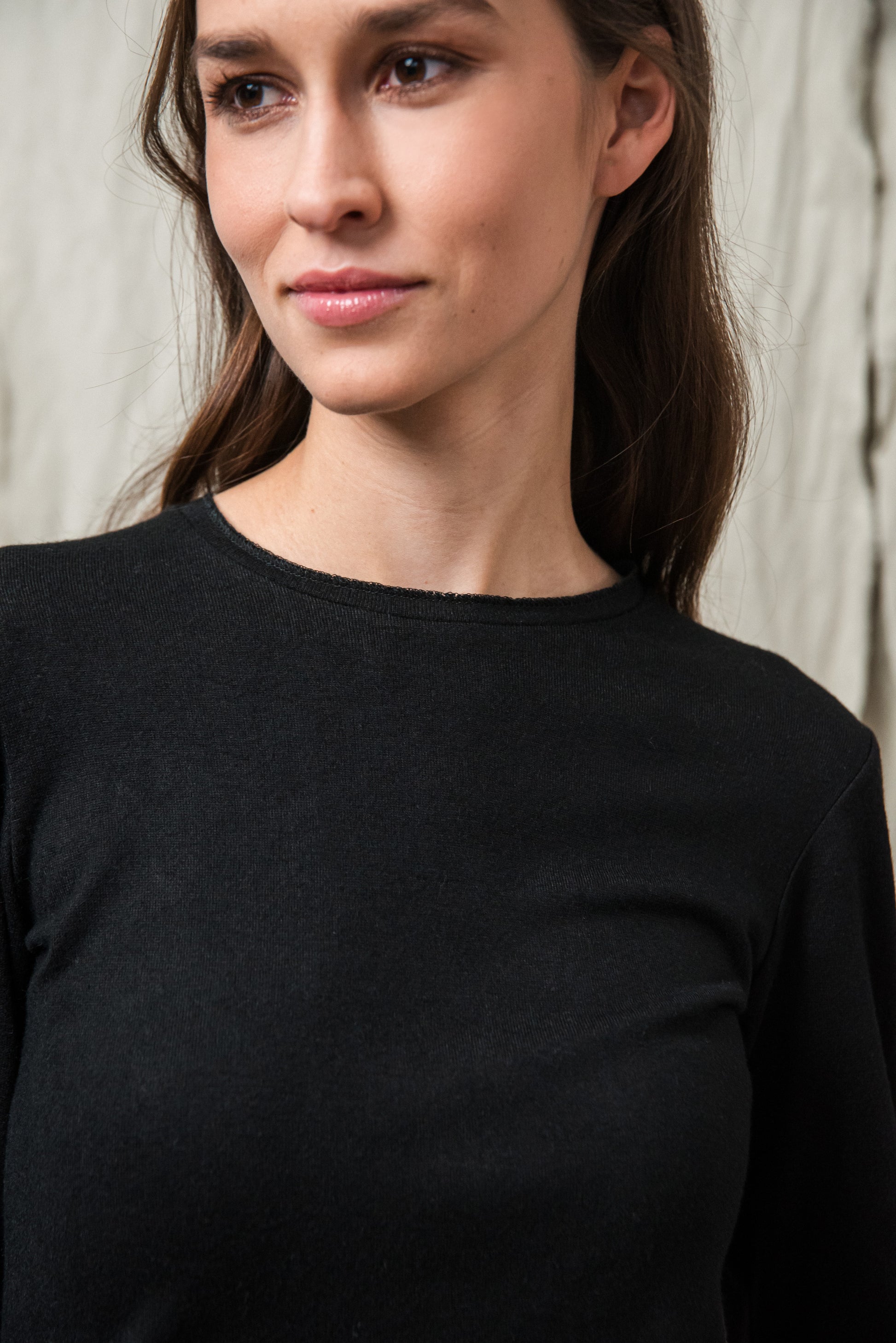 Puha, kötött rayon keverék alapanyagunk selymes tapintásával gyengéden simul a bőrhöz. Közepesen vékony, mégis van tartása - az anyag szerkezete szépen engedi érvényesülni a fazonok vonalait, miközben a kötött anyag természetes rugalmassága extra komfortot ad. Légáteresztő textúrája miatt egész napos viselésre is kényelmes, így minden darabunk könnyed érzetet és letisztult eleganciát kínál. Ennek a gondosan válogatott alapanyagnak köszönhetően az ebből készült modellek egyszerre praktikusak, kényelmesek és esztétikailag kifinomultak.