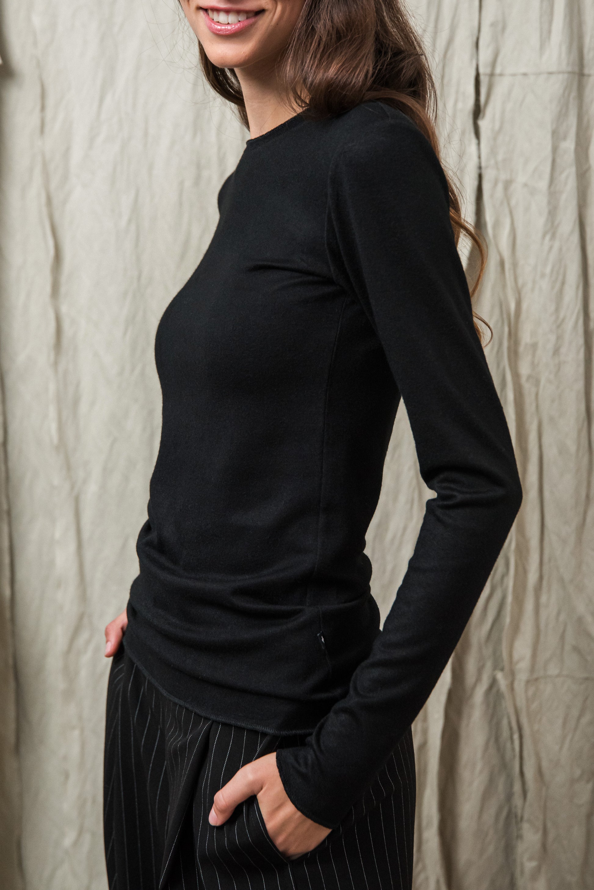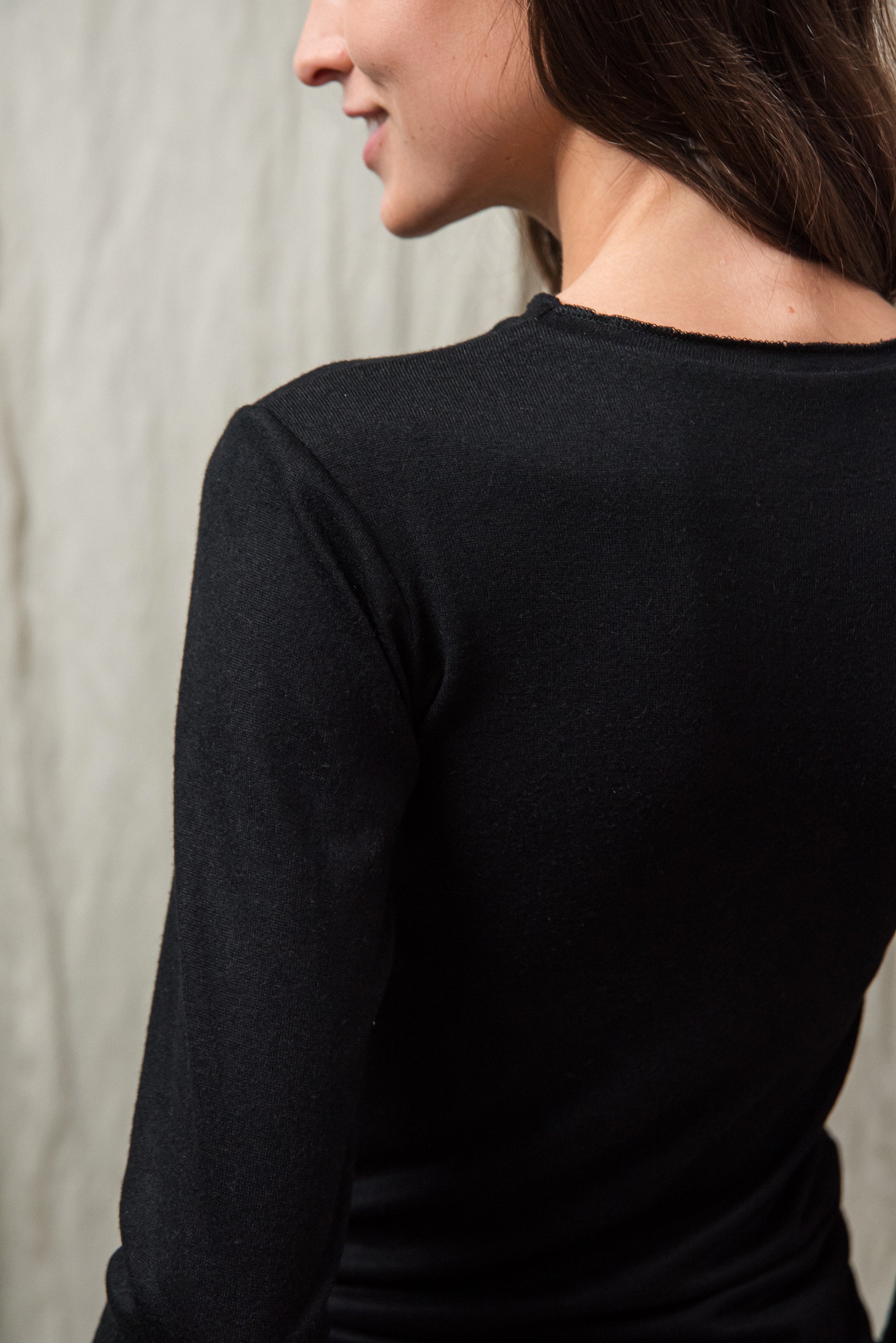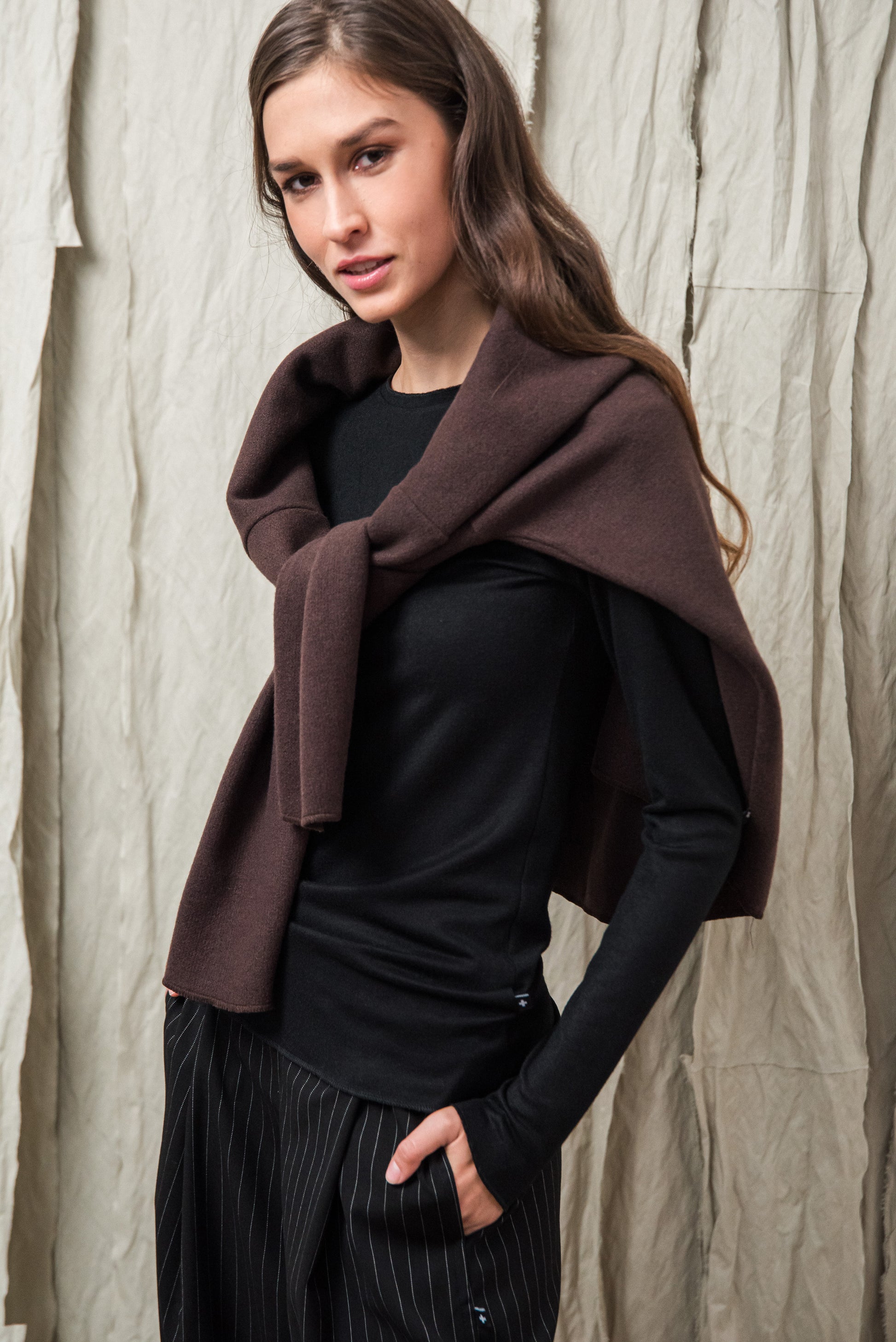 Puha, kötött rayon keverék alapanyagunk selymes tapintásával gyengéden simul a bőrhöz. Közepesen vékony, mégis van tartása - az anyag szerkezete szépen engedi érvényesülni a fazonok vonalait, miközben a kötött anyag természetes rugalmassága extra komfortot ad. Légáteresztő textúrája miatt egész napos viselésre is kényelmes, így minden darabunk könnyed érzetet és letisztult eleganciát kínál. Ennek a gondosan válogatott alapanyagnak köszönhetően az ebből készült modellek egyszerre praktikusak, kényelmesek és esztétikailag kifinomultak.